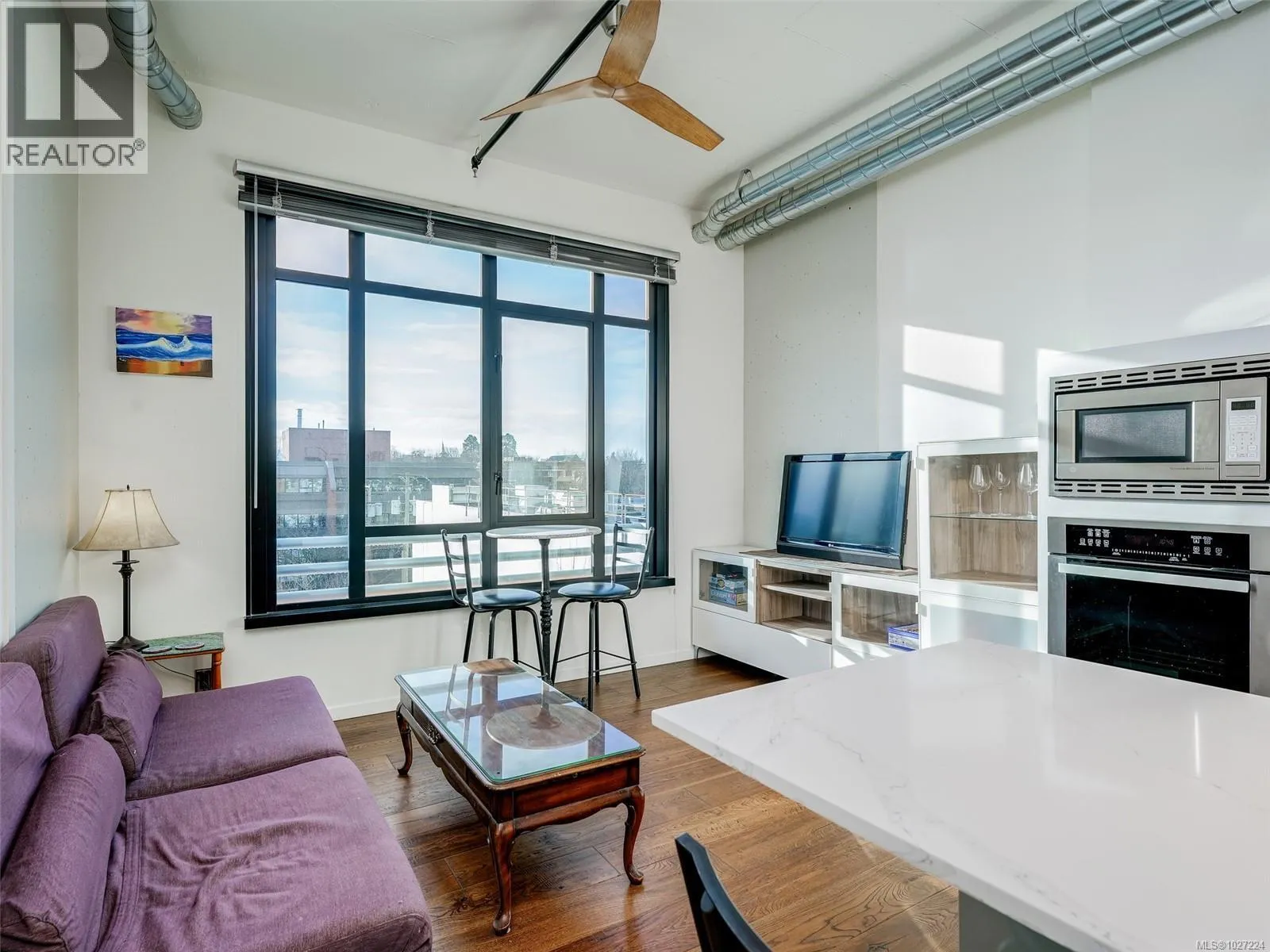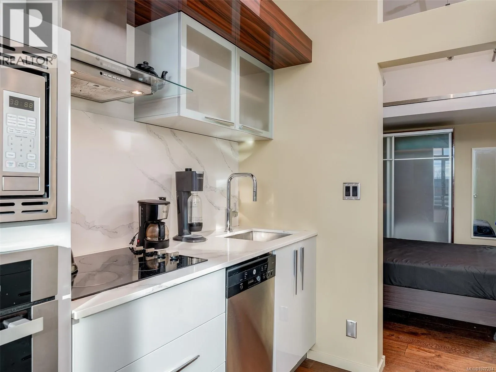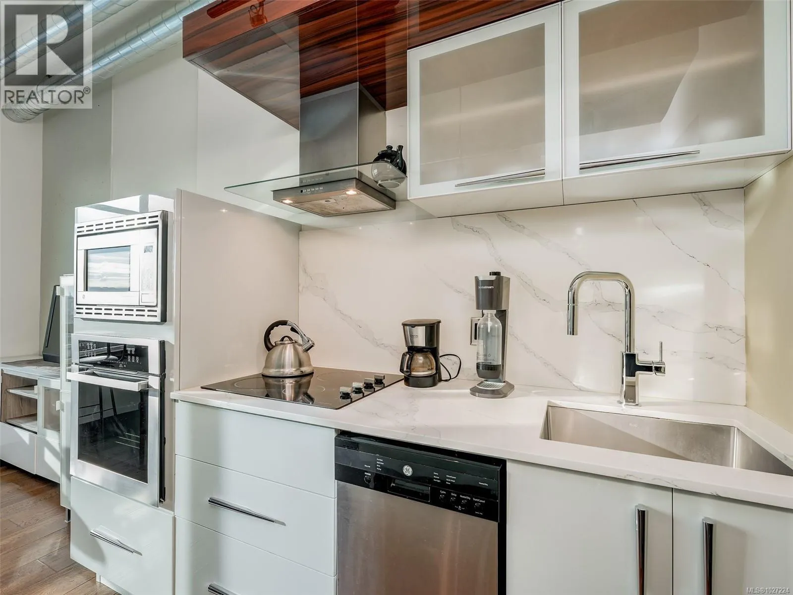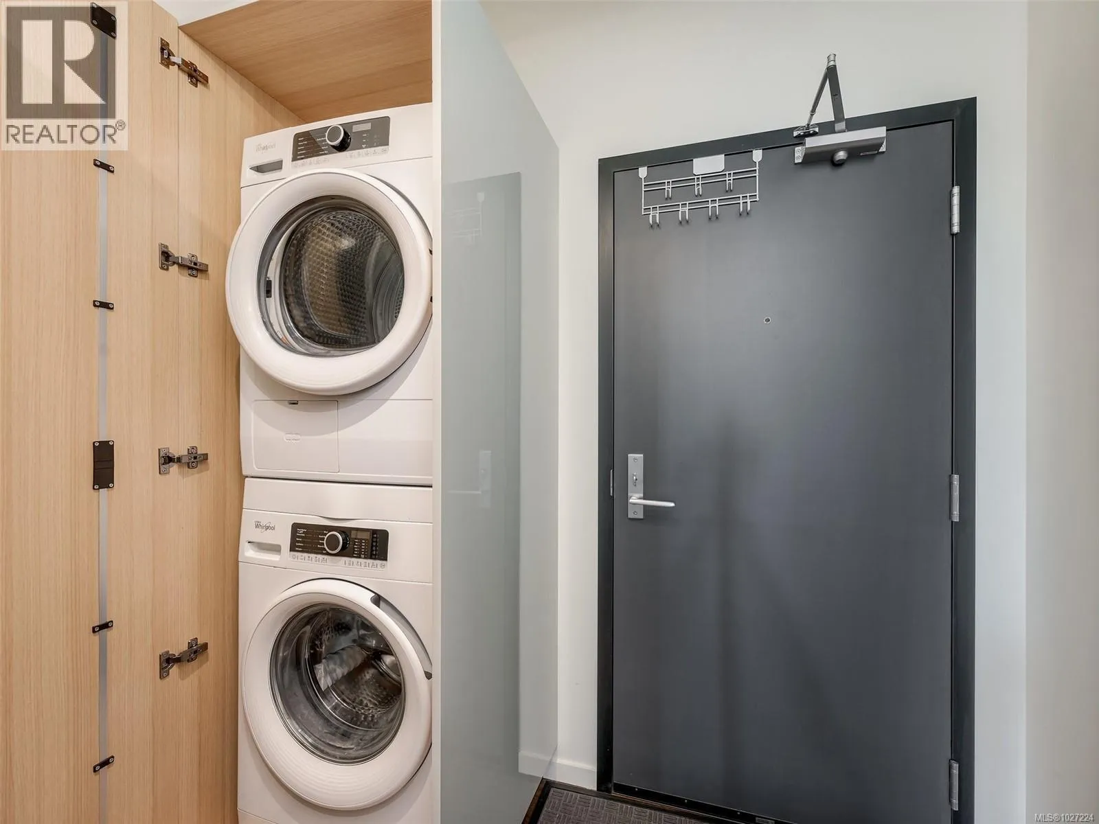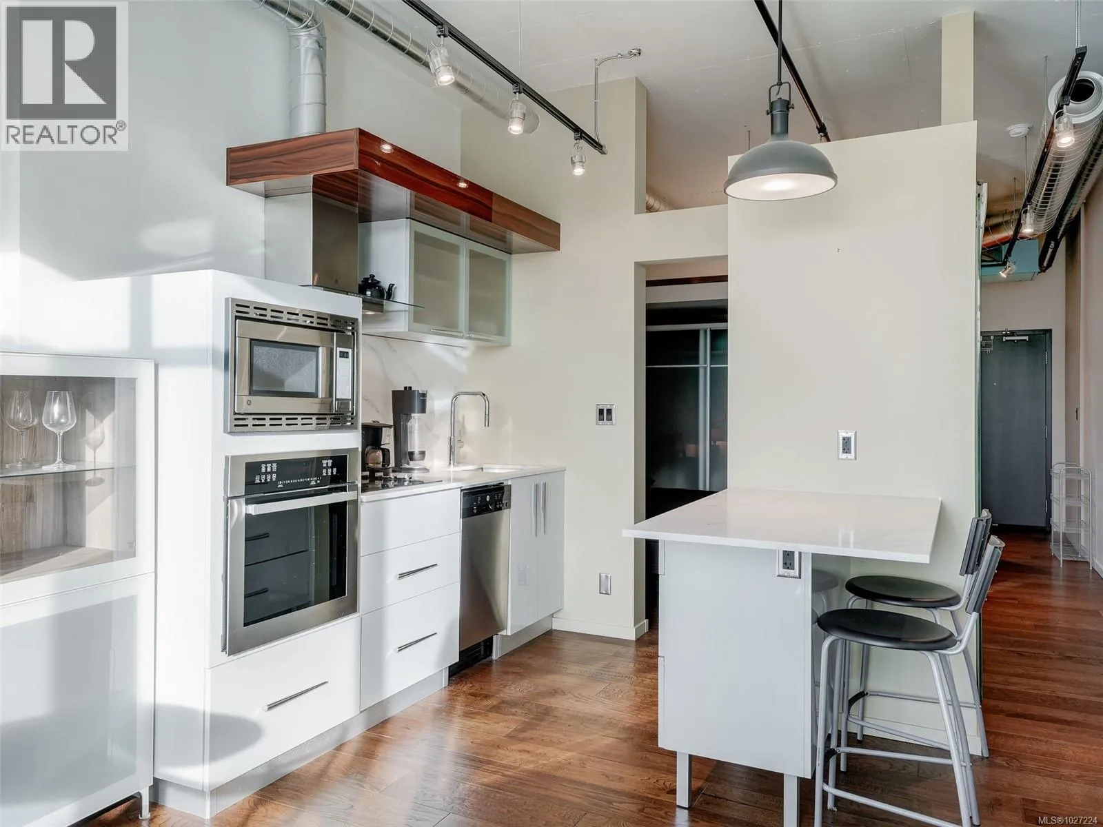 Experience downtown living at its finest with Jukebox, a stylish 2019-built steel and concrete condo by Mosaic Properties Inc. This 1-bedroom home is bright and modern with south-facing exposure, and the features are stunning: 10-foot ceilings, hardwood floors, quartz countertops, soft close cabinets, stainless steel appliances and in-suite laundry. Also, heating and hot water are included with the strata fees and there is a separate storage locker. Located in the vibrant Harris Green district of Downtown Victoria, the location is extremely central and within walking distance to so many amenities including London Drugs, Bin 4, restaurants, cafe's, shopping and so much more. With a walk score of 98, a bike score of 98 and a transit score of 89 there are so many convenient options for green transportation. Also, the building has a fully equipped gym with landscaped meditation garden and is pet friendly and rentable. Don't miss the opportunity to invest and call this property your home. (id:27476)