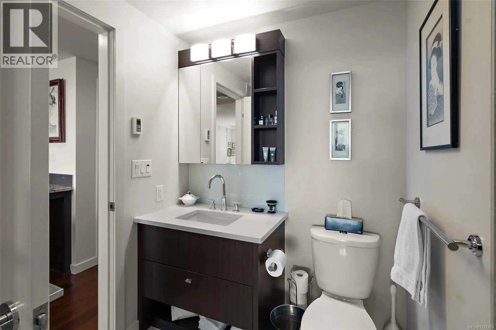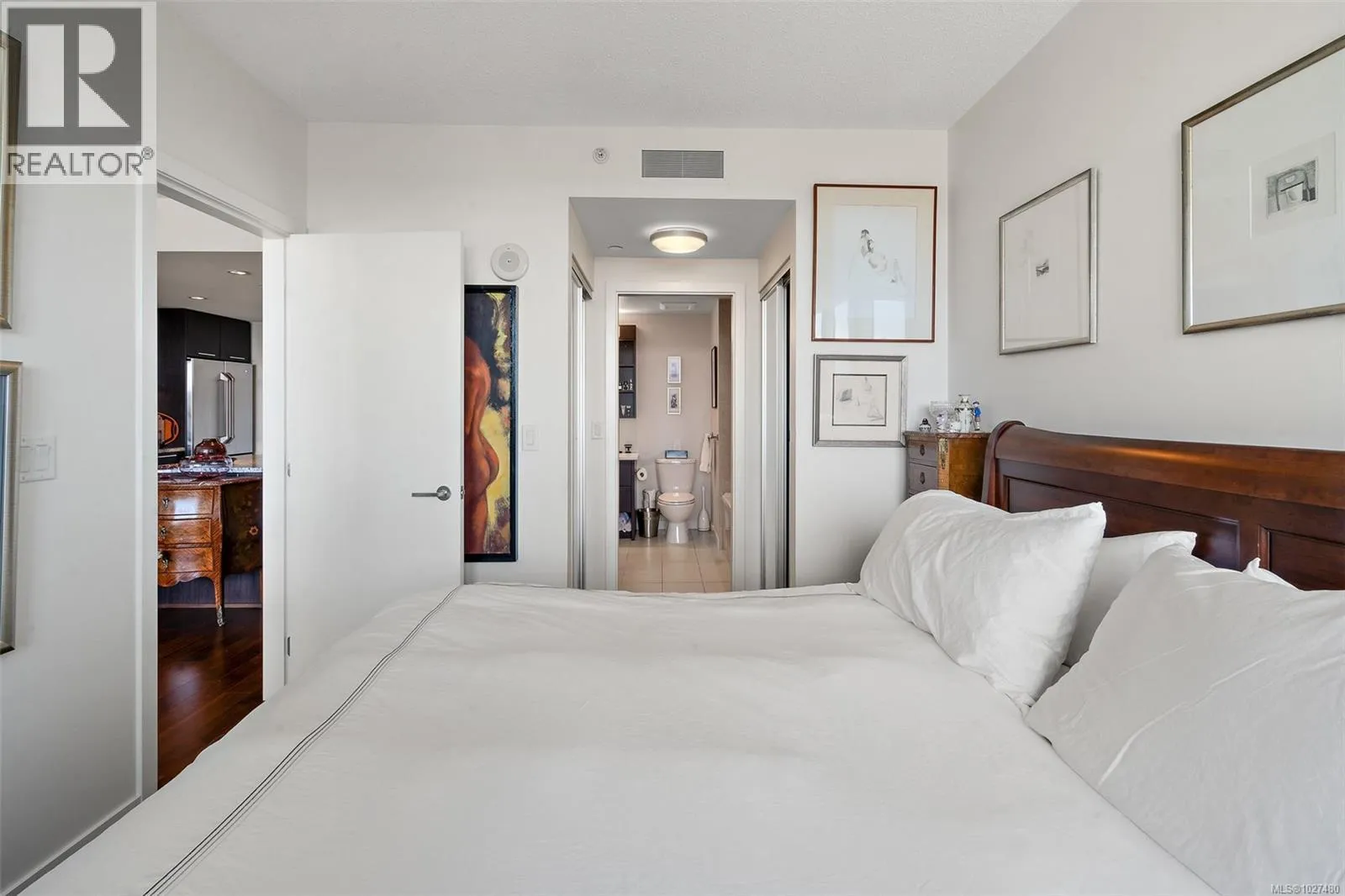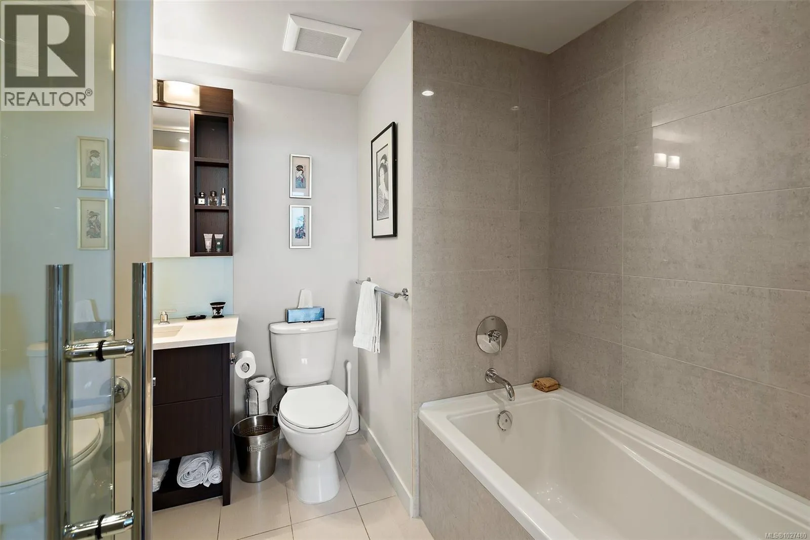 Elegantly appointed 1 bedroom, 1 bathroom in one of Victoriaâs most distinguished buildings. Featuring a peek-a-boo view of the harbour and mountains, this home boasts a modern features such as a gas range, air conditioning, a serene 4-piece bathroom and two storage lockers. A car elevator provides seamless access to your secure underground parking stall. Residents enjoy a spectacular rooftop patio, ideal for entertaining or quiet reflection. Situated in the heart of downtown, just steps from the iconic Inner Harbour, this is refined urban living at its finest. A must see to truly appreciate this lovely building and unit. (id:27476)