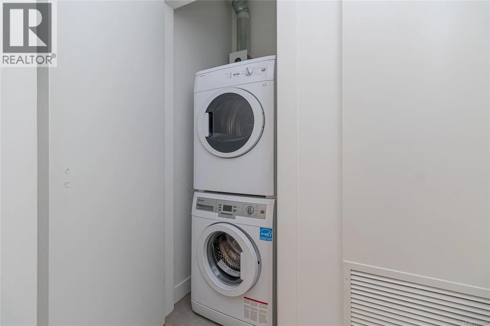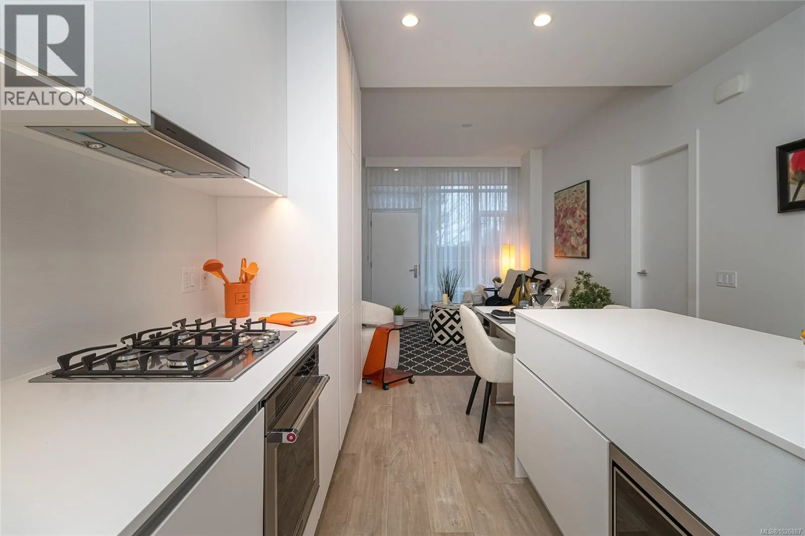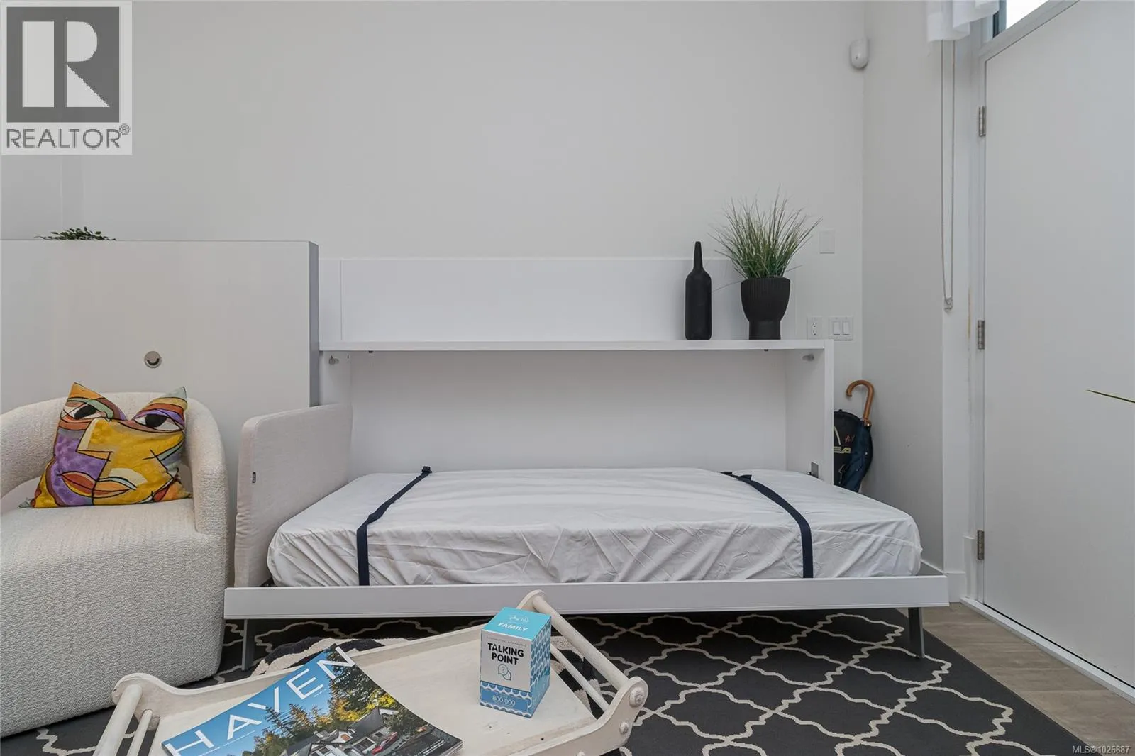 This exceptional 1-bedroom, 1-bath suite is in like-new condition and located within one of Victoriaâs most prestigious waterfront communities, the Songhees. A rare offering, the home features expansive windows on both northeast (front) and southwest (rear) exposures, plus an impressive 662+ sq. ft. of private patio spaceâperfect for seamless indoor-outdoor living. Enjoy the convenience of a private street-level entrance along with secure, direct access to the outdoor pool, fire pit, lounge, fitness centre, and secured underground parking with storage. Thoughtfully designed, the open-concept layout offers high ceilings and a spacious kitchen appointed with premium cabinetry, stainless steel appliance package with gas range, newly installed oven, and an oversized island with an extendable dining table accommodating up to eight. The living room features a built-in media unit with wall bed, while the spa-inspired cheater ensuite complements the bedroom with custom built-ins and tailored window coverings. Additional highlights include a heat pump and security system. Residents of Encore by BOSA enjoy a true five-star lifestyle with full-time concierge service, a fully equipped gym, elegant ownerâs lounge, heated outdoor pool with fire pit and seating areas, guest suite, secure bike storage, storage locker, one underground secured parking stall, and visitor parking. (id:27476)