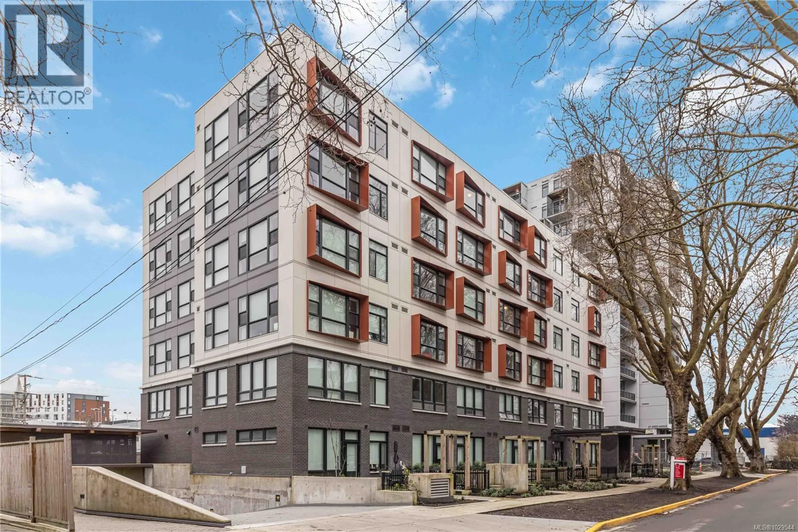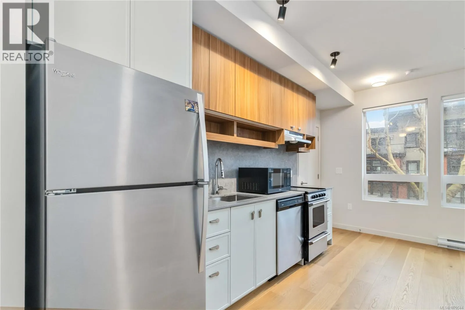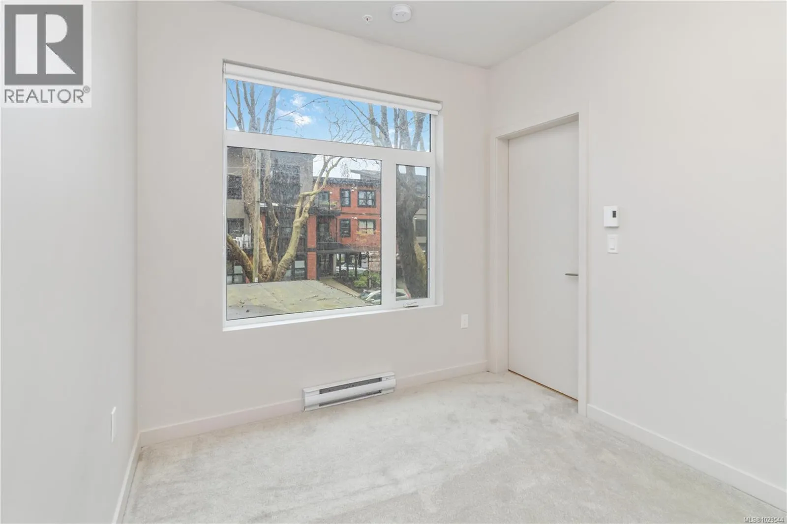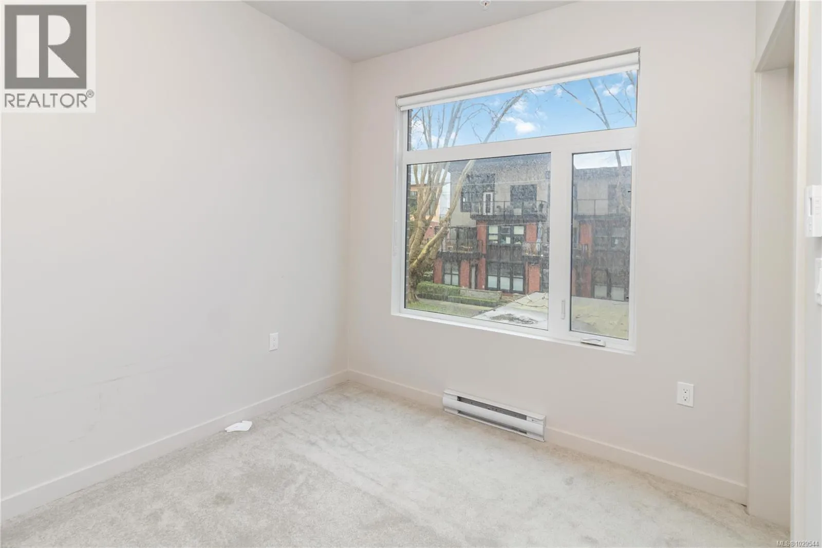 Welcome to this relatively new one bed and den unit at Tresah East, a contemporary condo community ideally located in Victoriaâs vibrant Midtown, just minutes to downtown, the Galloping Goose Trail, and the Gorge Waterway. The open-concept layout features nearly 9-foot ceilings, wide-plank oak flooring, and modern finishes throughout.The stylish kitchen includes quartz countertops and a stainless steel appliance package, seamlessly flowing into the oversized living space filled with natural light from multiple exposures. Additional features include in-suite laundry and enhanced soundproofing for added comfort. Tresah East offers secure bike storage and MODO car share accessâan ideal opportunity to enjoy modern urban living in one of Victoriaâs most convenient locations. (id:27476)