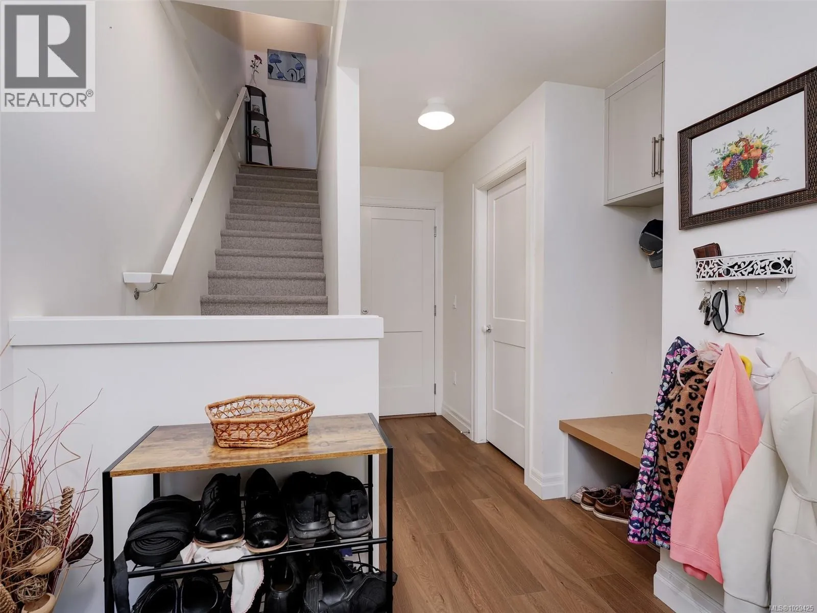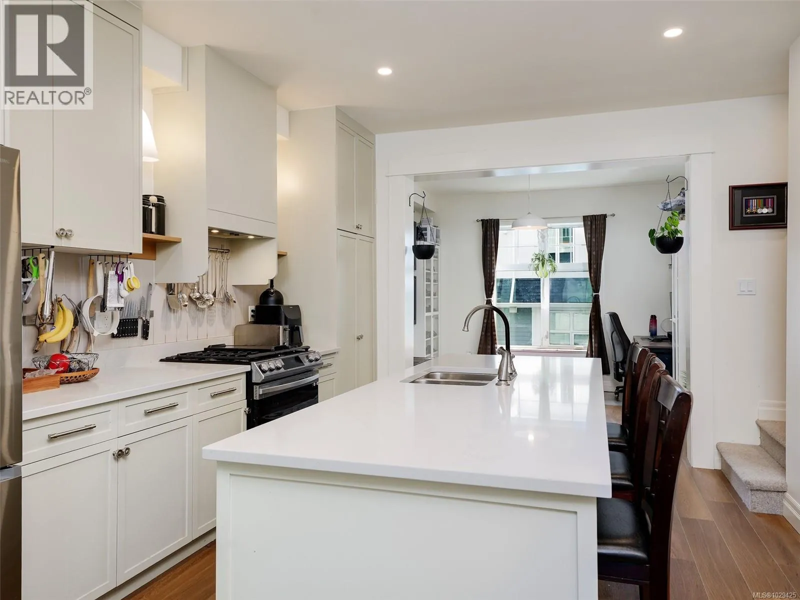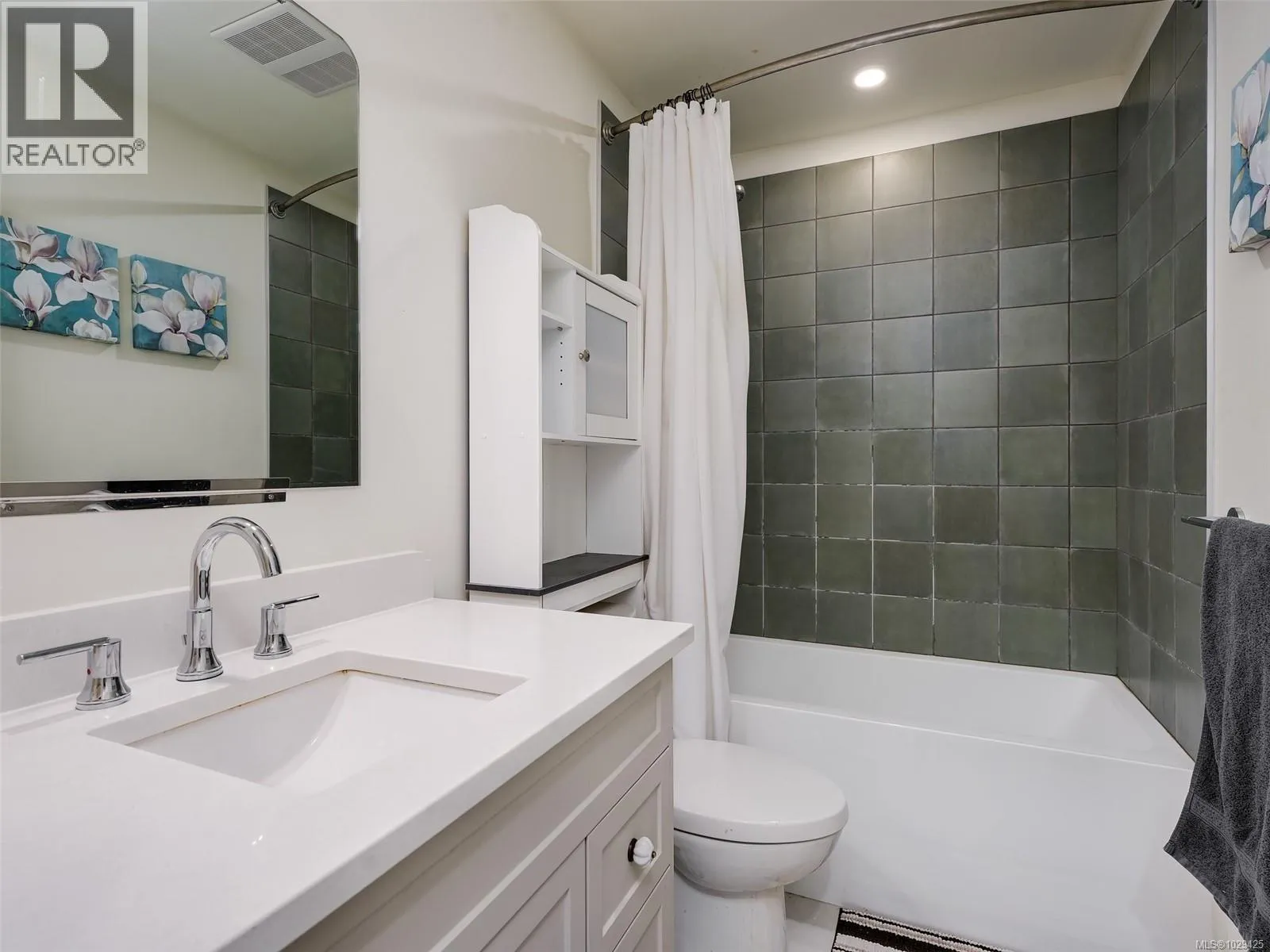 Welcome to this bright 4 bedroom, 2.5 bathrooms townhouse that has one of the best family floor plans in the development. The open-concept main floor is designed for entertaining, featuring living and dining areas and a beautiful kitchen with full height cabinetry, quartz countertops and premium appliances with gas range. The upper level comprises three nicely appointed bedrooms with full size washer & dryer. The primary suite offers a walk-in closet and a luxurious ensuite with a glass shower & heated floors. The lower floor features the fourth bedroom which could be a home office or media room. Additionally, there is a storage room for all those extras which is handy to the single car garage with EV charger. This central location has a great feel with its tree lined streets and close proximity to the Selkirk Waterfront, Galloping Goose Trail and all shopping amenities. Don't miss the opportunity to call this place home and book your private showing. (id:27476)