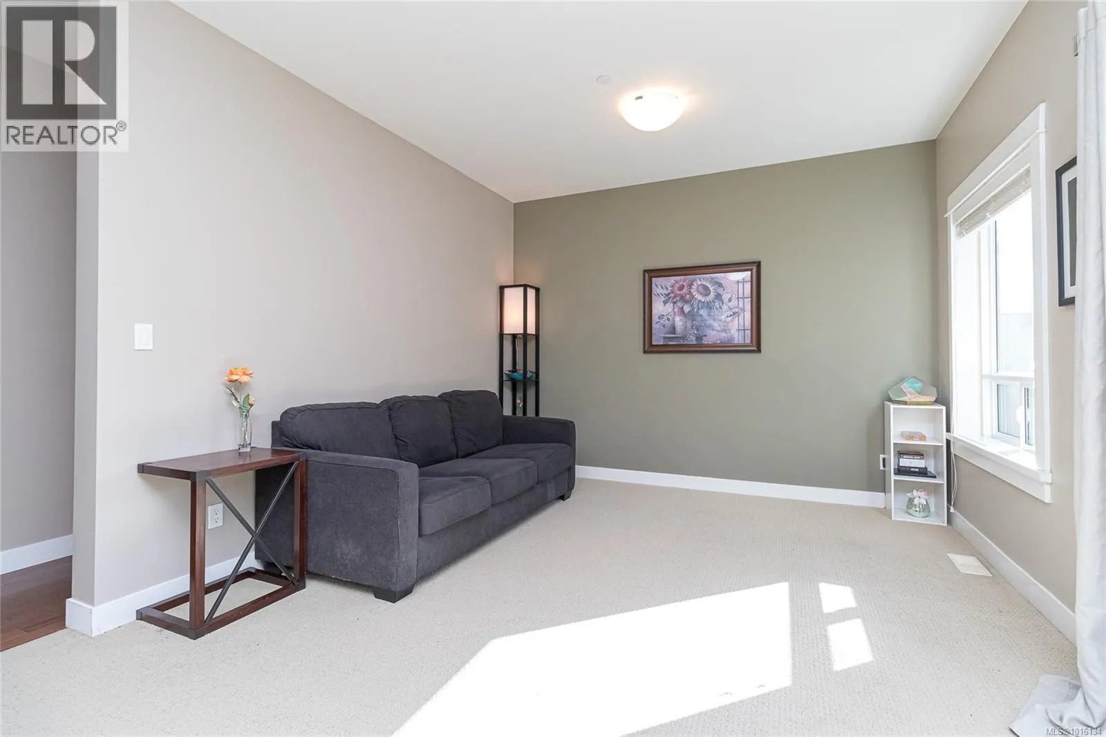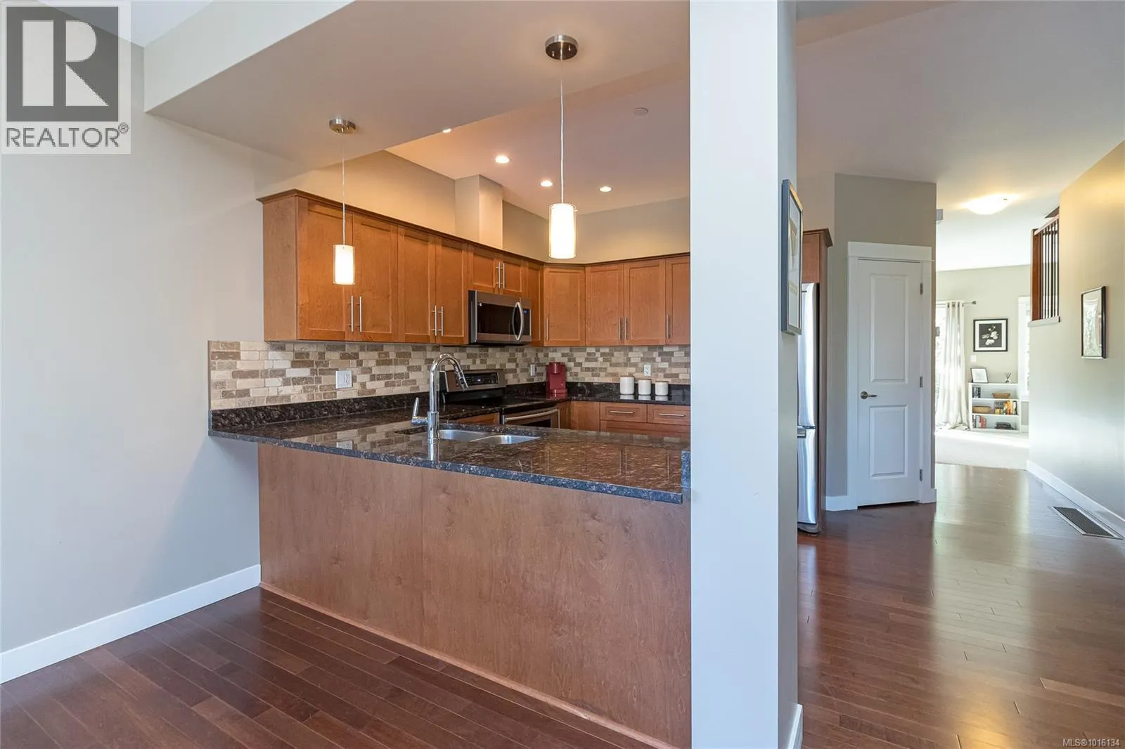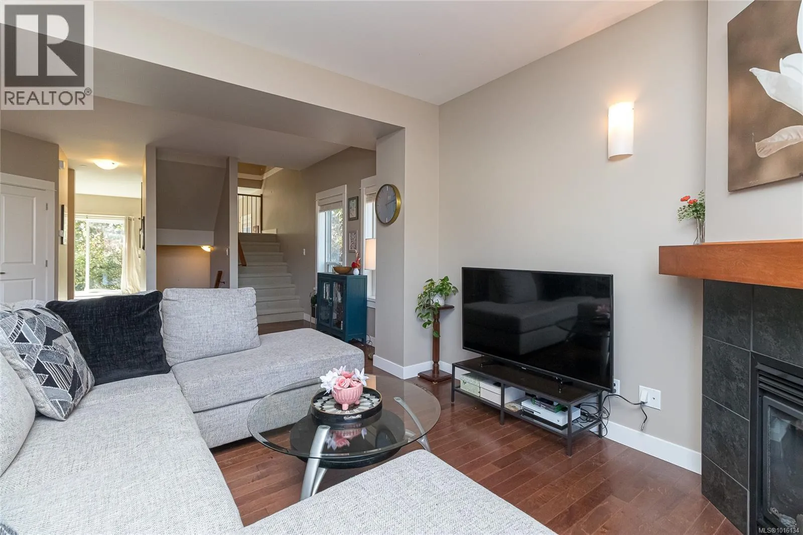 OPEN Sat. 8th 1:00 PM - 3:00 PM...A luxurious end unit Townhome located near the park, Galloping Goose Trail and Thetis Lake and is just 12 min. to Downtown. This home has 2266 sf on 3 levels; and is like a half duplex in design with only a neighbor to its one side; a double garage with additional parking spots on its driveway; and views overlooking beautiful treed area and privacy. The 2nd level includes a gourmet kitchen with eating peninsula, granite counters, s/s appliances and walk-in pantry; an open dining and living room with patio door access to a huge balcony area, and a very large family room with a walk out patio and private garden setting. An open staircase leads to 3 good-sized bedrooms on the upper level; including a spacious Primary Bedroom with 10' 6'' ceilings and deluxe 5 pce ensuite bath, a laundry room and a 2nd full bath. Outstanding features include wood floors, good storage area, geothermal heating / AC and extra parking for flexibility. (id:27476)