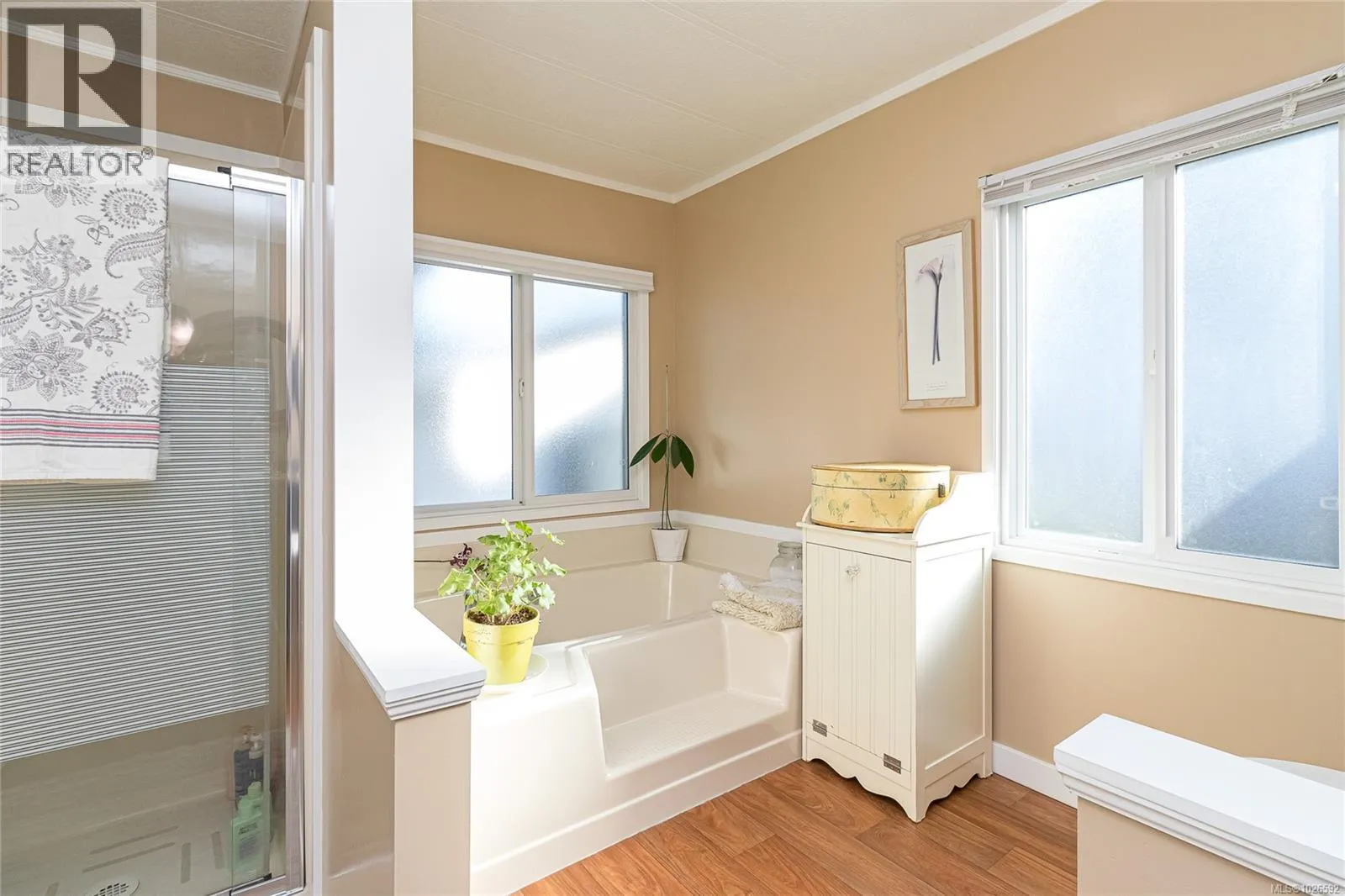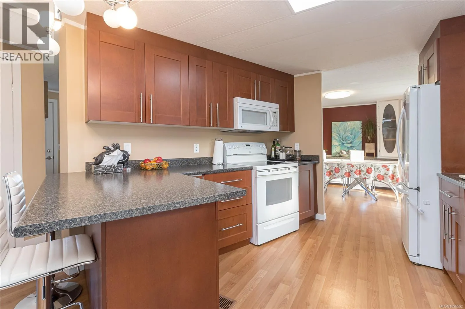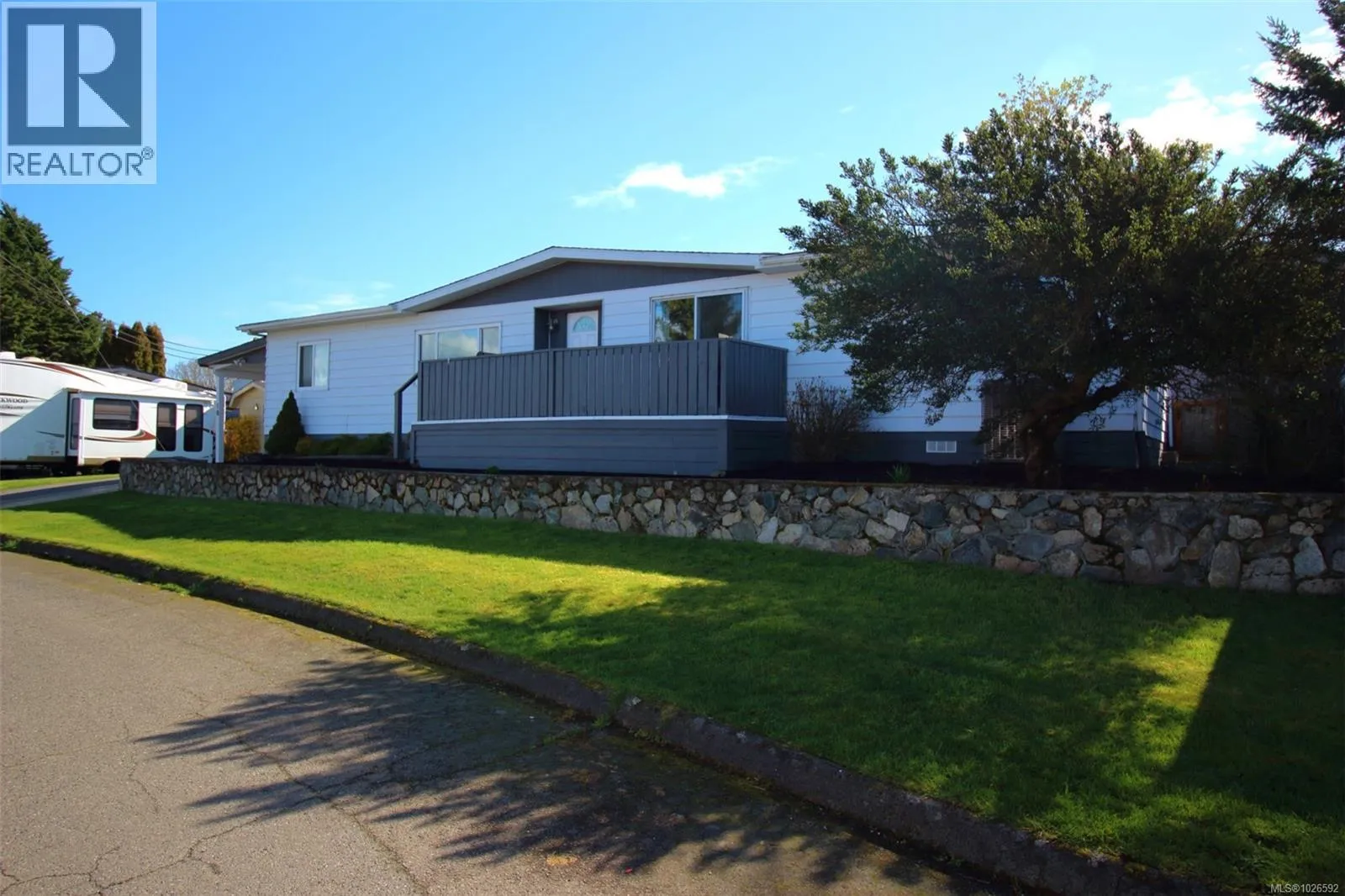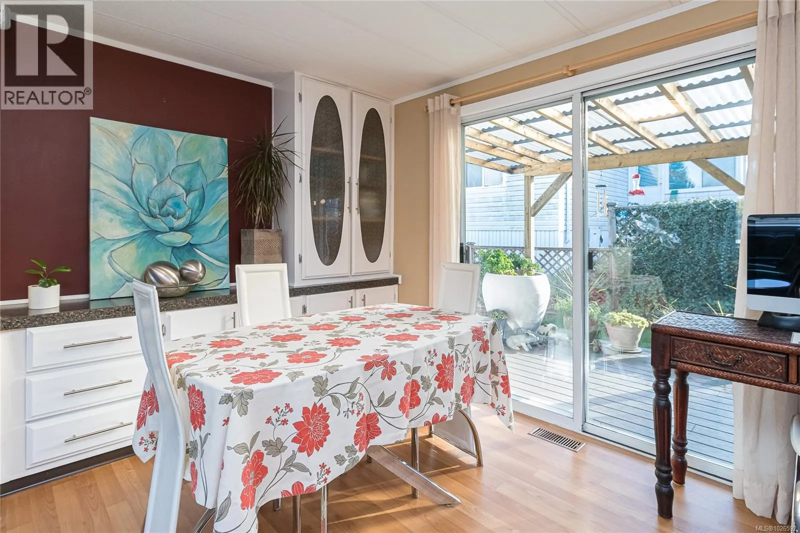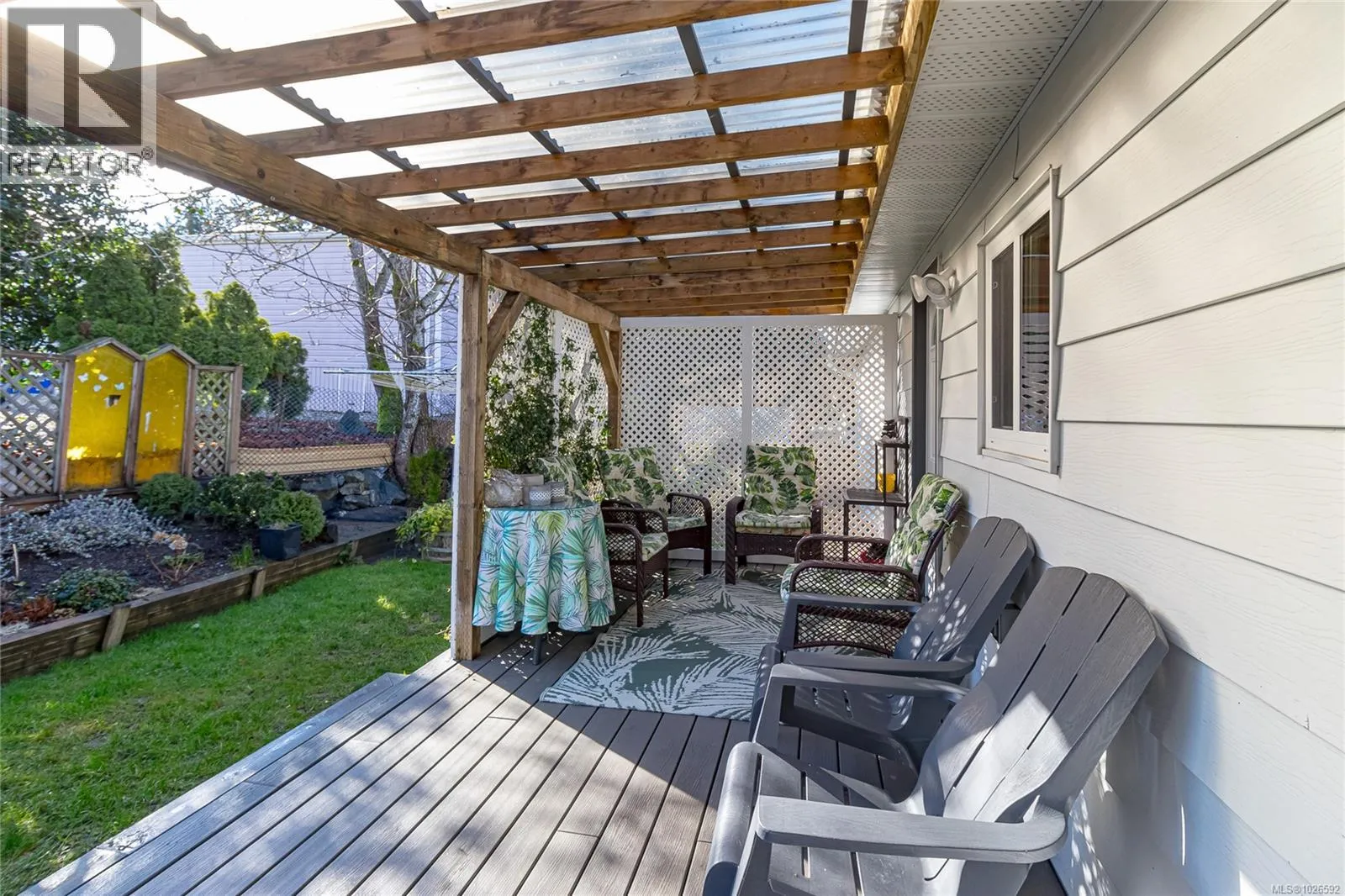 Welcome to this wonderfully maintained double-wide manufactured home offering over 1,400 sq. ft. of bright, functional living space. The floor plan features a private master bedroom with a 4-piece ensuite, 2 additional bedrooms and a second 4-piece bath at the opposite end of the home. The heart of the home boasts a spacious living room, a dining area featuring a classic built-in hutch with deck access. A bright kitchen with abundant counter space & cabinetry, and convenient bar seating. A separate family room offers the perfect flex space for an office or hobby room. Enjoy year-round comfort with a high-efficiency forced air heating system equipped with a heat pump, providing cozy winters and refreshing a/c all summer long.The fully fenced backyard has a large, covered vinyl deck that overlooks a sunny backyard primed for your gardening ideas. There is a covered carport with additional parking spots for guests, and a wired storage shed. Conveniently located just a short walk to groceries, pharmacy, and retail shops. (id:27476)