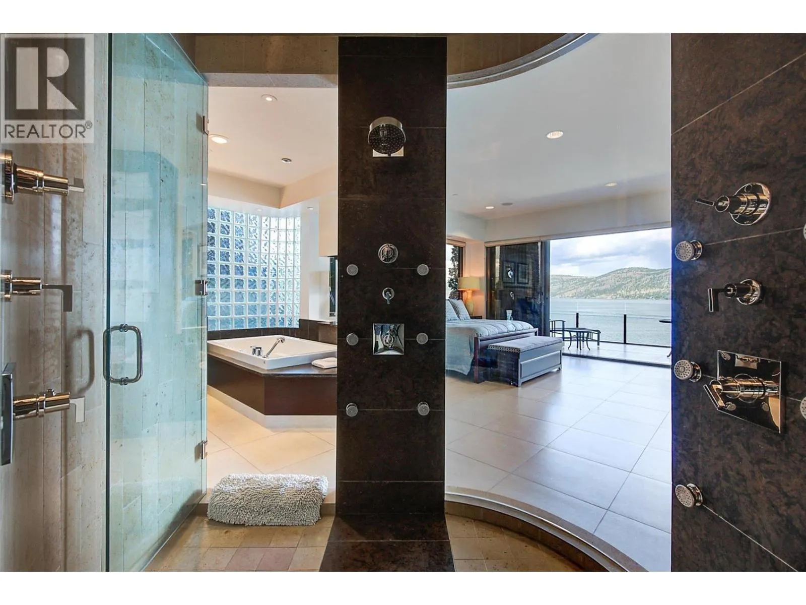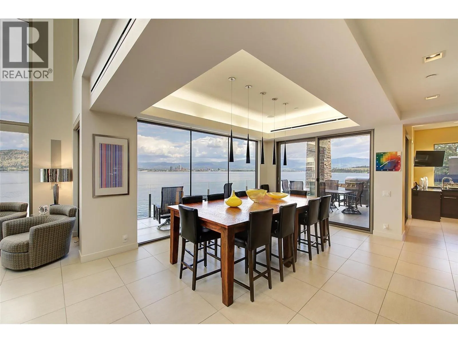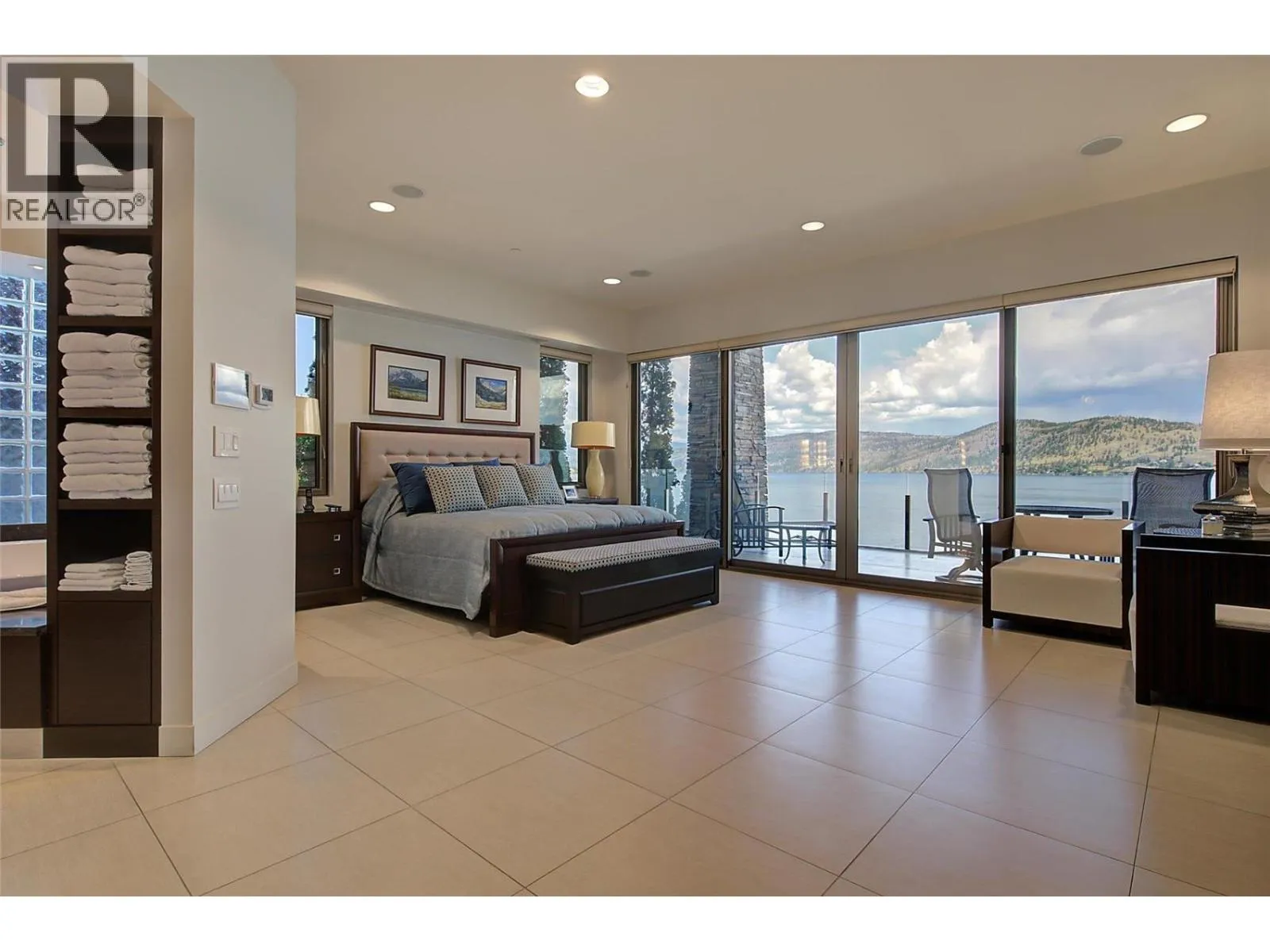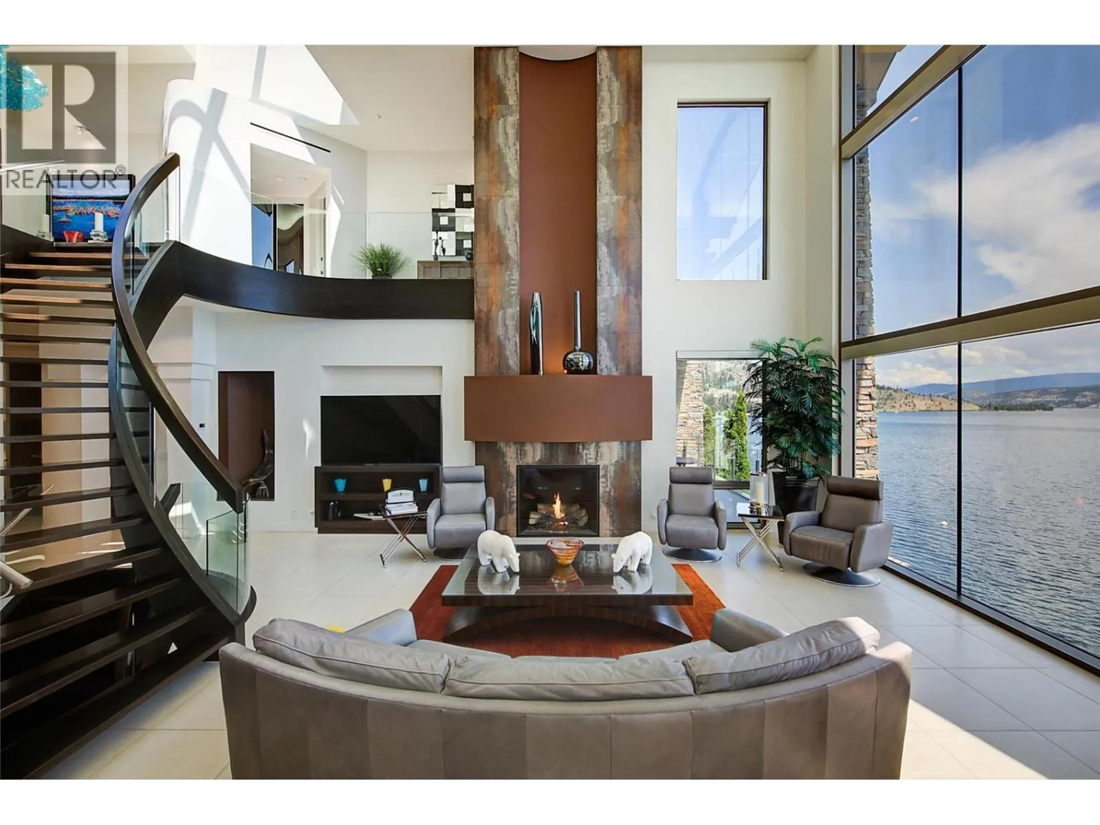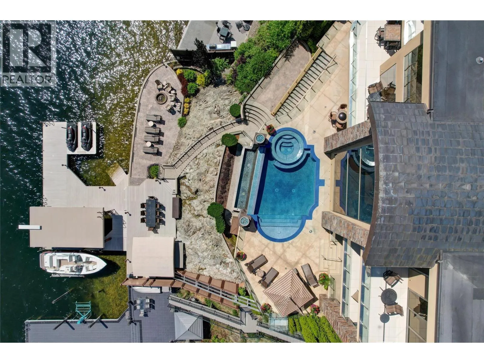 Nestled in the exclusive gated community of Sailview Bay, just 10 minutes from downtown Kelowna, this stunning 8,007 sq. ft. 4-bedroom, 8-bathroom estate is a true architectural gem. Designed with elegance and precision, it seamlessly blends luxury and comfort. From the moment you step through the grand glass entrance, the homeâs quality and craftsmanship are undeniable. Spanning four levels with an elevator for easy access, it offers an exceptional layout. The upper level features three guest suites, each with their own private washroom, a laundry room, and a custom office. A tandem garage completes this level. The main floor is the heart of the home, boasting a spectacular primary suite with a spa-like ensuite and walk-in closet. A soaring great room with dramatic lake views flows into the dining area and gourmet kitchen. A secondary laundry and pantry ensure effortless functionality, while a second double garage provides easy access. Designed for entertaining, the lower level features a stylish bar, theatre room, and spa-inspired bath with a steam shower. Expansive patio doors open to an infinity pool, hot tub, and stunning outdoor lounge. Below, a private wine cave and poker room, carved into the cliffside, create a one-of-a-kind retreat. Waterfront amenities include a deep-water dock with two boat lifts, two Sea-Doo lifts, and a beachfront cabana with a private washroom. Offering luxury, privacy, and convenience, this is one of Okanagan Lakeâs finest estates. (id:27476)