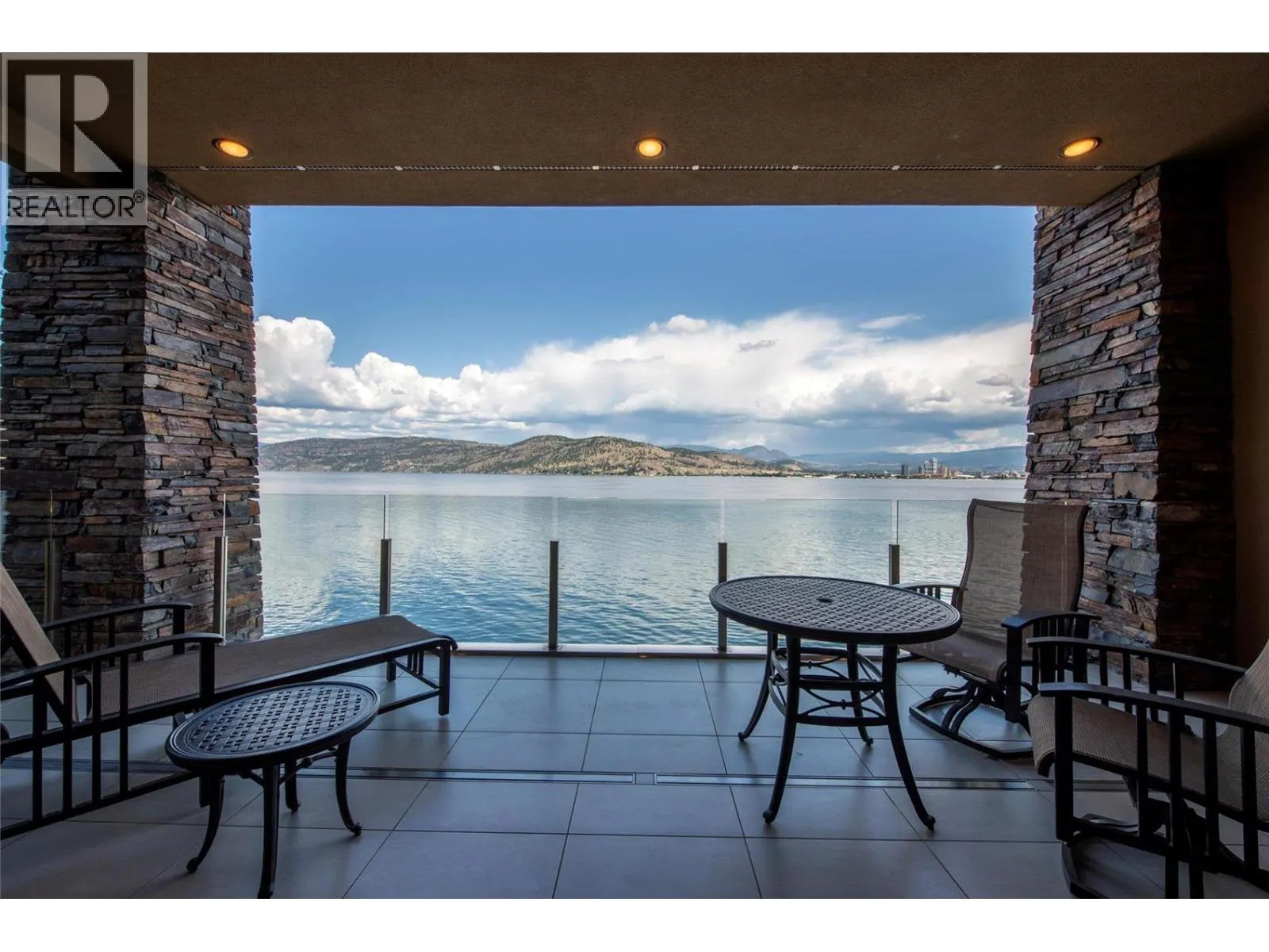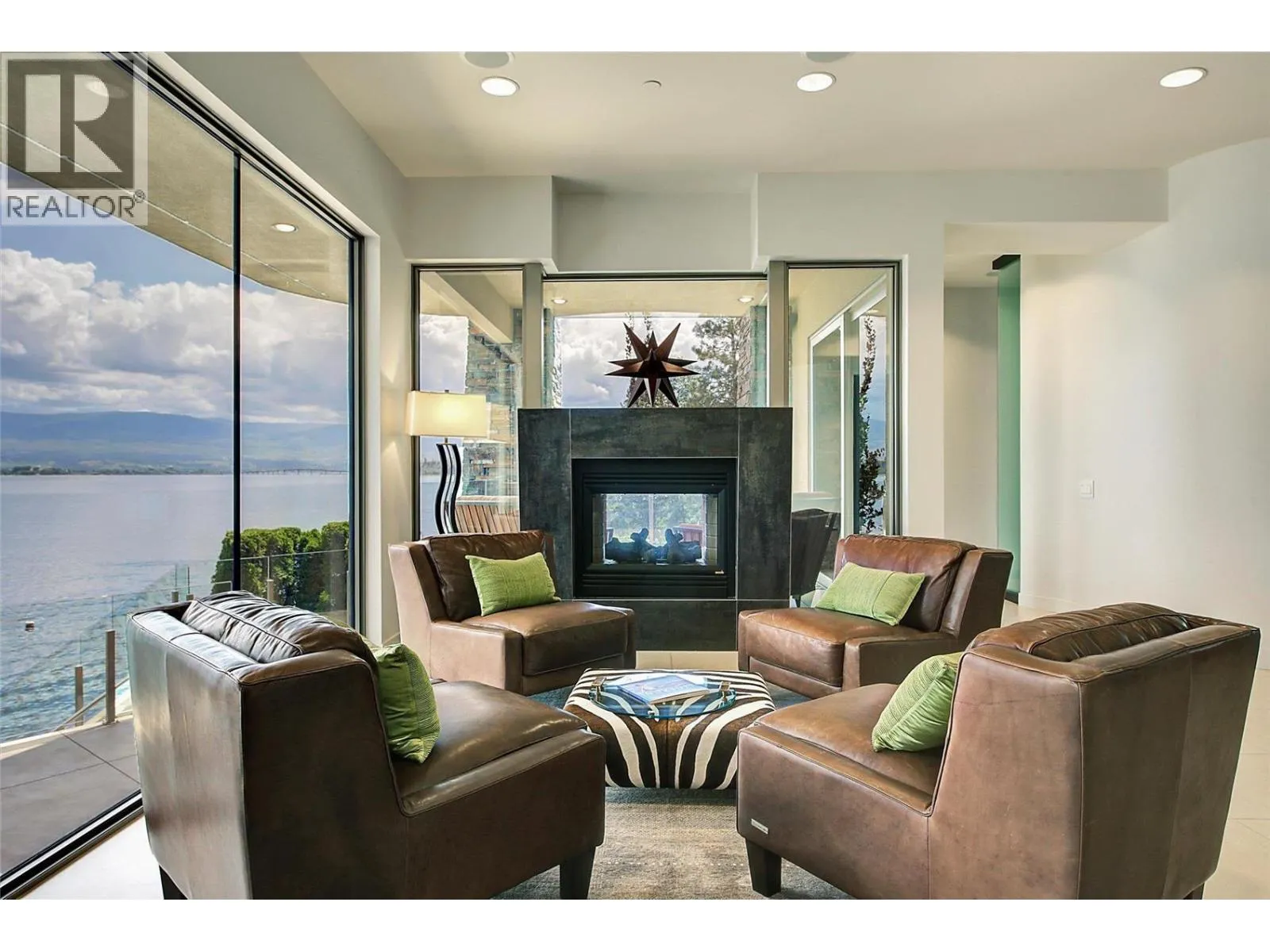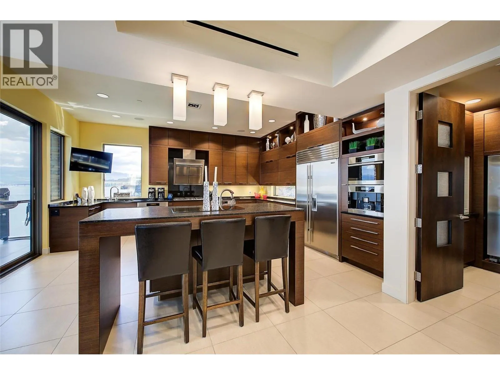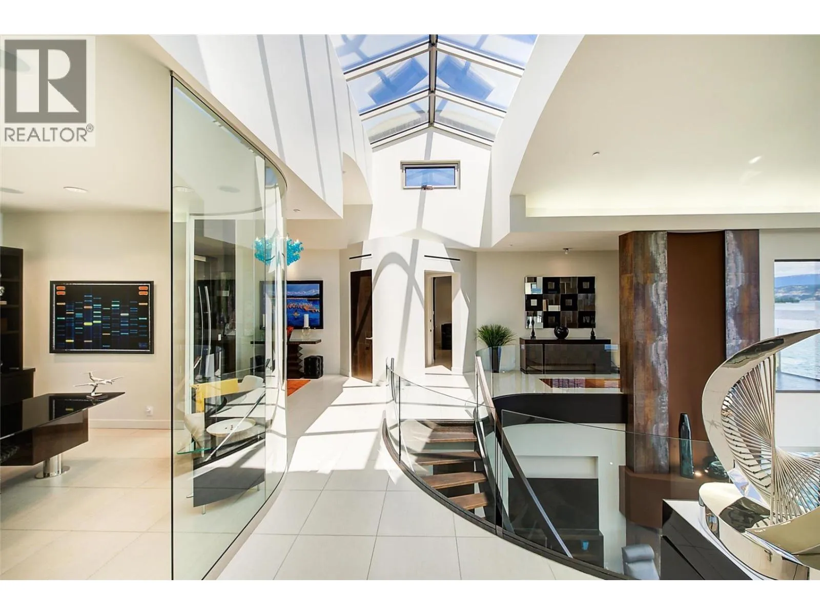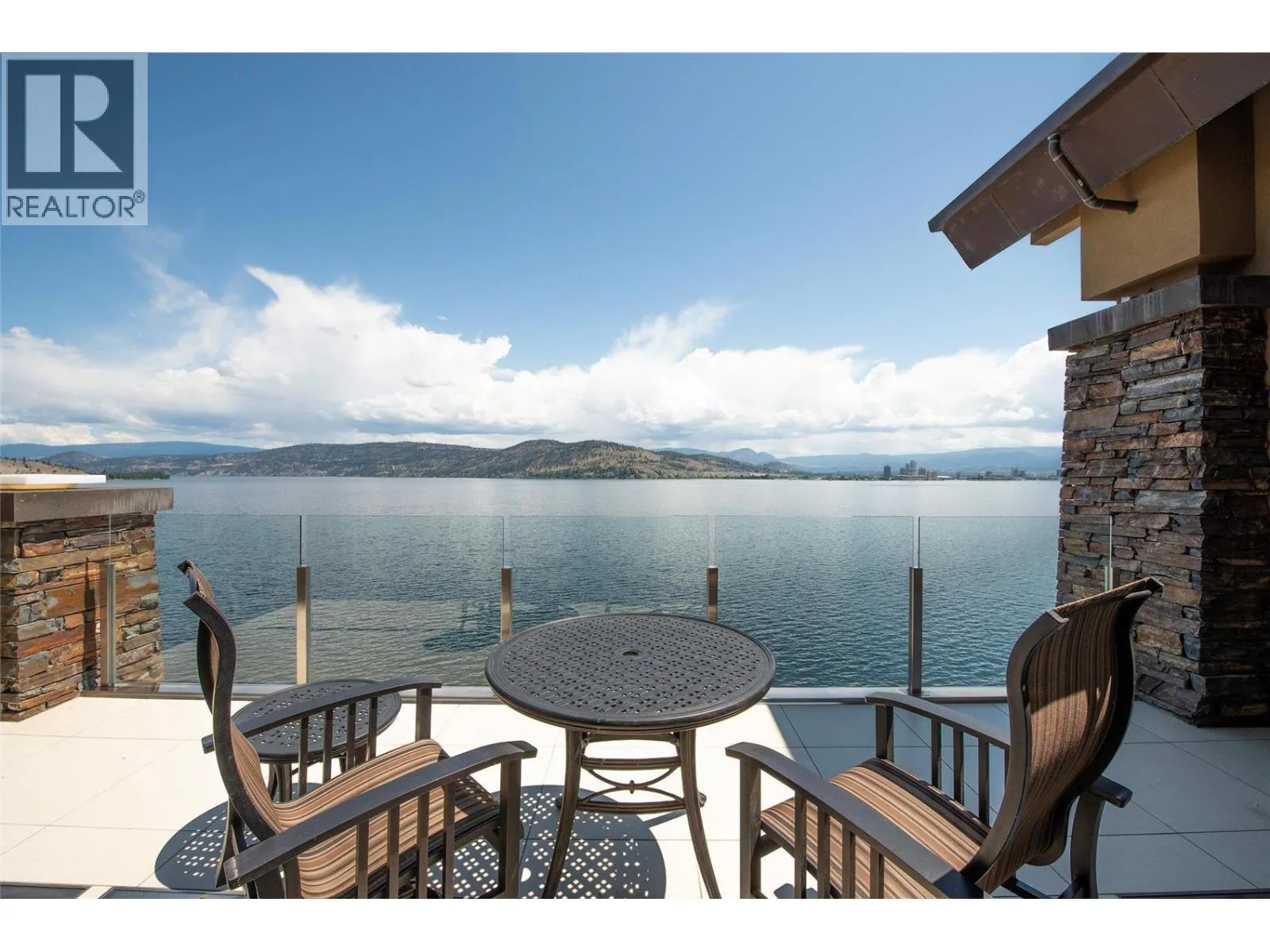 Nestled in the exclusive gated community of Sailview Bay, just 10 minutes from downtown Kelowna, this stunning 8,007 sq. ft. 4-bedroom, 8-bathroom estate is a true architectural gem. Designed with elegance and precision, it seamlessly blends luxury and comfort. From the moment you step through the grand glass entrance, the homeâs quality and craftsmanship are undeniable. Spanning four levels with an elevator for easy access, it offers an exceptional layout. The upper level features three guest suites, each with their own private washroom, a laundry room, and a custom office. A tandem garage completes this level. The main floor is the heart of the home, boasting a spectacular primary suite with a spa-like ensuite and walk-in closet. A soaring great room with dramatic lake views flows into the dining area and gourmet kitchen. A secondary laundry and pantry ensure effortless functionality, while a second double garage provides easy access. Designed for entertaining, the lower level features a stylish bar, theatre room, and spa-inspired bath with a steam shower. Expansive patio doors open to an infinity pool, hot tub, and stunning outdoor lounge. Below, a private wine cave and poker room, carved into the cliffside, create a one-of-a-kind retreat. Waterfront amenities include a deep-water dock with two boat lifts, two Sea-Doo lifts, and a beachfront cabana with a private washroom. Offering luxury, privacy, and convenience, this is one of Okanagan Lakeâs finest estates. (id:27476)