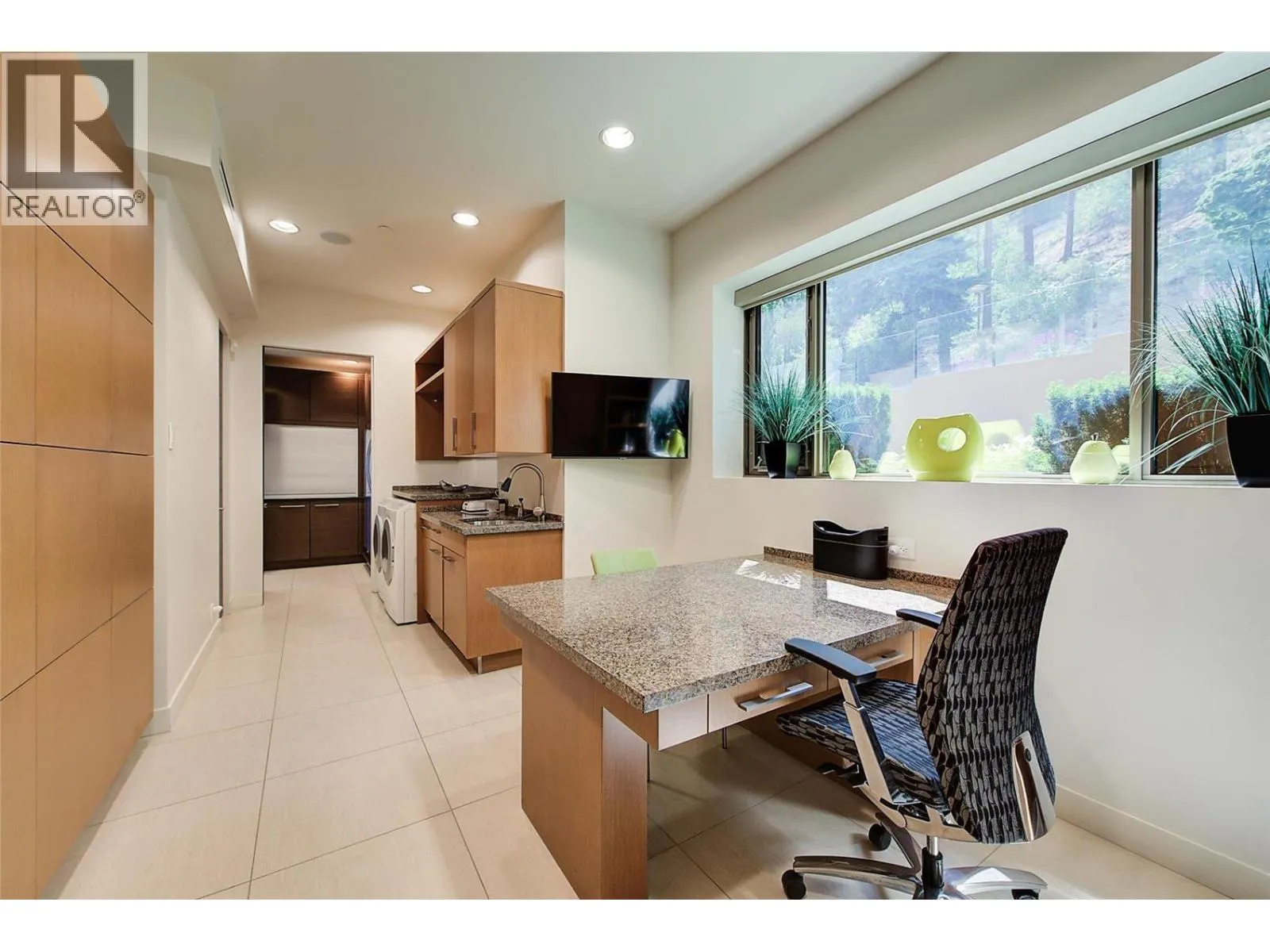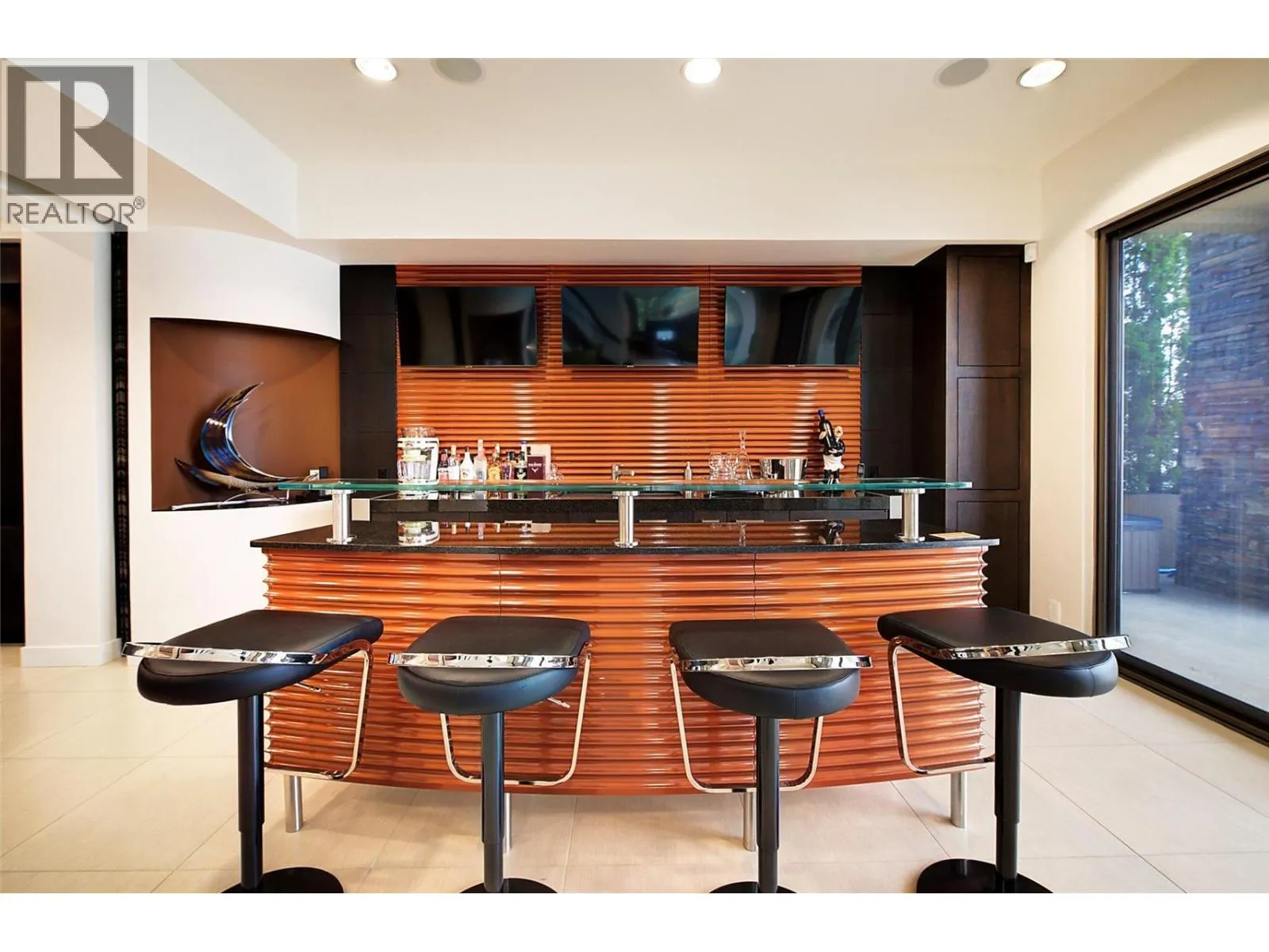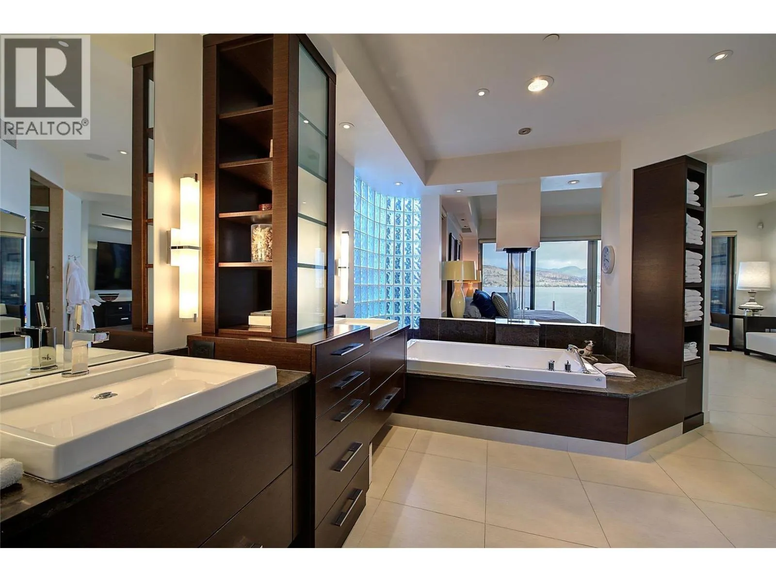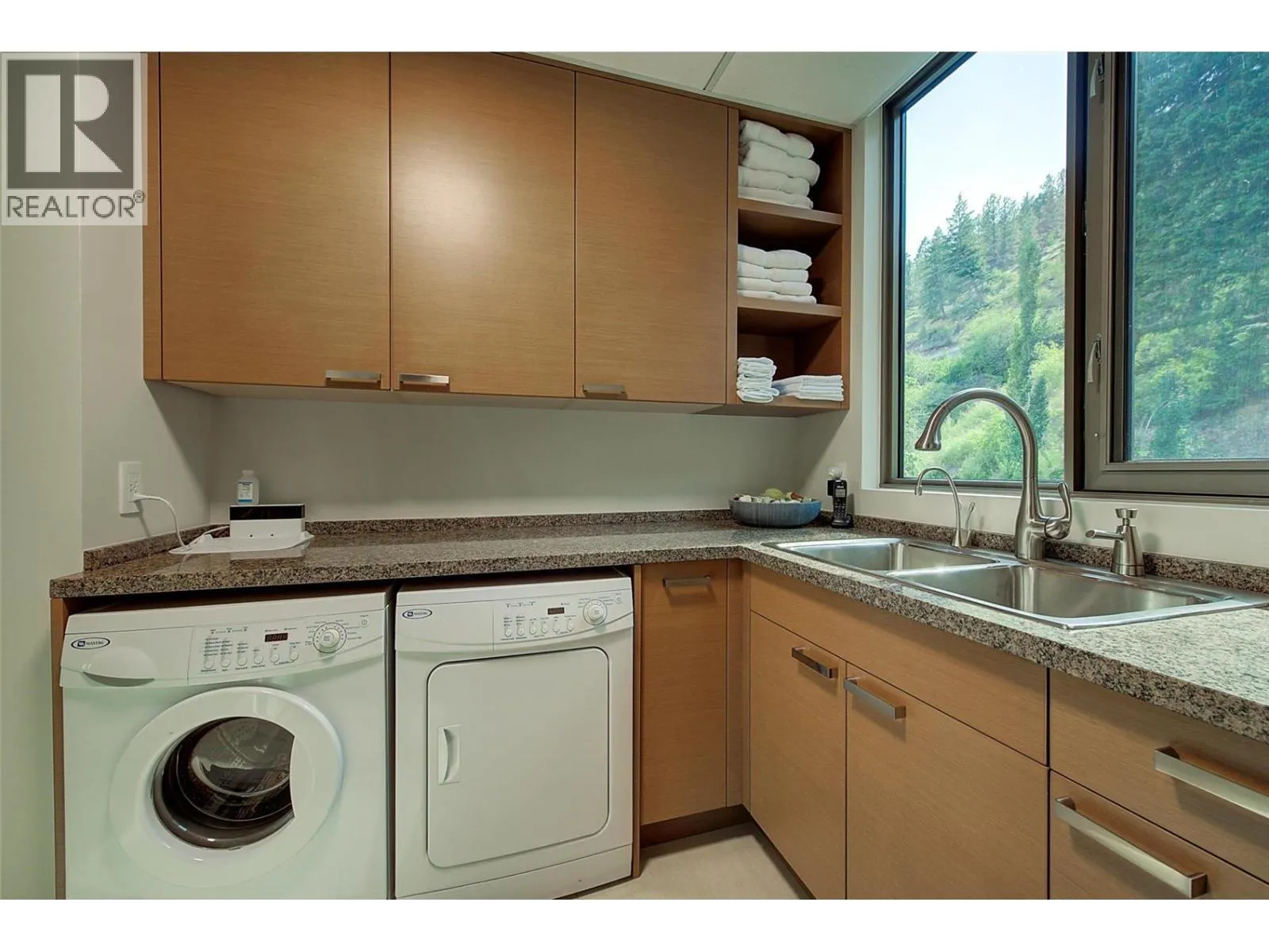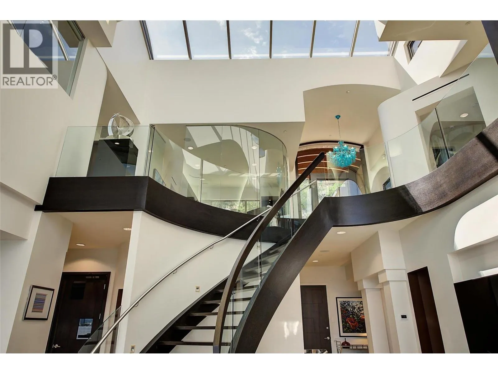 Nestled in the exclusive gated community of Sailview Bay, just 10 minutes from downtown Kelowna, this stunning 8,007 sq. ft. 4-bedroom, 8-bathroom estate is a true architectural gem. Designed with elegance and precision, it seamlessly blends luxury and comfort. From the moment you step through the grand glass entrance, the homeâs quality and craftsmanship are undeniable. Spanning four levels with an elevator for easy access, it offers an exceptional layout. The upper level features three guest suites, each with their own private washroom, a laundry room, and a custom office. A tandem garage completes this level. The main floor is the heart of the home, boasting a spectacular primary suite with a spa-like ensuite and walk-in closet. A soaring great room with dramatic lake views flows into the dining area and gourmet kitchen. A secondary laundry and pantry ensure effortless functionality, while a second double garage provides easy access. Designed for entertaining, the lower level features a stylish bar, theatre room, and spa-inspired bath with a steam shower. Expansive patio doors open to an infinity pool, hot tub, and stunning outdoor lounge. Below, a private wine cave and poker room, carved into the cliffside, create a one-of-a-kind retreat. Waterfront amenities include a deep-water dock with two boat lifts, two Sea-Doo lifts, and a beachfront cabana with a private washroom. Offering luxury, privacy, and convenience, this is one of Okanagan Lakeâs finest estates. (id:27476)
