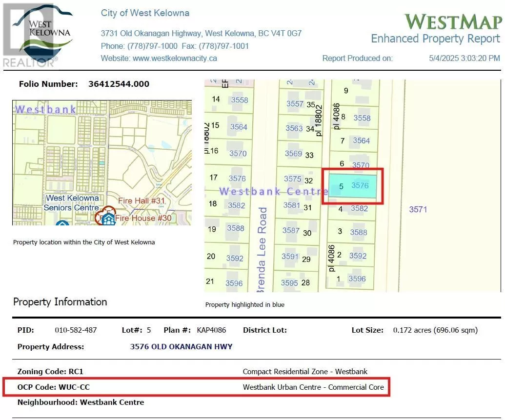 PRIME DEVELOPMENT: Opportunity in Westbank Urban Centre â Commercial Core (Area B) ATTENTION: Developers & Investors â secure a pivotal property in the rapidly evolving Westbank Urban Centre â Commercial Core Area B, recently designated under the new Official Community Plan (OCP). This well-located lot offers outstanding future potential in one of West Kelownaâs most strategic growth areas. FUTURE LAND USE: This 0.172-acre (696.06 sqm) site is currently zoned RC1 (Compact Residential) with an OCP designation of WUC-CC (Westbank Urban Centre â Commercial Core). Proposed OCP updates suggest potential for mixed-use development up to 15 storeys â ideal for developers targeting density and urban integration. RENT: The existing three-bedroom, one-bathroom home is well maintained and generates $2,500/month in rental income, making it a strong holding property while you plan redevelopment. HIGHLIGHTS: Prime location close to schools, restaurants, transit, golf, Superstore & Johnson Bentley Rec Centre Strong rental income in place: $2,500/month + Utilities Potential for high-rise, mixed-use development under new OCP guidelines Buyer to verify development potential as zoning and density bylaws are being finalized SECURE your position in West Kelownaâs future growth core today. (id:27476)