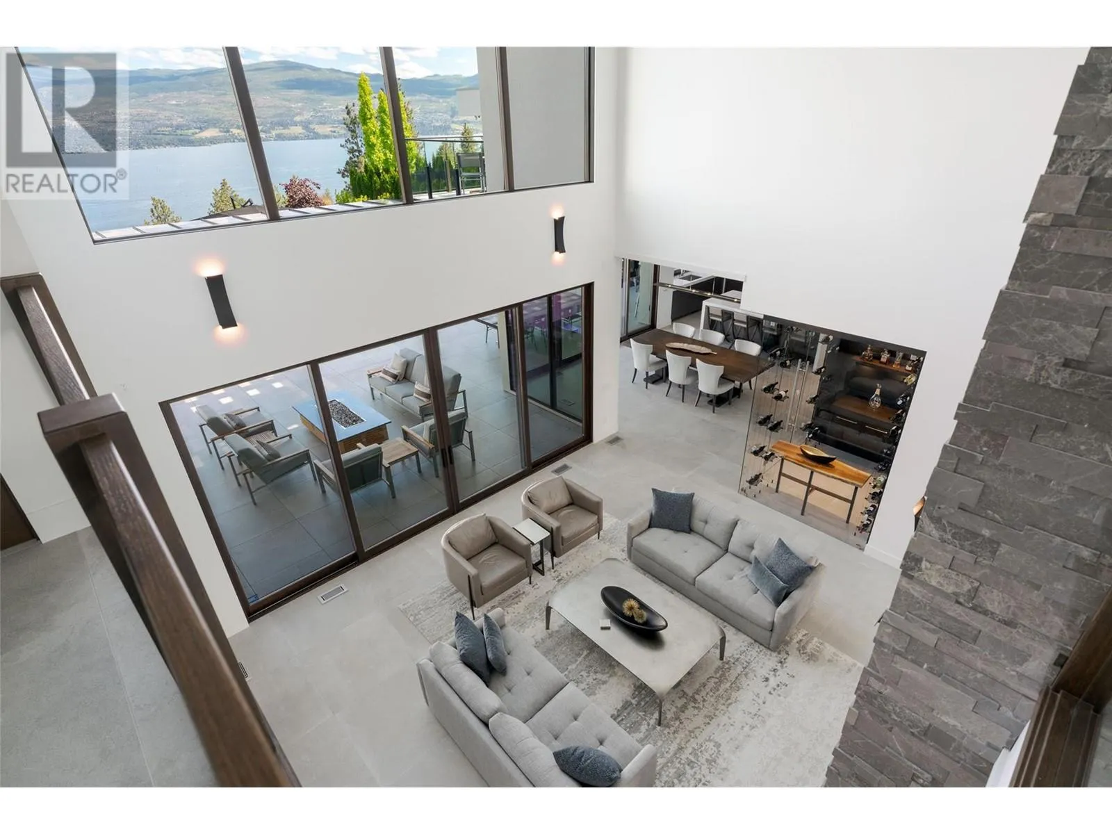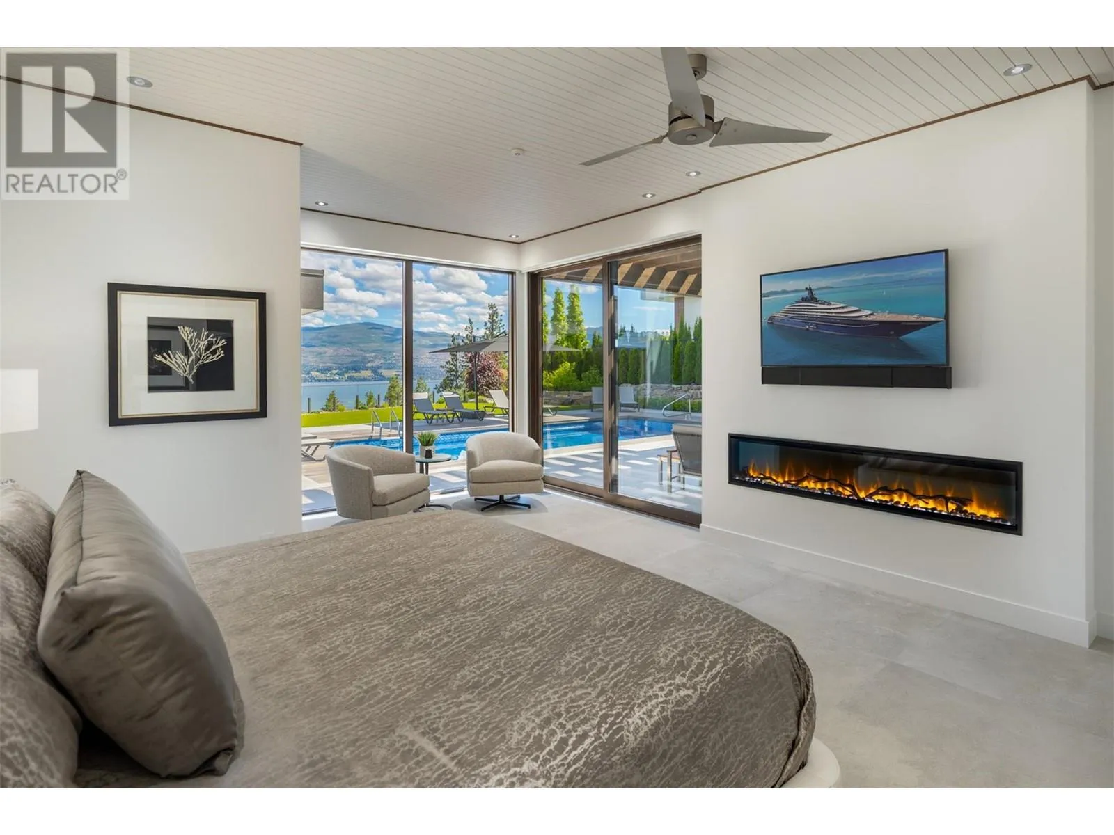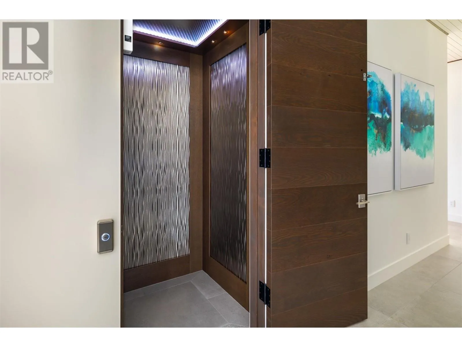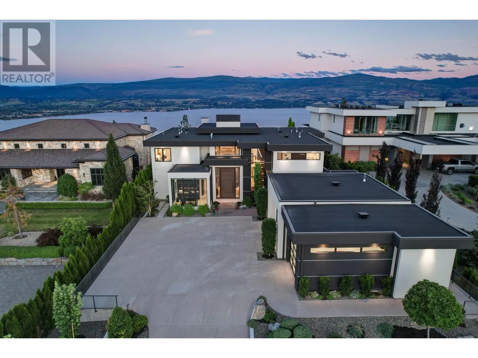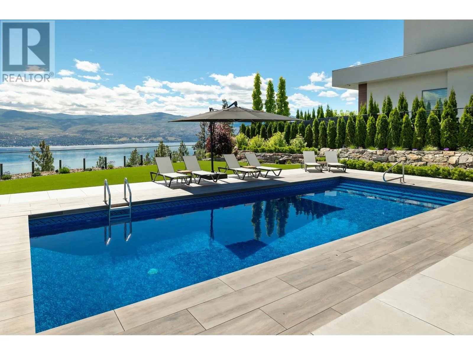Custom SanMarc home on desirable Thacker Drive in Lakeview Heights. This property boasts exceptional attention to detail that is sure to impress. Expertly designed, it offers a remarkable layout inside & out for everyday living while maintaining its allure as a modern masterpiece.From nearly every room & the backyard, enjoy expansive, unobstructed Okanagan Lake views. A solid wood 12-ft pivot door welcomes you to the foyer with a 20-ft marble tiled entry wall leading to the catwalk on the 2nd level, connecting the 2 wings of the home. The great room boasts 23-foot ceilings, floor-to-ceiling windows, & an 80-inch linear gas fireplace. Gourmet kitchen w/ Carolyn Walsh-designed cabinetry, waterfall island, professional appliances & a window that fully retracts, creating a passthrough to the outdoor kitchen. Glass-enclosed 75+ bottle temperature-controlled wine room. Sliding doors on the main level open to a remarkable outdoor retreat: saltwater pool with auto cover, synthetic lawn, Jacuzzi hot tub, outdoor kitchen, $12K sound system, covered patio w/ glass ceiling. Luxurious main floor primary w/ pool access, spa-inspired 5-piece en suite with views of the lake, heated floors, custom closet, and a linear gas fireplace. Main floor living with elevator that accesses all three floors. Upstairs offers 4 large beds, all with en suites, and 2 featuring private lake view patios. Laundry on both levels. Oversized 3-car garage with built-ins, custom cabinetry, and prewired for EV. (id:27476)