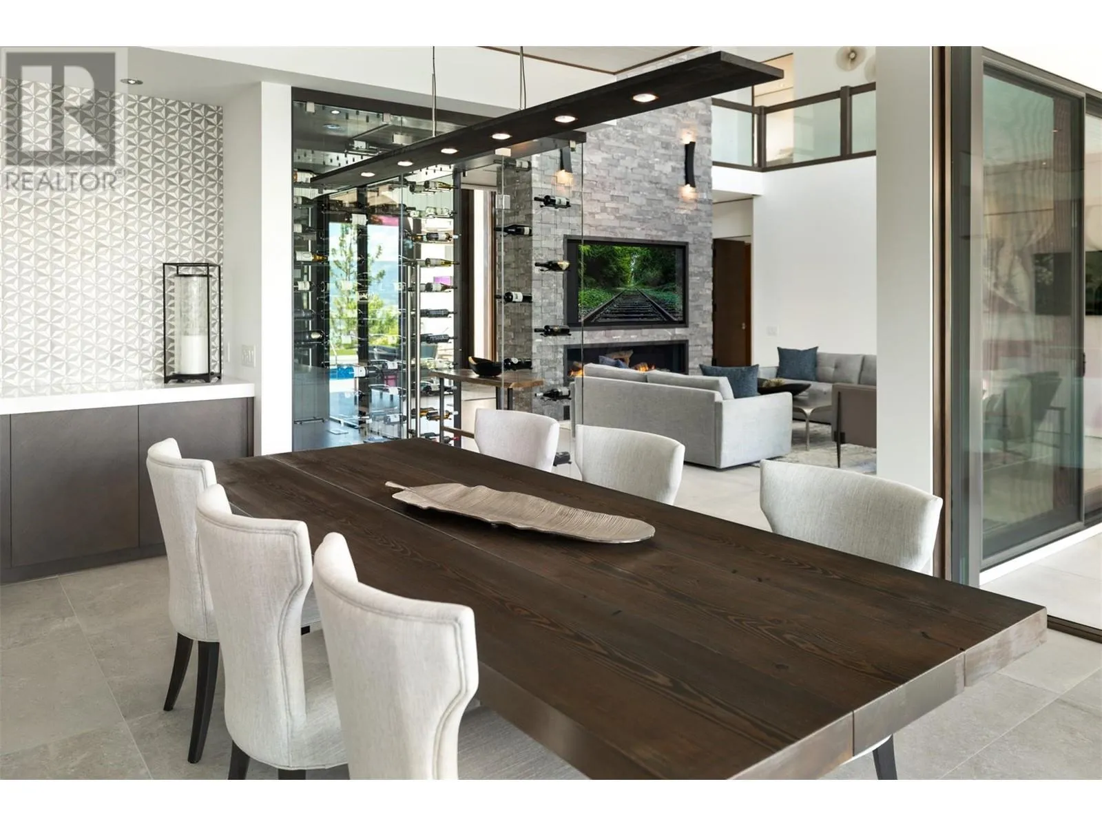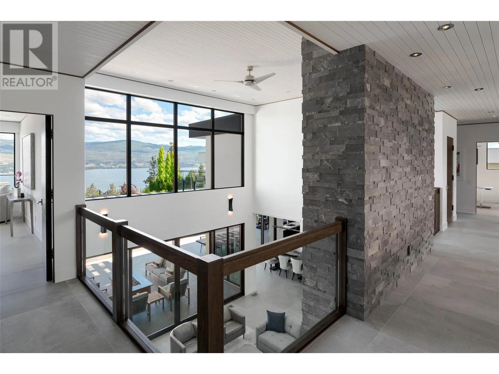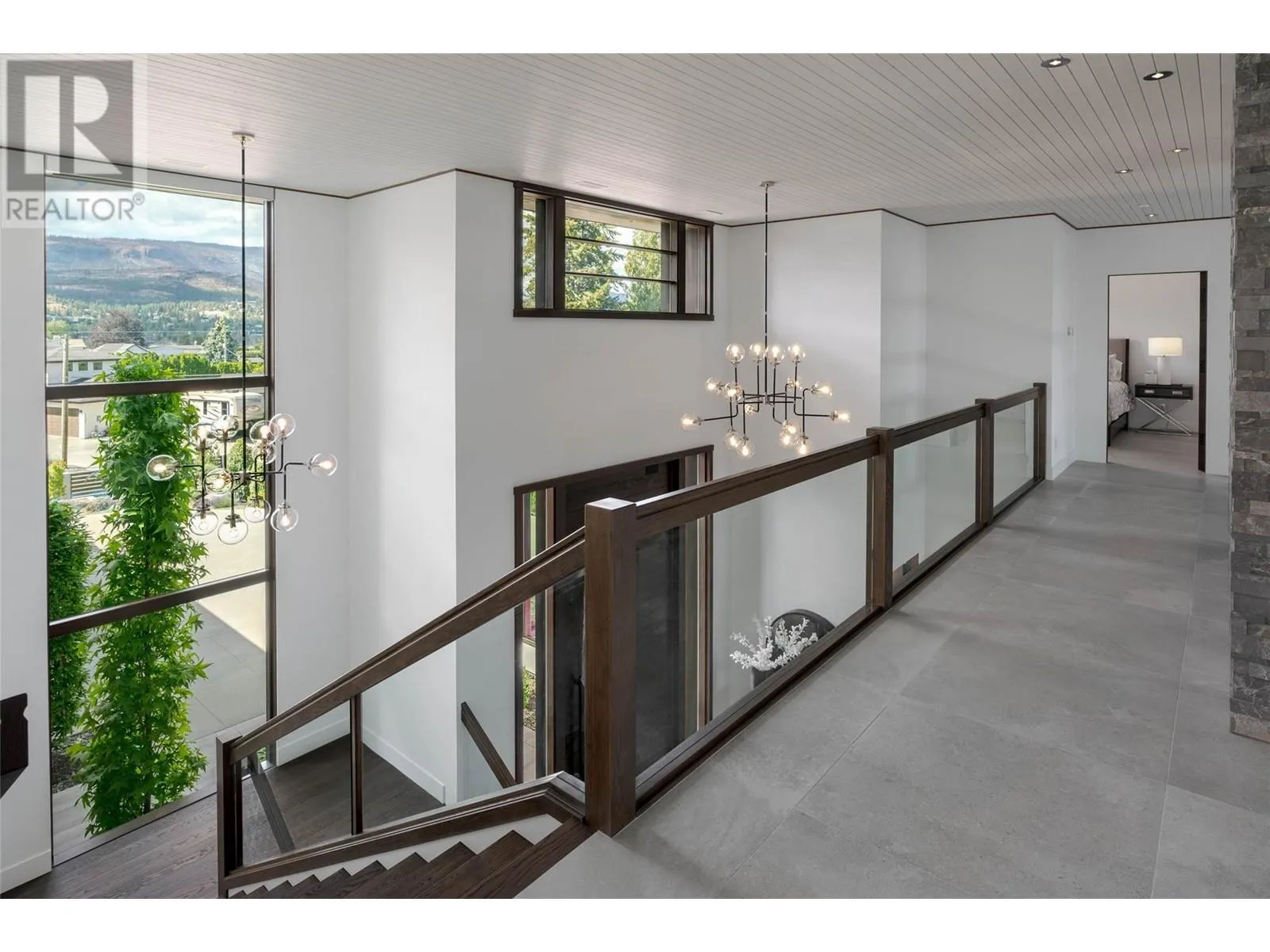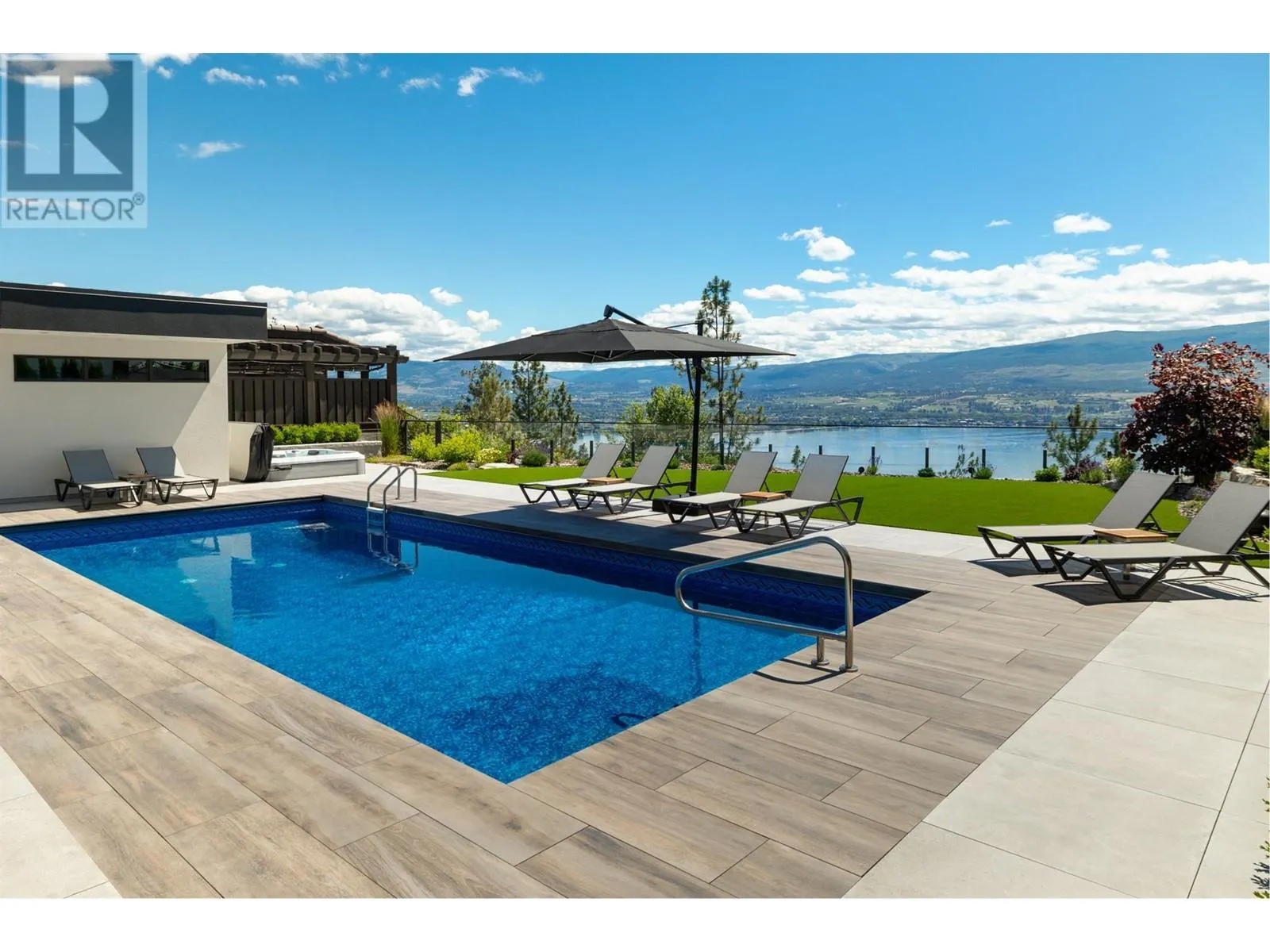 Custom SanMarc home on desirable Thacker Drive in Lakeview Heights. This property boasts exceptional attention to detail that is sure to impress. Expertly designed, it offers a remarkable layout inside & out for everyday living while maintaining its allure as a modern masterpiece.From nearly every room & the backyard, enjoy expansive, unobstructed Okanagan Lake views. A solid wood 12-ft pivot door welcomes you to the foyer with a 20-ft marble tiled entry wall leading to the catwalk on the 2nd level, connecting the 2 wings of the home. The great room boasts 23-foot ceilings, floor-to-ceiling windows, & an 80-inch linear gas fireplace. Gourmet kitchen w/ Carolyn Walsh-designed cabinetry, waterfall island, professional appliances & a window that fully retracts, creating a passthrough to the outdoor kitchen. Glass-enclosed 75+ bottle temperature-controlled wine room. Sliding doors on the main level open to a remarkable outdoor retreat: saltwater pool with auto cover, synthetic lawn, Jacuzzi hot tub, outdoor kitchen, $12K sound system, covered patio w/ glass ceiling. Luxurious main floor primary w/ pool access, spa-inspired 5-piece en suite with views of the lake, heated floors, custom closet, and a linear gas fireplace. Main floor living with elevator that accesses all three floors. Upstairs offers 4 large beds, all with en suites, and 2 featuring private lake view patios. Laundry on both levels. Oversized 3-car garage with built-ins, custom cabinetry, and prewired for EV. (id:27476)
