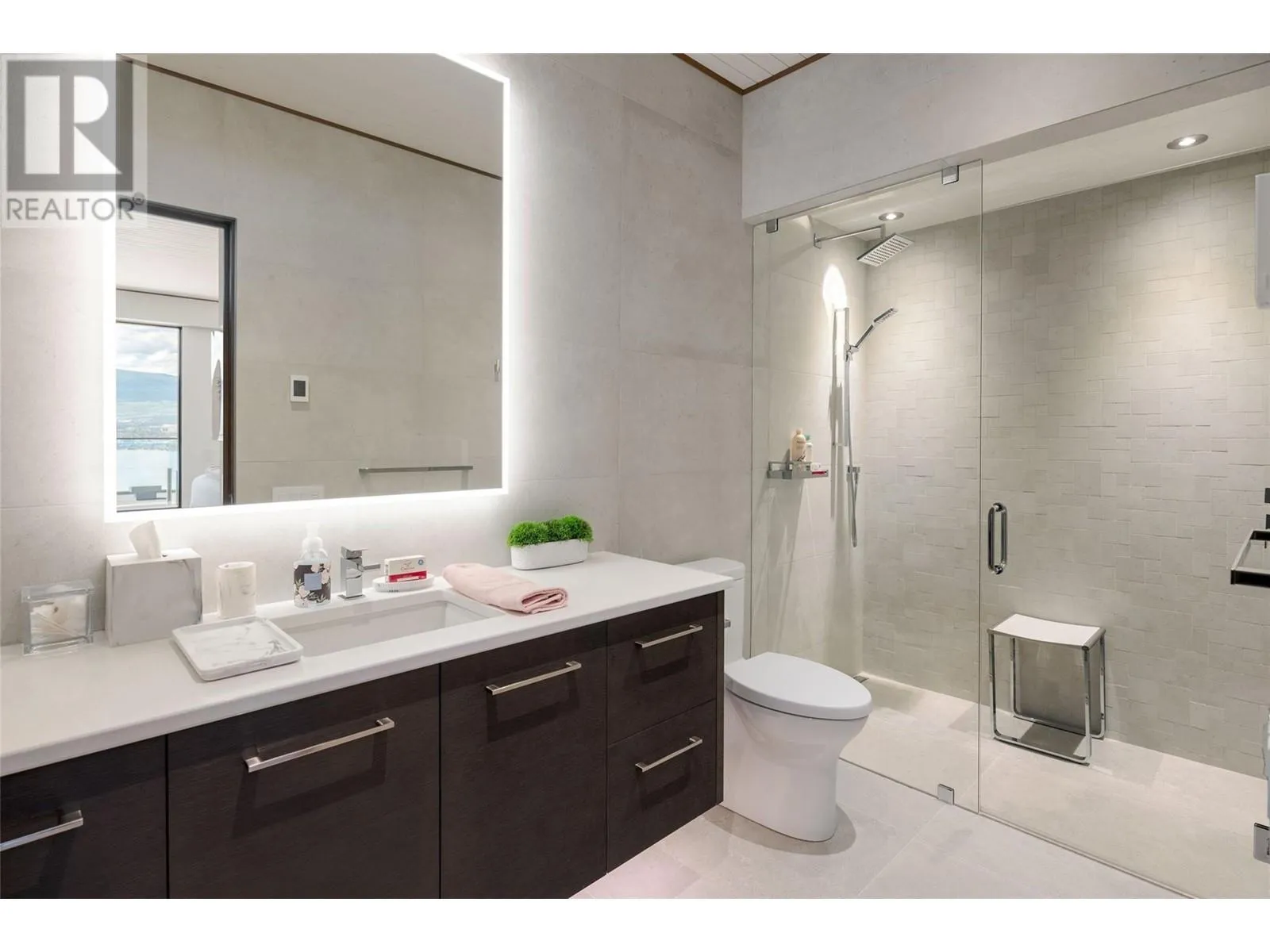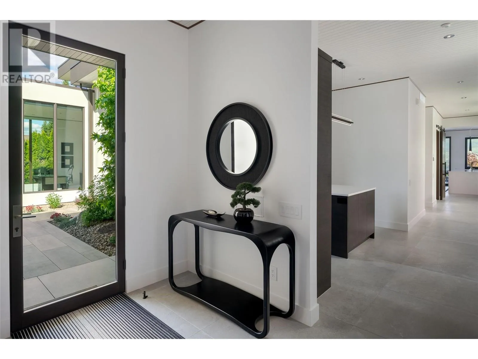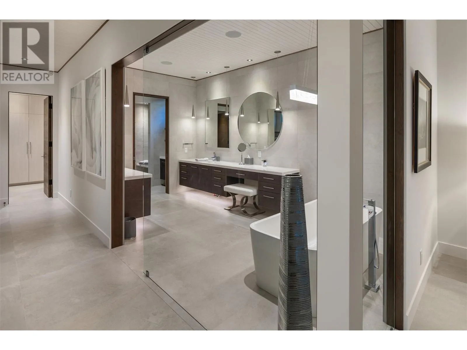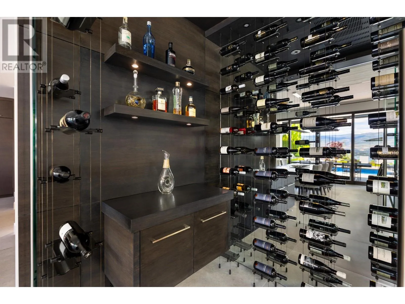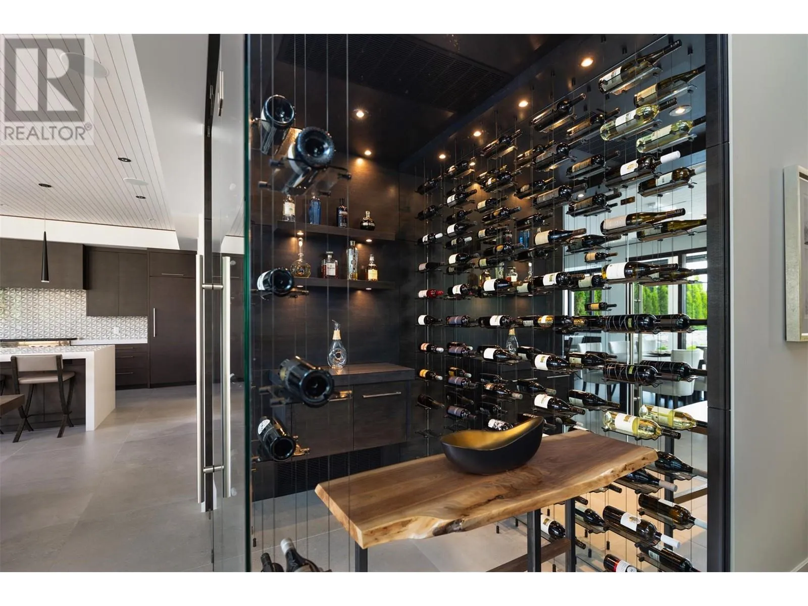 Custom SanMarc home on desirable Thacker Drive in Lakeview Heights. This property boasts exceptional attention to detail that is sure to impress. Expertly designed, it offers a remarkable layout inside & out for everyday living while maintaining its allure as a modern masterpiece.From nearly every room & the backyard, enjoy expansive, unobstructed Okanagan Lake views. A solid wood 12-ft pivot door welcomes you to the foyer with a 20-ft marble tiled entry wall leading to the catwalk on the 2nd level, connecting the 2 wings of the home. The great room boasts 23-foot ceilings, floor-to-ceiling windows, & an 80-inch linear gas fireplace. Gourmet kitchen w/ Carolyn Walsh-designed cabinetry, waterfall island, professional appliances & a window that fully retracts, creating a passthrough to the outdoor kitchen. Glass-enclosed 75+ bottle temperature-controlled wine room. Sliding doors on the main level open to a remarkable outdoor retreat: saltwater pool with auto cover, synthetic lawn, Jacuzzi hot tub, outdoor kitchen, $12K sound system, covered patio w/ glass ceiling. Luxurious main floor primary w/ pool access, spa-inspired 5-piece en suite with views of the lake, heated floors, custom closet, and a linear gas fireplace. Main floor living with elevator that accesses all three floors. Upstairs offers 4 large beds, all with en suites, and 2 featuring private lake view patios. Laundry on both levels. Oversized 3-car garage with built-ins, custom cabinetry, and prewired for EV. (id:27476)