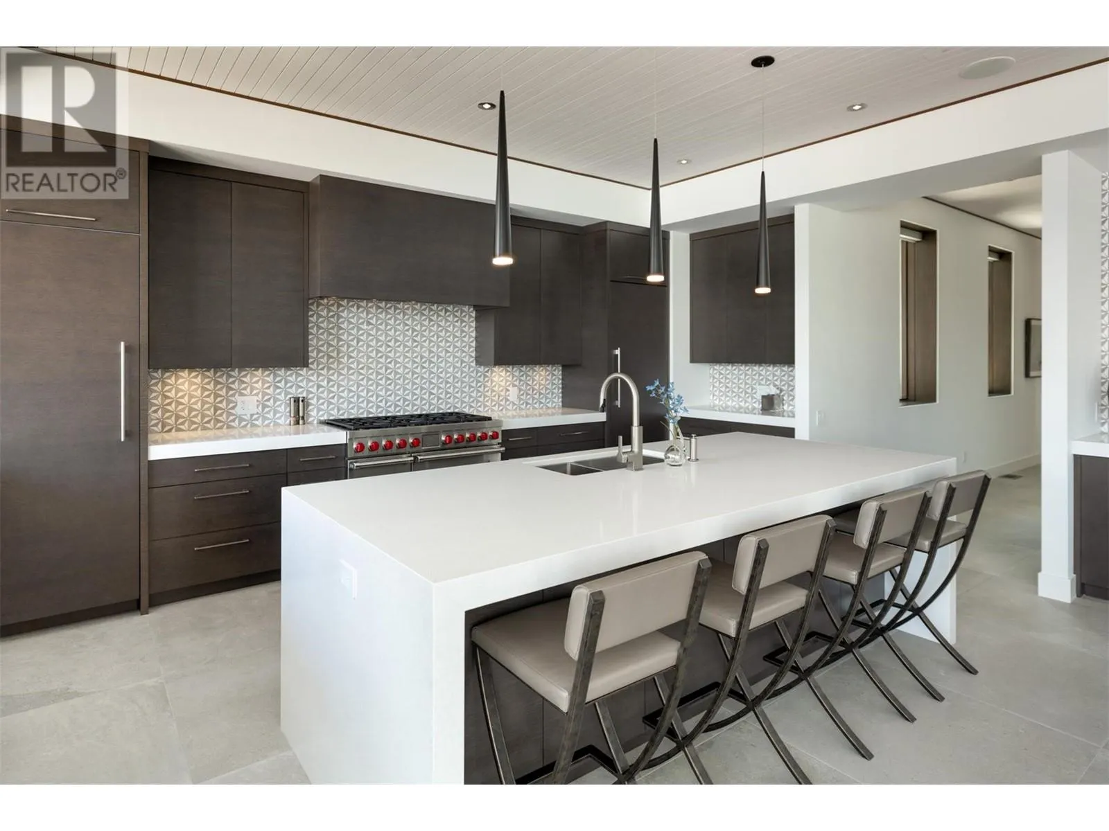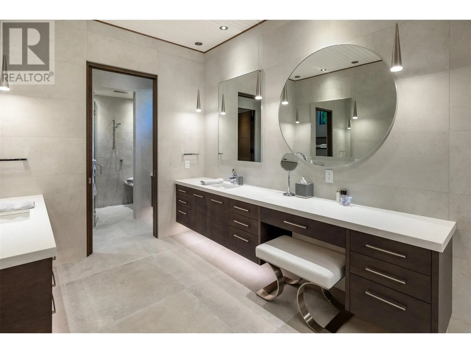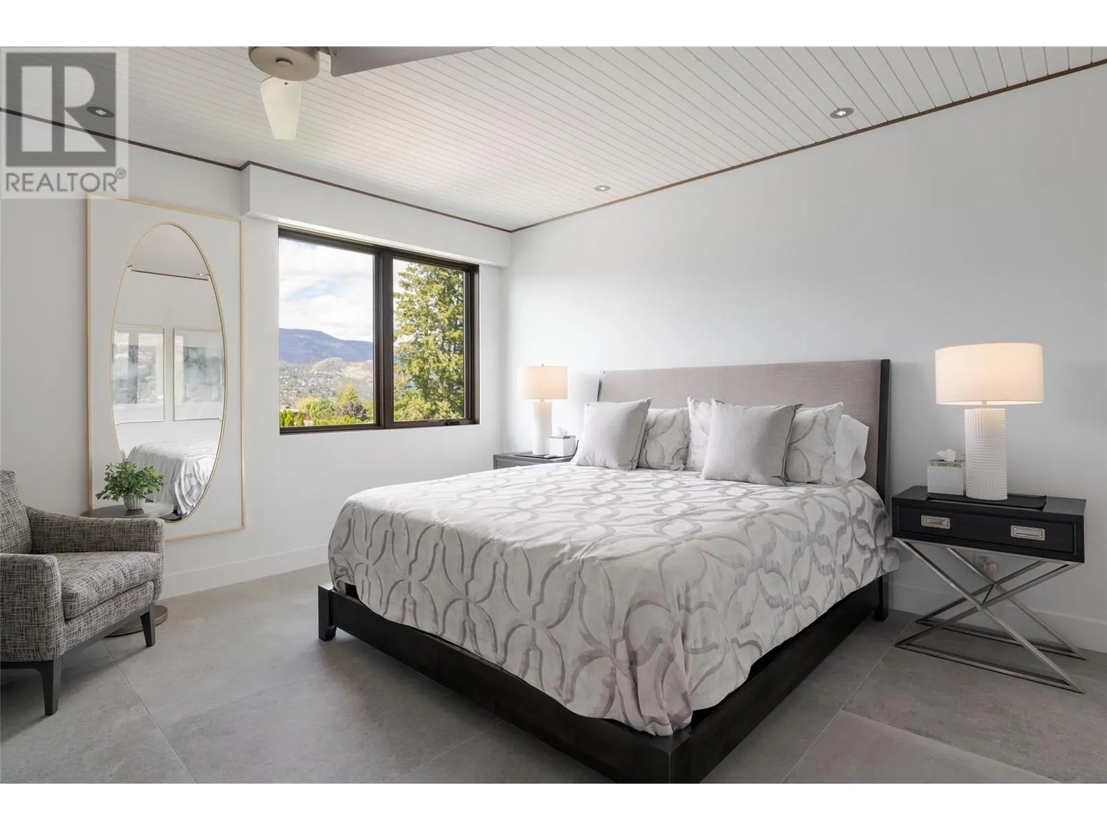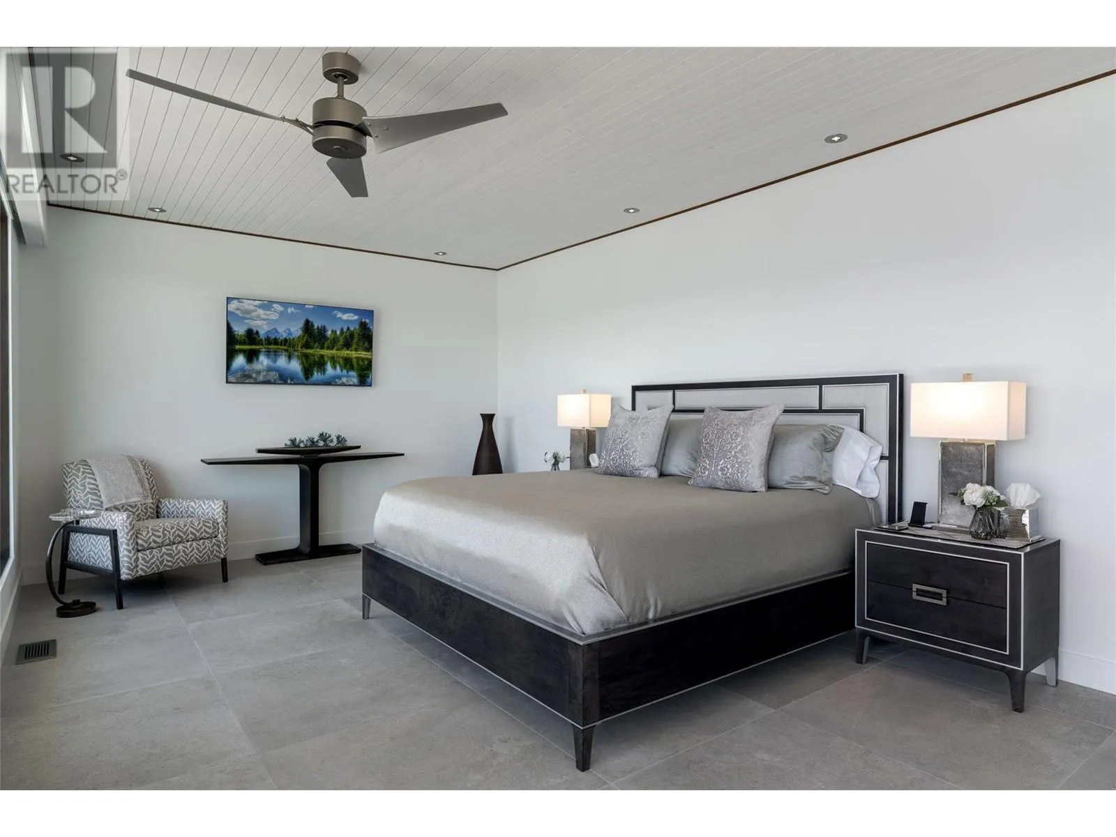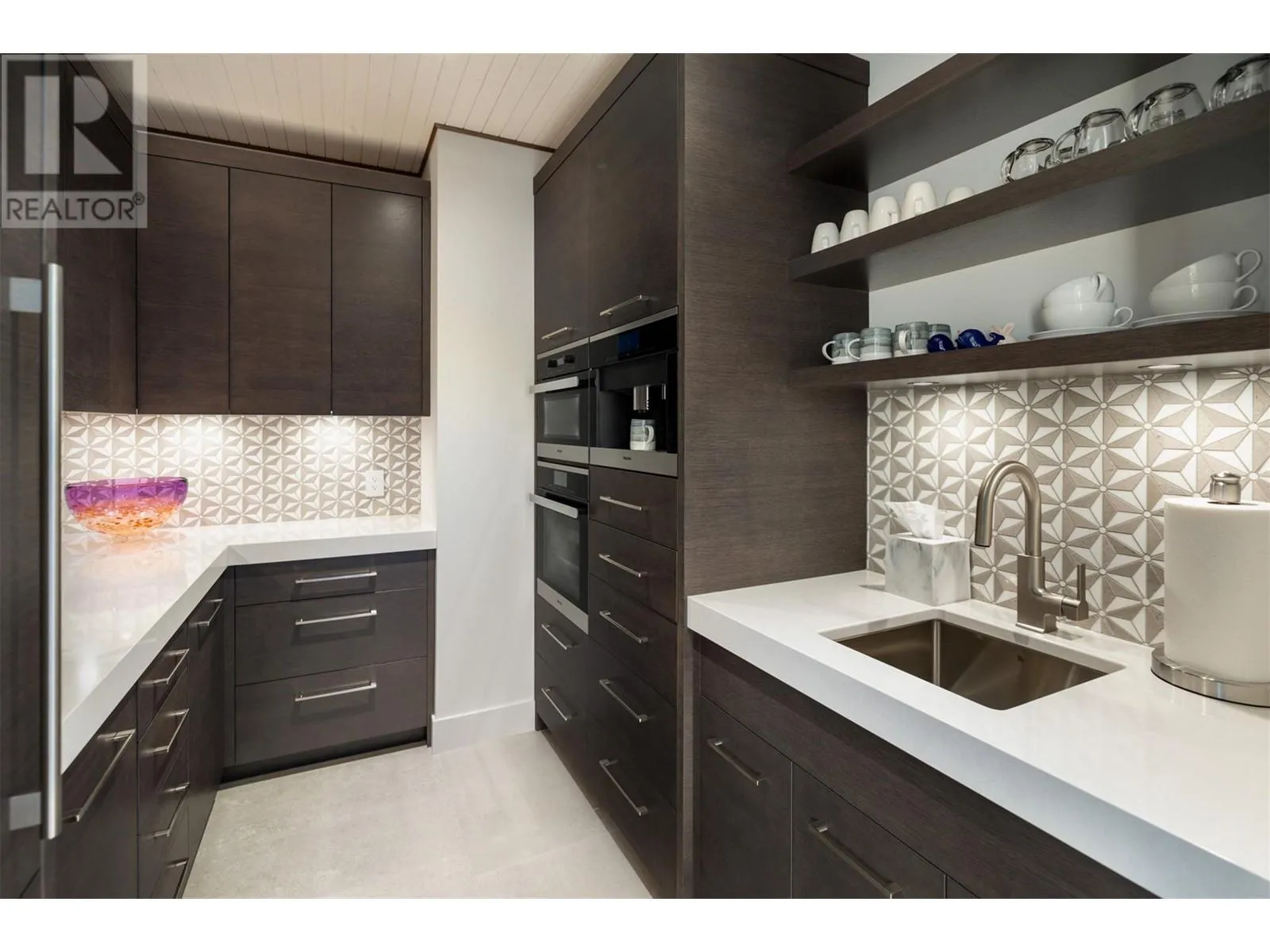 Custom SanMarc home on desirable Thacker Drive in Lakeview Heights. This property boasts exceptional attention to detail that is sure to impress. Expertly designed, it offers a remarkable layout inside & out for everyday living while maintaining its allure as a modern masterpiece.From nearly every room & the backyard, enjoy expansive, unobstructed Okanagan Lake views. A solid wood 12-ft pivot door welcomes you to the foyer with a 20-ft marble tiled entry wall leading to the catwalk on the 2nd level, connecting the 2 wings of the home. The great room boasts 23-foot ceilings, floor-to-ceiling windows, & an 80-inch linear gas fireplace. Gourmet kitchen w/ Carolyn Walsh-designed cabinetry, waterfall island, professional appliances & a window that fully retracts, creating a passthrough to the outdoor kitchen. Glass-enclosed 75+ bottle temperature-controlled wine room. Sliding doors on the main level open to a remarkable outdoor retreat: saltwater pool with auto cover, synthetic lawn, Jacuzzi hot tub, outdoor kitchen, $12K sound system, covered patio w/ glass ceiling. Luxurious main floor primary w/ pool access, spa-inspired 5-piece en suite with views of the lake, heated floors, custom closet, and a linear gas fireplace. Main floor living with elevator that accesses all three floors. Upstairs offers 4 large beds, all with en suites, and 2 featuring private lake view patios. Laundry on both levels. Oversized 3-car garage with built-ins, custom cabinetry, and prewired for EV. (id:27476)
