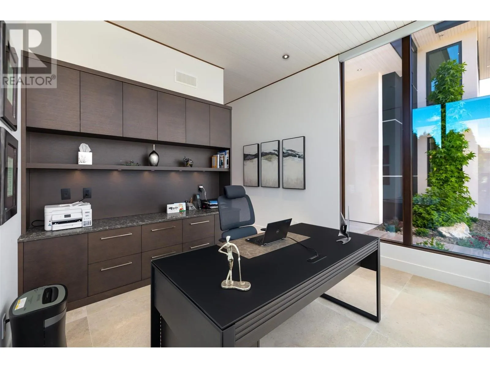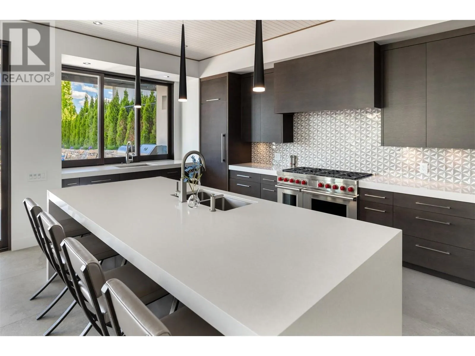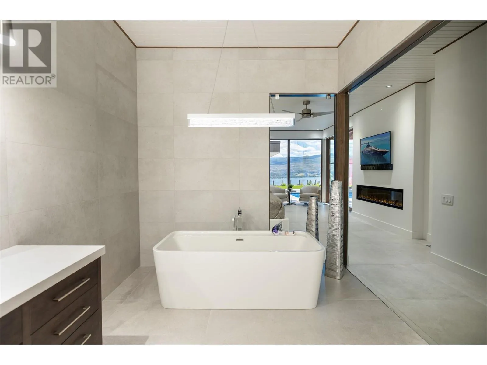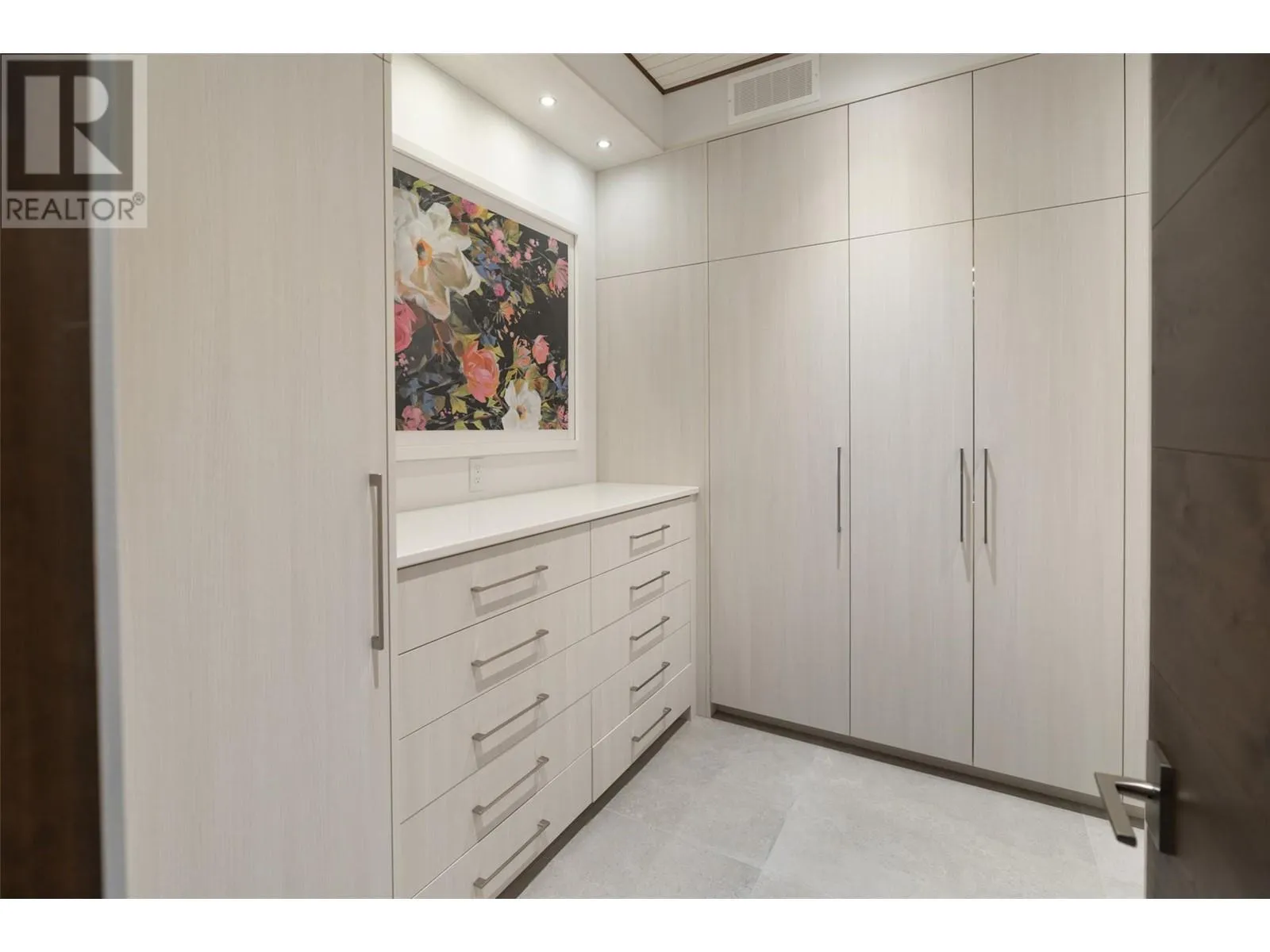 Custom SanMarc home on desirable Thacker Drive in Lakeview Heights. This property boasts exceptional attention to detail that is sure to impress. Expertly designed, it offers a remarkable layout inside & out for everyday living while maintaining its allure as a modern masterpiece.From nearly every room & the backyard, enjoy expansive, unobstructed Okanagan Lake views. A solid wood 12-ft pivot door welcomes you to the foyer with a 20-ft marble tiled entry wall leading to the catwalk on the 2nd level, connecting the 2 wings of the home. The great room boasts 23-foot ceilings, floor-to-ceiling windows, & an 80-inch linear gas fireplace. Gourmet kitchen w/ Carolyn Walsh-designed cabinetry, waterfall island, professional appliances & a window that fully retracts, creating a passthrough to the outdoor kitchen. Glass-enclosed 75+ bottle temperature-controlled wine room. Sliding doors on the main level open to a remarkable outdoor retreat: saltwater pool with auto cover, synthetic lawn, Jacuzzi hot tub, outdoor kitchen, $12K sound system, covered patio w/ glass ceiling. Luxurious main floor primary w/ pool access, spa-inspired 5-piece en suite with views of the lake, heated floors, custom closet, and a linear gas fireplace. Main floor living with elevator that accesses all three floors. Upstairs offers 4 large beds, all with en suites, and 2 featuring private lake view patios. Laundry on both levels. Oversized 3-car garage with built-ins, custom cabinetry, and prewired for EV. (id:27476)