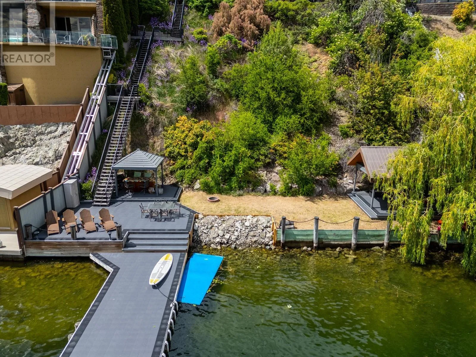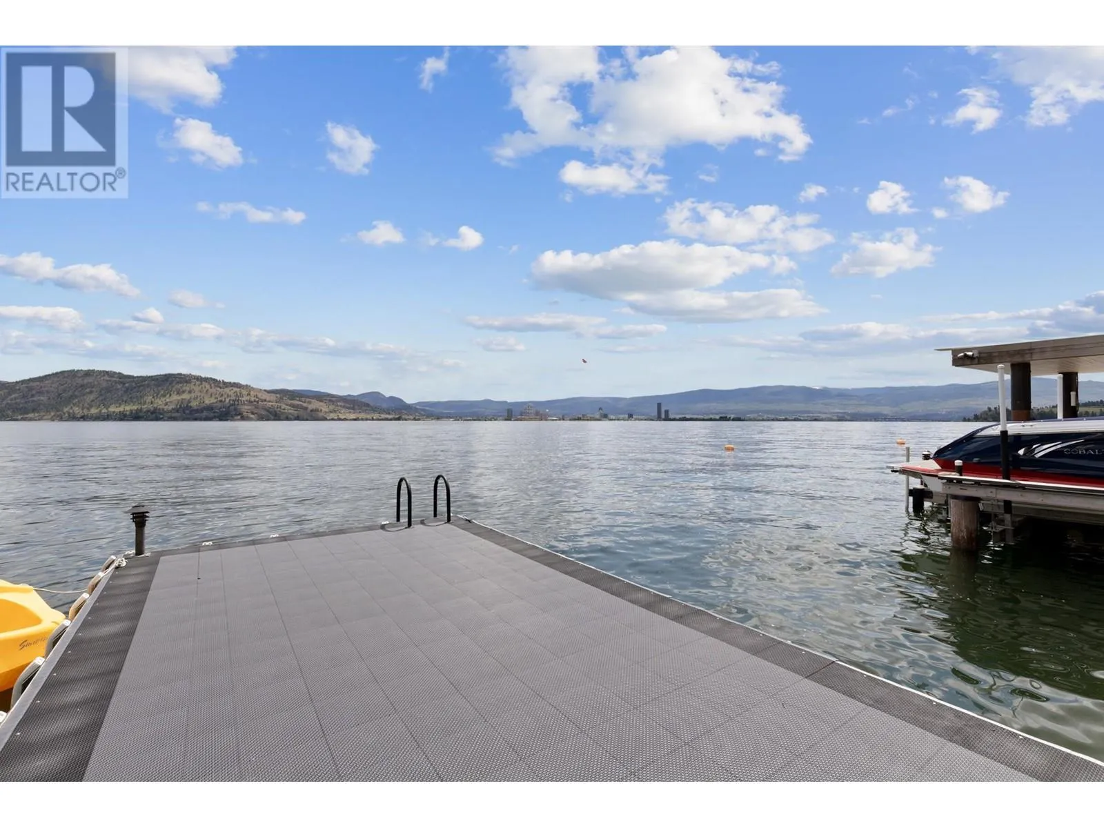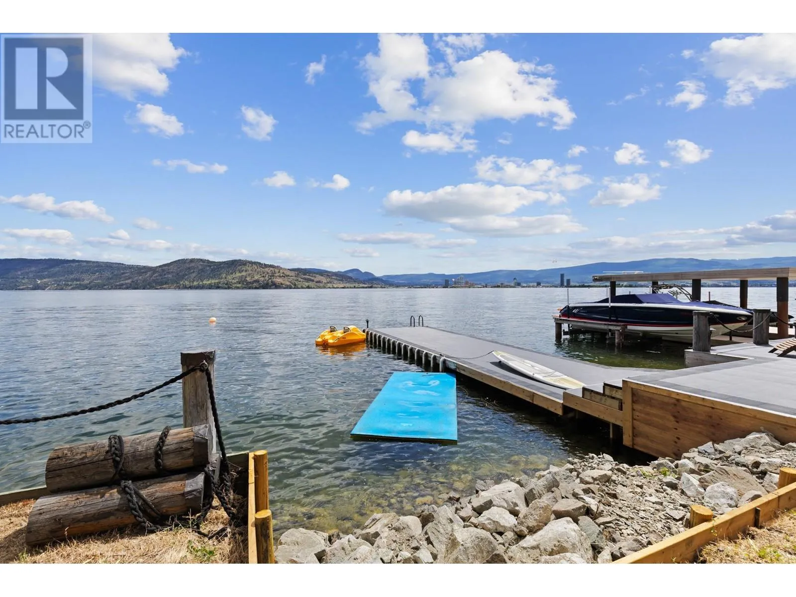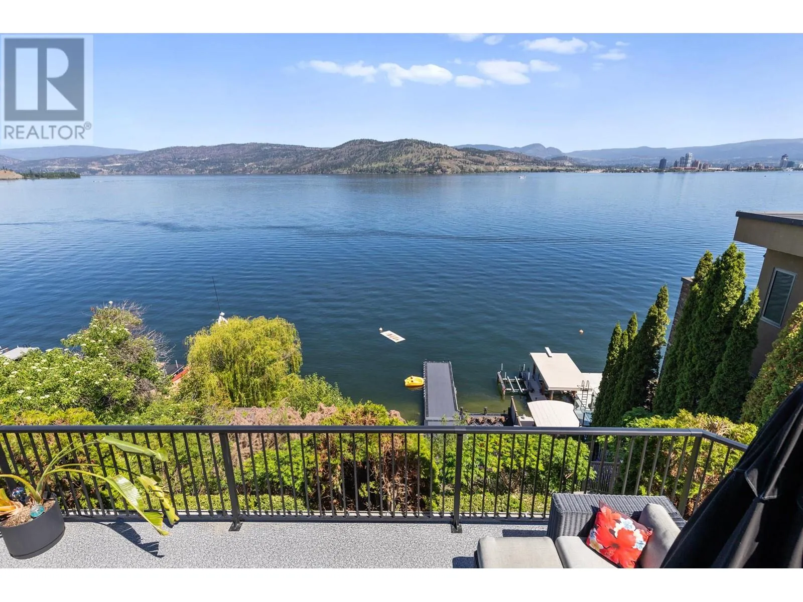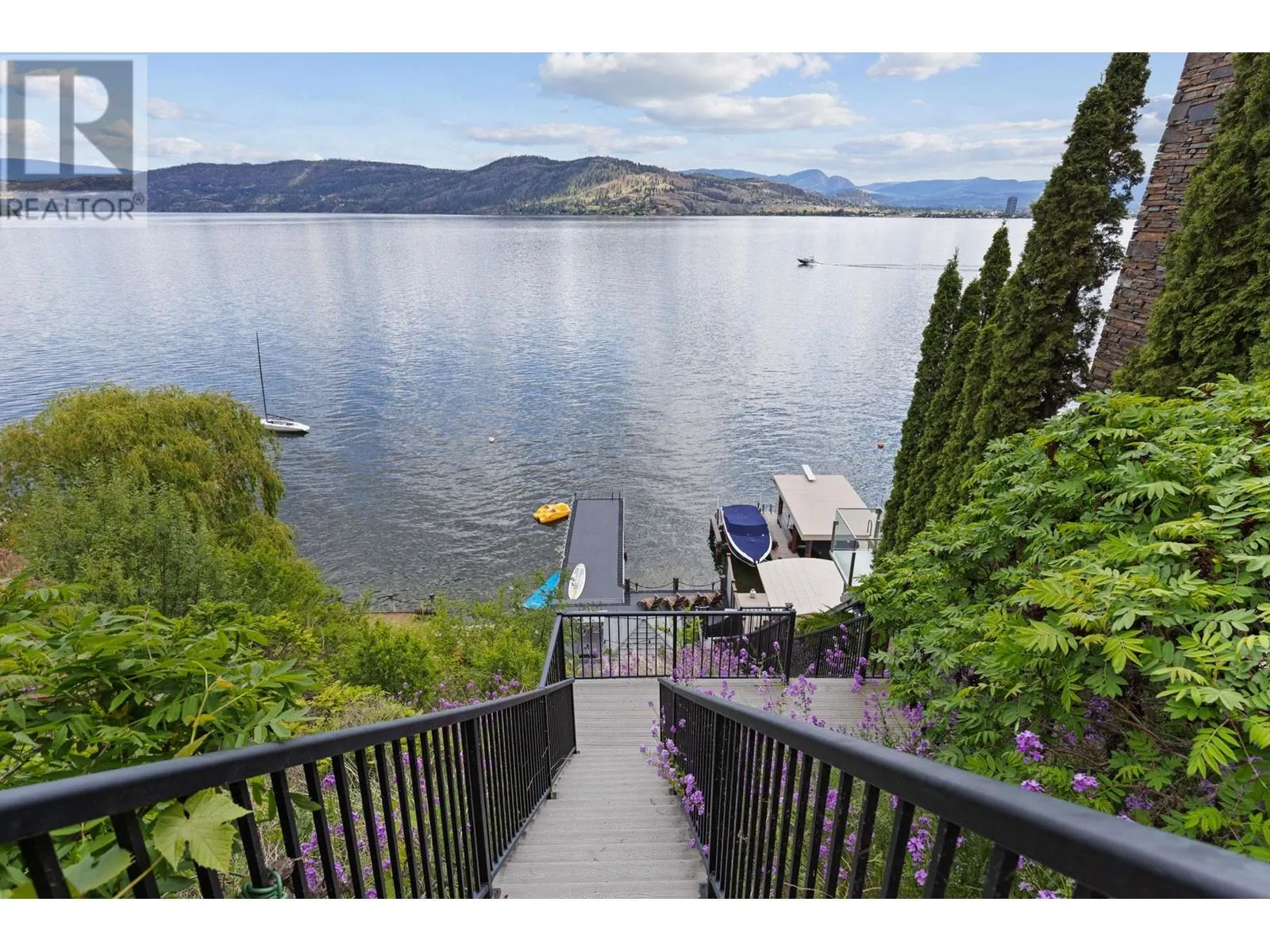 Situated just minutes from downtown Kelowna, this updated walk-out lakefront home is located in Sailview Bay, a quiet, gated community along Westside Road. Set on the cliffside with over 100 feet of private waterfront, the property captures panoramic views of Okanagan Lake and the downtown skyline, offering a peaceful setting by day and a backdrop of twinkling city lights at night. Designed to accommodate both everyday living and hosting guests, this five-bedroom home is well suited for families and visitors coming to enjoy the Okanagan lifestyle. The dock has been resurfaced with Sport Court tiles and offers direct access to the deep, clear waterâideal for swimming, paddleboarding, or diving. Just steps from the shoreline there is a generous open deck, covered outdoor bar, and a vaulted-ceiling cabana, perfect to relax by the water. Inside, the home has been thoughtfully renovated with warm finishes and a functional design. The kitchen features stainless steel appliances, a built-in oven and cooktop, two-tone custom cabinetry, and heated flooring. The open-concept layout connects the kitchen, dining, and living areas, all oriented to take in the lake and city views through large windows. Each waterfront property in Sailview Bay includes it's own private dock, accessed by stairs or a personal funicular. The community is known for its privacy, natural surroundings, and convenient locationâoffering a quiet retreat that remains close to the amenities of Kelowna and West Kelowna. (id:27476)