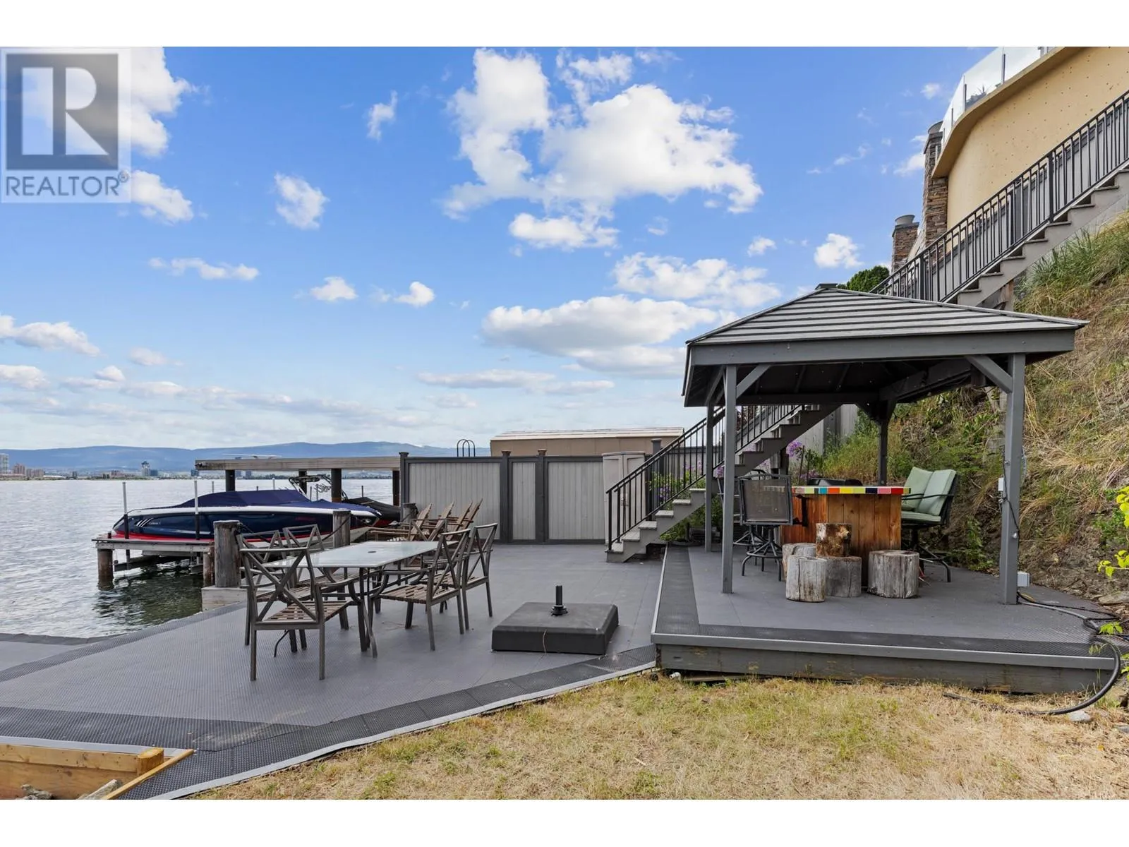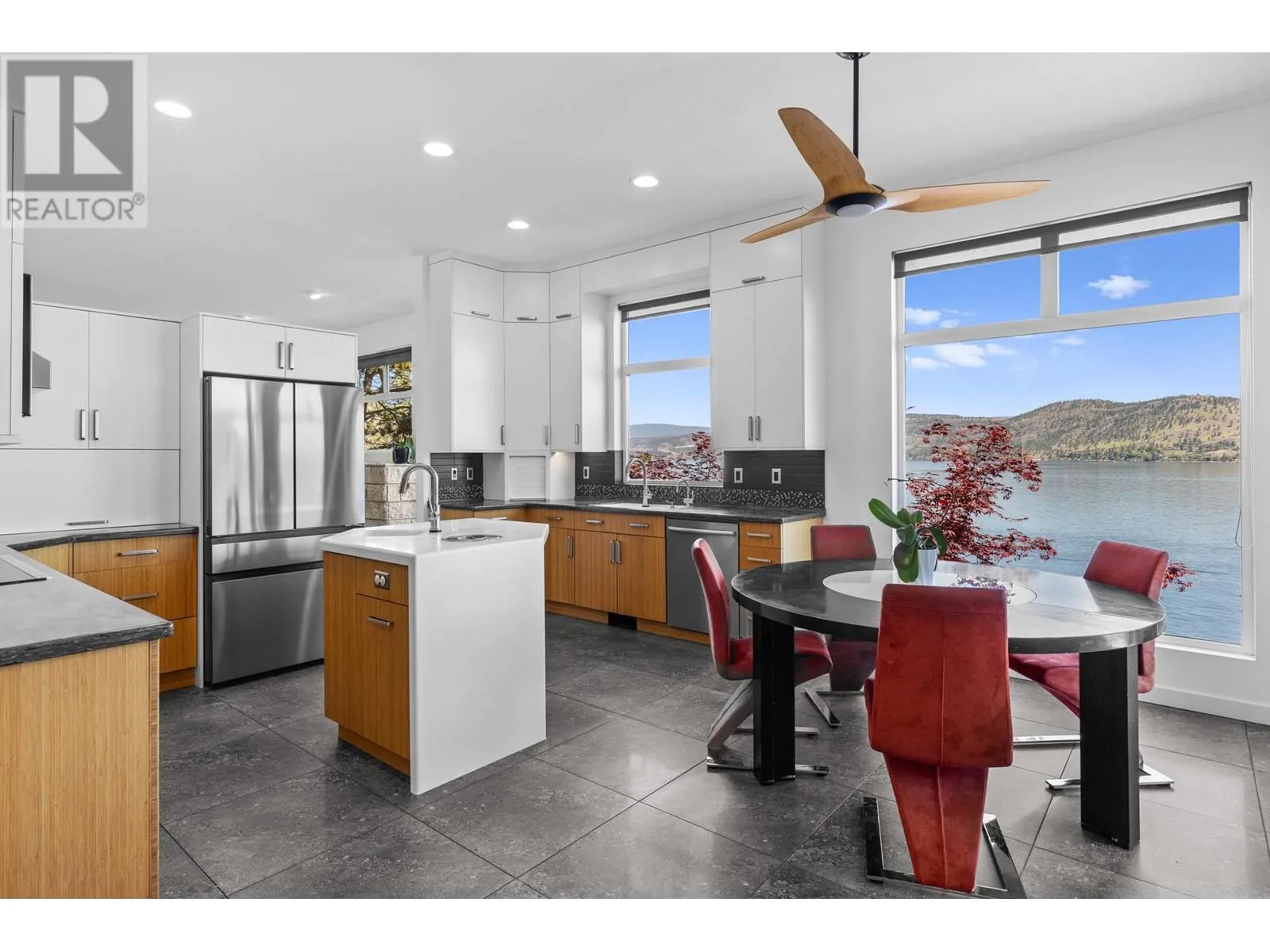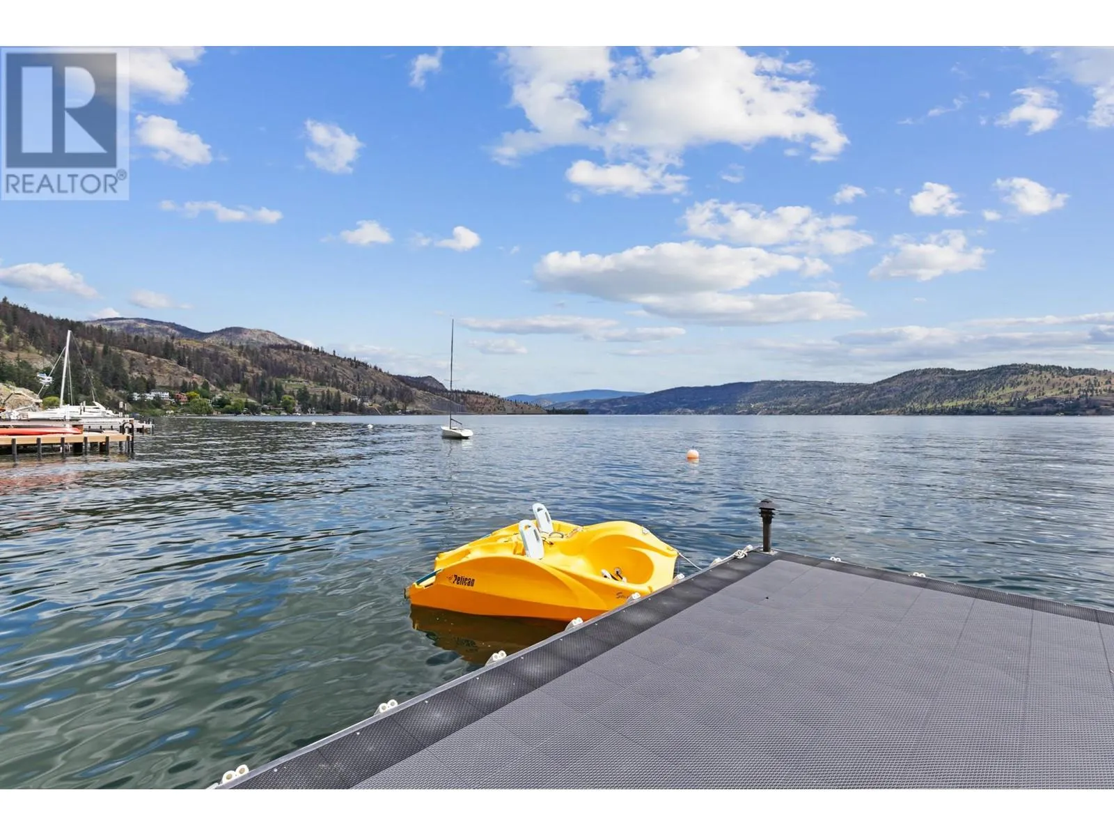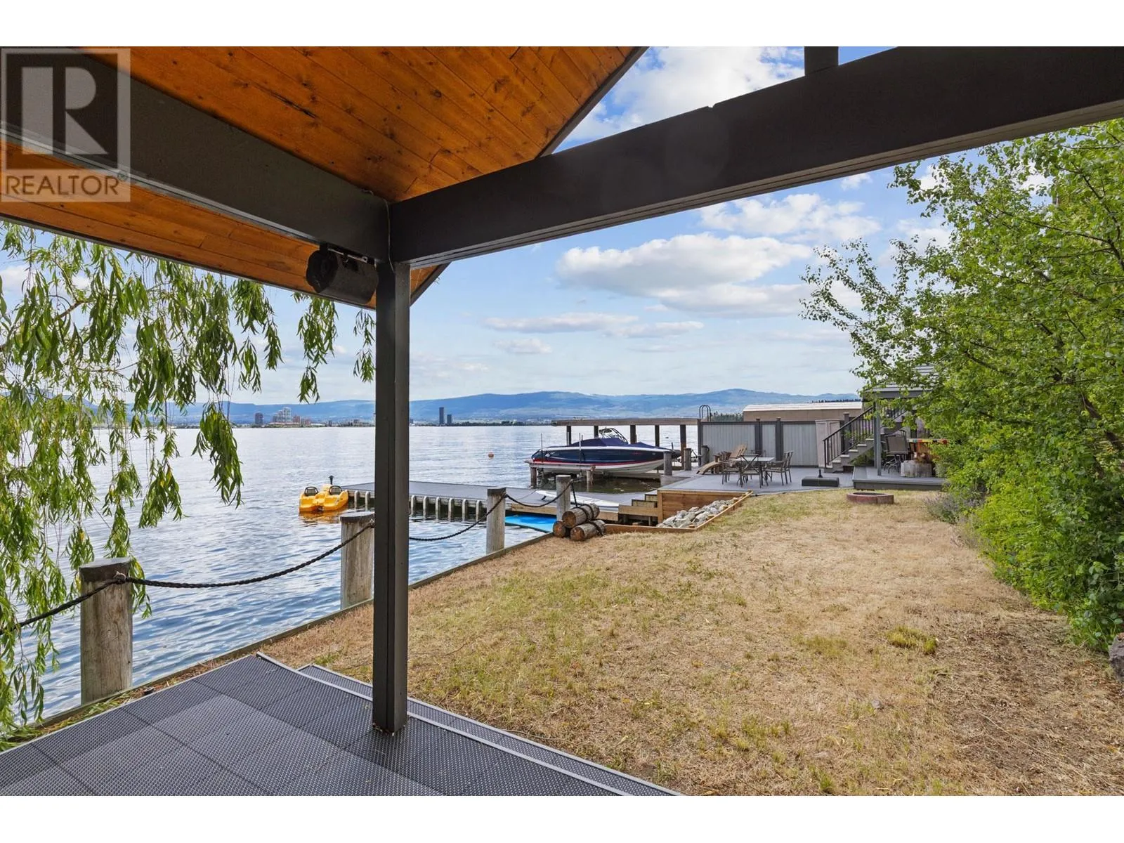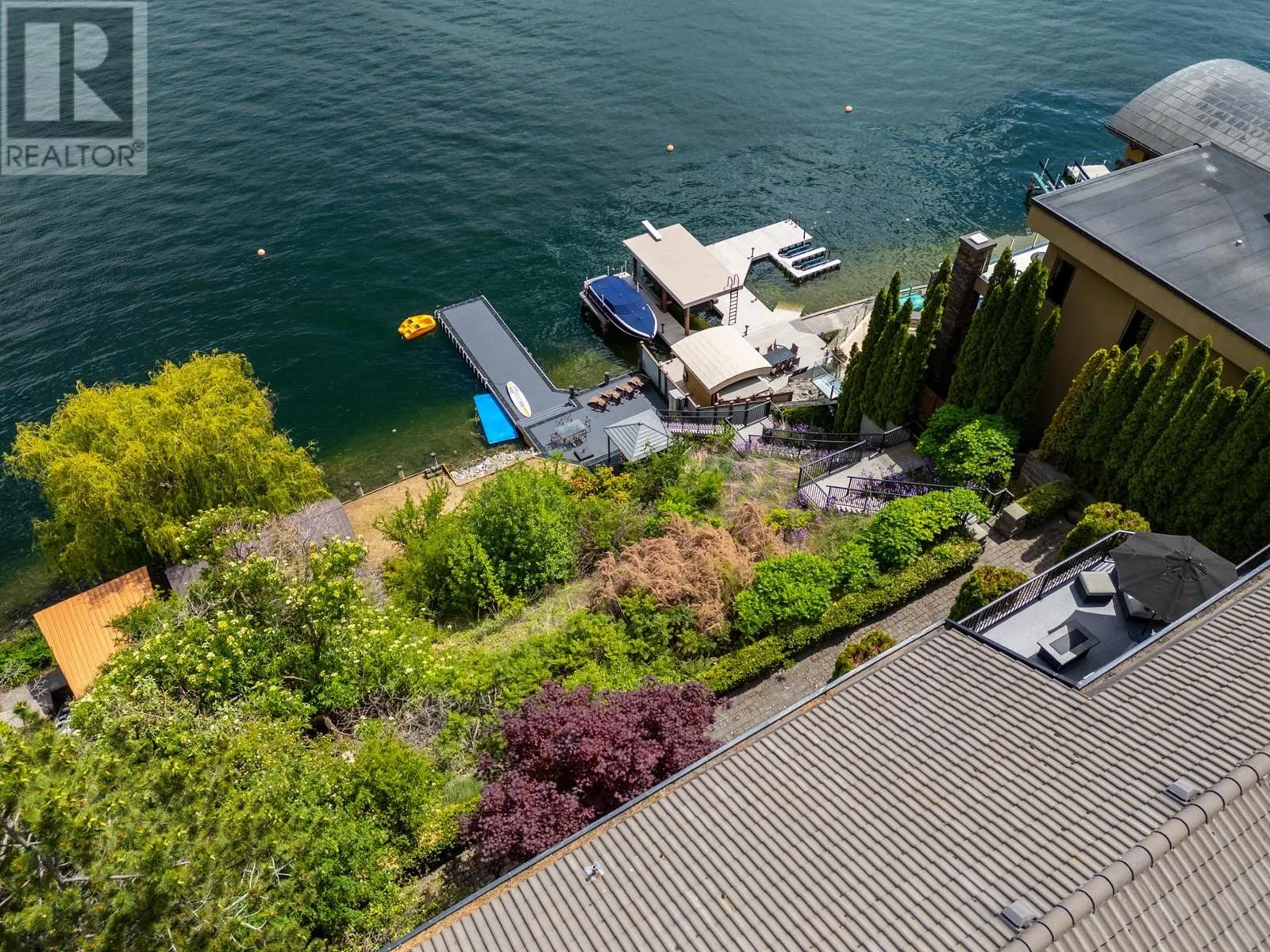 Situated just minutes from downtown Kelowna, this updated walk-out lakefront home is located in Sailview Bay, a quiet, gated community along Westside Road. Set on the cliffside with over 100 feet of private waterfront, the property captures panoramic views of Okanagan Lake and the downtown skyline, offering a peaceful setting by day and a backdrop of twinkling city lights at night. Designed to accommodate both everyday living and hosting guests, this five-bedroom home is well suited for families and visitors coming to enjoy the Okanagan lifestyle. The dock has been resurfaced with Sport Court tiles and offers direct access to the deep, clear waterâideal for swimming, paddleboarding, or diving. Just steps from the shoreline there is a generous open deck, covered outdoor bar, and a vaulted-ceiling cabana, perfect to relax by the water. Inside, the home has been thoughtfully renovated with warm finishes and a functional design. The kitchen features stainless steel appliances, a built-in oven and cooktop, two-tone custom cabinetry, and heated flooring. The open-concept layout connects the kitchen, dining, and living areas, all oriented to take in the lake and city views through large windows. Each waterfront property in Sailview Bay includes it's own private dock, accessed by stairs or a personal funicular. The community is known for its privacy, natural surroundings, and convenient locationâoffering a quiet retreat that remains close to the amenities of Kelowna and West Kelowna. (id:27476)