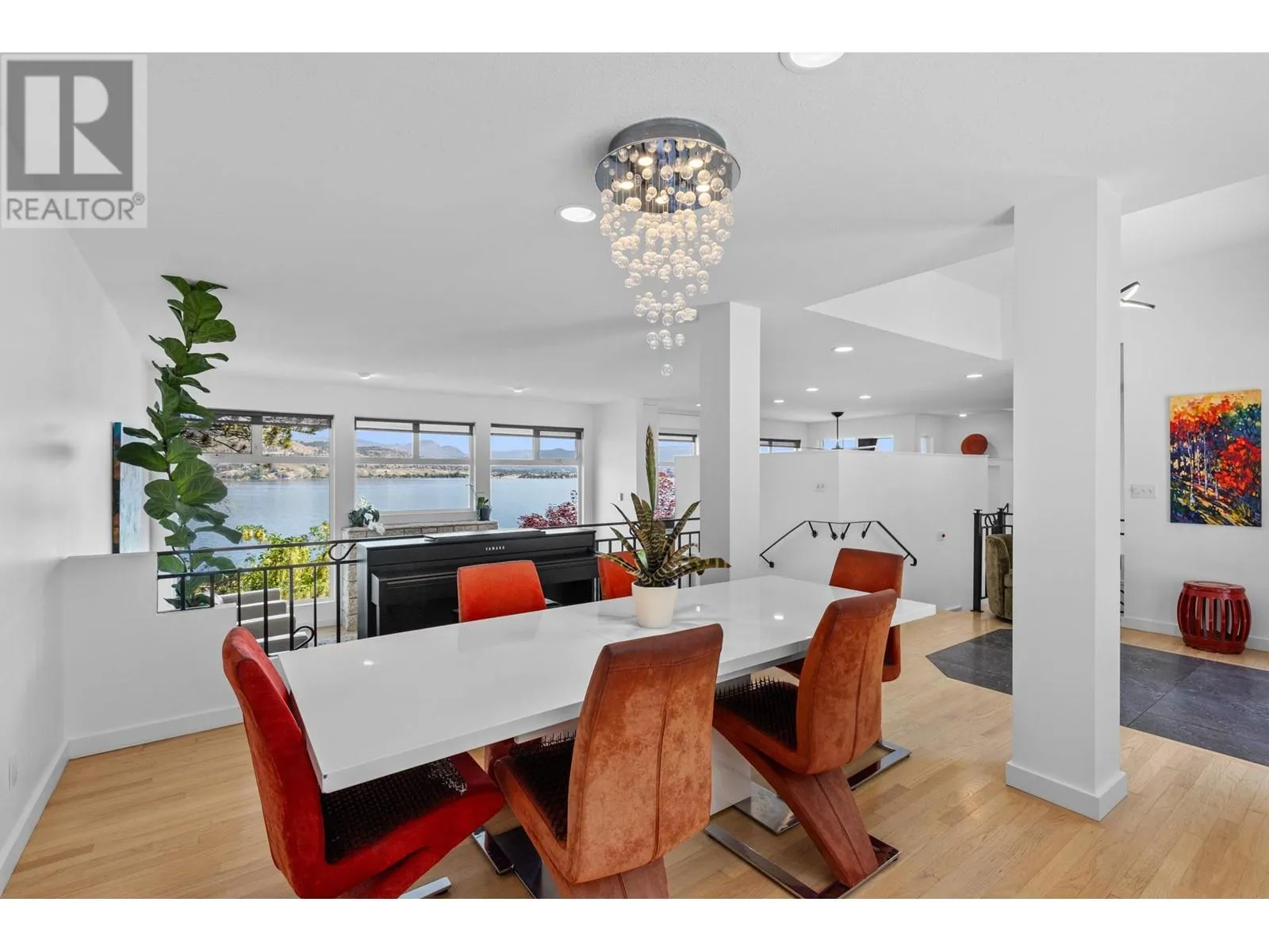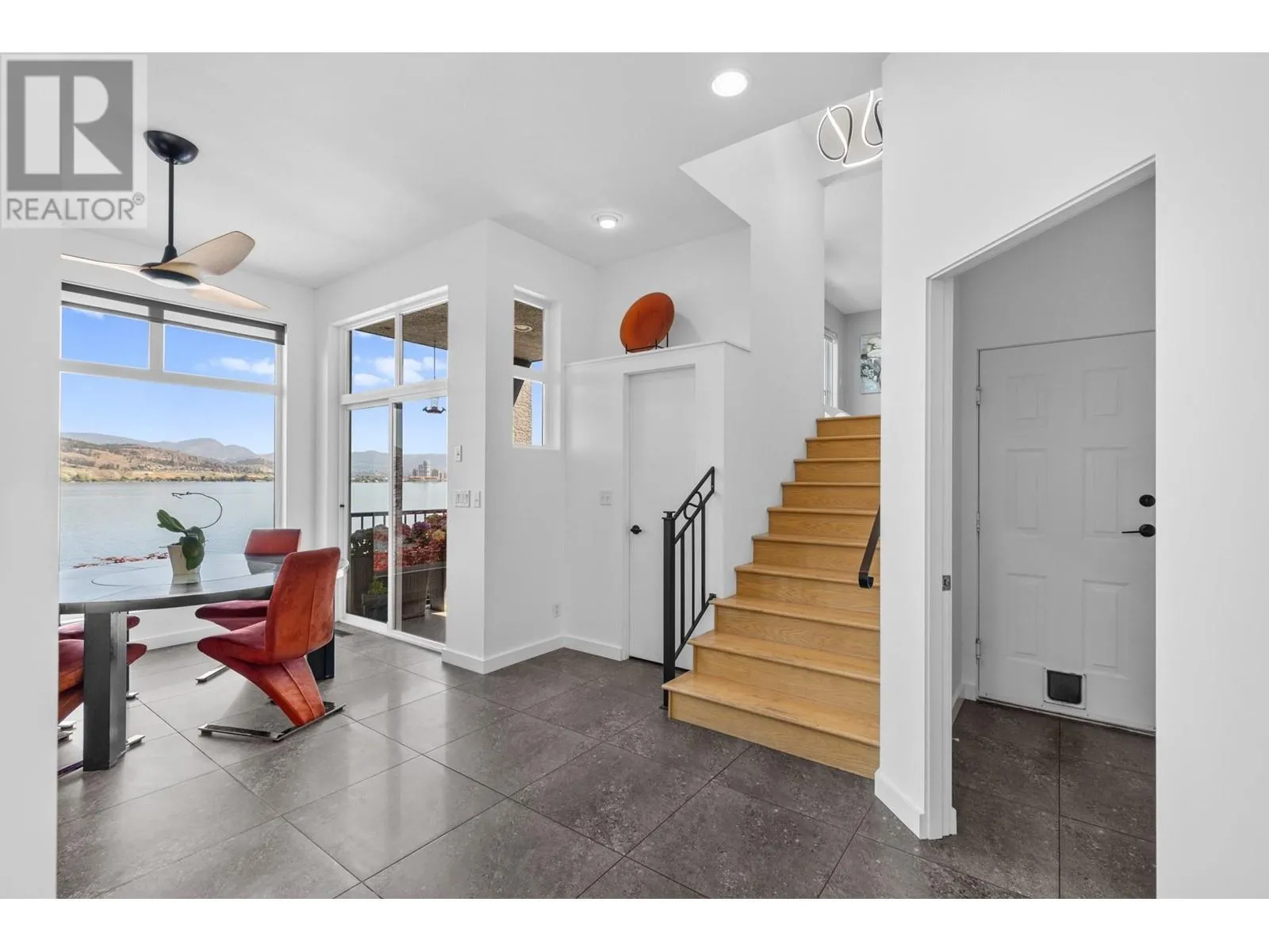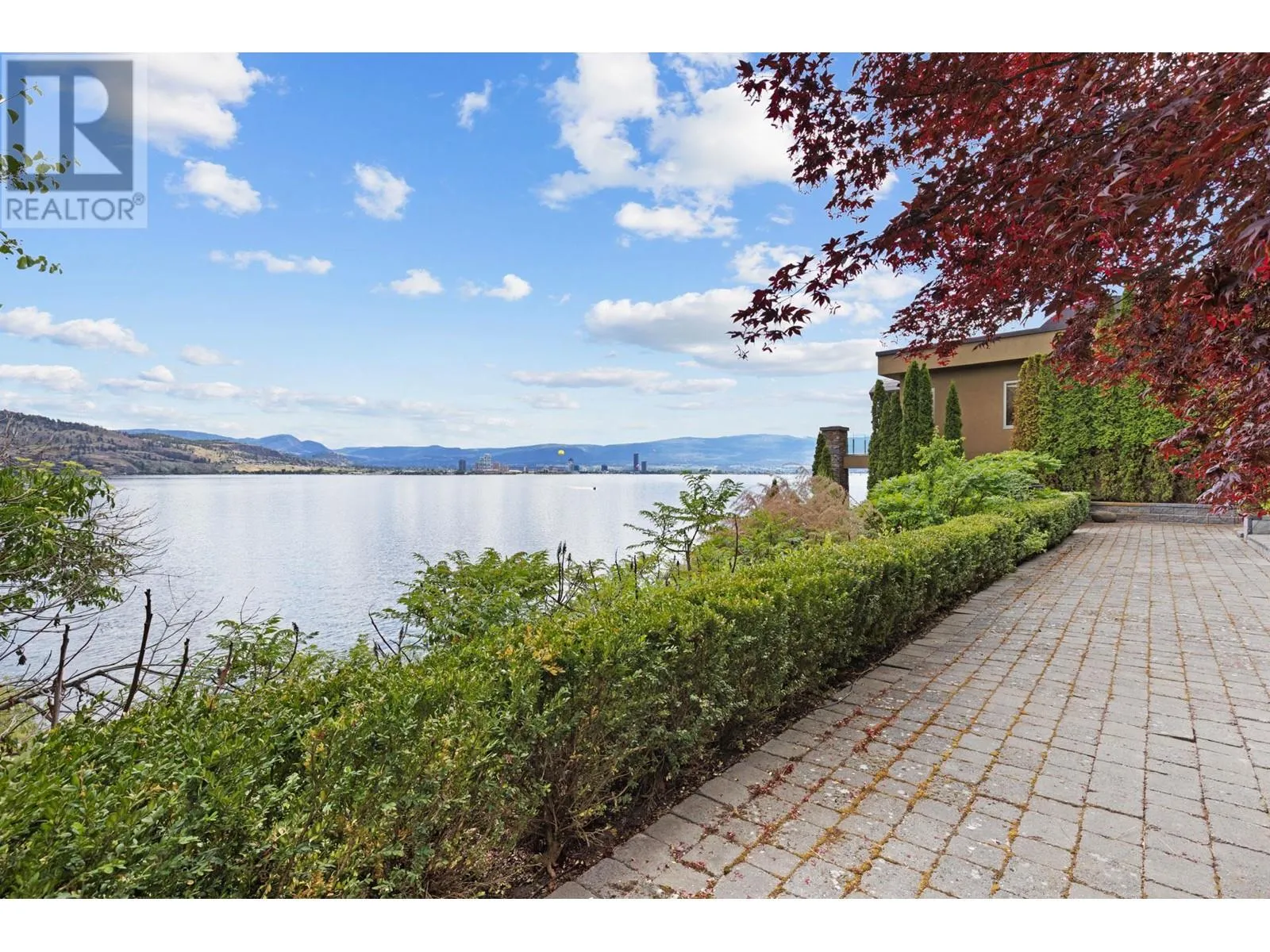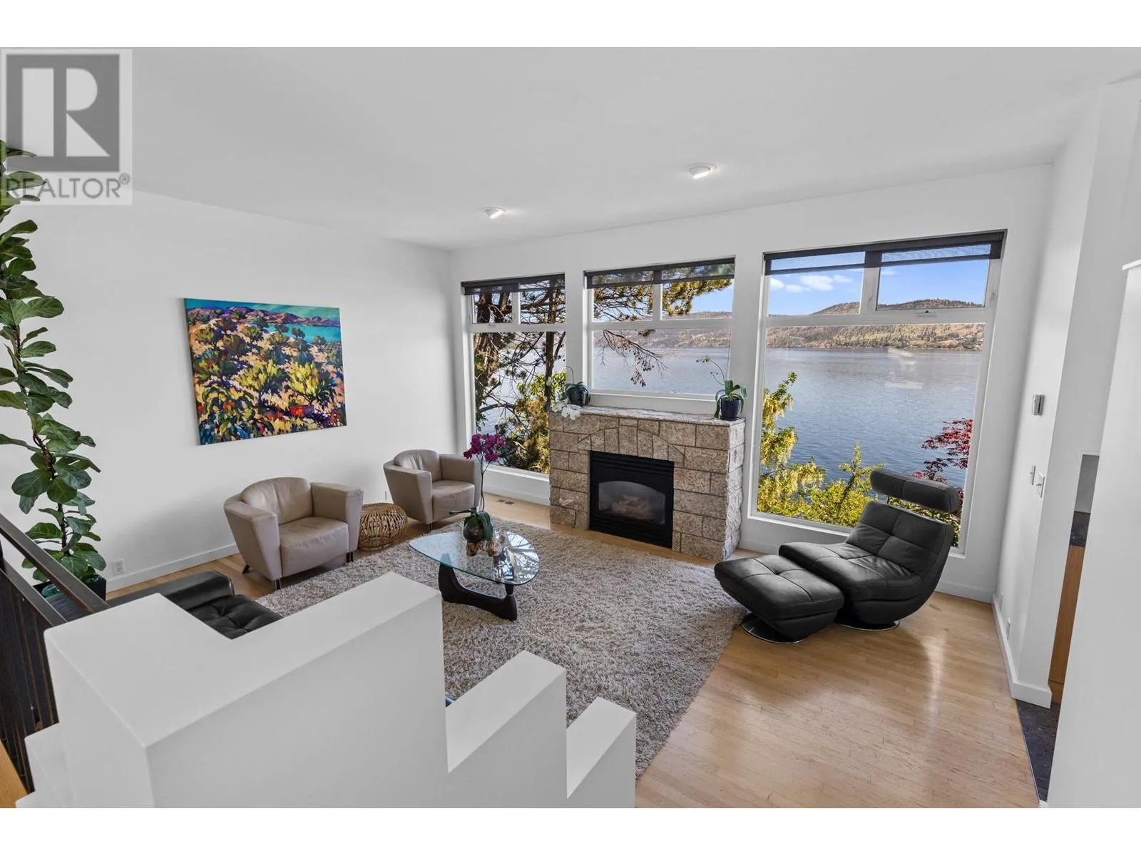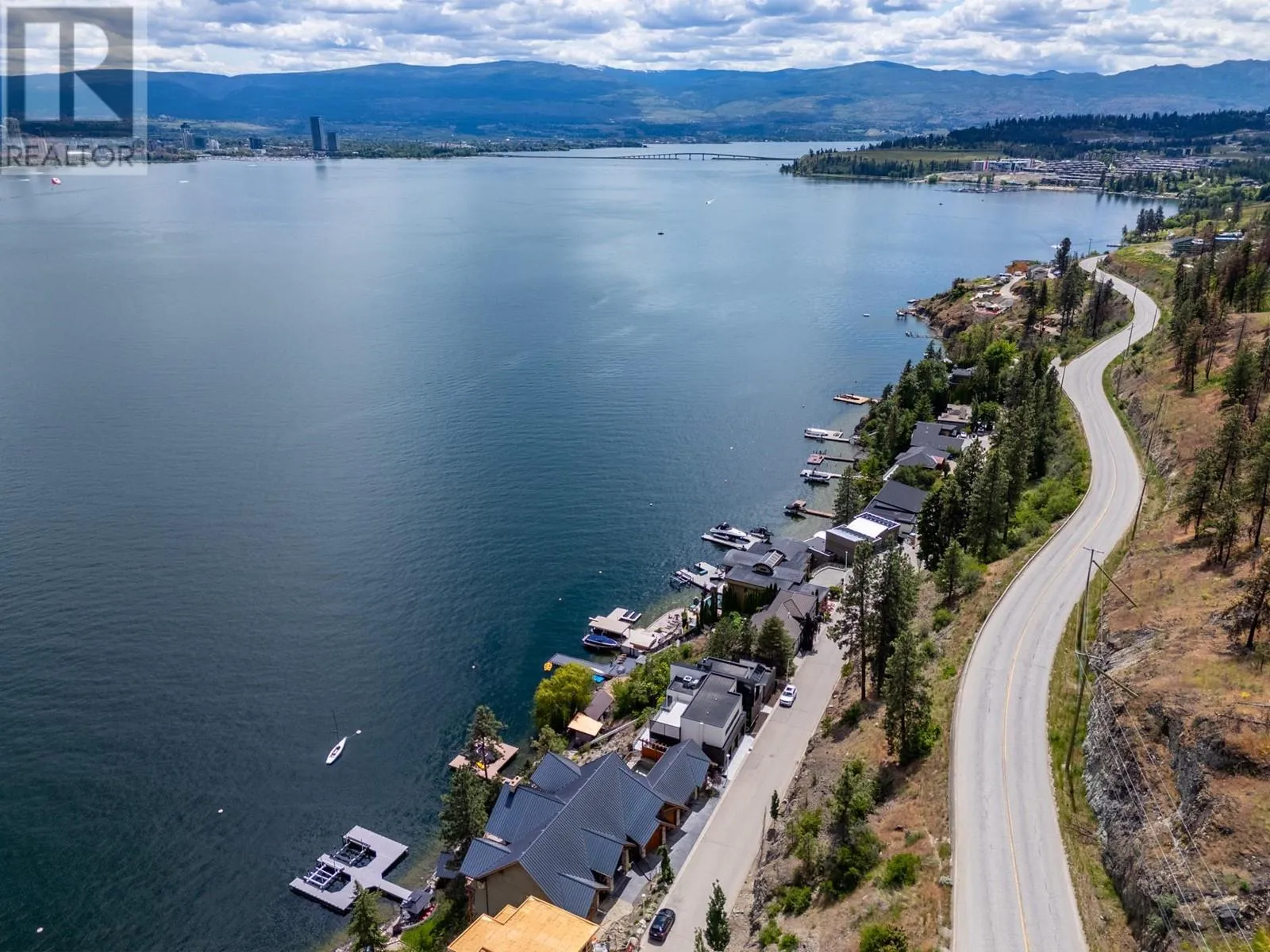 Situated just minutes from downtown Kelowna, this updated walk-out lakefront home is located in Sailview Bay, a quiet, gated community along Westside Road. Set on the cliffside with over 100 feet of private waterfront, the property captures panoramic views of Okanagan Lake and the downtown skyline, offering a peaceful setting by day and a backdrop of twinkling city lights at night. Designed to accommodate both everyday living and hosting guests, this five-bedroom home is well suited for families and visitors coming to enjoy the Okanagan lifestyle. The dock has been resurfaced with Sport Court tiles and offers direct access to the deep, clear waterâideal for swimming, paddleboarding, or diving. Just steps from the shoreline there is a generous open deck, covered outdoor bar, and a vaulted-ceiling cabana, perfect to relax by the water. Inside, the home has been thoughtfully renovated with warm finishes and a functional design. The kitchen features stainless steel appliances, a built-in oven and cooktop, two-tone custom cabinetry, and heated flooring. The open-concept layout connects the kitchen, dining, and living areas, all oriented to take in the lake and city views through large windows. Each waterfront property in Sailview Bay includes it's own private dock, accessed by stairs or a personal funicular. The community is known for its privacy, natural surroundings, and convenient locationâoffering a quiet retreat that remains close to the amenities of Kelowna and West Kelowna. (id:27476)