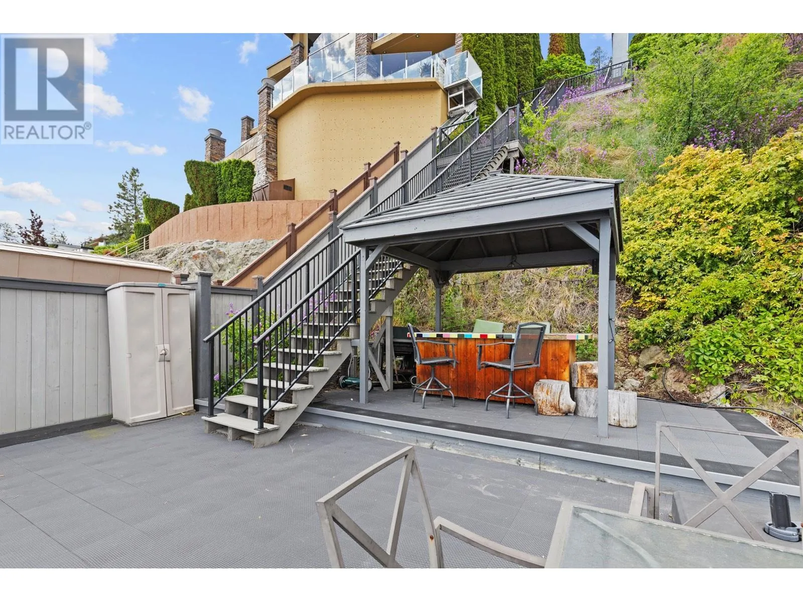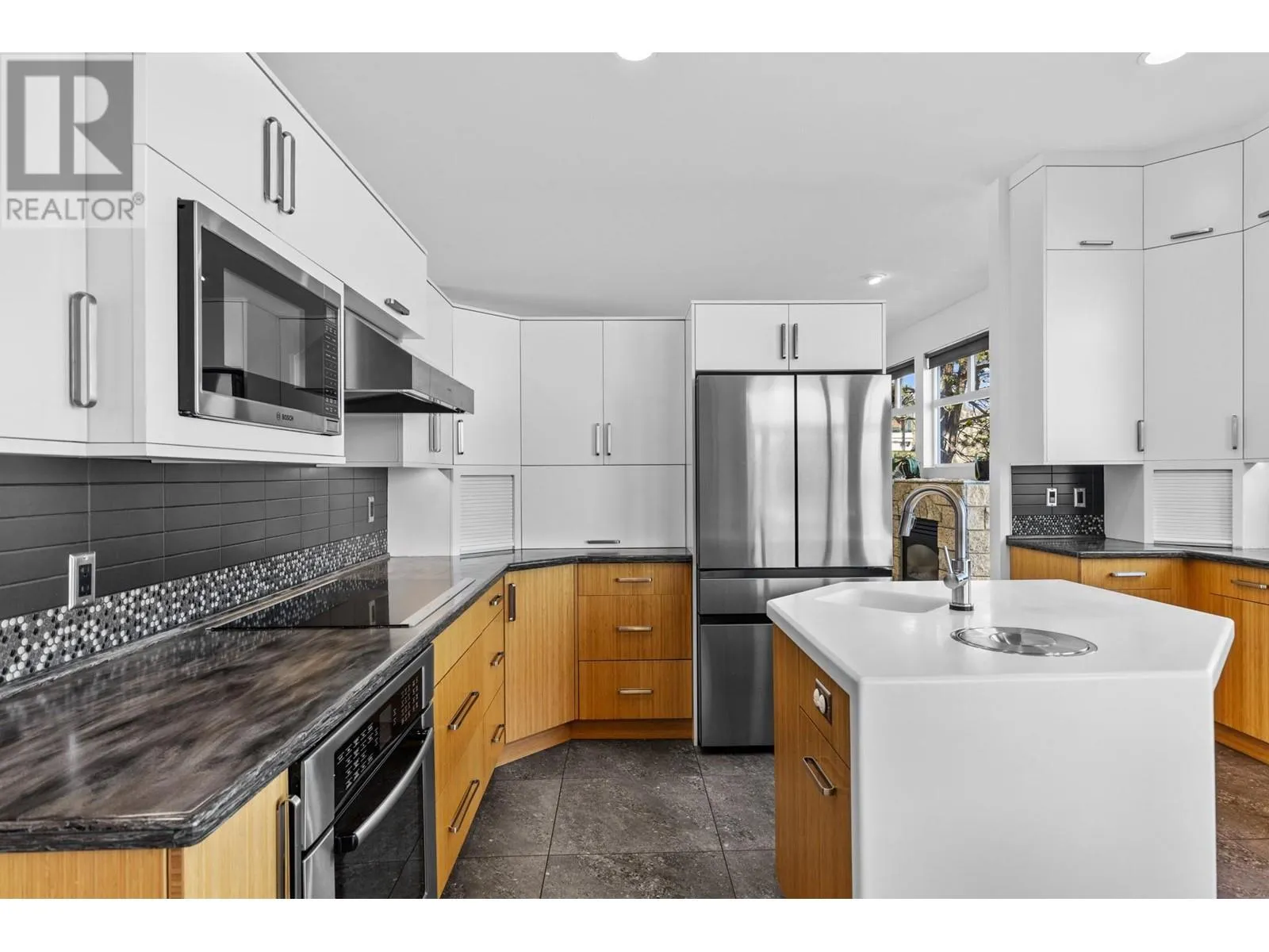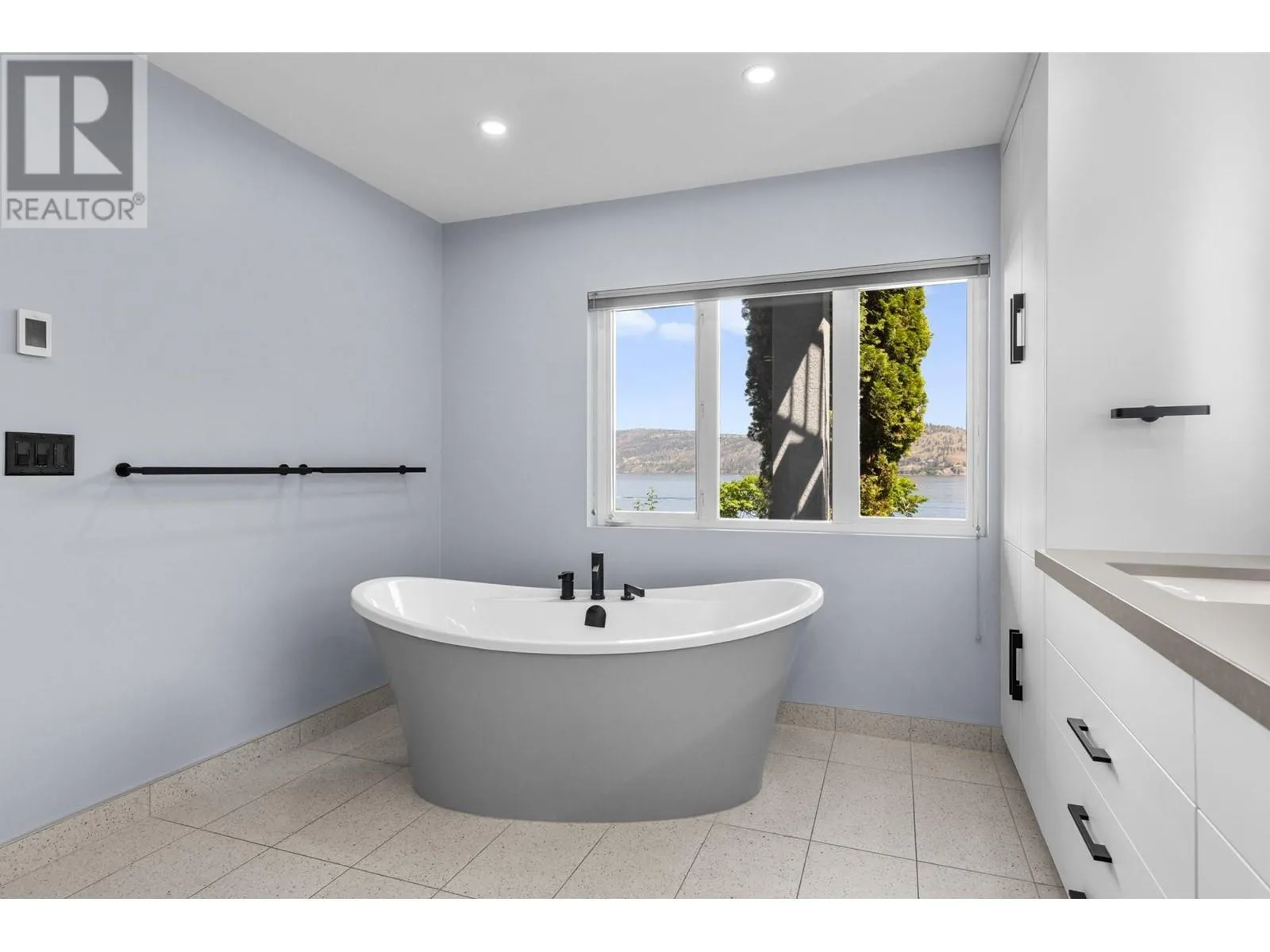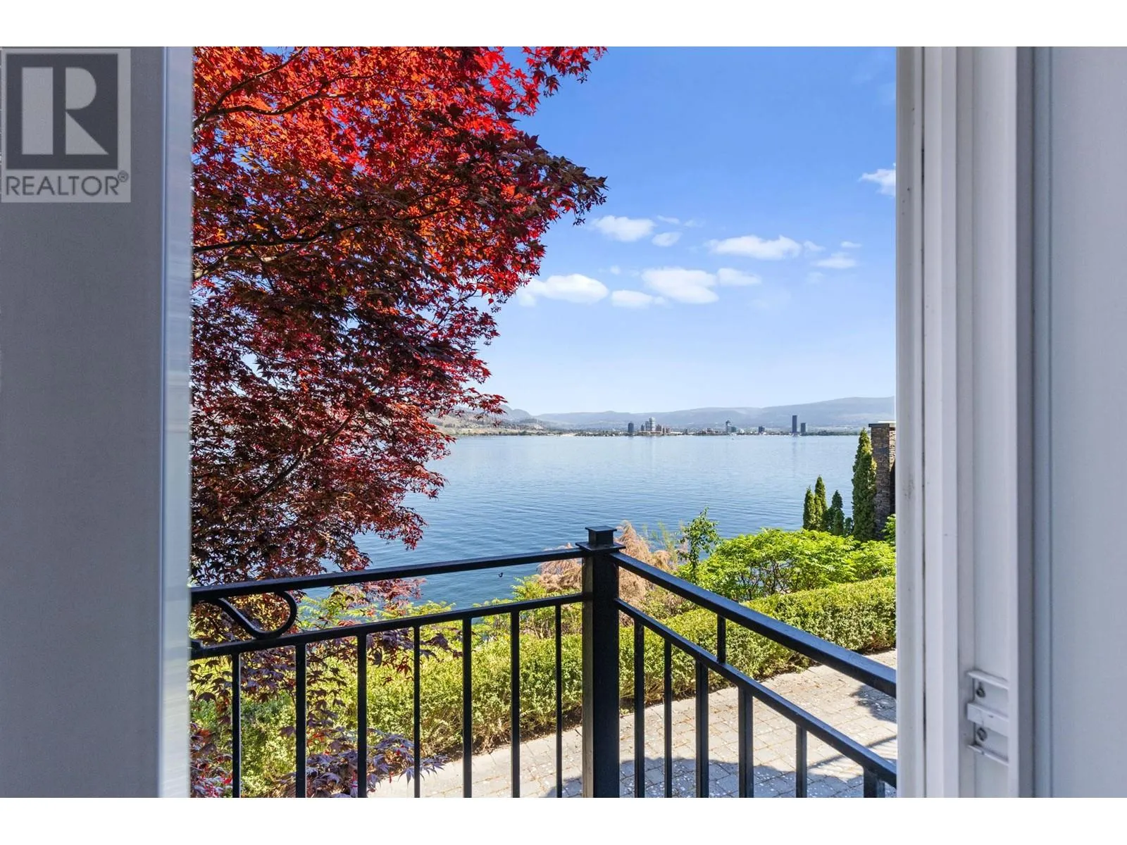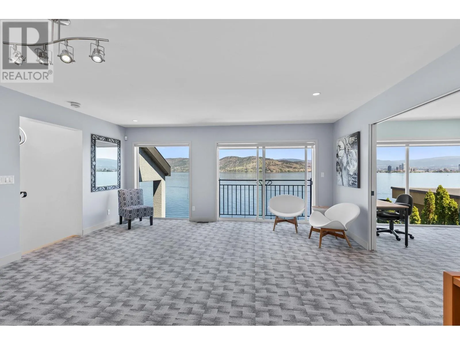 Situated just minutes from downtown Kelowna, this updated walk-out lakefront home is located in Sailview Bay, a quiet, gated community along Westside Road. Set on the cliffside with over 100 feet of private waterfront, the property captures panoramic views of Okanagan Lake and the downtown skyline, offering a peaceful setting by day and a backdrop of twinkling city lights at night. Designed to accommodate both everyday living and hosting guests, this five-bedroom home is well suited for families and visitors coming to enjoy the Okanagan lifestyle. The dock has been resurfaced with Sport Court tiles and offers direct access to the deep, clear waterâideal for swimming, paddleboarding, or diving. Just steps from the shoreline there is a generous open deck, covered outdoor bar, and a vaulted-ceiling cabana, perfect to relax by the water. Inside, the home has been thoughtfully renovated with warm finishes and a functional design. The kitchen features stainless steel appliances, a built-in oven and cooktop, two-tone custom cabinetry, and heated flooring. The open-concept layout connects the kitchen, dining, and living areas, all oriented to take in the lake and city views through large windows. Each waterfront property in Sailview Bay includes it's own private dock, accessed by stairs or a personal funicular. The community is known for its privacy, natural surroundings, and convenient locationâoffering a quiet retreat that remains close to the amenities of Kelowna and West Kelowna. (id:27476)