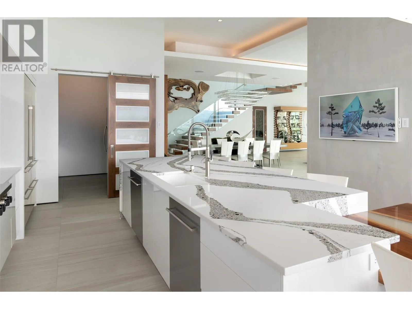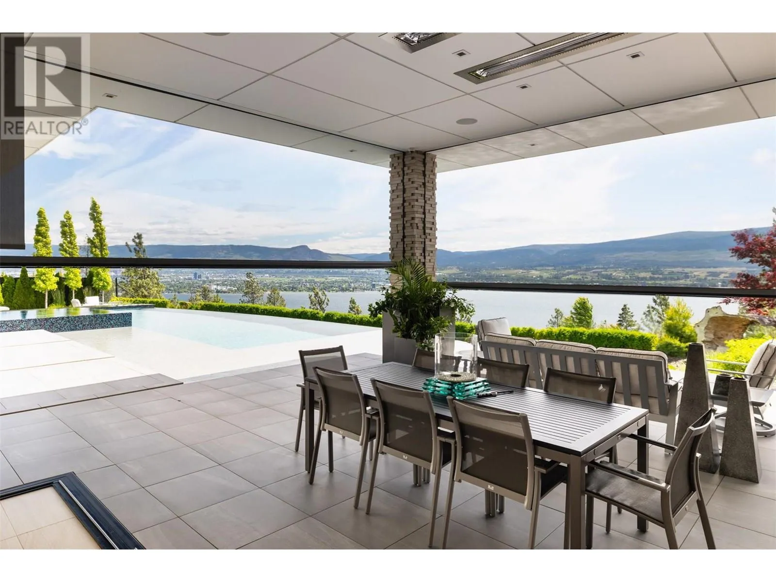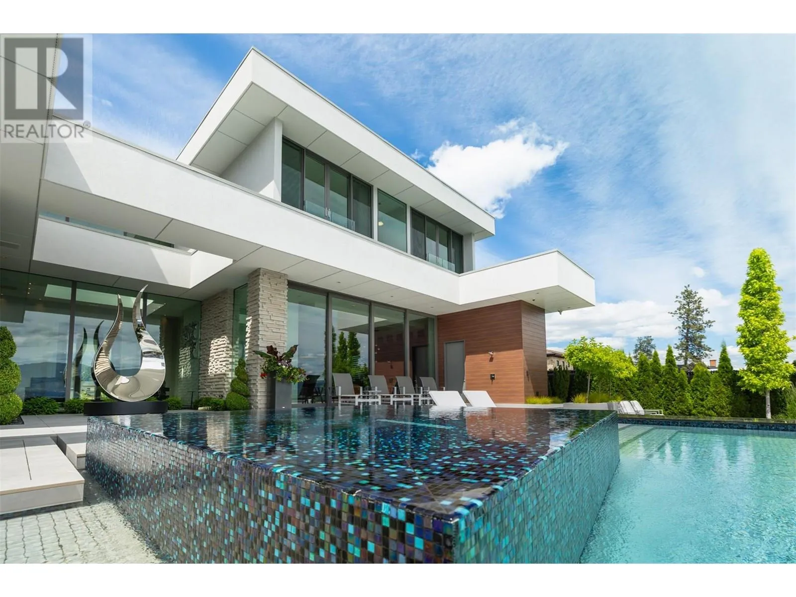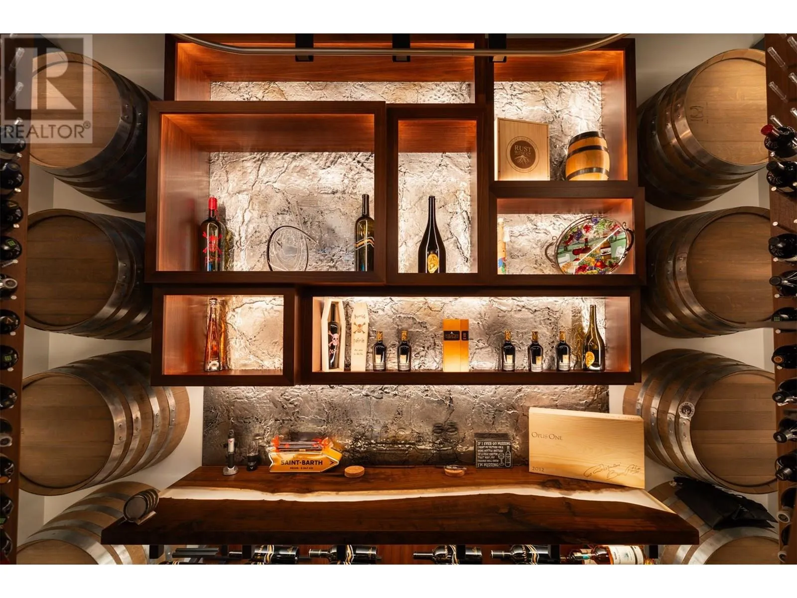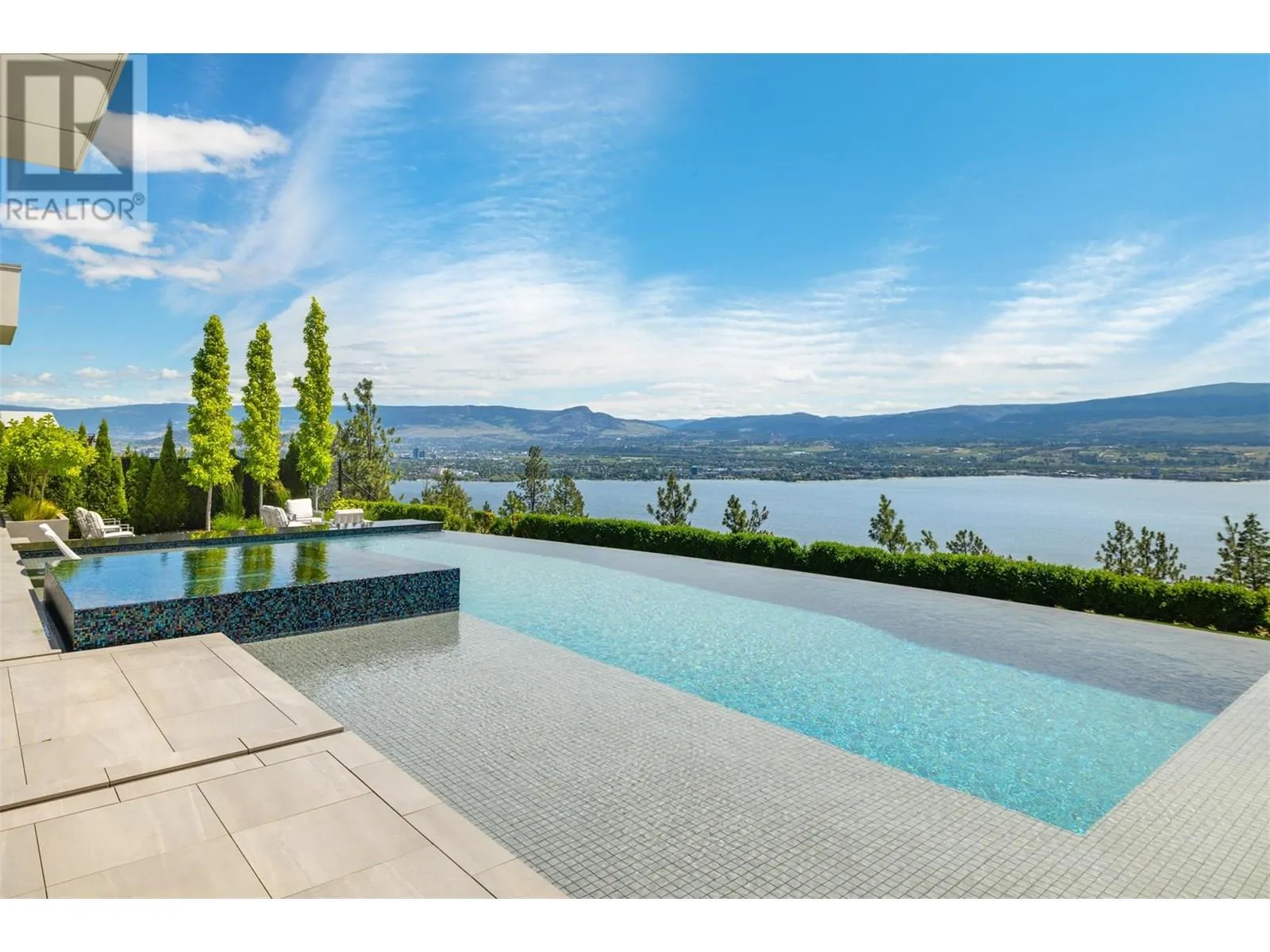 Discover unparalleled luxury at this magnificent custom Okanagan home. As you pass through the gate, you'll immediately be captivated by its design. The modern aesthetic seamlessly integrates the home with its landscaping, creating a harmonious experience. The entry features a mesmerizing floating roof design inspired by a museum in Spain, and light filled courtyard to display custom artwork Inside, entertain at the custom bar, enjoy a cinematic experience in the state-of-the-art home theatre, and store your prized vintages in the 1,500-bottle wine room. For seamless indoor to outdoor living all the sliding doors open to a completely private backyard offering a sensational living experience: prepare a culinary feast in the outdoor kitchen, lounge by the expansive saltwater vanishing edge pool, or soak in the hot tub, all while enjoying the relaxing ambiance of the waterfall and 180-degree views of Okanagan Lake. Take the floating walnut staircase or the elevator upstairs. The primary bedroom is a retreat like no other, with a private patio, luxurious lake view en suite, and a stunning custom closet. Three additional bedrooms each have their own en suite. For the car enthusiast, this home boasts 2 levels of garages with parking for 7+ vehicles. Exquisite finishes include porcelain tile floors, Cambria quartz, &unmatched glass and walnut woodwork by Shawn Truit. This custom home stands as a masterpiece of design and engineering. (id:27476)