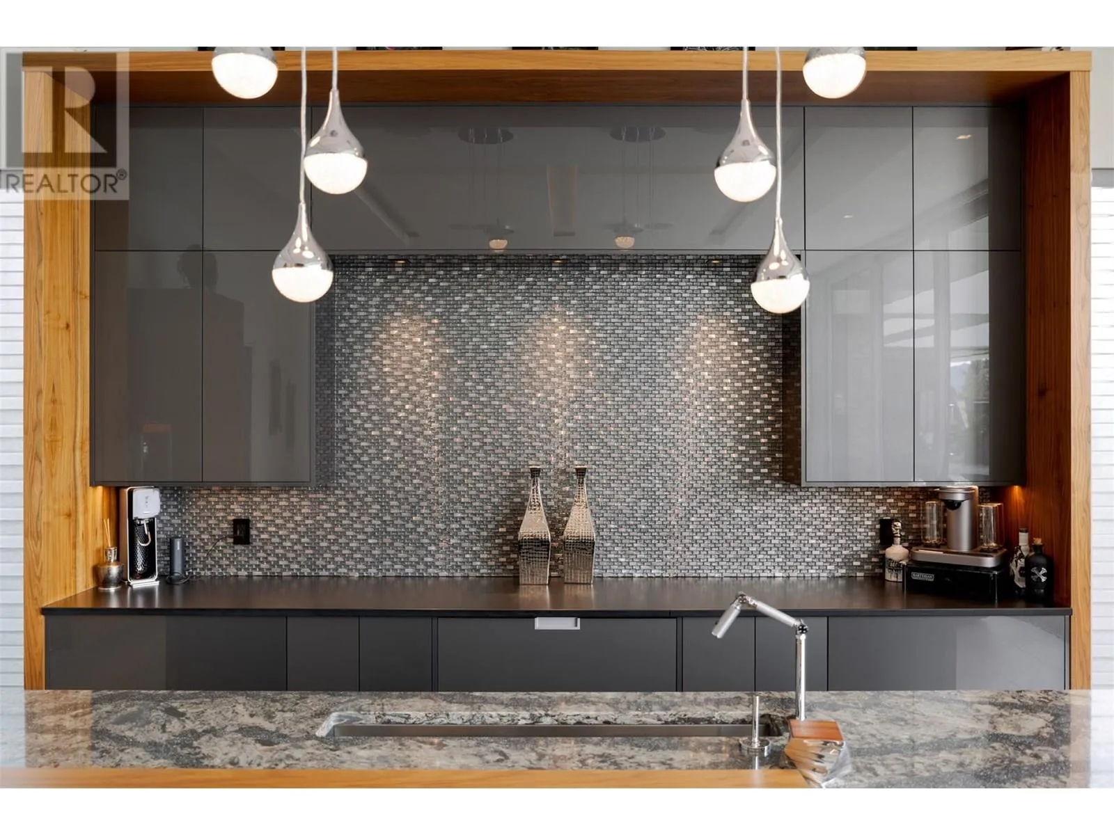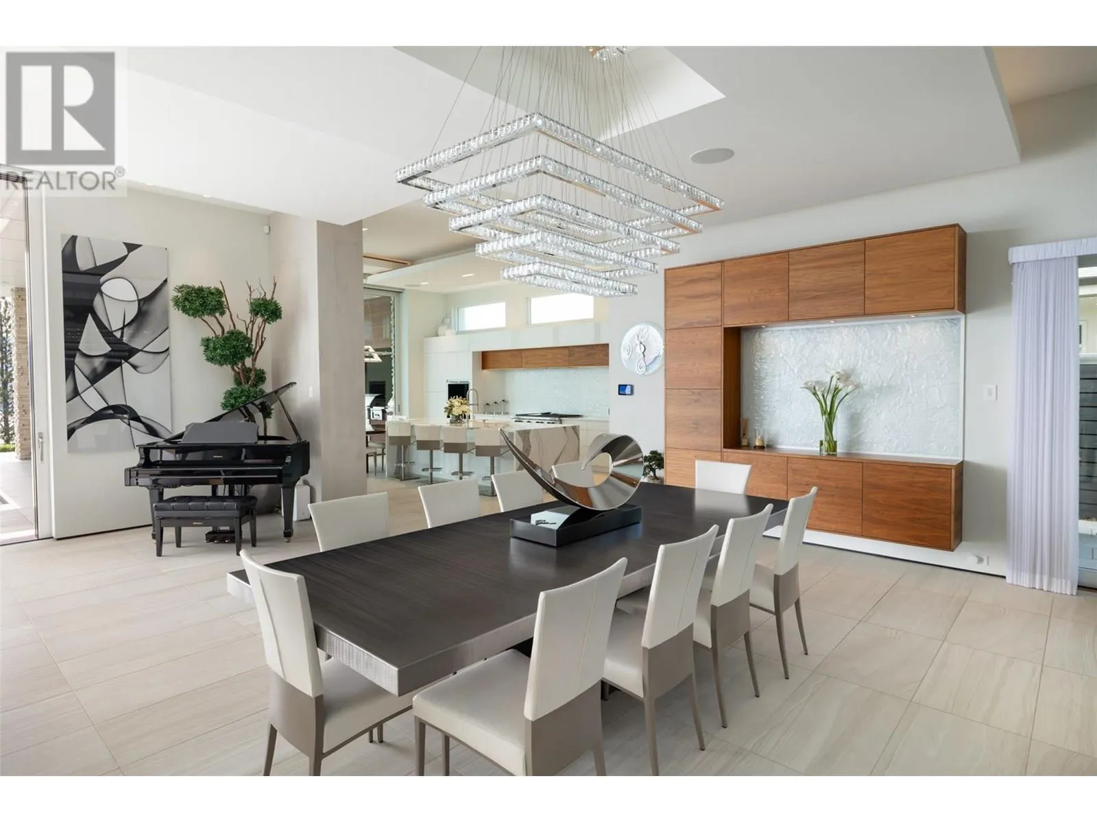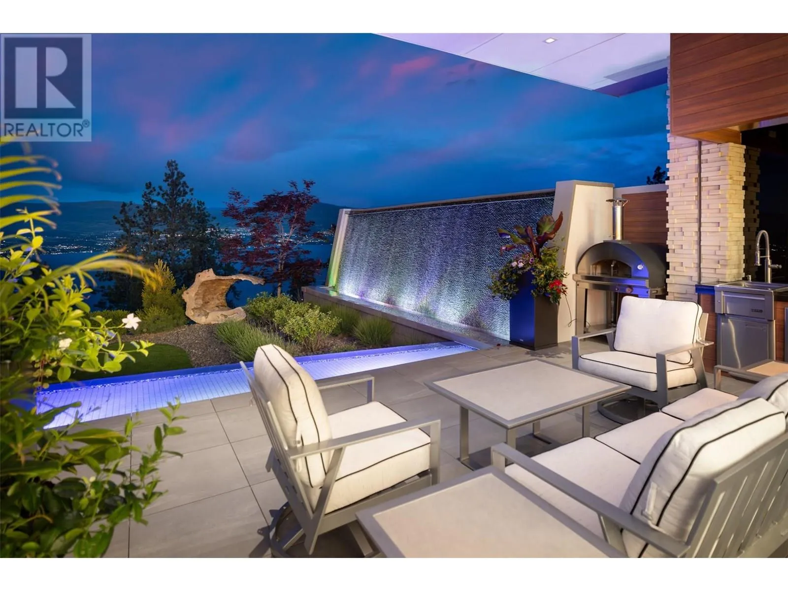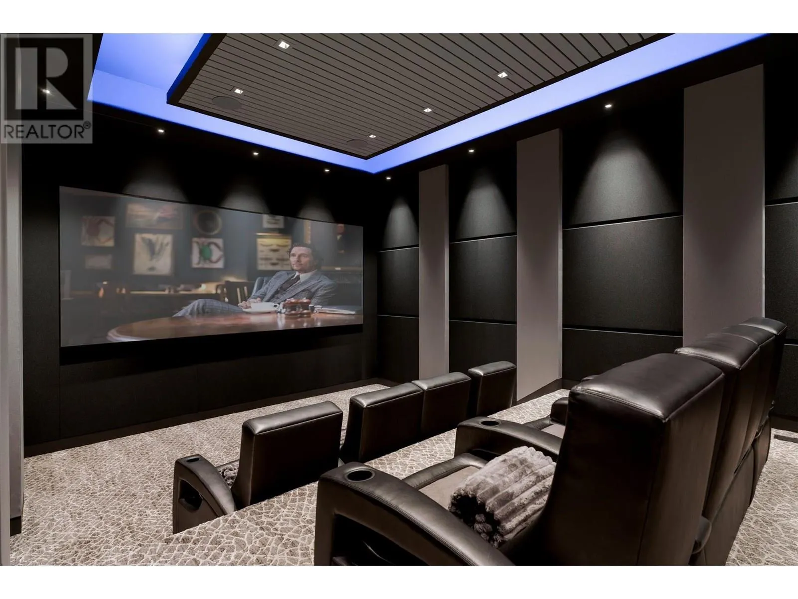 Discover unparalleled luxury at this magnificent custom Okanagan home. As you pass through the gate, you'll immediately be captivated by its design. The modern aesthetic seamlessly integrates the home with its landscaping, creating a harmonious experience. The entry features a mesmerizing floating roof design inspired by a museum in Spain, and light filled courtyard to display custom artwork Inside, entertain at the custom bar, enjoy a cinematic experience in the state-of-the-art home theatre, and store your prized vintages in the 1,500-bottle wine room. For seamless indoor to outdoor living all the sliding doors open to a completely private backyard offering a sensational living experience: prepare a culinary feast in the outdoor kitchen, lounge by the expansive saltwater vanishing edge pool, or soak in the hot tub, all while enjoying the relaxing ambiance of the waterfall and 180-degree views of Okanagan Lake. Take the floating walnut staircase or the elevator upstairs. The primary bedroom is a retreat like no other, with a private patio, luxurious lake view en suite, and a stunning custom closet. Three additional bedrooms each have their own en suite. For the car enthusiast, this home boasts 2 levels of garages with parking for 7+ vehicles. Exquisite finishes include porcelain tile floors, Cambria quartz, &unmatched glass and walnut woodwork by Shawn Truit. This custom home stands as a masterpiece of design and engineering. (id:27476)