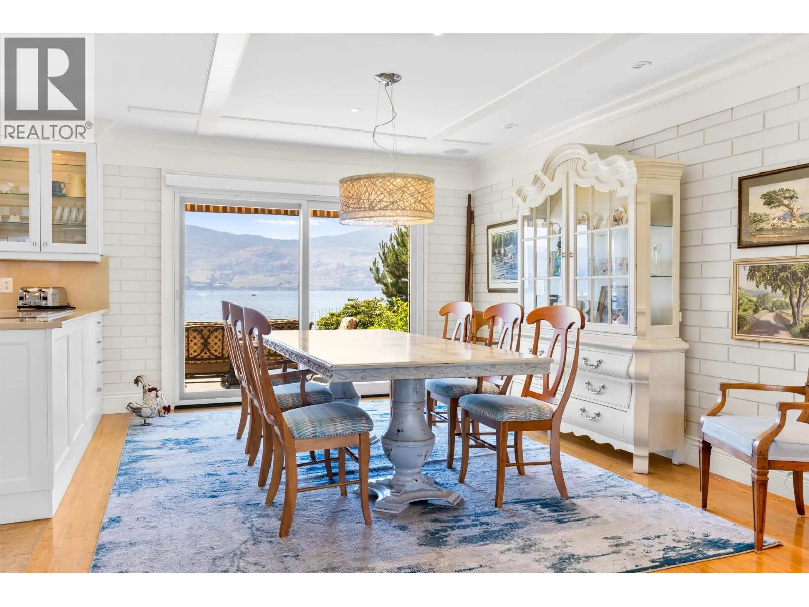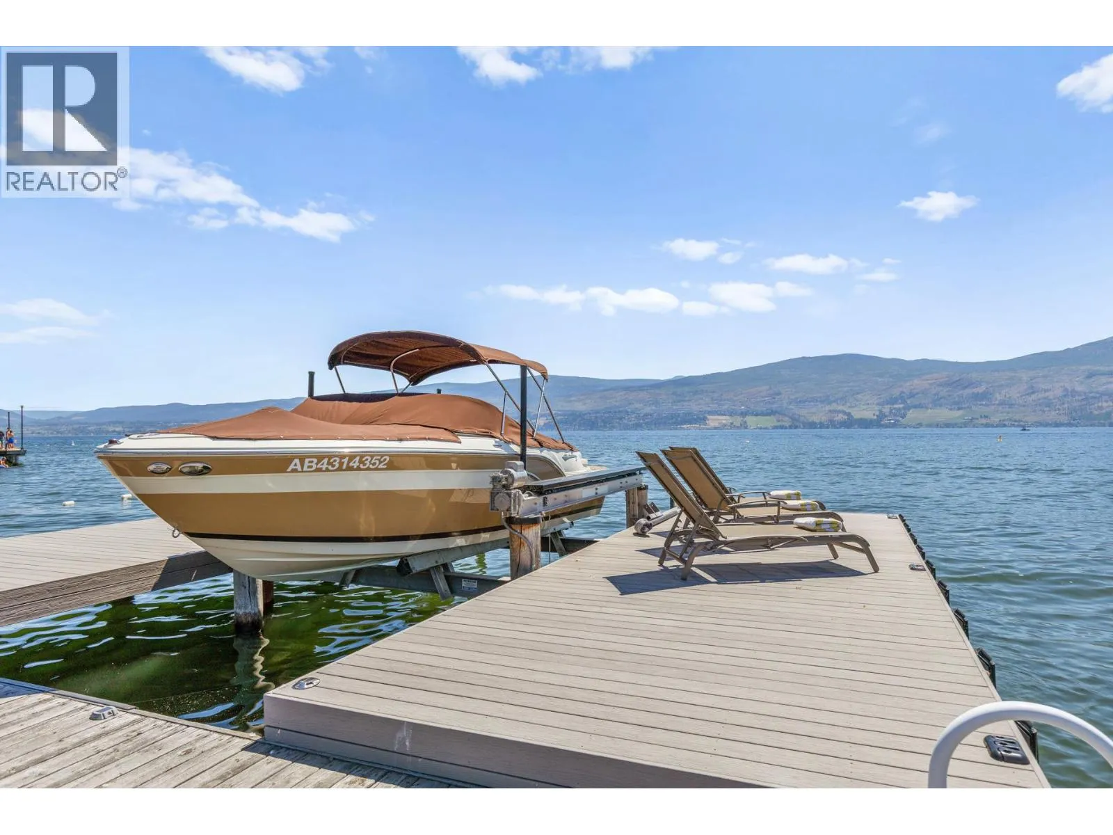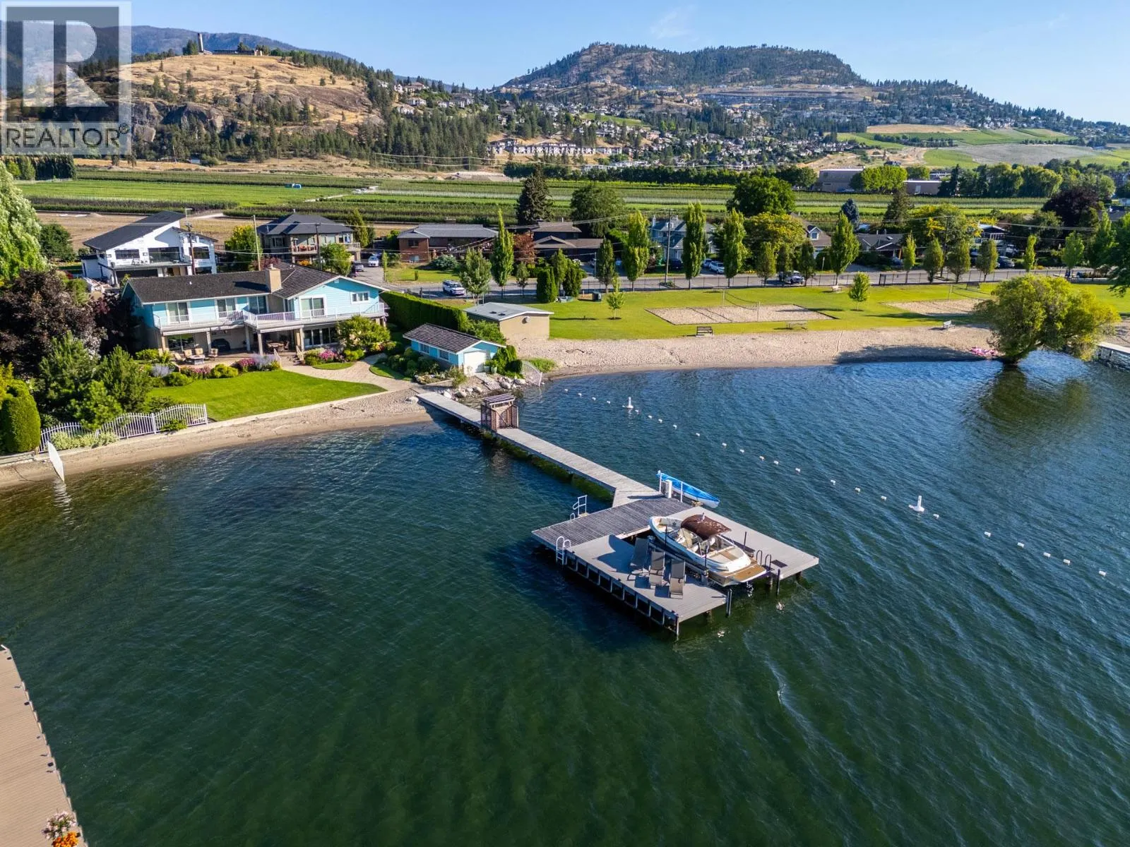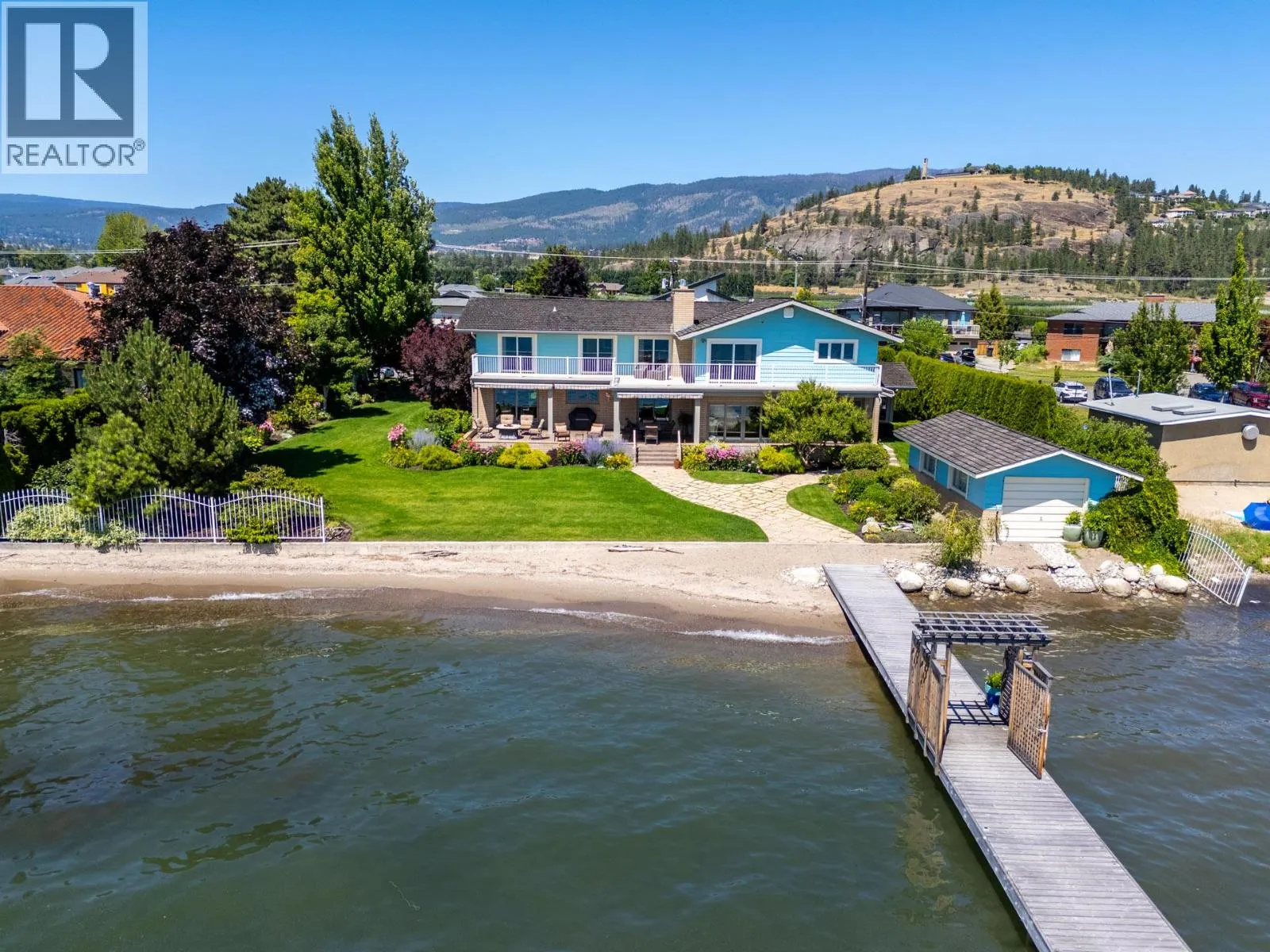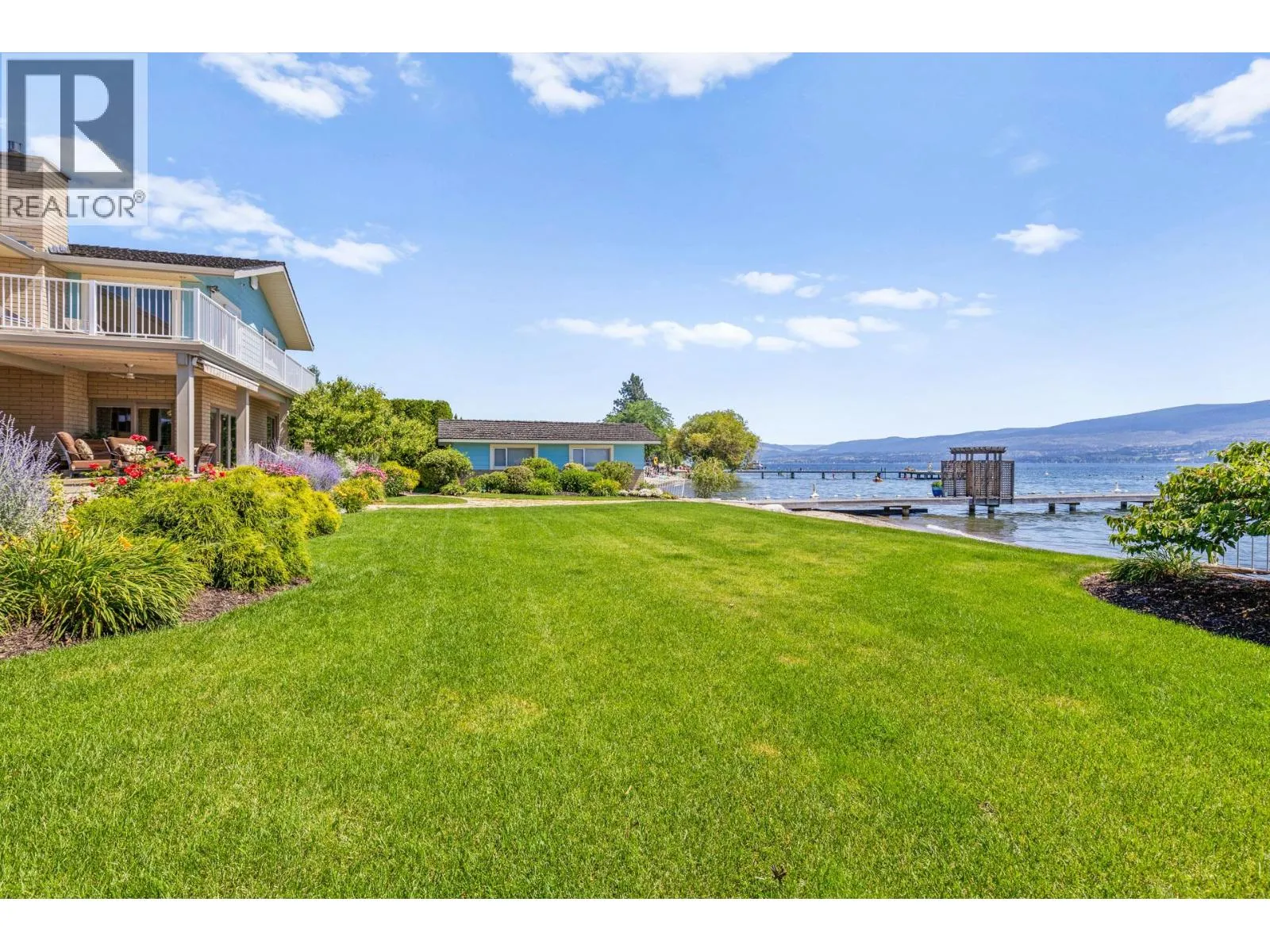 Live your Okanagan Lakefront dream with 128' of flat pristine beachfront on nearly .5 of an acre. Enjoy your licensed dock with 2 lifts, a boathouse for lake toys, and a lush irrigated yard with maple,pine,fruit trees, and beautiful flowers. The Chef's kitchen offers a Thermador fridge, Induction cooktop, wine fridge, and inspiring lake views, perfect for entertaining, or quiet mornings. The main floor boasts Inside,bamboo flooring,large windows, and a seamless flow between laundry room, recently renovated bedroom and bathroom, den with elegant wainscotting, sunken living room and dining area. A European sauna upstairs offers you your own private spa, while the Primary bedroom is a perfect sanctuary with stunning lake views, an ensuite that makes one feel spoiled, and large patio deck so one can capture the lake and mountain views. A newer furnace(2022),and AC ensure year round comfort. An oversized 2-auto garage with workspace area, and plenty of driveway parking for guests. From morning paddles to sunset gathering ,embrace lakeside living at its finest on Lake Okanagan. (id:27476)