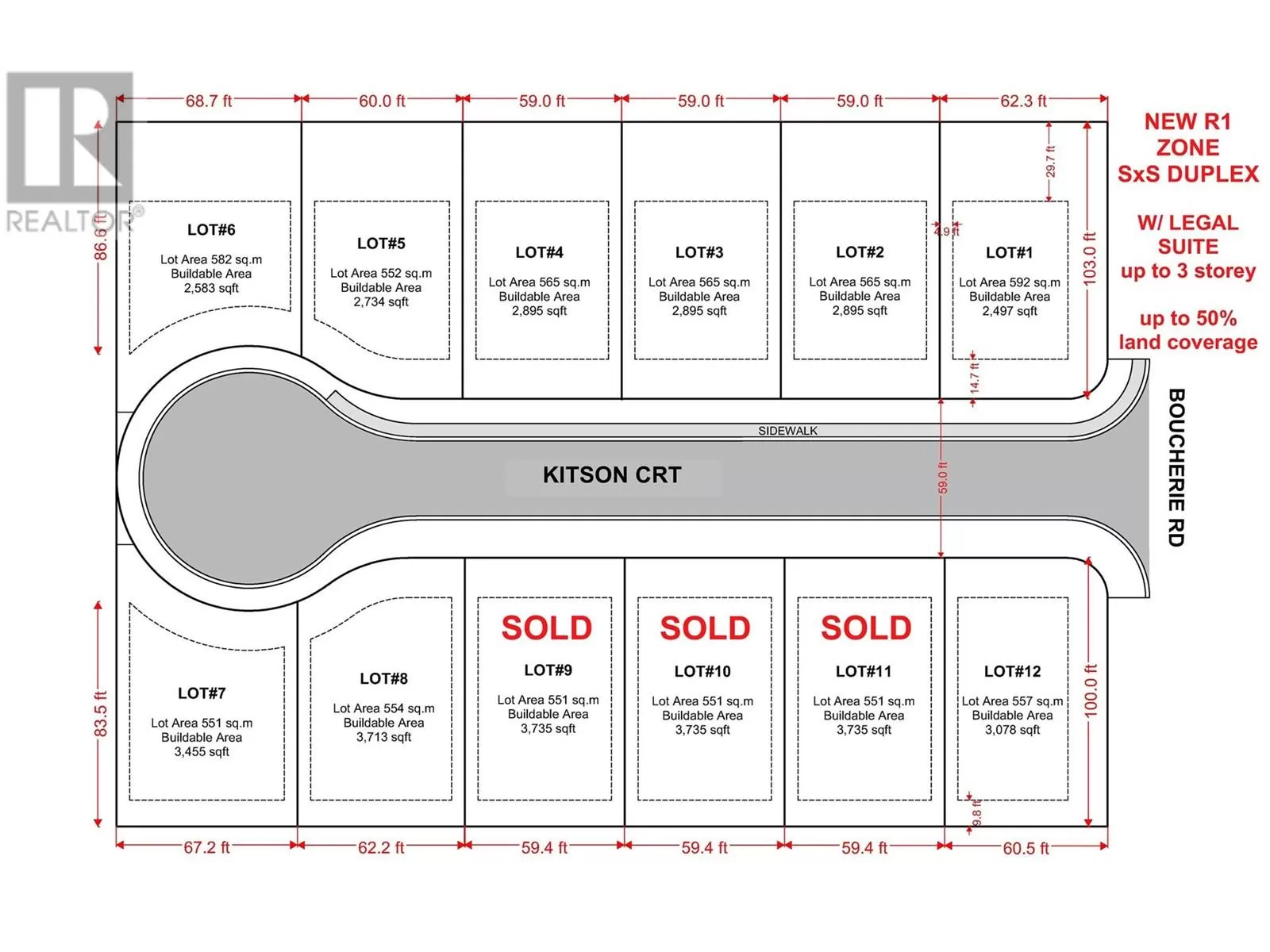 Amazing R1 zone lots for S x S duplexes with secondary suites with site coverage allowance of up to 50% and building up to 3 stories. Incredible opportunity to construct a S x S duplex or single-family home on these easy buildable lots offering wide frontages. This remarkable subdivision is located in the heart of Lakeview Heights, near many renowned wineries and wine trails. Just a quick 10-min drive from downtown Kelowna and close proximity to the beach, schools and shopping. No restriction on builders, Flexible building guideline and no time restriction allows you to customize and build at your own pace. The seller is open to the idea of extended completion and potentially starting construction prior to closing. Contact LR to further explore and discuss the specifics. The designs provided for lots 8,5,4,3 and 2 have received preliminary approval. Price is plus GST (id:27476)