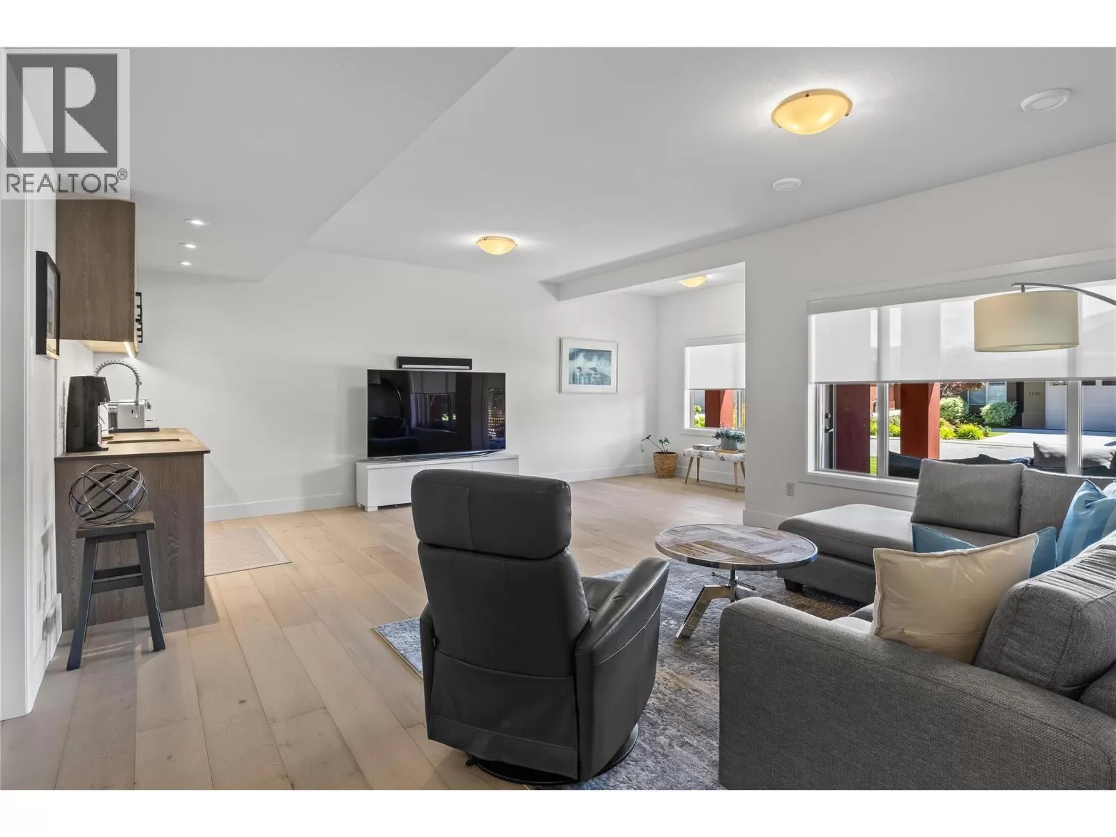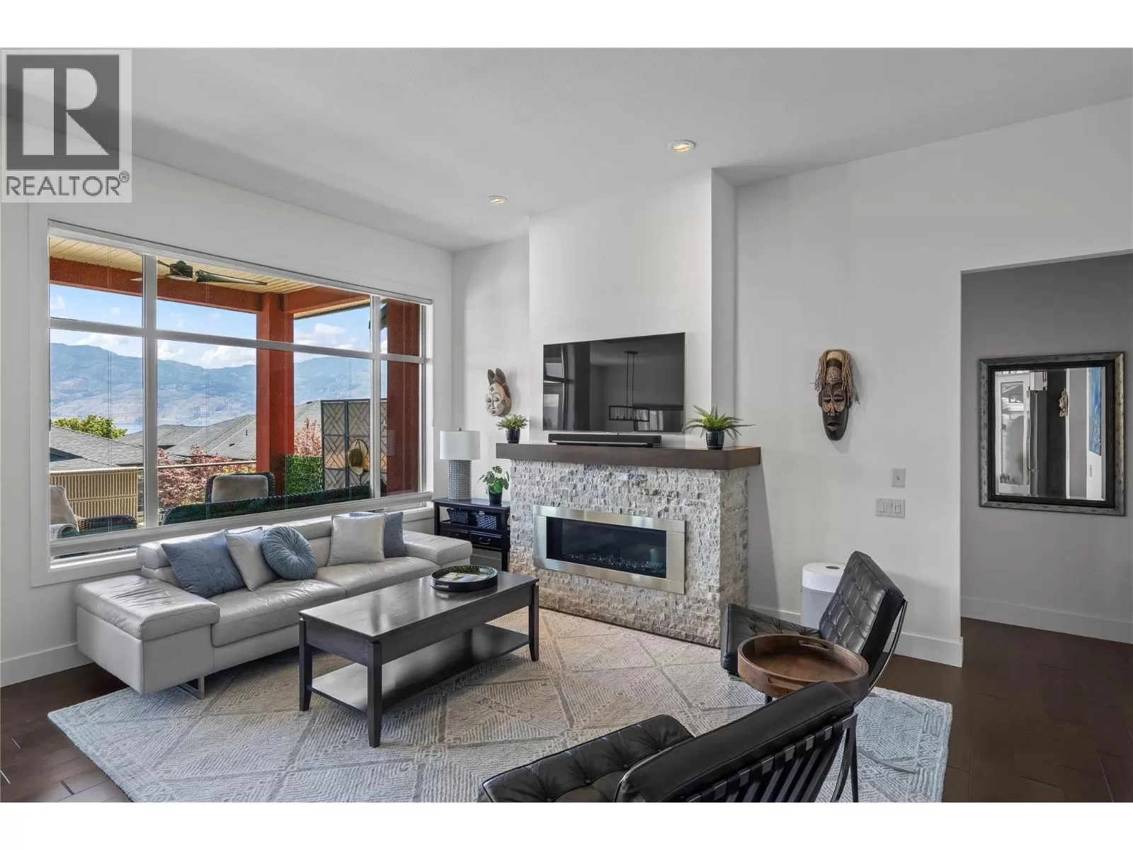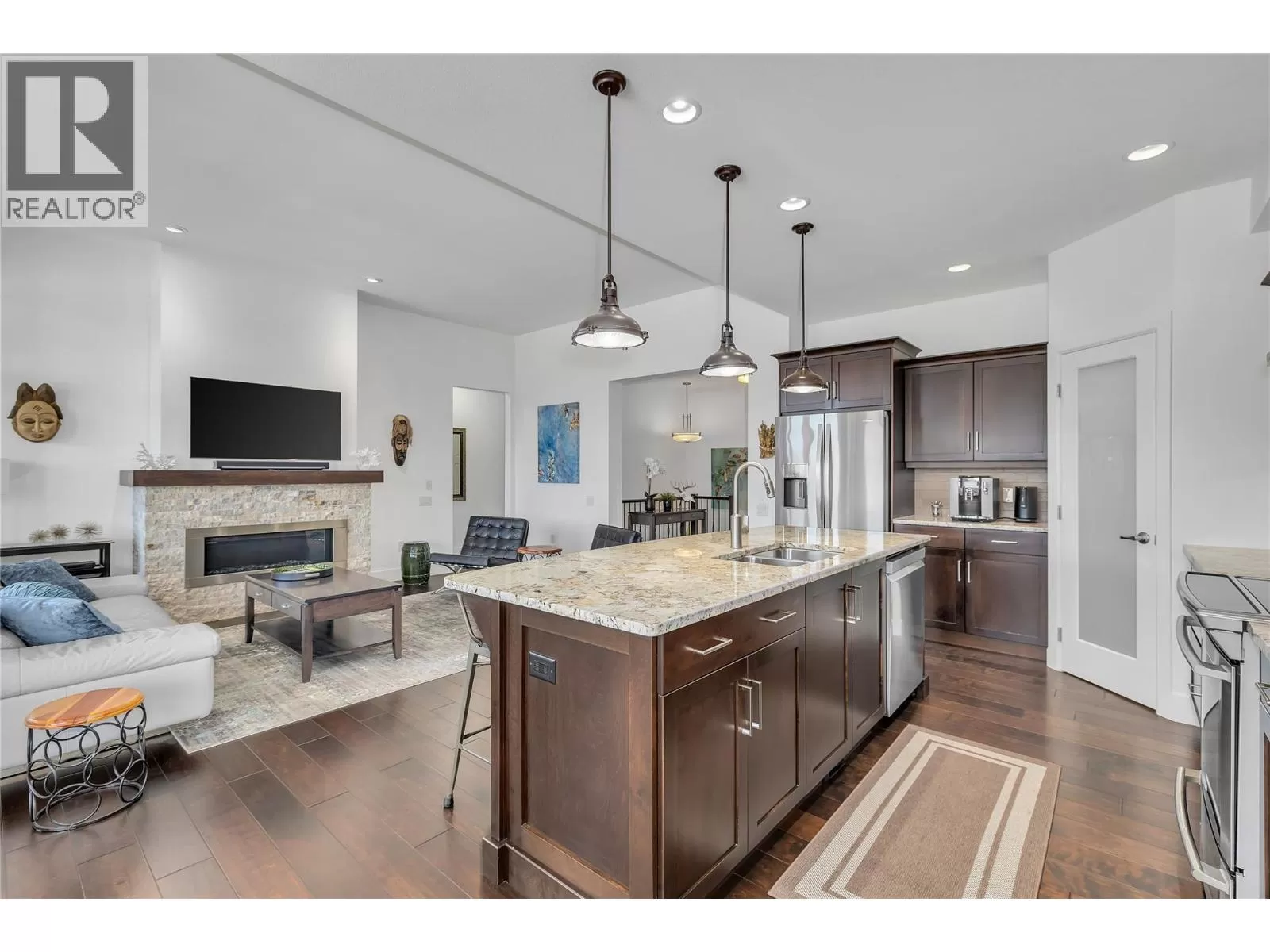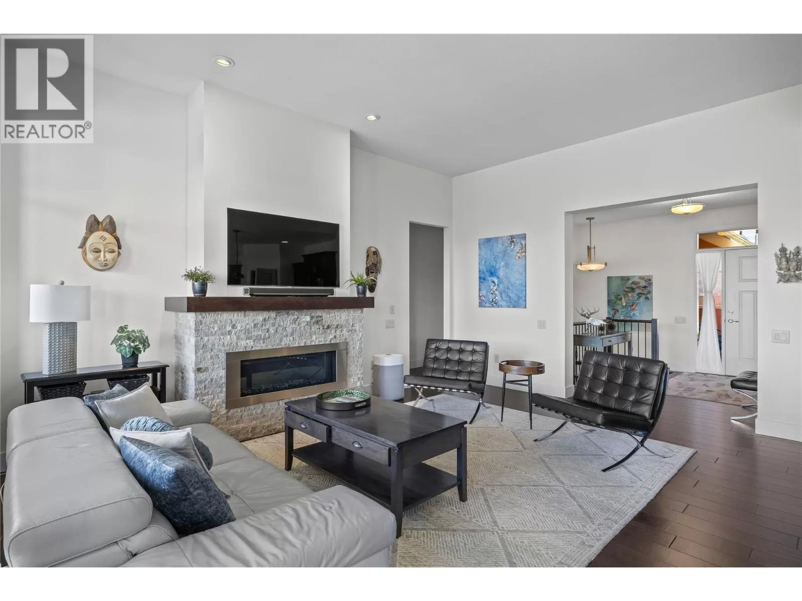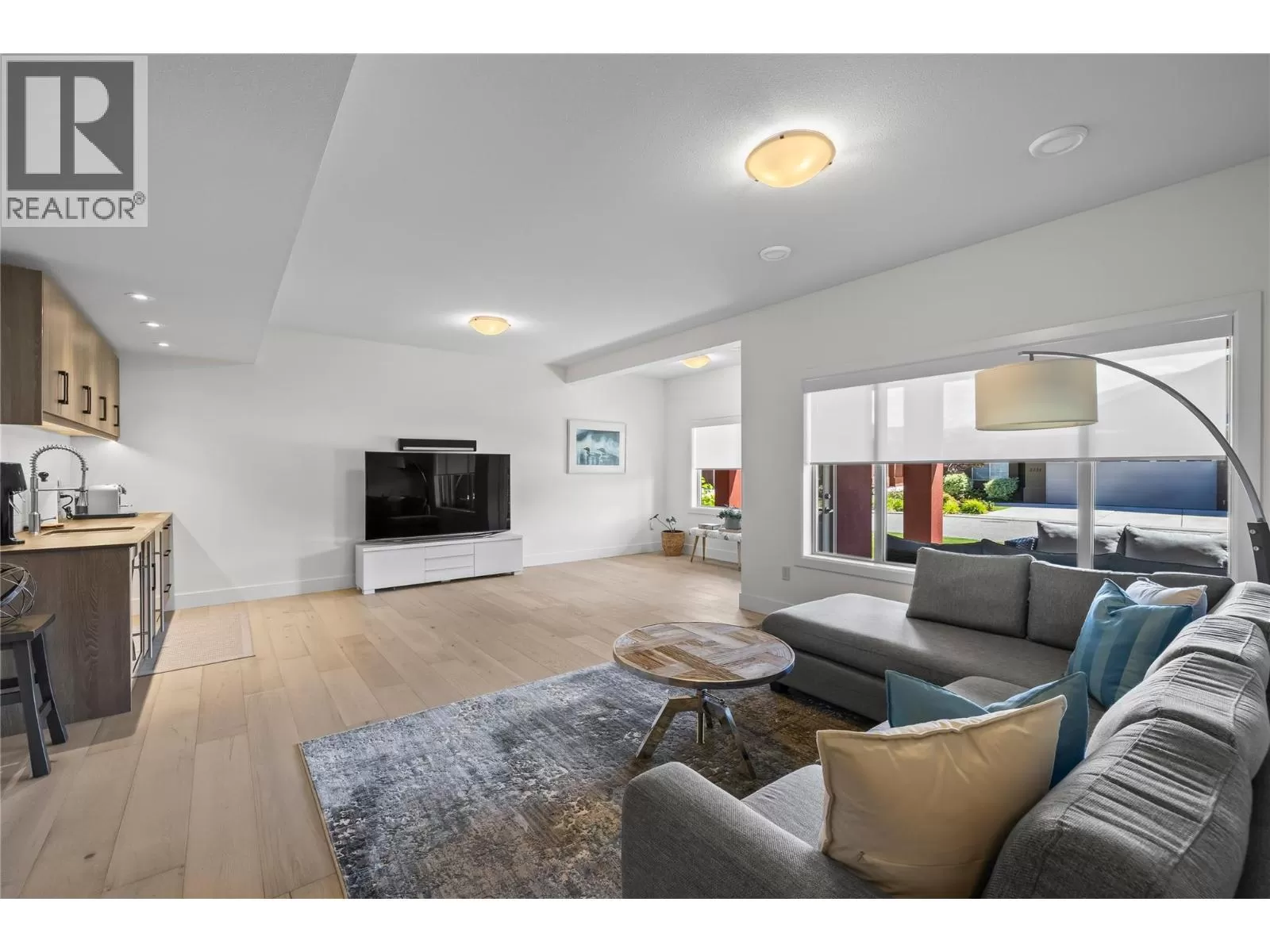 Location and lifestyleâthis home truly has it all! Nestled in the highly desirable community of Sonoma Pines, this stunning walkout rancher with partial lake views offers both comfort and convenience. The open Mojave plan features a spacious kitchen with a large center island, sit-up bar, updated lighting, walk-in pantry, and newer stainless steel appliances. An elegant stone fireplace & engineered hardwood floors grace the main living space, filled with natural light from a wall of windows showcasing picturesque views. Wake up with coffee or unwind with a glass of wine on the extended deck with glass railings, ceiling fan, and gas hook-up. The primary bedroom boasts a luxurious 5-piece ensuite with dual vanities, WI shower, & spacious WI closet. A versatile second bedroom/den, full bath, and laundry with new washer and dryer complete the main level. The recently renovated lower level features a large family room with beautiful engineered flooring, a stylish feature bar with two wine fridges, two additional bedrooms, full bath, & ample storage. Step outside to a private backyard with a cedar arbor,Perfect for relaxing or entertaining. The heated double garage includes an EV charger and Pro Slat Wall system for organization. Sonoma Pines offers amenities including a clubhouse, gym, library, billiard room, and a social room with rentable full kitchen. Secure RV parking is also available. Located close to Two Eagles Golf, wineries, shopping & LAKE. No PTT or speculation tax. (id:27476)