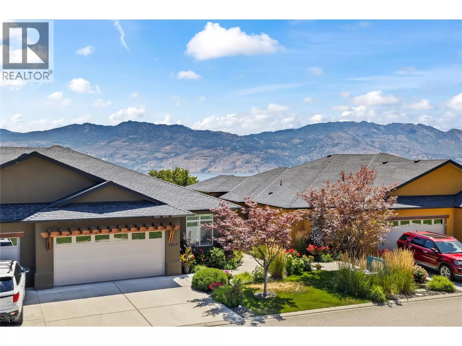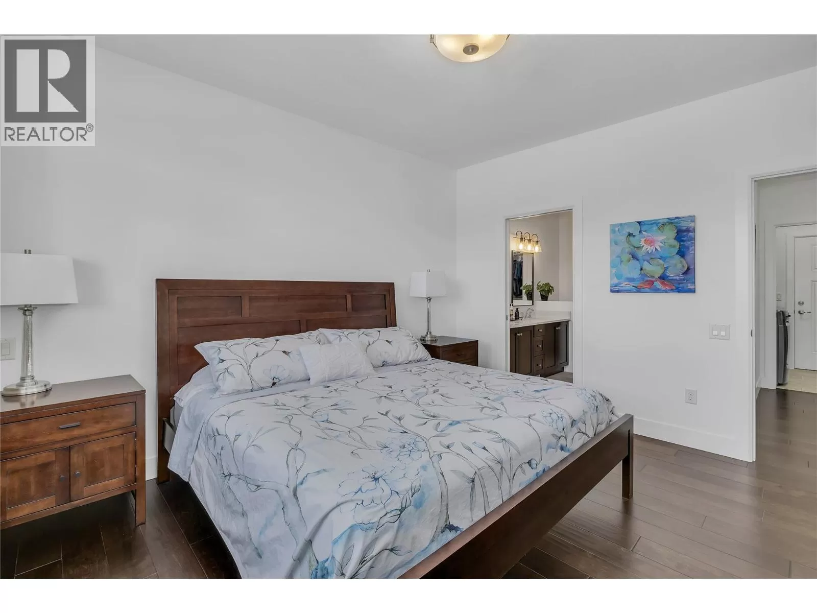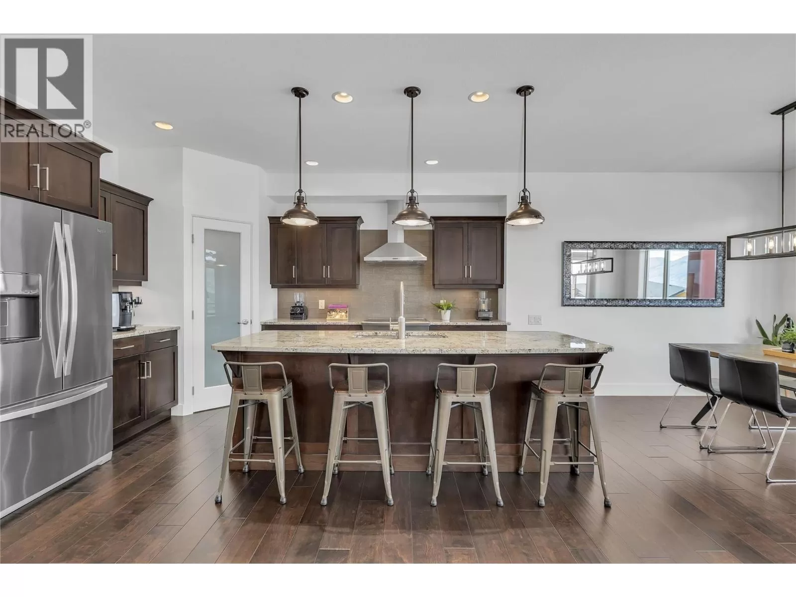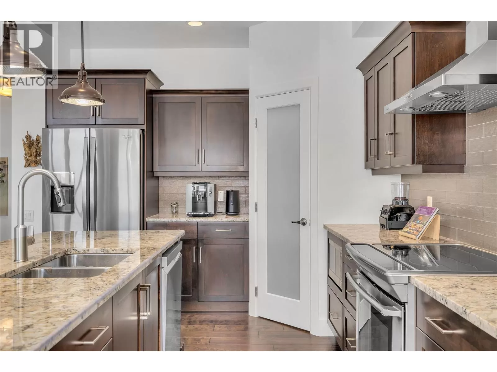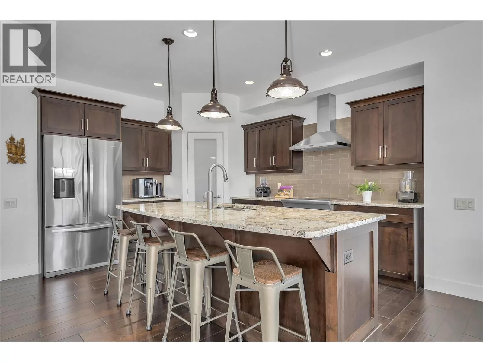 Location and lifestyleâthis home truly has it all! Nestled in the highly desirable community of Sonoma Pines, this stunning walkout rancher with partial lake views offers both comfort and convenience. The open Mojave plan features a spacious kitchen with a large center island, sit-up bar, updated lighting, walk-in pantry, and newer stainless steel appliances. An elegant stone fireplace & engineered hardwood floors grace the main living space, filled with natural light from a wall of windows showcasing picturesque views. Wake up with coffee or unwind with a glass of wine on the extended deck with glass railings, ceiling fan, and gas hook-up. The primary bedroom boasts a luxurious 5-piece ensuite with dual vanities, WI shower, & spacious WI closet. A versatile second bedroom/den, full bath, and laundry with new washer and dryer complete the main level. The recently renovated lower level features a large family room with beautiful engineered flooring, a stylish feature bar with two wine fridges, two additional bedrooms, full bath, & ample storage. Step outside to a private backyard with a cedar arbor,Perfect for relaxing or entertaining. The heated double garage includes an EV charger and Pro Slat Wall system for organization. Sonoma Pines offers amenities including a clubhouse, gym, library, billiard room, and a social room with rentable full kitchen. Secure RV parking is also available. Located close to Two Eagles Golf, wineries, shopping & LAKE. No PTT or speculation tax. (id:27476)