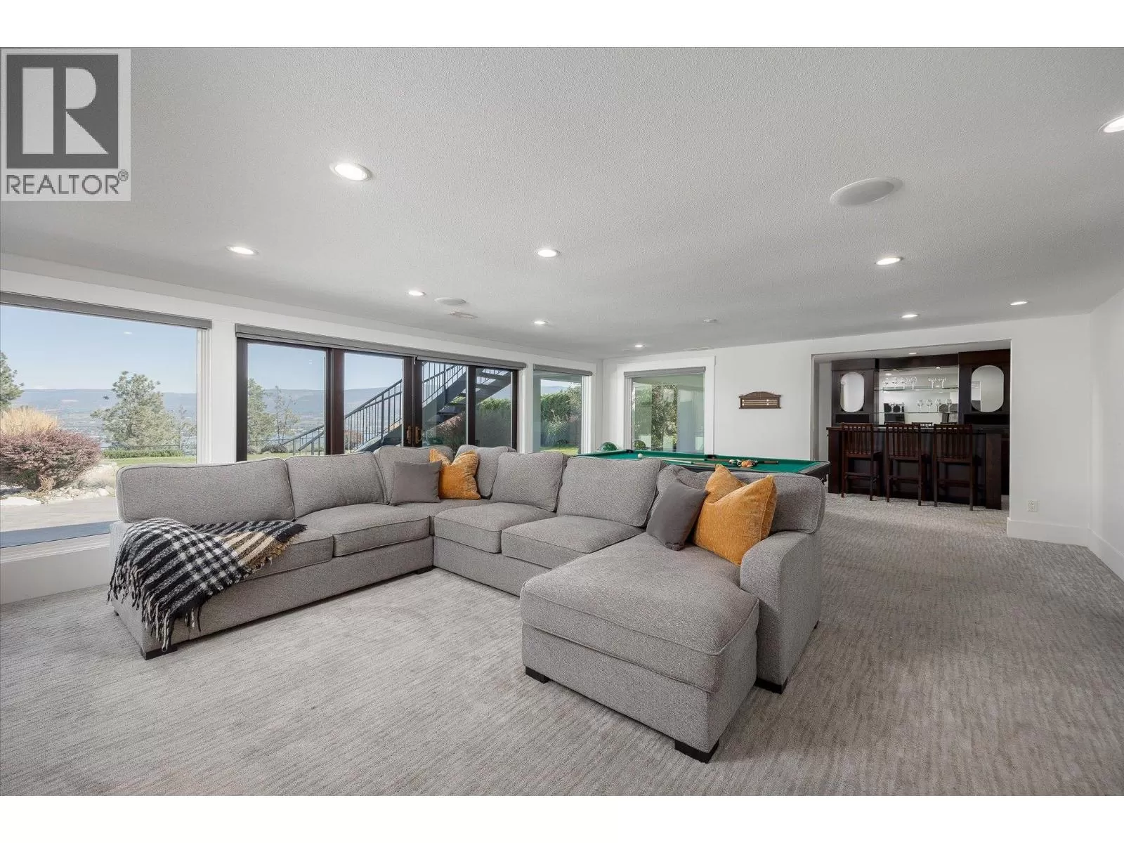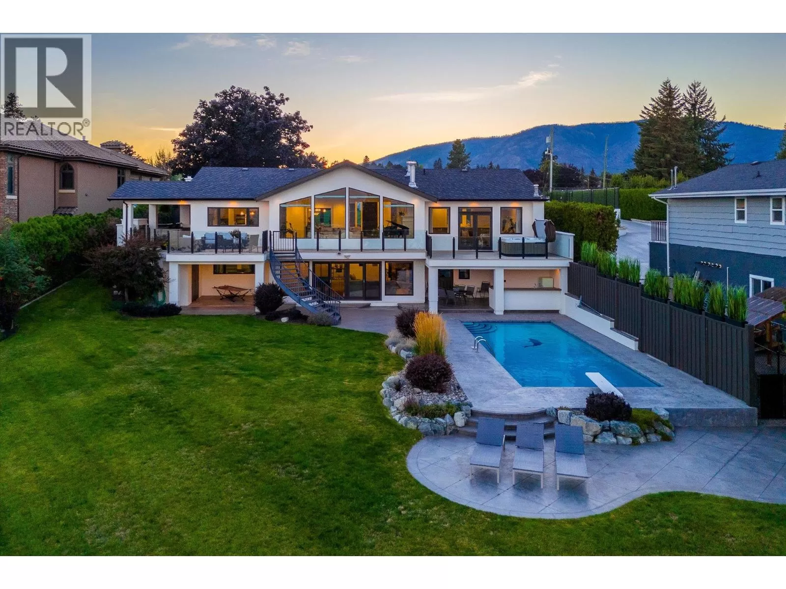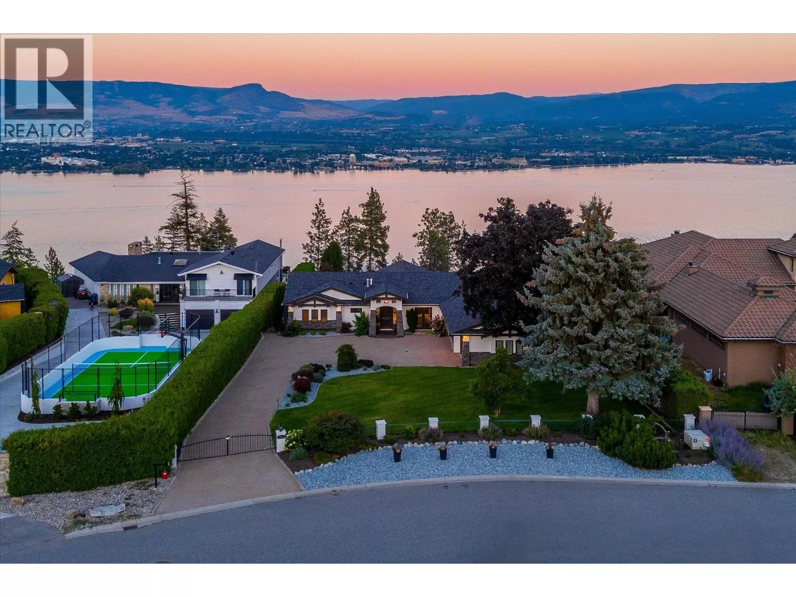 This modern home sits on a gated .75-acre private lot in a quiet, sought-after community in Lakeview Heights. Surrounded by mature, easy-to-maintain gardens and backing onto nature, the property offers stunning panoramic views of the lake, mountains, and city skyline. The expansive, well-established gardens create a tranquil setting perfect for relaxation and outdoor enjoyment. The home boasts numerous recent upgrades, including the addition of a 4th bedroom, a new furnace, a new high-efficiency heat pump, a twelve kilowatt solar panel system, EV charger and a Powerwall 3 energy storage battery. These energy-efficient features significantly reduce utility bills and contribute to a sustainable lifestyle. Inside, enjoy a warm and welcoming ambiance highlighted by an impressive fireplace and floor-to-ceiling windows framing picturesque lake, mountain, and city views. The gourmet kitchen features an oversized granite island, a butlerâs pantry, and immediate access to a covered deck ideal for al fresco dining or relaxing around a natural gas fireplace. Outdoor amenities are equally impressive, including a hot tub off the primary suite, a heated 14 foot by 36 foot pool, and a private outdoor cabana bar with fridge, sink, and surround sound. Located just minutes from downtown Kelowna, golf courses, schools, and city parks, this home is ideally situated for outdoor enthusiasts with nearby hiking and biking trails in Kalamoir Park. Short walks lead to wineries, shops, pubs, cafes, and the new community centre with recreational facilities - such as tennis, pickleball, basketball courts, and a playground. Additional features include a new fourth bedroom with lakeview, private entrance lower level one-bedroom Airbnb, ideal for generating extra income, and room for a potential carriage house, perfect for multi-generational living or additional rental opportunities. (id:27476)
