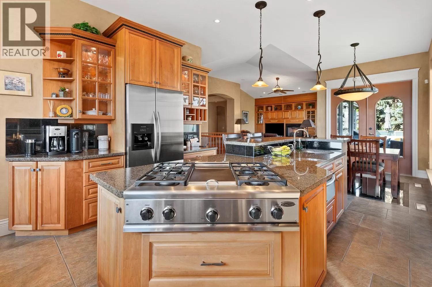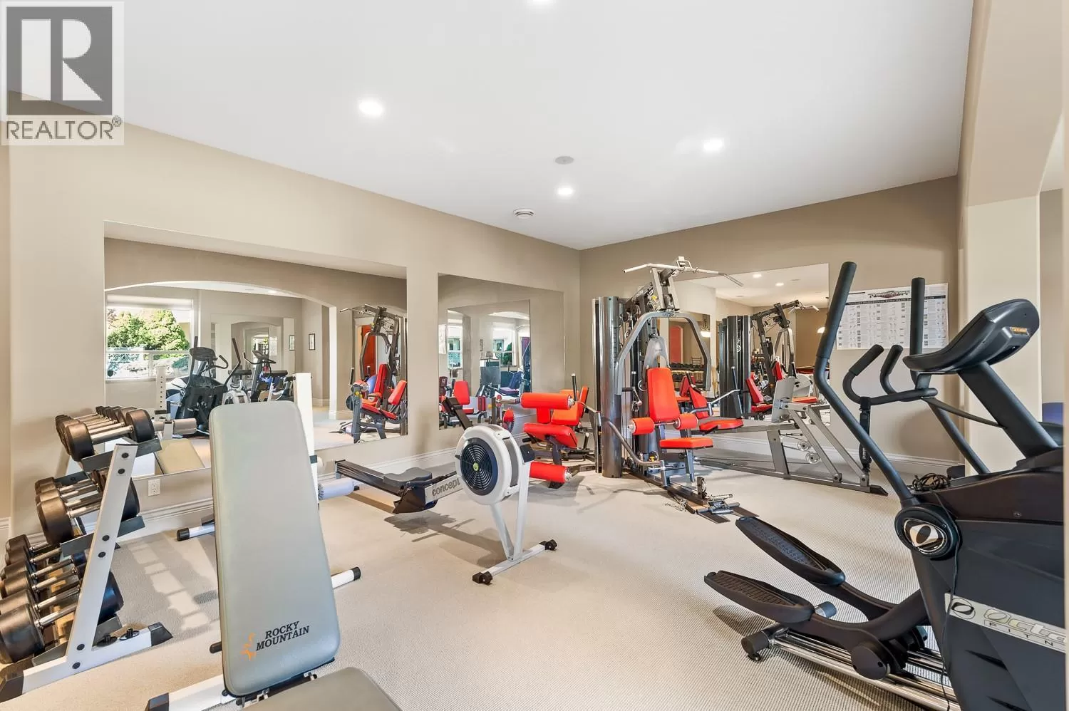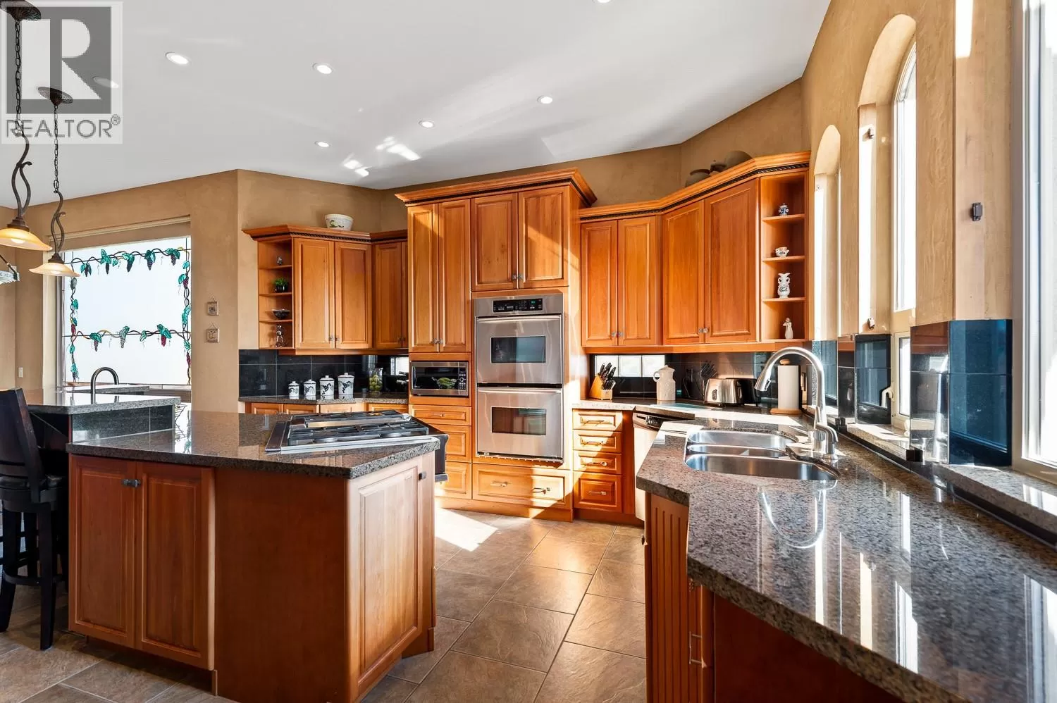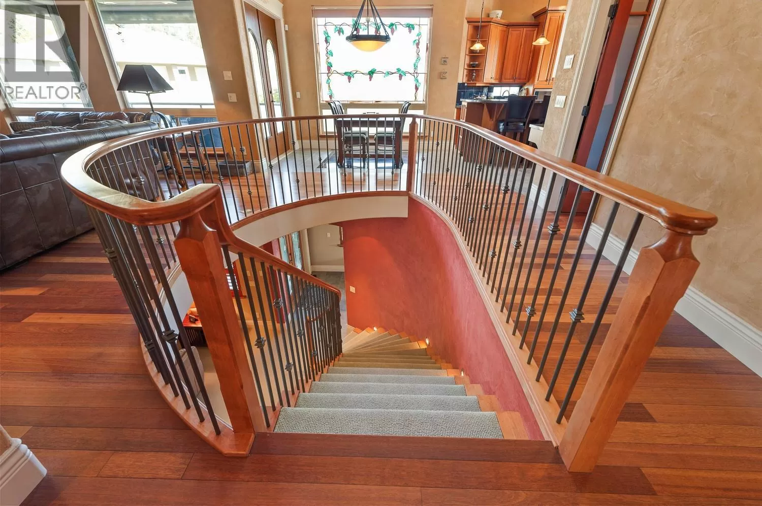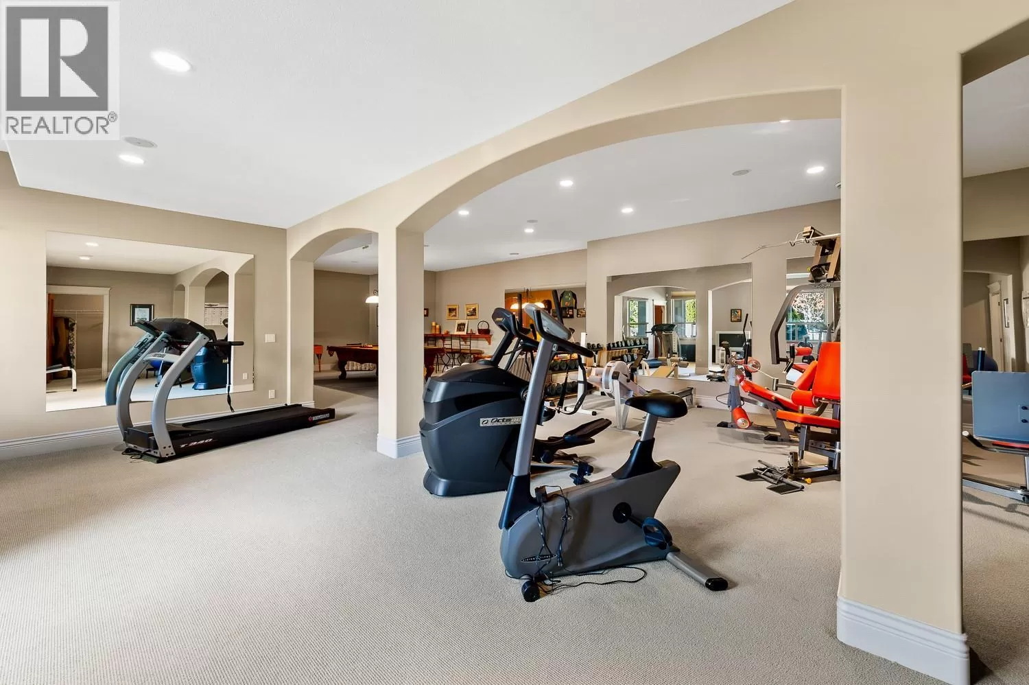 Discover unmatched luxury in this custom-built executive home by K West Builders, located within the exclusive gated community of Huntsfield Greenâjust minutes from downtown Kelowna. Situated on over 1/3 of an acre, this 5,389sqft. residence showcases exceptional craftsmanship, with vaulted ceilings, hardwood floors, American Clay finished walls, rich custom maple cabinetry, and so much more. Designed for both comfort and entertaining, it features a chefâs kitchen with double wall ovens, a gas cooktop, warming drawer plus a formal dining area and a mudroom complete with its own doggy bath. The primary suite is a spacious sanctuary offering serenity and elegance. On the lower level, enjoy 10-foot ceilings, a stunning custom wine room sure to impress any connoisseur, a fully equipped gym, a pool table area, and walkout access to beautiful outdoor living spaces. With retractable blinds and an overhead heater, the expansive upper deck offers year-round outdoor comfort while overlooking your beautifully landscaped yard. Additionally, youâll find three cozy fireplaces, a peekaboo lake view, and to complete the packageâa huge four-car garage with room for all your toys. This is unparalleled luxury with the ultimate in custom finishes, built exclusively for the original owner. (id:27476)