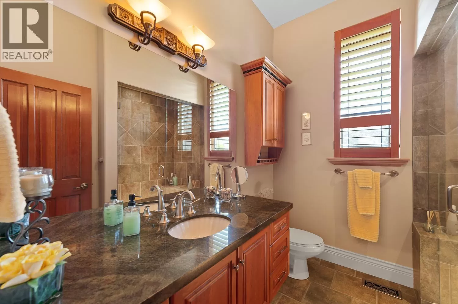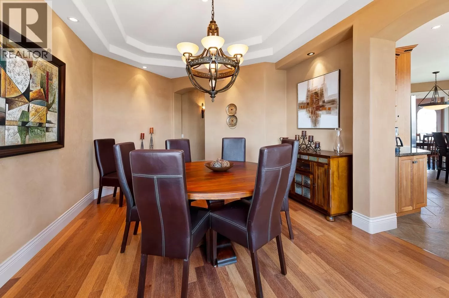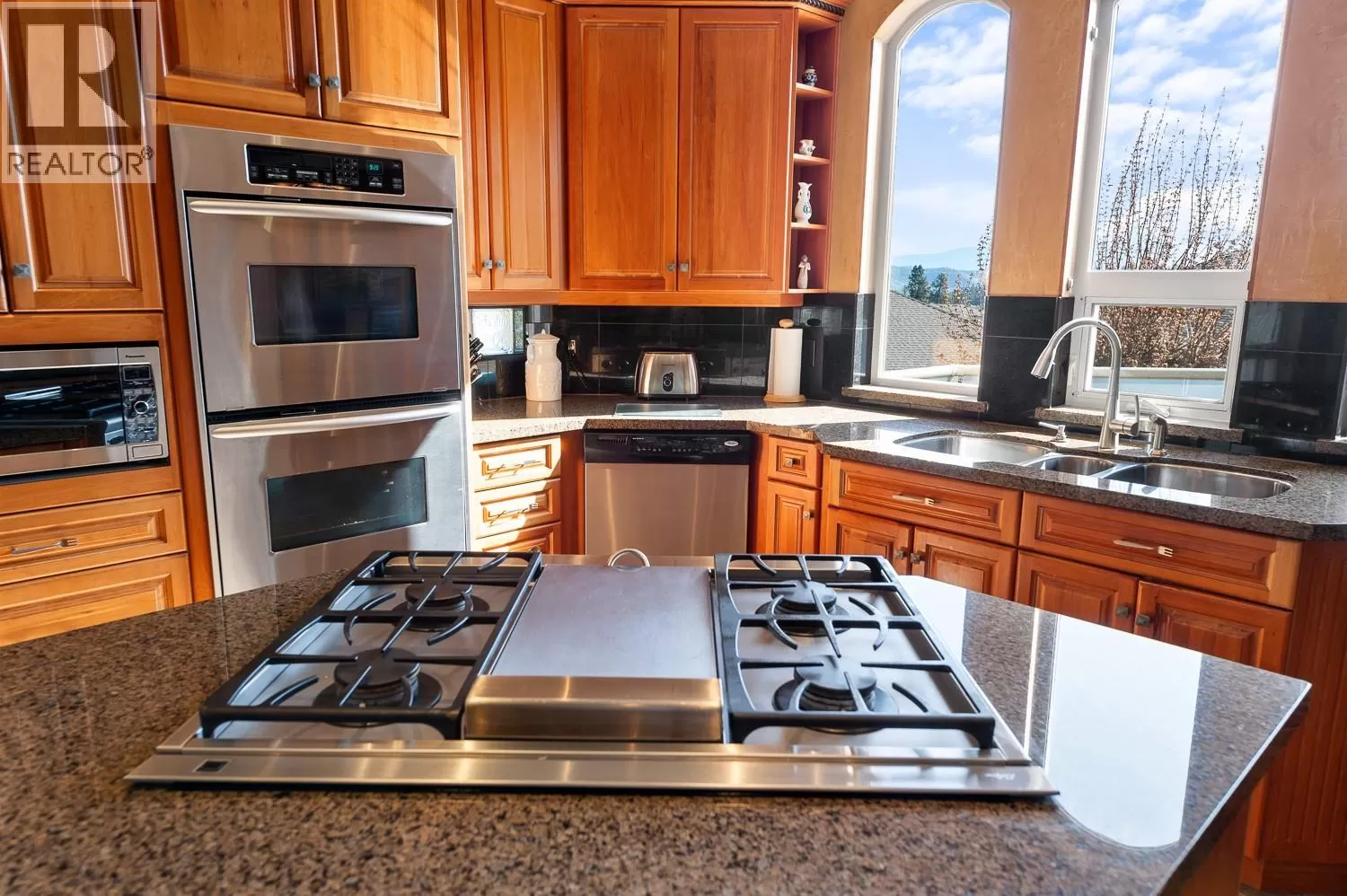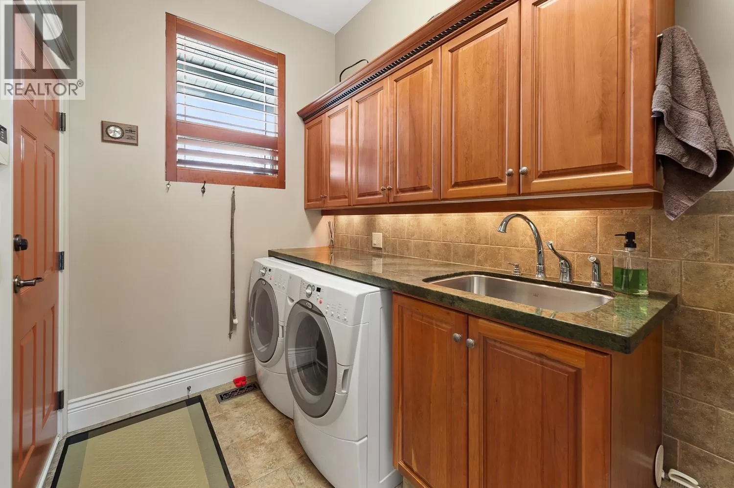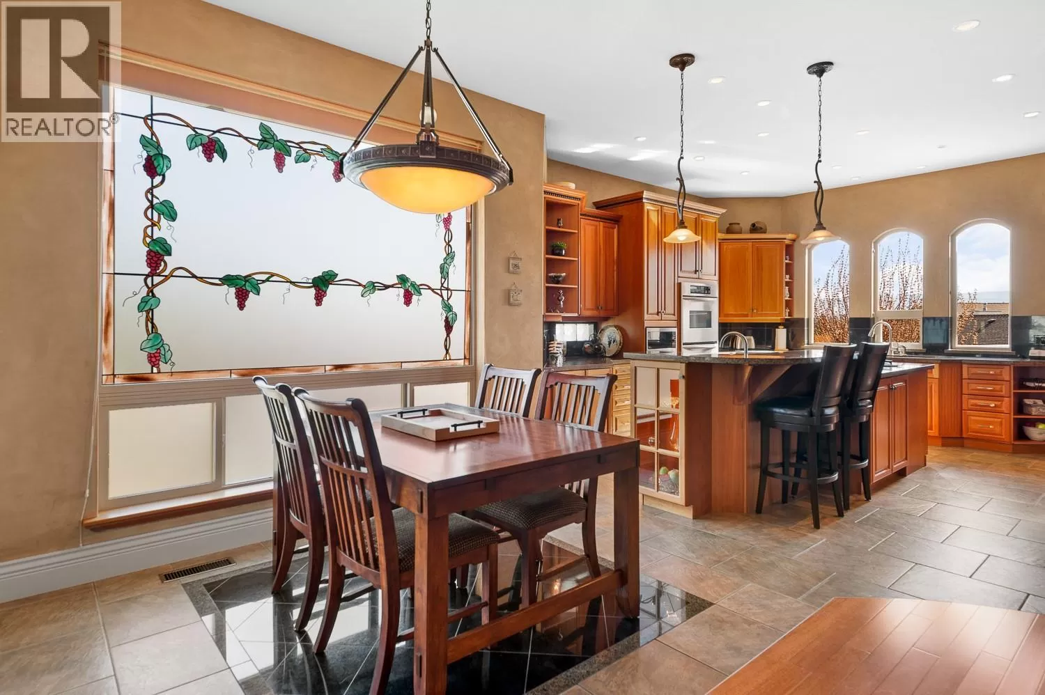 Discover unmatched luxury in this custom-built executive home by K West Builders, located within the exclusive gated community of Huntsfield Greenâjust minutes from downtown Kelowna. Situated on over 1/3 of an acre, this 5,389sqft. residence showcases exceptional craftsmanship, with vaulted ceilings, hardwood floors, American Clay finished walls, rich custom maple cabinetry, and so much more. Designed for both comfort and entertaining, it features a chefâs kitchen with double wall ovens, a gas cooktop, warming drawer plus a formal dining area and a mudroom complete with its own doggy bath. The primary suite is a spacious sanctuary offering serenity and elegance. On the lower level, enjoy 10-foot ceilings, a stunning custom wine room sure to impress any connoisseur, a fully equipped gym, a pool table area, and walkout access to beautiful outdoor living spaces. With retractable blinds and an overhead heater, the expansive upper deck offers year-round outdoor comfort while overlooking your beautifully landscaped yard. Additionally, youâll find three cozy fireplaces, a peekaboo lake view, and to complete the packageâa huge four-car garage with room for all your toys. This is unparalleled luxury with the ultimate in custom finishes, built exclusively for the original owner. (id:27476)