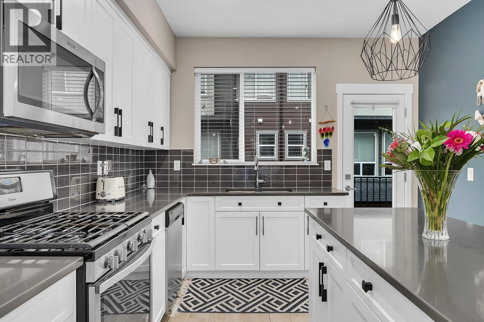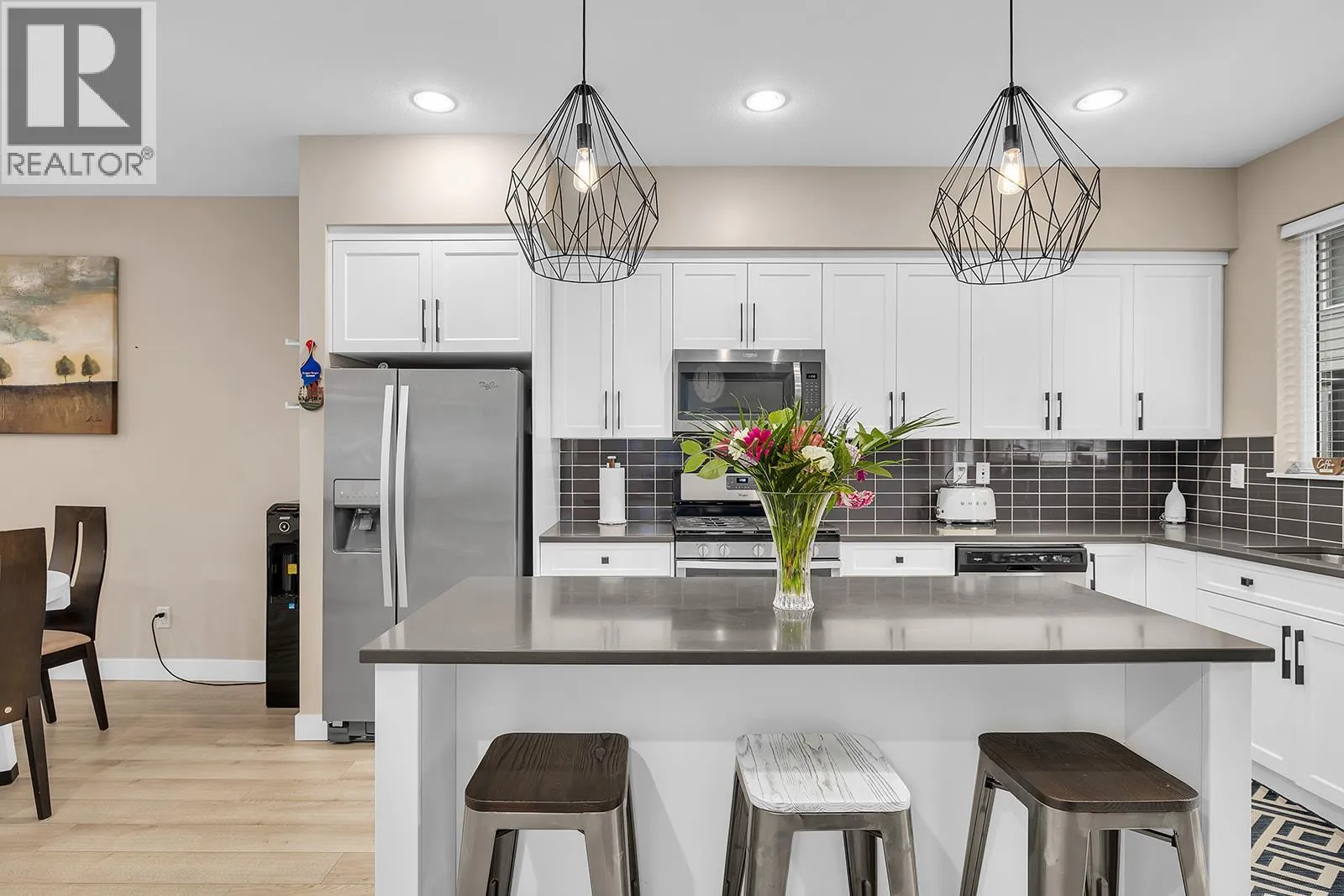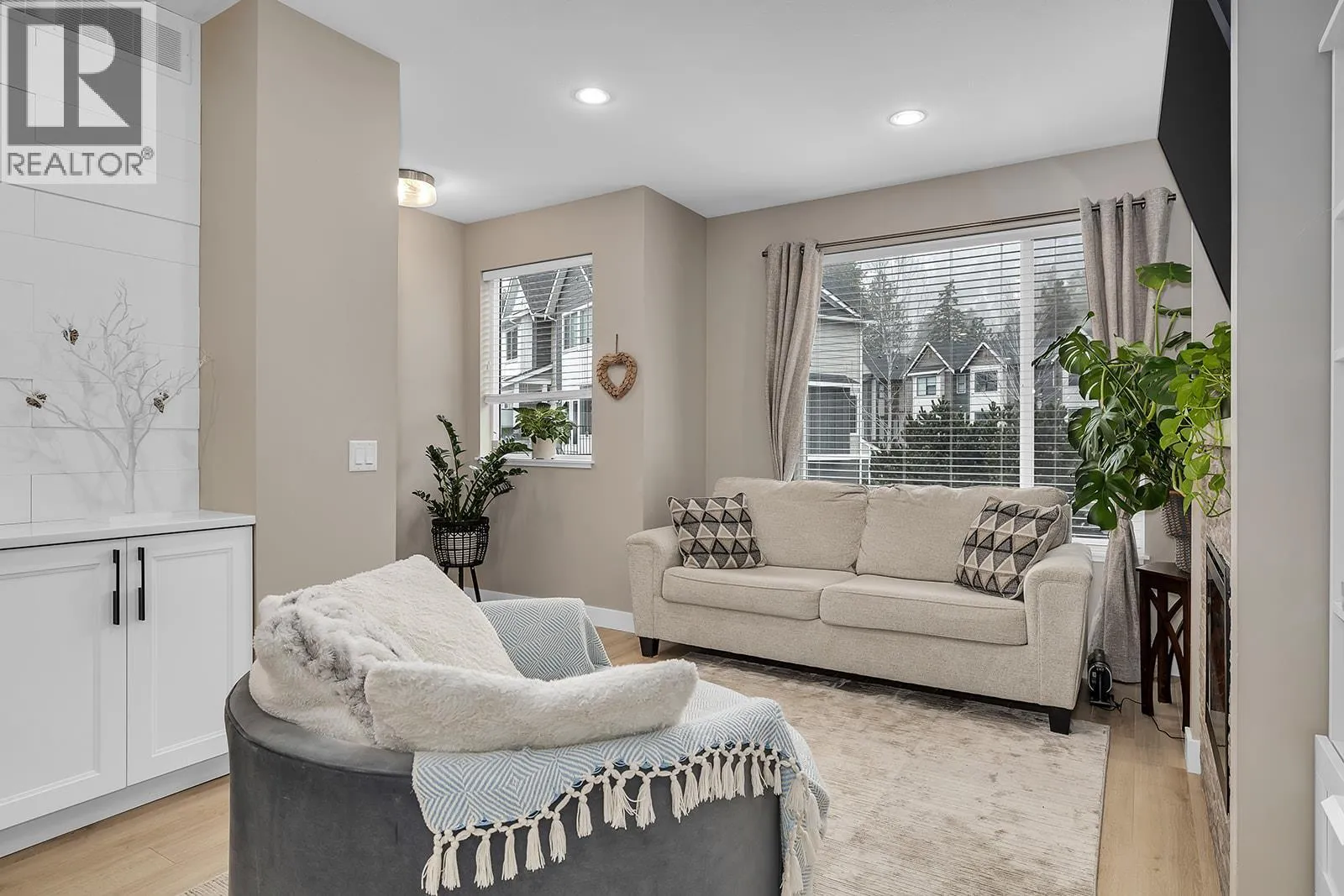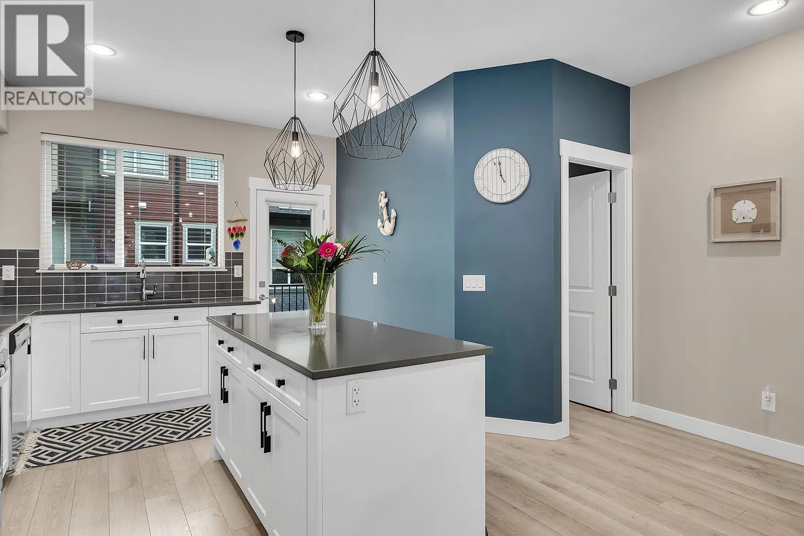 Immaculate 3 bedroom, 3 bath home with thoughtful upgrades throughout. Open concept kitchen and living area with 9' ceilings create a bright, inviting space. Kitchen features quartz countertops, stainless steel appliances, gas range, and soft-close cupboards. The dining area offers built-in cabinetry with a wine fridge, while the living room centers on an electric fireplace. Wide plank laminate flooring adds a modern, high-end feel. The lower level includes an oversized single car garage and a flexible room for an office or potential third bedroom. Upper level hosts a spacious primary suite with professionally redesigned walk-in closet and full ensuite with shower and quartz countertops. A second bedroom, full bathroom, and laundry complete this floor. Front fenced yard with pet-friendly allowance for 1 dog and 1 cat or 2 cats. Long term rentals permitted. Surrounded by Shannon Lake Golf Course with mountain views and access to hiking and biking trails. (id:27476)