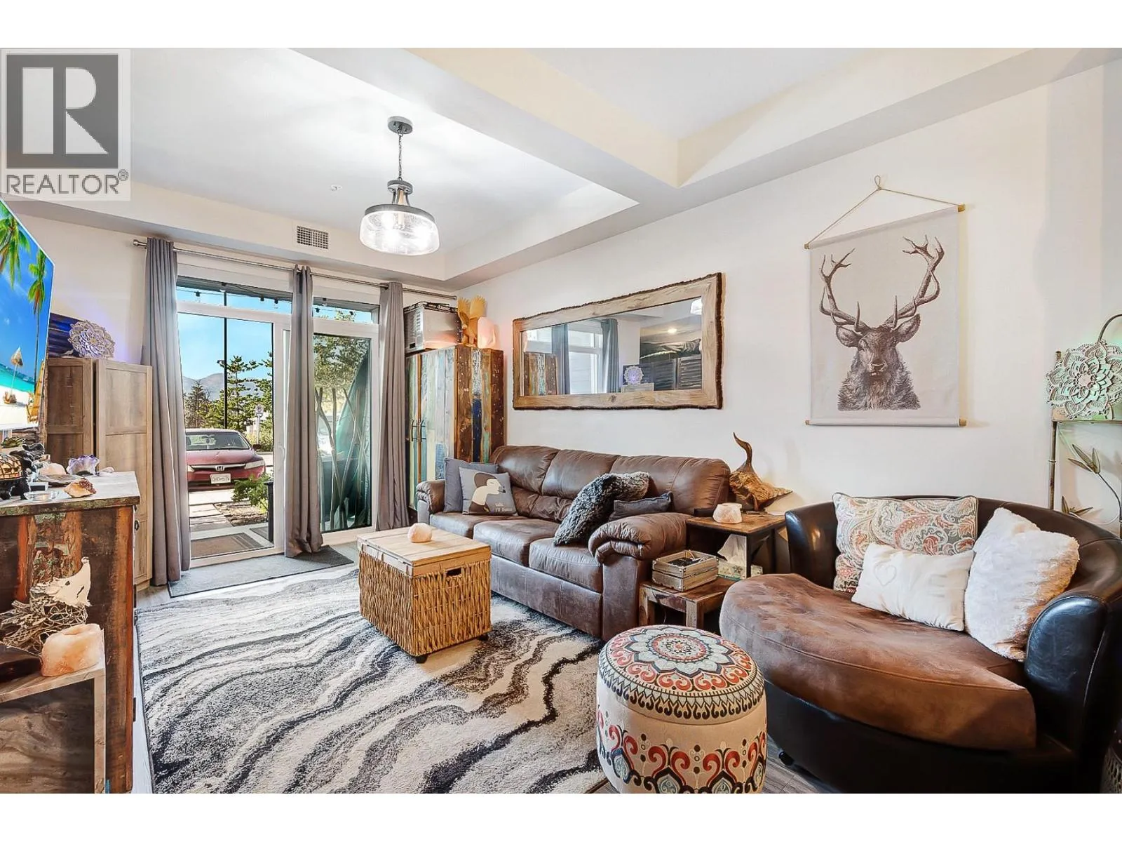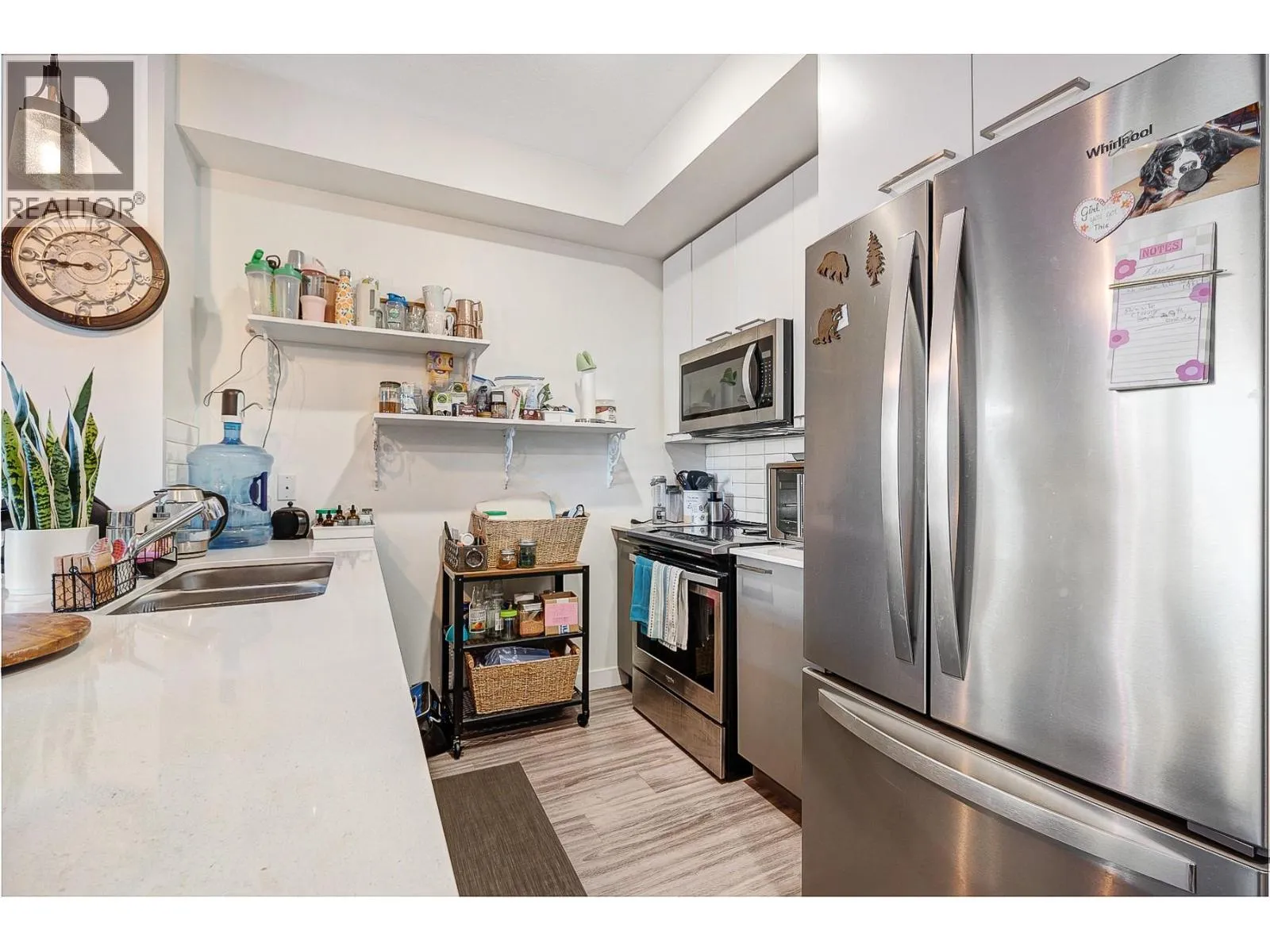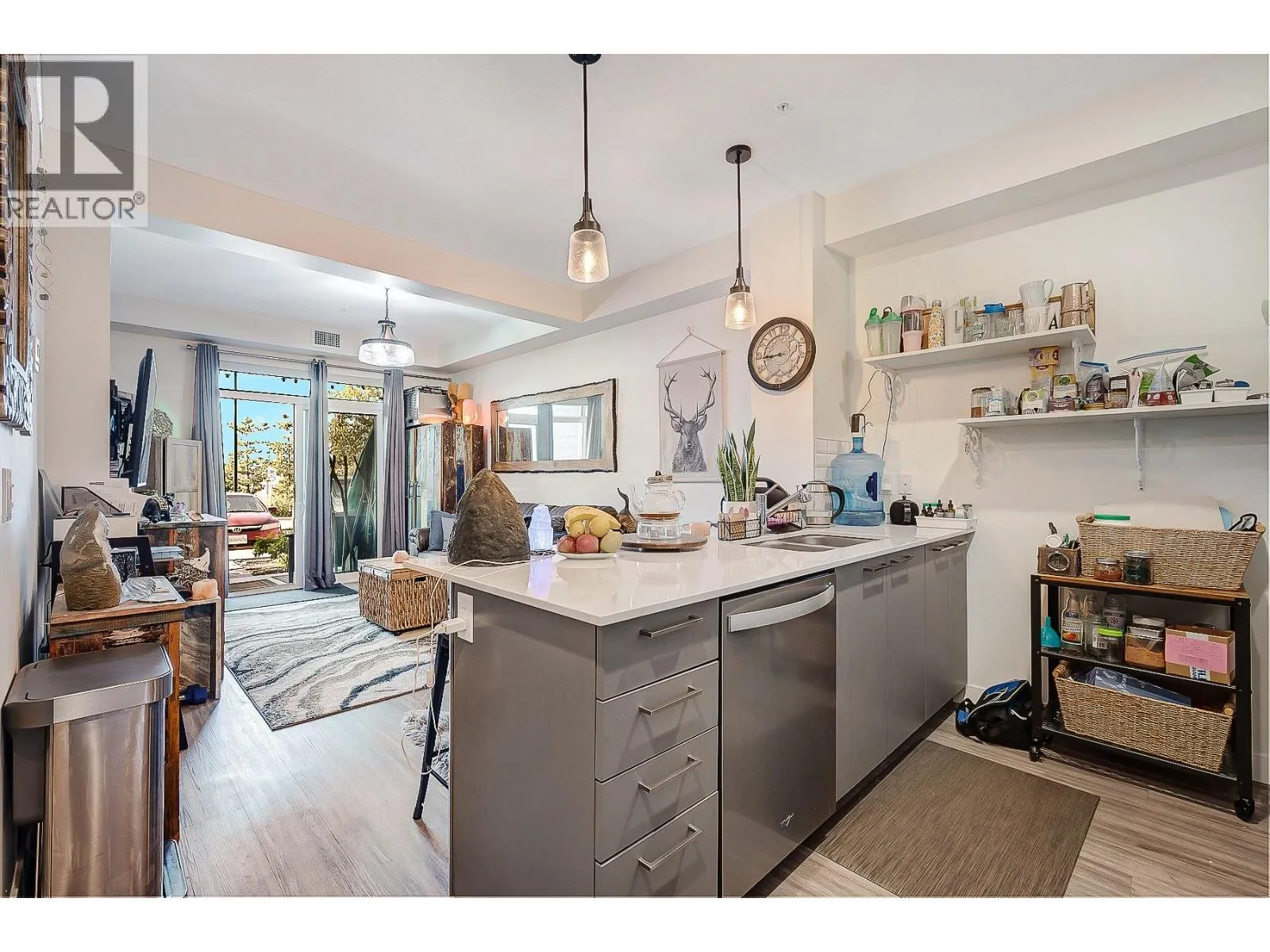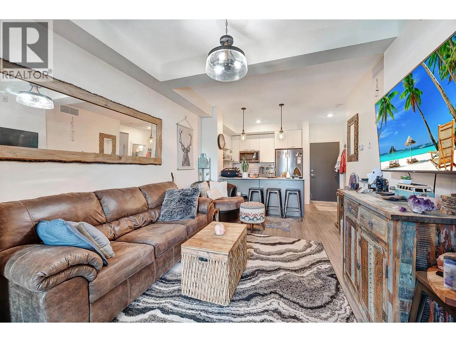 Ground Floor 1-Bedroom at NEO â Lake Views, Low Strata, Pet Friendly! Where lifestyle meets location, this ground floor 1-bedroom suite offers direct exterior access, beautiful lake and mountain views, low strata fees, and a pet-friendly policy with no size restrictionsâmaking it ideal for pet owners, first-time buyers, or investors. Step into a sleek, modern interior featuring a white-on-white kitchen with full-height cabinetry, subway tile backsplash, quartz countertops, stainless steel appliances, and bar seating. The open-concept living area is elevated with a stylish beam and chandelier, while glass patio doors flood the space with natural light and connect to your outdoor space. The spacious bedroom & 4-piece bathroom with vanity storage provide comfort and function. Durable laminate flooring runs throughout. The complex also borders a peaceful creekside walking path, perfect for morning strolls or dog walks. Enjoy incredible shared amenities, including a rooftop patio with BBQ and panoramic views, community gardens, and efficient building systems such as LED common lighting and recirculation lines for nearly instant hot water. Located just an 8-minute walk from Gellatly Bay Aquatic Park, with beaches, dog park, zipline, pier, and waterfront pathsâplus shopping, restaurants, and West Kelownaâs famous Wine Trail all nearby. This stylish, low-maintenance home is the perfect blend of lifestyle, location, and value! (id:27476)
