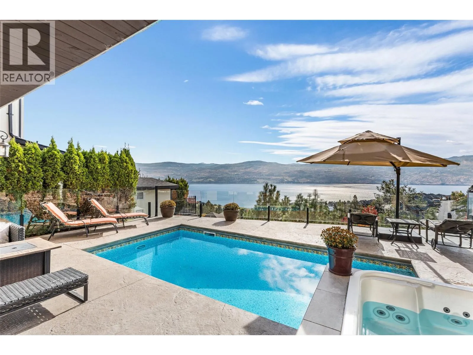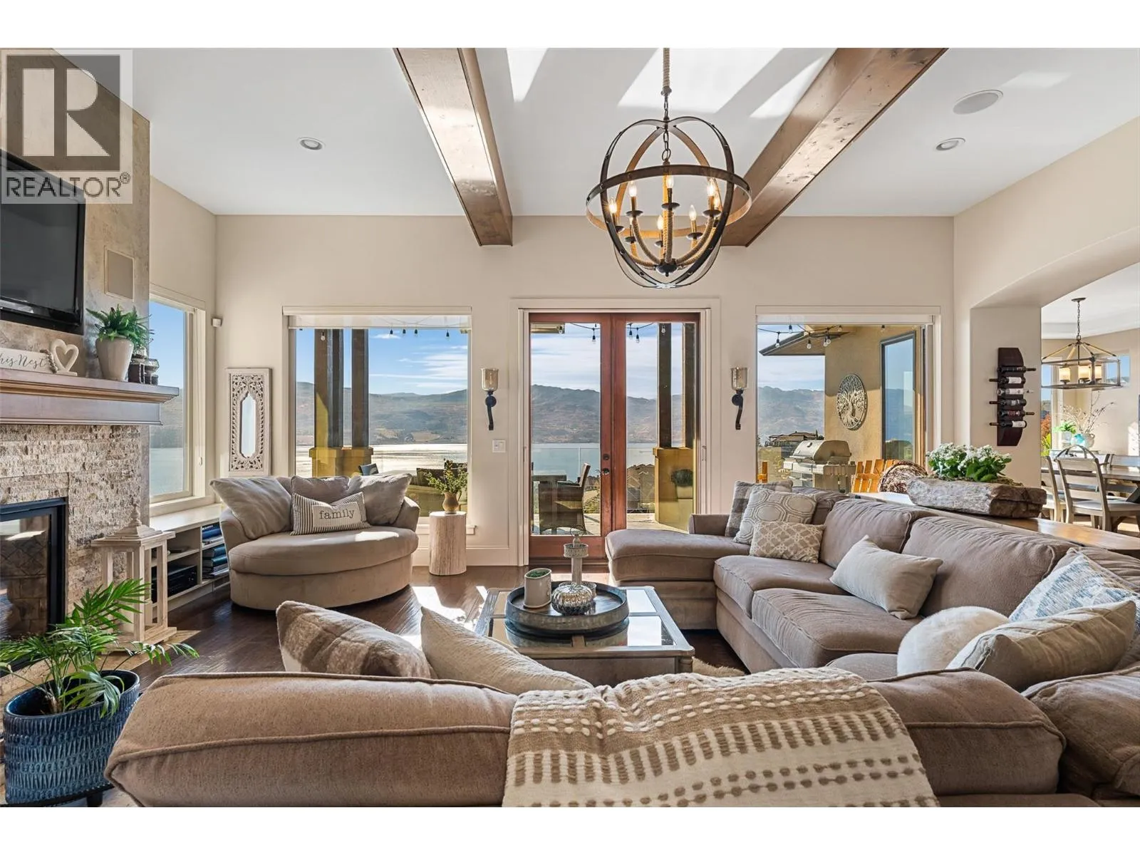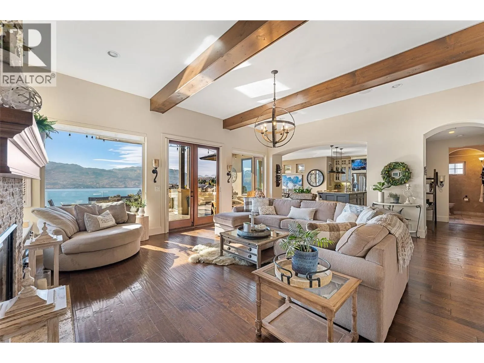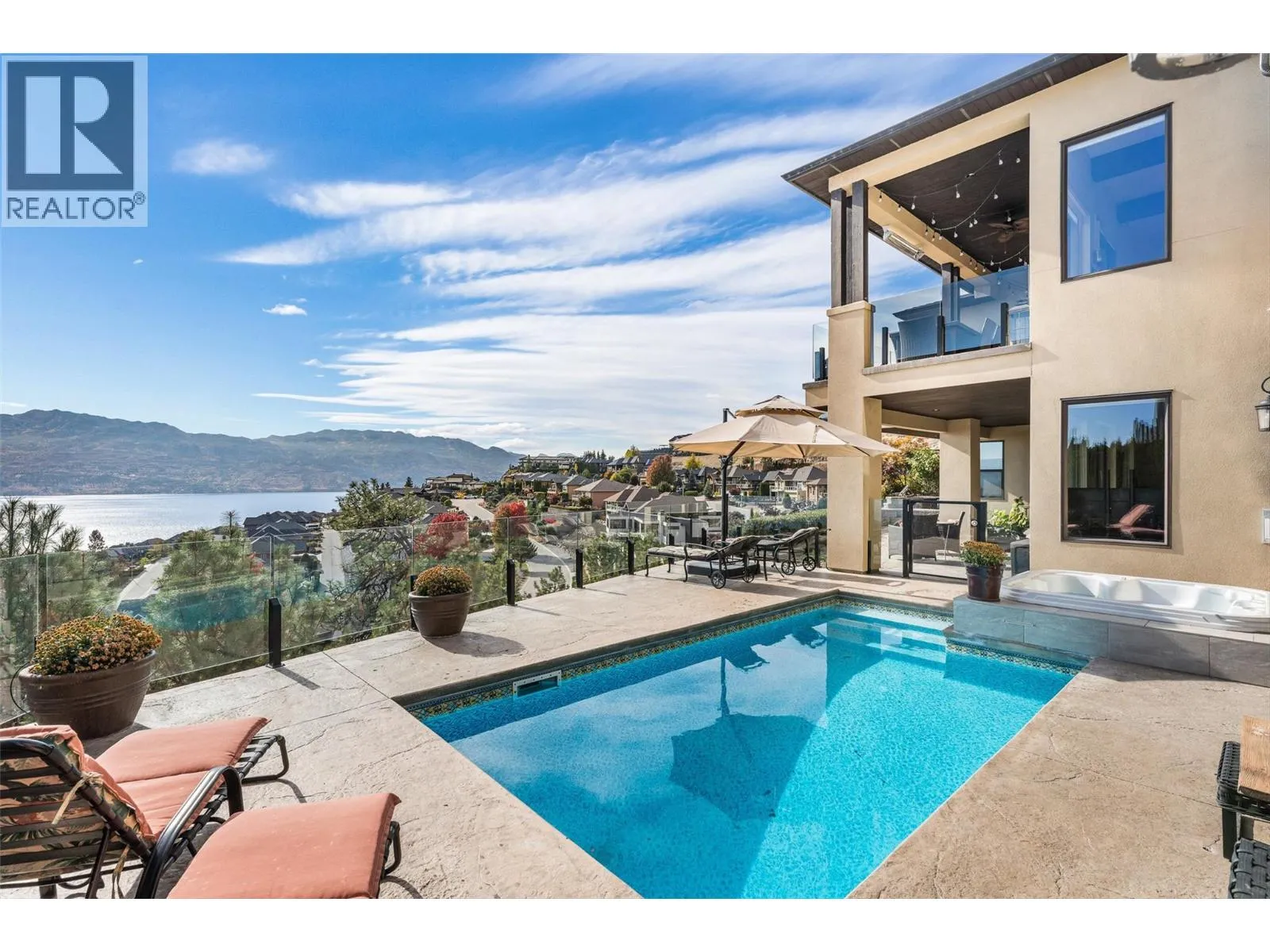Set in one of West Kelownaâs most coveted neighbourhoods, this home blends timeless design with sweeping views of Okanagan Lake. It features 4 bedrooms plus a self-contained studio suiteâideal for extended family or guests. Inside, soaring ceilings with timber beams, and stone accents create an atmosphere both warm and sophisticated. The open-concept great room flows seamlessly to a covered lakeview deck with wood-inlay ceilings, and infrared heatersâperfect for year-round enjoyment. This kitchen showcases hardwood floors, granite countertops, a contrasting island with seating, shaker-style cabinetry, and premium Bosch and Bertazzoni appliances, all connected to the living area. The entire upper level is dedicated to the primary suite, a private sanctuary offering two walk-in closets and a spa-inspired ensuite with heated travertine floors, a soaker tub, and walk-in shower. Step onto the covered balcony to take in panoramic lake and valley vistas. The lower level is designed for entertaining, complete with a bright recreation room, custom bar, and walkout access to the pool terrace. Outdoors, relax beside the pool, soak in the hot tub, or gather around the firepit, all framed by manicured landscaping and tranquil water features. Oversized double garage, abundant storage, and a tiled dog wash. Every detail has been carefully considered, creating a residence that balances refined design, modern comfort, and the unmatched lifestyle of Lakeview Heights. (id:27476)