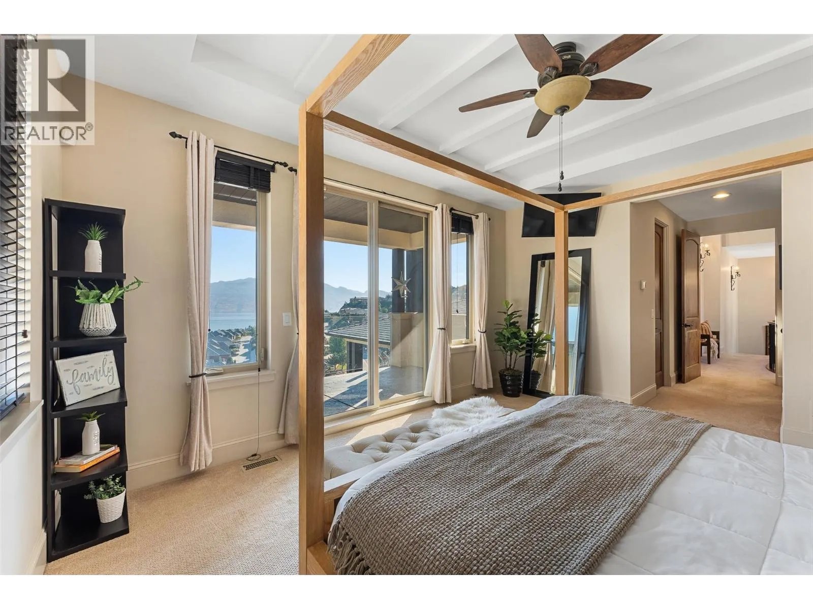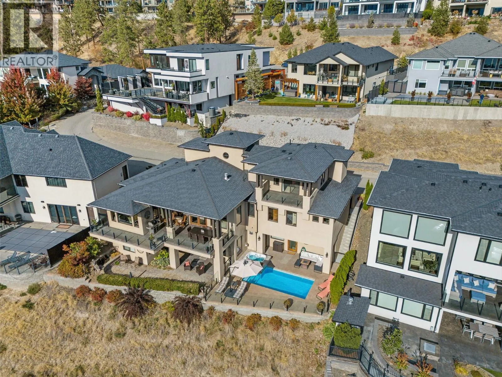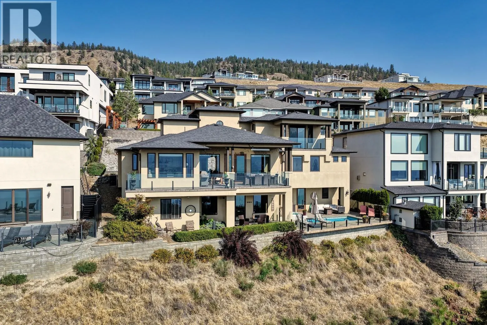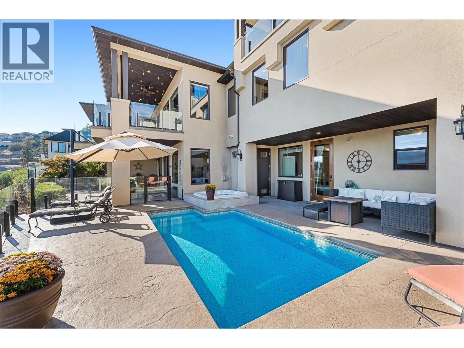 Set in one of West Kelownaâs most coveted neighbourhoods, this home blends timeless design with sweeping views of Okanagan Lake. It features 4 bedrooms plus a self-contained studio suiteâideal for extended family or guests. Inside, soaring ceilings with timber beams, and stone accents create an atmosphere both warm and sophisticated. The open-concept great room flows seamlessly to a covered lakeview deck with wood-inlay ceilings, and infrared heatersâperfect for year-round enjoyment. This kitchen showcases hardwood floors, granite countertops, a contrasting island with seating, shaker-style cabinetry, and premium Bosch and Bertazzoni appliances, all connected to the living area. The entire upper level is dedicated to the primary suite, a private sanctuary offering two walk-in closets and a spa-inspired ensuite with heated travertine floors, a soaker tub, and walk-in shower. Step onto the covered balcony to take in panoramic lake and valley vistas. The lower level is designed for entertaining, complete with a bright recreation room, custom bar, and walkout access to the pool terrace. Outdoors, relax beside the pool, soak in the hot tub, or gather around the firepit, all framed by manicured landscaping and tranquil water features. Oversized double garage, abundant storage, and a tiled dog wash. Every detail has been carefully considered, creating a residence that balances refined design, modern comfort, and the unmatched lifestyle of Lakeview Heights. (id:27476)