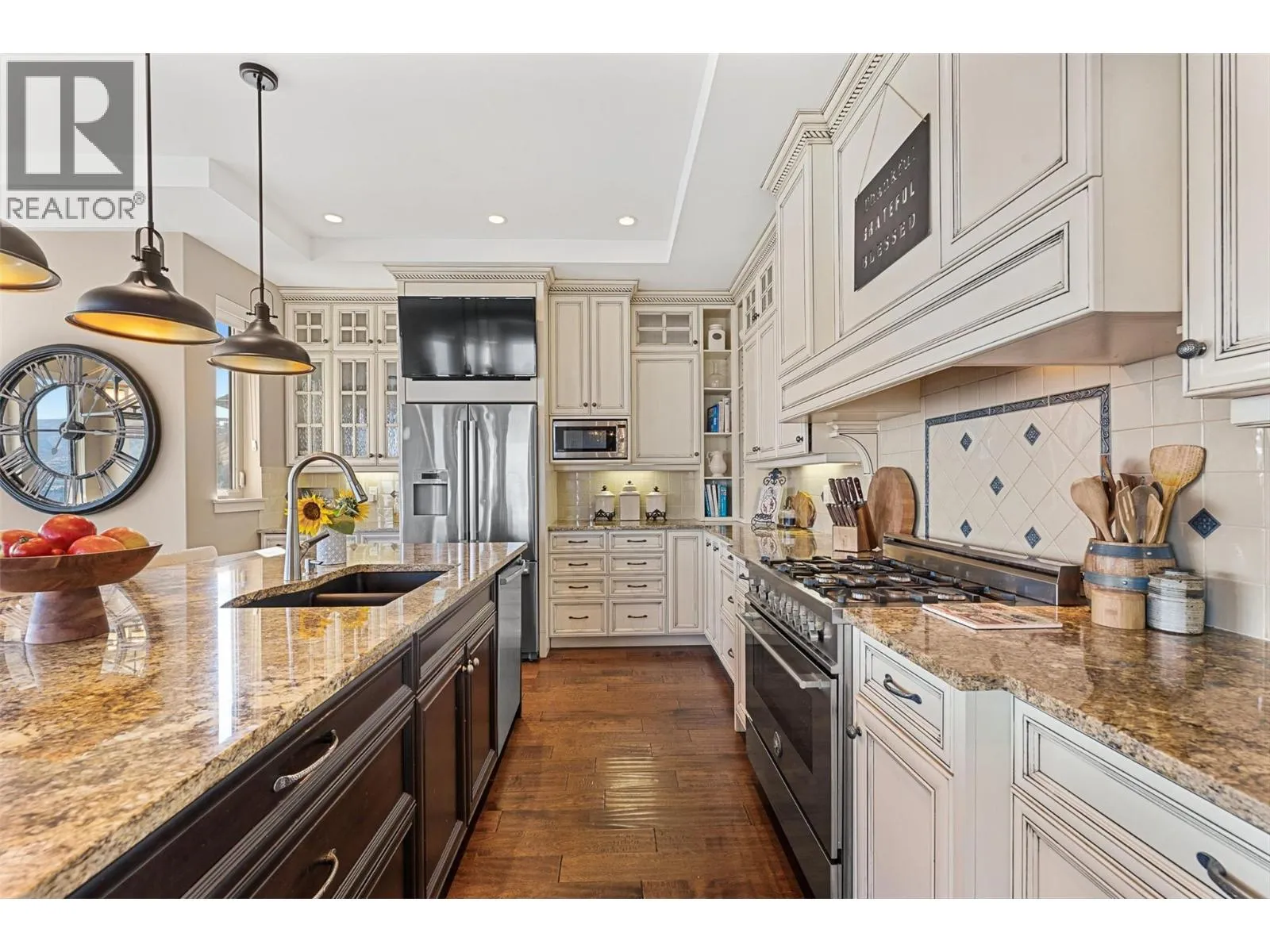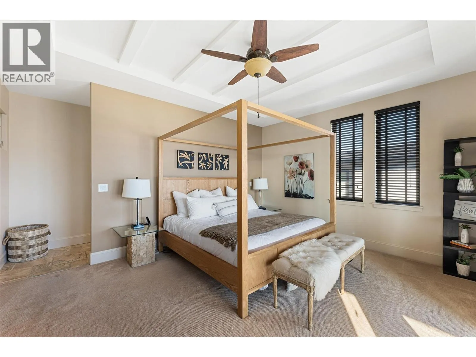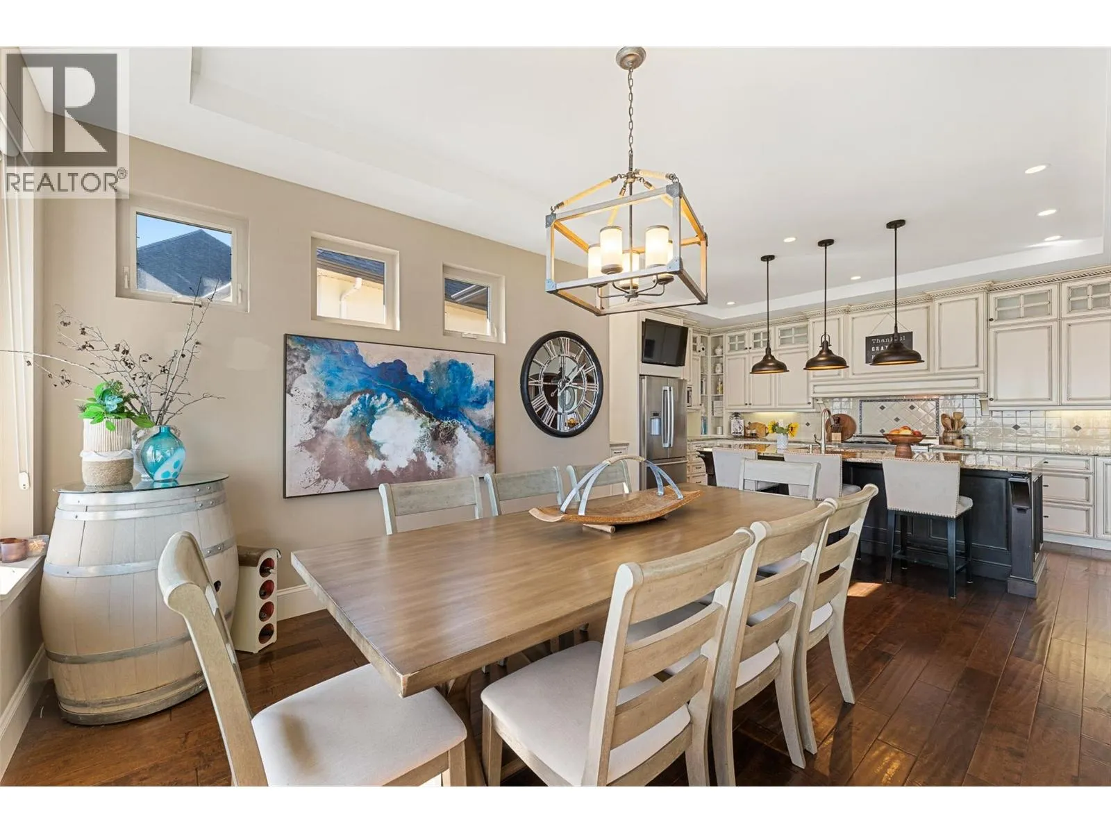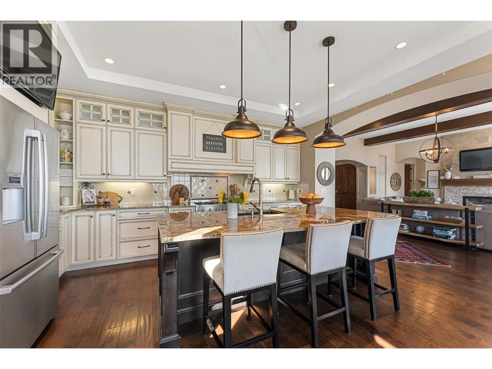 Set in one of West Kelownaâs most coveted neighbourhoods, this home blends timeless design with sweeping views of Okanagan Lake. It features 4 bedrooms plus a self-contained studio suiteâideal for extended family or guests. Inside, soaring ceilings with timber beams, and stone accents create an atmosphere both warm and sophisticated. The open-concept great room flows seamlessly to a covered lakeview deck with wood-inlay ceilings, and infrared heatersâperfect for year-round enjoyment. This kitchen showcases hardwood floors, granite countertops, a contrasting island with seating, shaker-style cabinetry, and premium Bosch and Bertazzoni appliances, all connected to the living area. The entire upper level is dedicated to the primary suite, a private sanctuary offering two walk-in closets and a spa-inspired ensuite with heated travertine floors, a soaker tub, and walk-in shower. Step onto the covered balcony to take in panoramic lake and valley vistas. The lower level is designed for entertaining, complete with a bright recreation room, custom bar, and walkout access to the pool terrace. Outdoors, relax beside the pool, soak in the hot tub, or gather around the firepit, all framed by manicured landscaping and tranquil water features. Oversized double garage, abundant storage, and a tiled dog wash. Every detail has been carefully considered, creating a residence that balances refined design, modern comfort, and the unmatched lifestyle of Lakeview Heights. (id:27476)