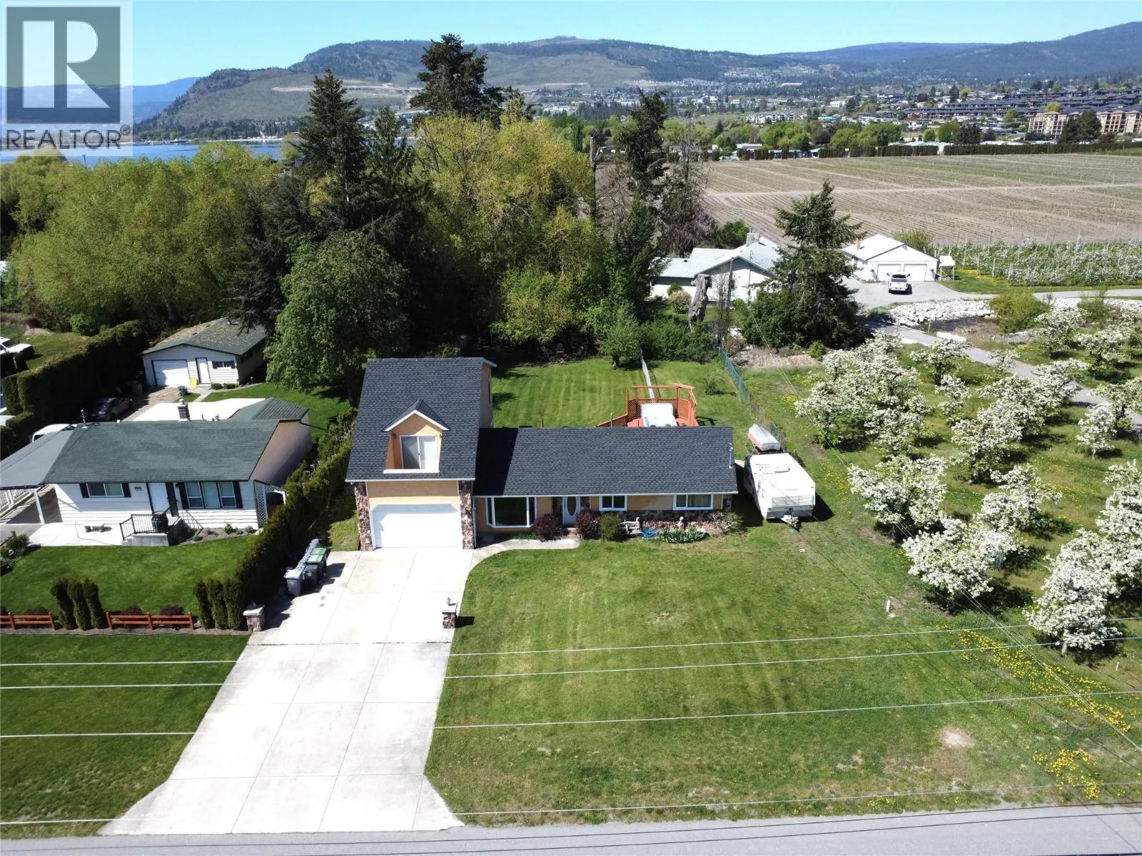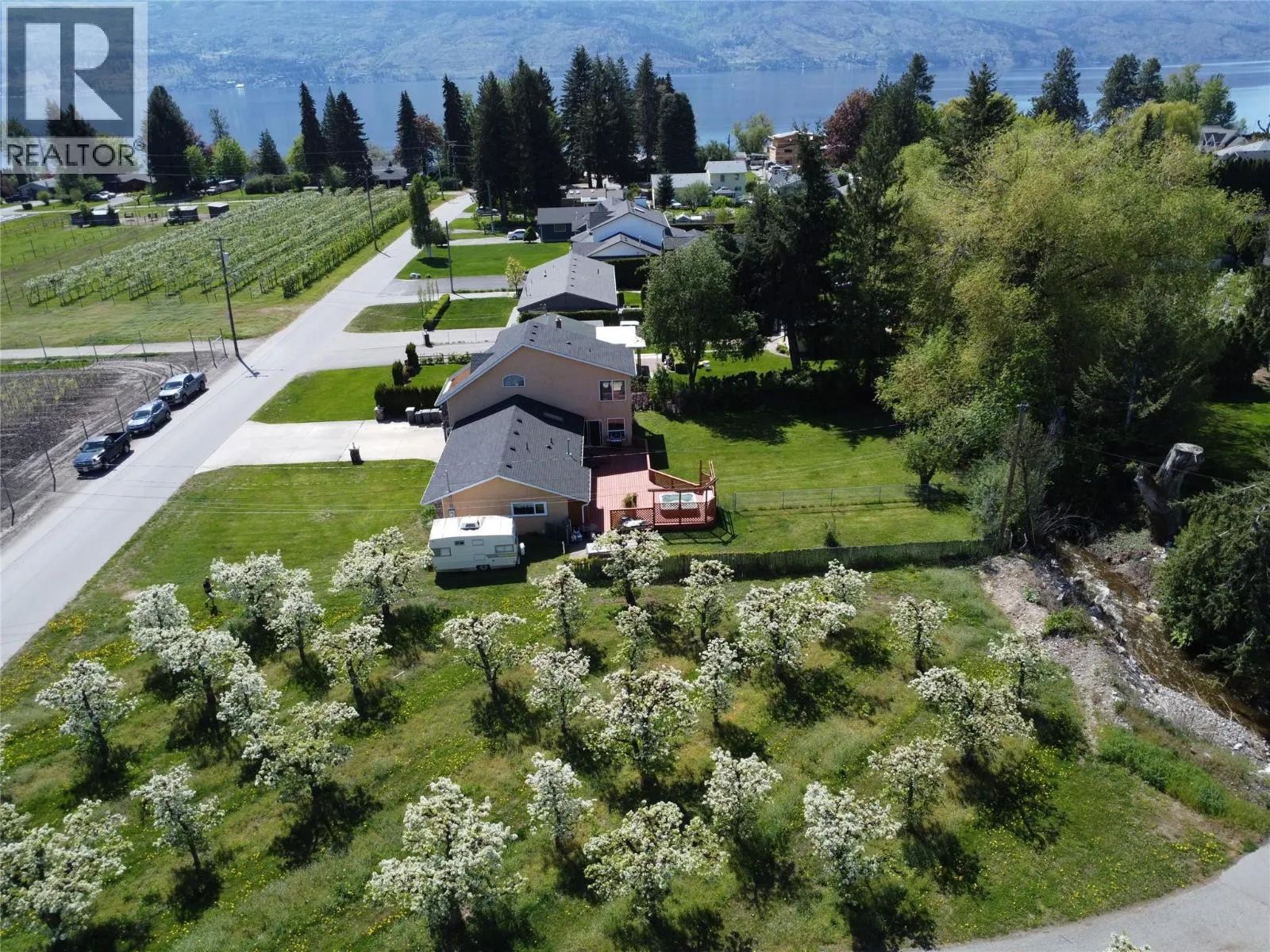 Country Living Just Steps from the Lake Tucked into a one of the area's most coveted streets, 3982 Hitchner Road offers the rare blend of space, privacy, and walkable lake access. This 0.3-acre property backs onto a peaceful creek and is surrounded by orchards, yet it's just one block from two sandy beaches and minutes from town. The 2,026 sq ft home features 3 bedrooms plus a den, 2 full bathrooms, and a flexible layout with potential to add a fourth bedroom. The spacious primary suite includes two private balconies overlooking separate orchards. The main level offers a warm, country-style kitchen with hickory cabinets, a bright living area with views of mature trees, and a cozy den that opens to the backyard. Upgrades include a new roof, high-efficiency furnace and A/C, water softener, private and shared water licenses, and city sewer connection. Downstairs offers 386 sq ft of bonus space with a separate entrance, ideal for a home office, studio, or suite. Outside, enjoy a large deck, hot tub under the trees, and an oversized garage with parking for five or more vehicles, including space for RV and boat. Hitchner Road is known for its rural charm, large lots, and close-knit community. Homes here are tightly held and rarely available, this is a well-maintained property with space to grow and make it your own. (id:27476)