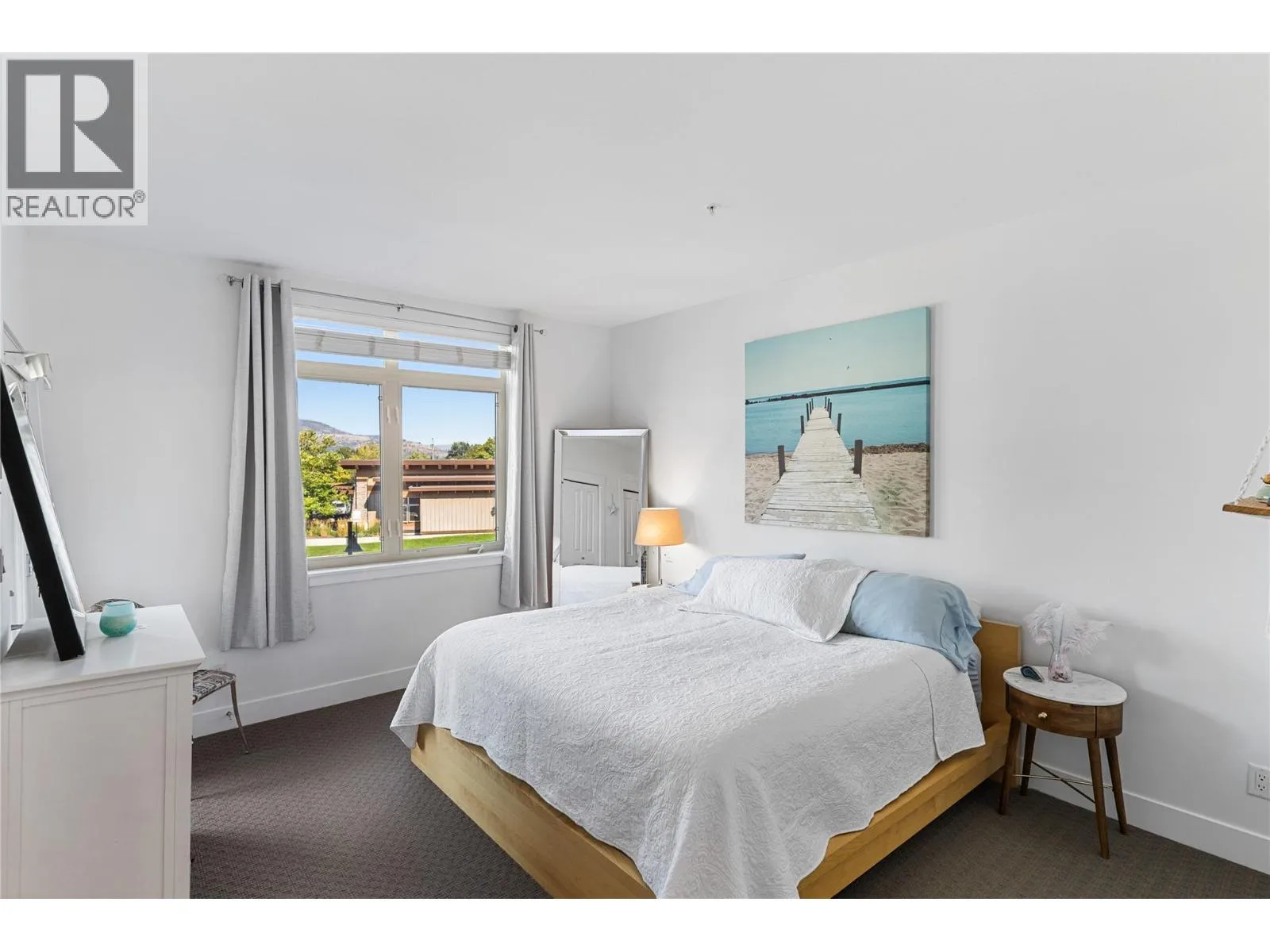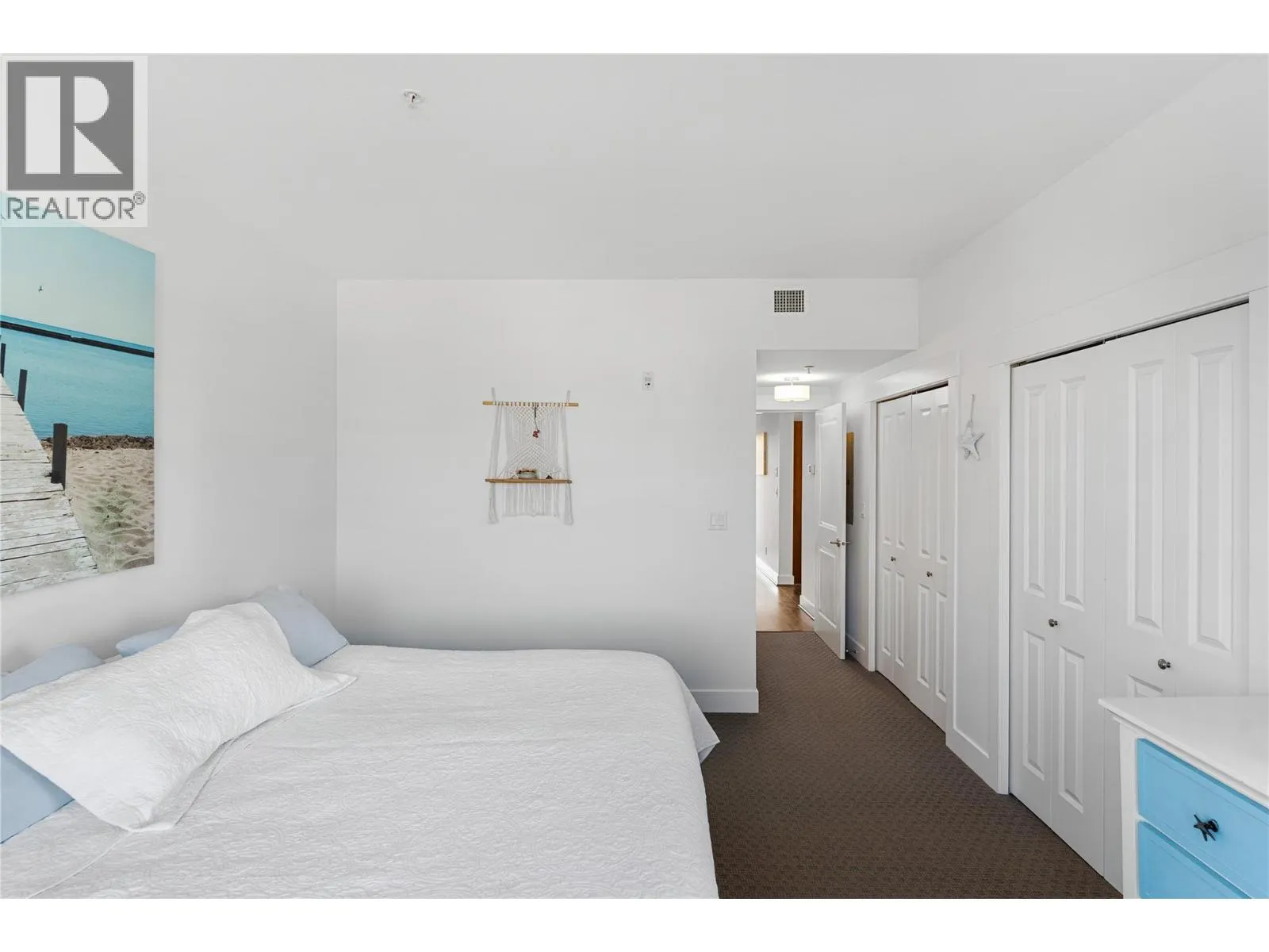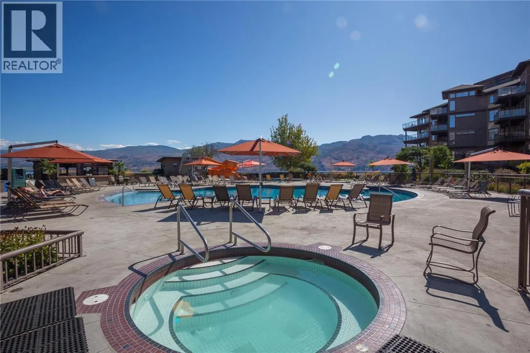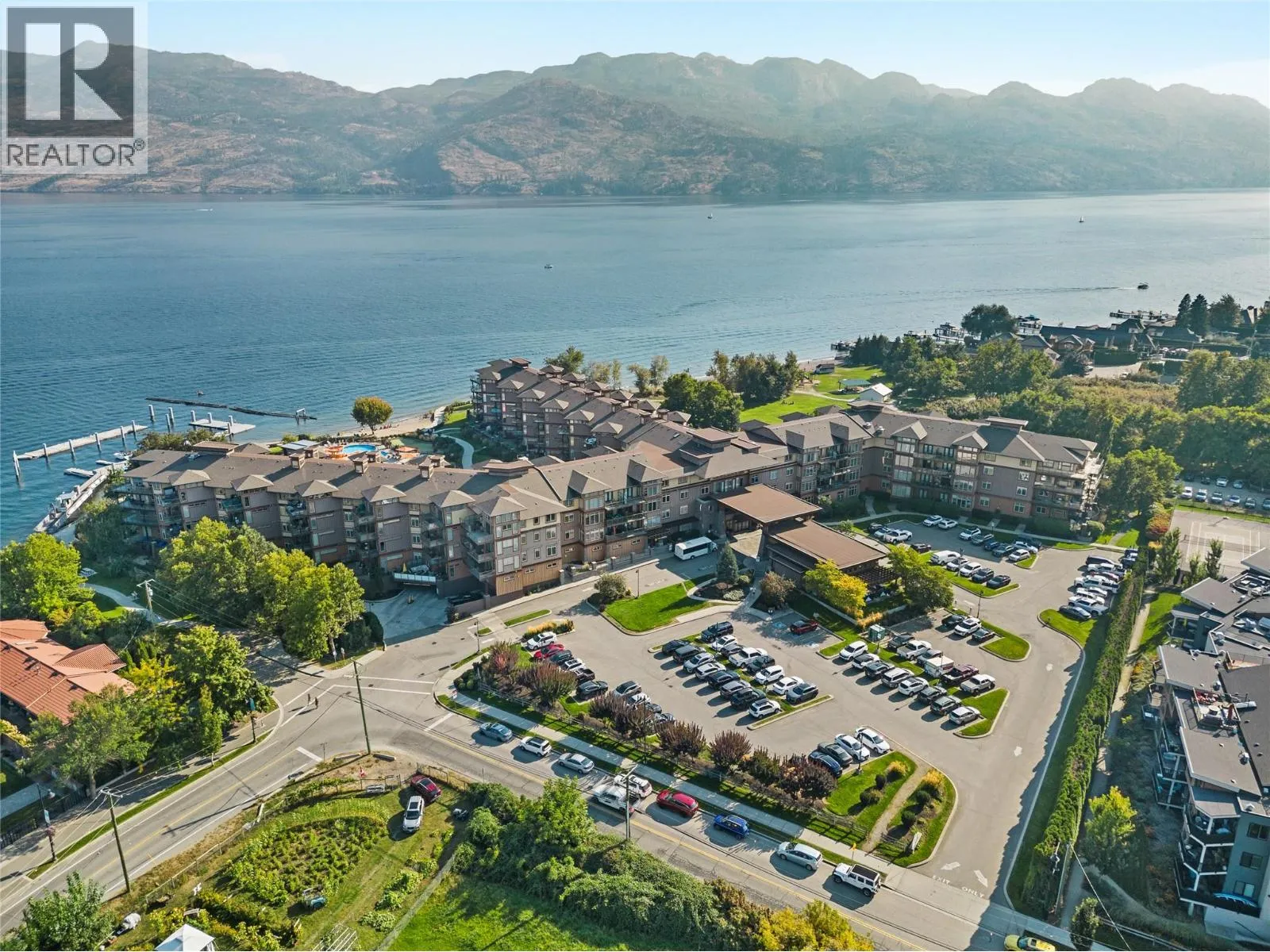 Lakeside Luxury at The Cove â Massive Wraparound Balcony! This rare corner/end suite at The Cove Lakeside Resort offers the perfect blend of comfort and lifestyle with a massive 730 sq ft wraparound covered balconyâone of the largest at the resort! Enjoy peek-a-boo lake views, serene park-side tranquility, and exposures in all directions (E/N/S/W), making this a truly special space to relax and entertain. The intelligently designed floor plan features 3 bedrooms and 3 full bathrooms, including two primary suites with ensuites, plus a guest bedroom and full bath. The âUâ-shaped kitchen with bar seating flows into the dining, family, and living areas, flooded with natural light from expansive windows. The living room boasts a stylish âDon Quixoteâ feature wall, while the cozy family room offers peaceful park views. Extras include an independent laundry/storage room, three lock-off closets, and 3 balcony access points. Whether you're looking for a full-time residence, vacation home, or a profitable rental, this suite offers it all. Enjoy resort-style amenities: outdoor pool, 2 hot tubs, putting green, tennis court, gym, theatre, restaurant/bar, marina, and 600' of Okanagan Lake waterfront on 6.5 acres. Don't miss this opportunity to own one of The Cove's finest suites! (id:27476)