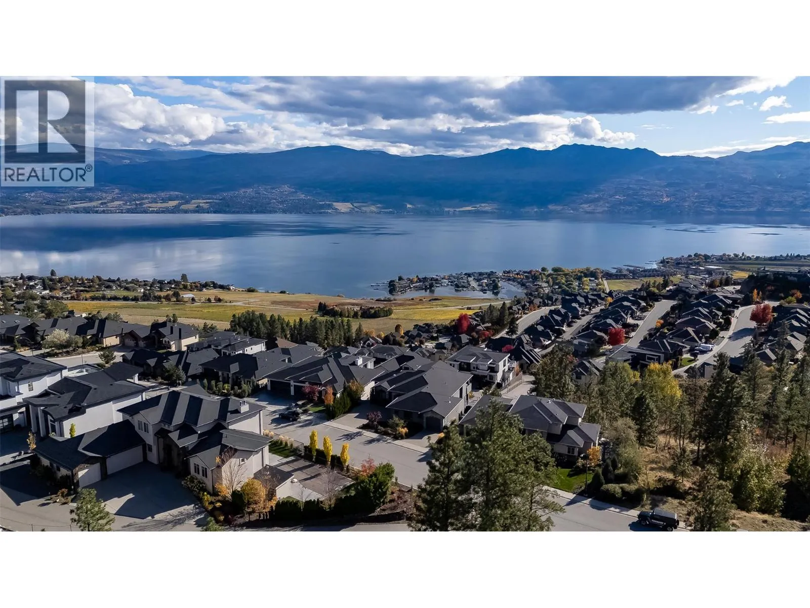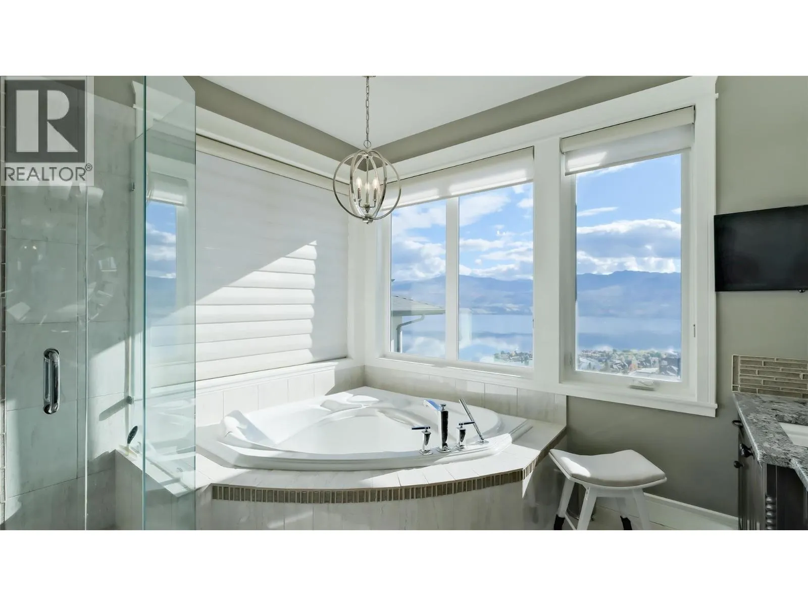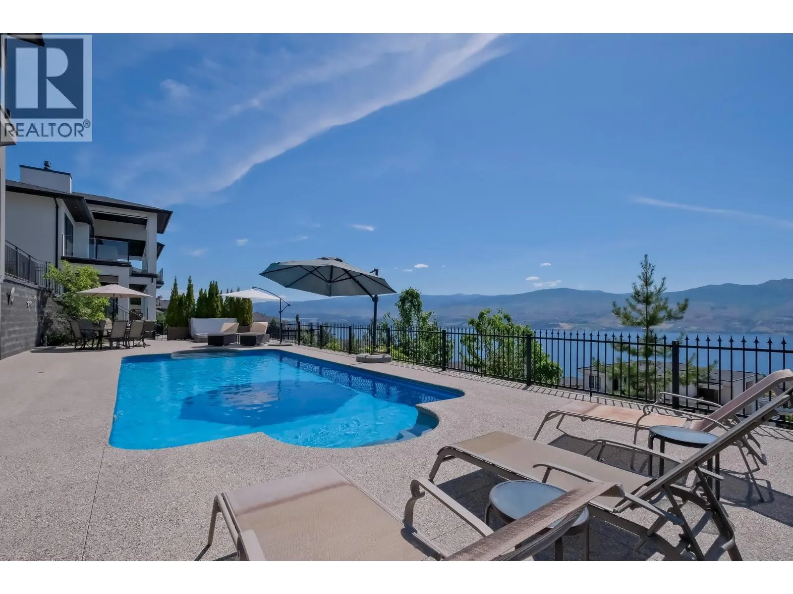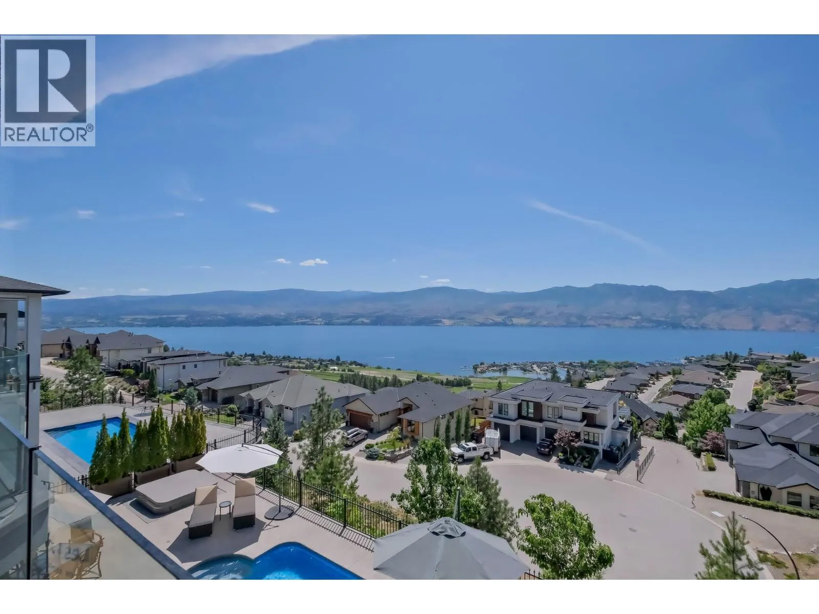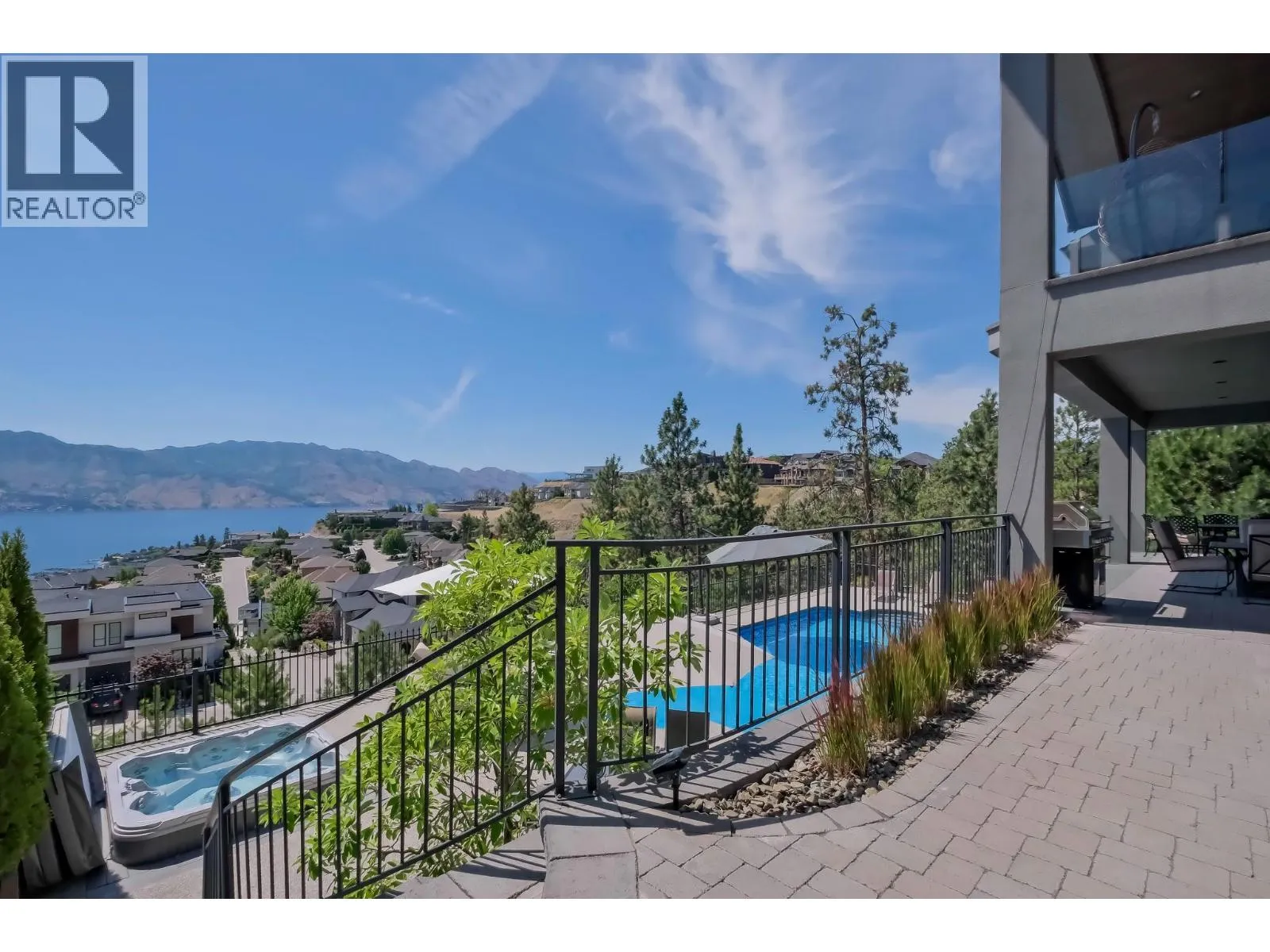 Exceptional 5 bed, 4 bath executive home is nestled in the prestigious Vineyard Estates with panoramic views of Okanagan Lake, mountains, and vineyards. Open-concept main level combines comfort and elegance, featuring 11' ceilings, maple hardwood, and custom curved windows that flood the space with natural light. The main level primary bedroom, complete with a spa-like ensuite, heated floors, motion-sensor lighting is conveniently located alongside a spacious office (or second bedroom). Well appointed kitchen showcases custom cabinetry, a Bertazzoni gas stove, Miele double steam oven, and dishwasher. A butlerâs pantry with a second dishwasher and fridge, a designated laundry room, and a stamped concrete covered deck enhance the homeâs thoughtful design. The bright, walkout lower level offers full lake views, 3 generously sized bedrooms, 2 full baths (including one with a separate entrance to the pool deck), a wet bar with a third dishwasher and fridge, a second washer/dryer, a large family room and a media room. Additionally, there is a heated workshop with its own entrance, perfect for hobbyists. Enjoy your own private oasis with an inground pool, hot tub, and an expansive pool deck with ample storage. The property features cherry trees, grapevines, and sits adjacent to a greenbelt for added privacy. The triple pull-through gas-heated garage and flat driveway ensure easy parking. Full lake views from every level of this stunning home! (id:27476)