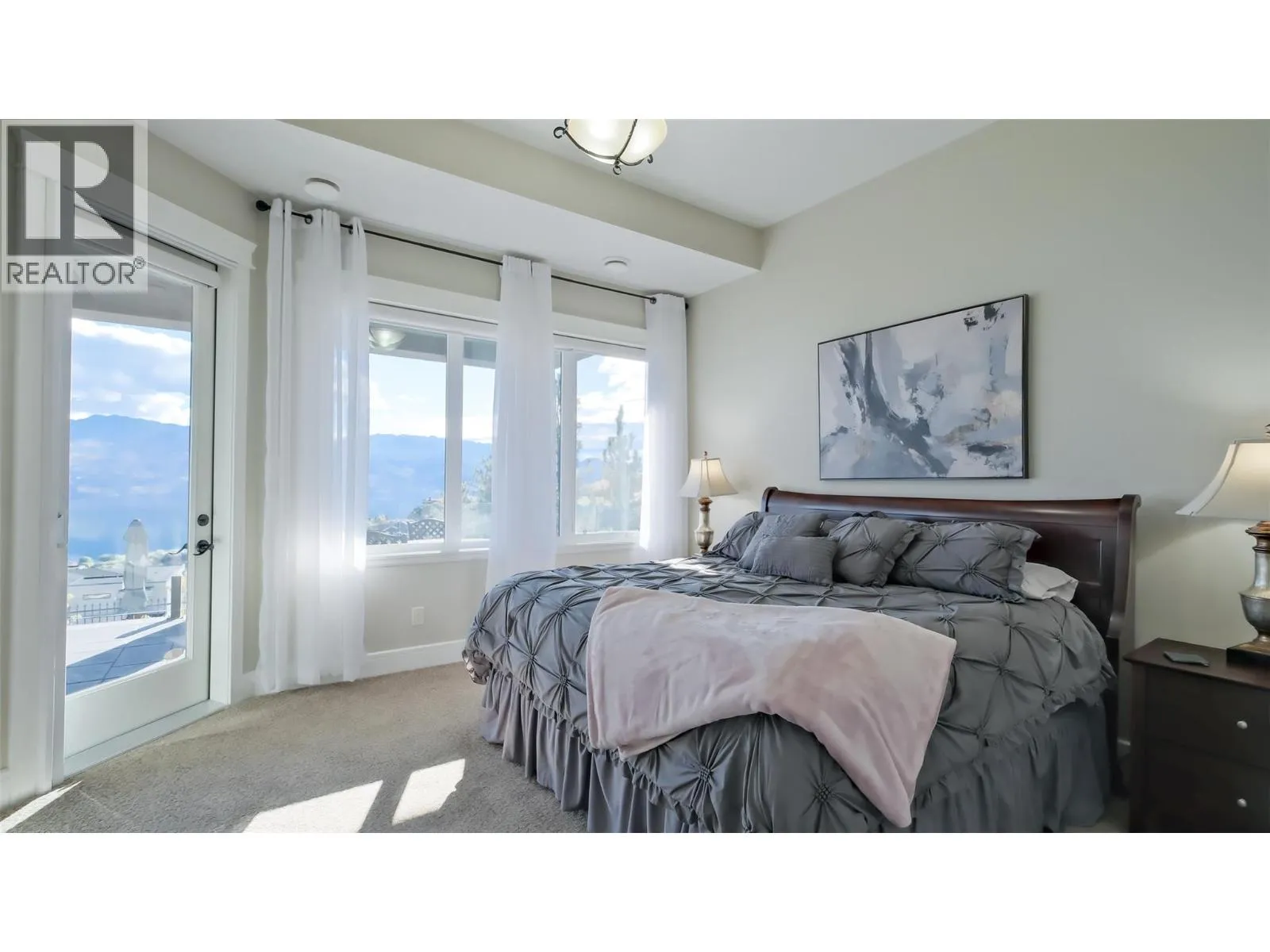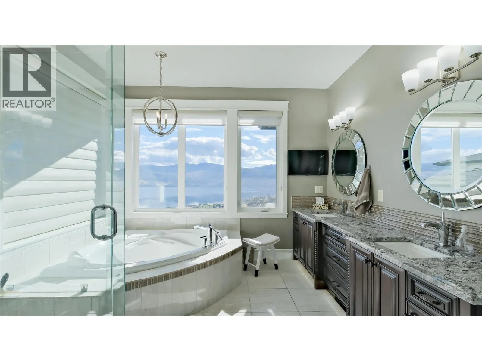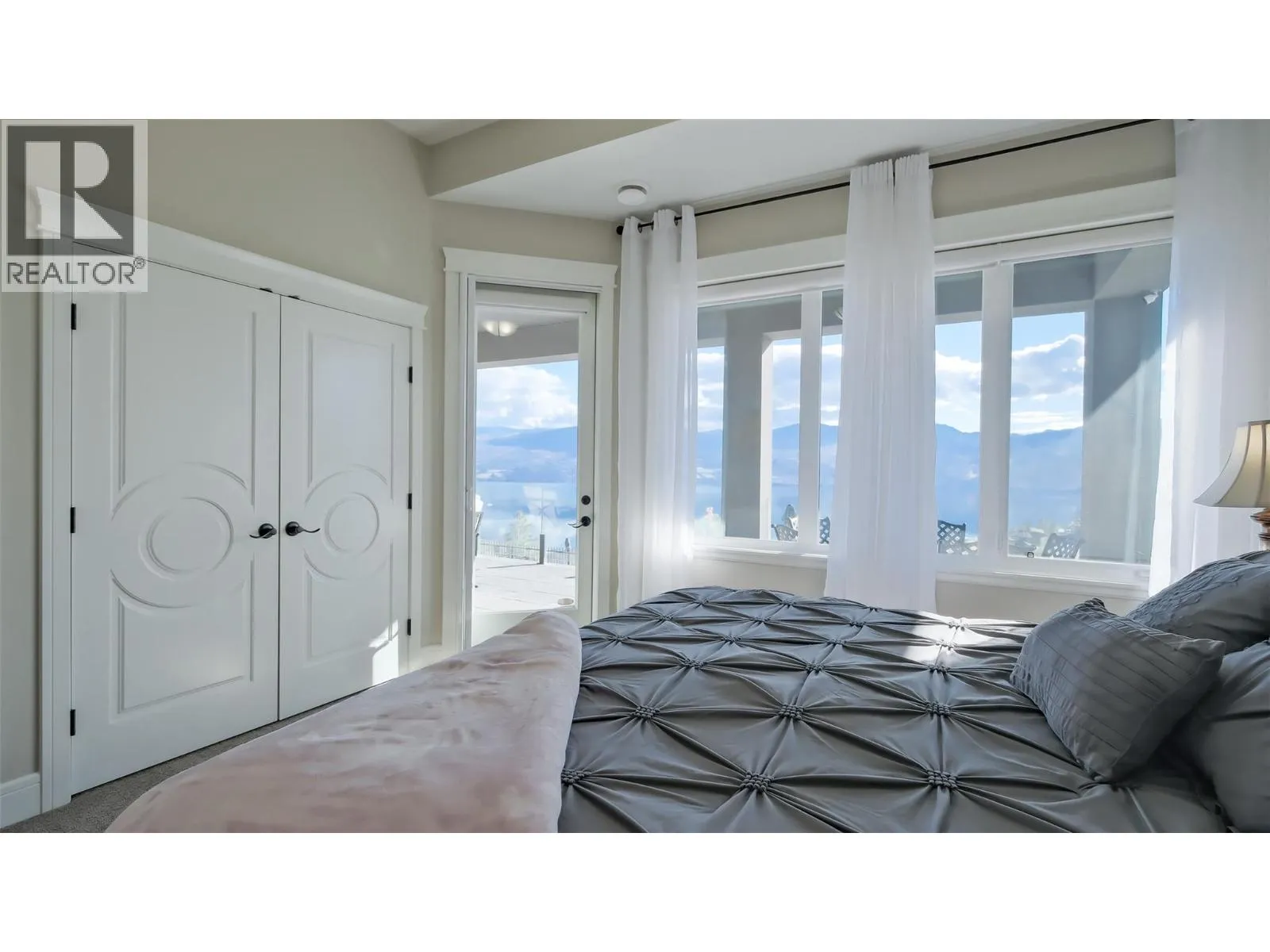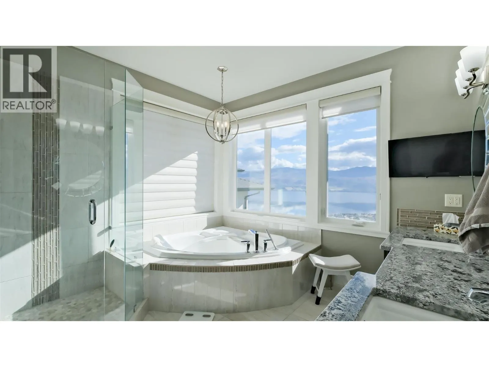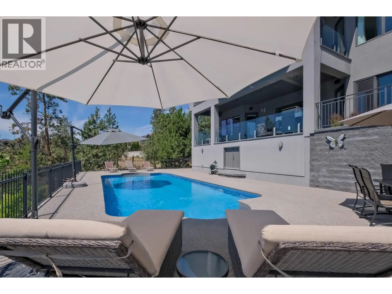 Exceptional 5 bed, 4 bath executive home is nestled in the prestigious Vineyard Estates with panoramic views of Okanagan Lake, mountains, and vineyards. Open-concept main level combines comfort and elegance, featuring 11' ceilings, maple hardwood, and custom curved windows that flood the space with natural light. The main level primary bedroom, complete with a spa-like ensuite, heated floors, motion-sensor lighting is conveniently located alongside a spacious office (or second bedroom). Well appointed kitchen showcases custom cabinetry, a Bertazzoni gas stove, Miele double steam oven, and dishwasher. A butlerâs pantry with a second dishwasher and fridge, a designated laundry room, and a stamped concrete covered deck enhance the homeâs thoughtful design. The bright, walkout lower level offers full lake views, 3 generously sized bedrooms, 2 full baths (including one with a separate entrance to the pool deck), a wet bar with a third dishwasher and fridge, a second washer/dryer, a large family room and a media room. Additionally, there is a heated workshop with its own entrance, perfect for hobbyists. Enjoy your own private oasis with an inground pool, hot tub, and an expansive pool deck with ample storage. The property features cherry trees, grapevines, and sits adjacent to a greenbelt for added privacy. The triple pull-through gas-heated garage and flat driveway ensure easy parking. Full lake views from every level of this stunning home! (id:27476)