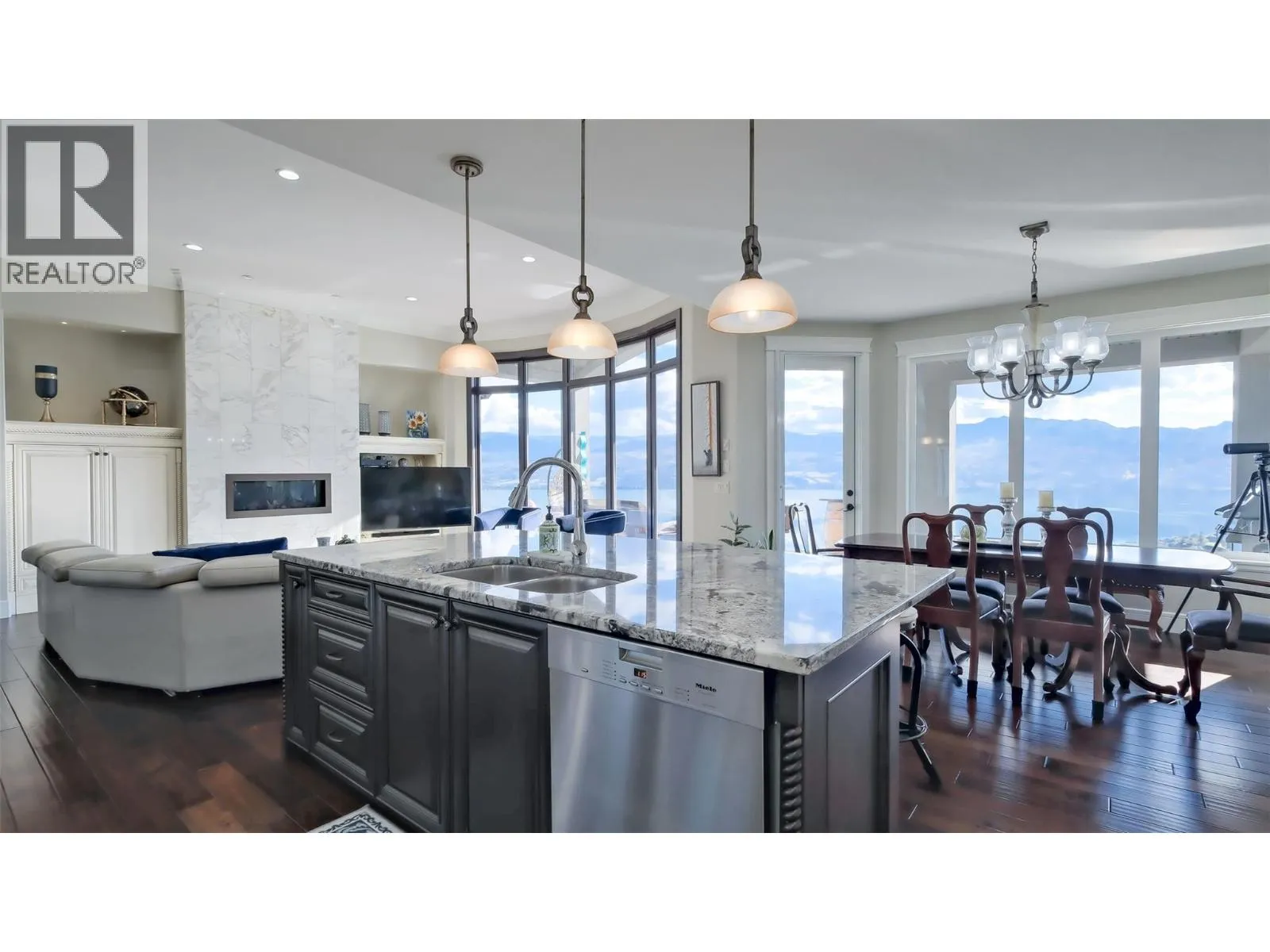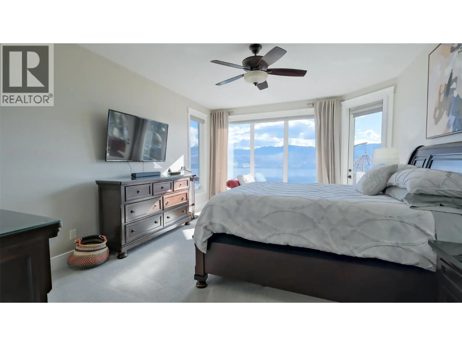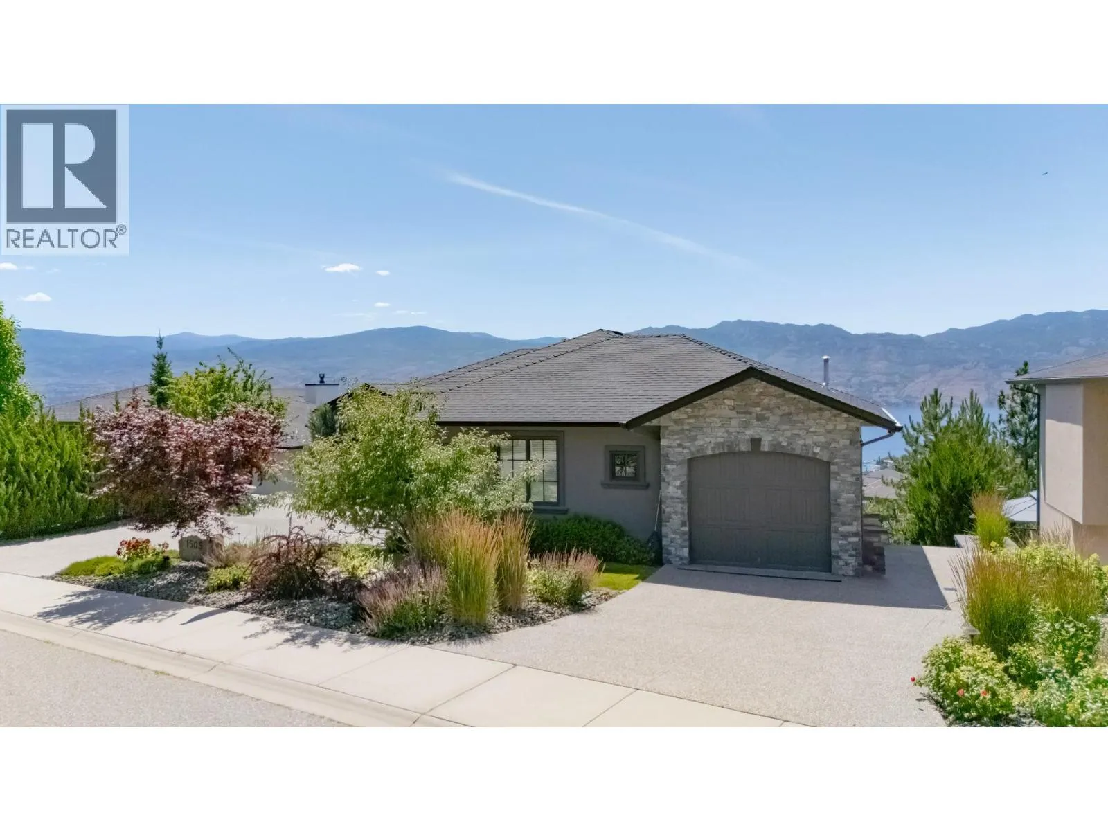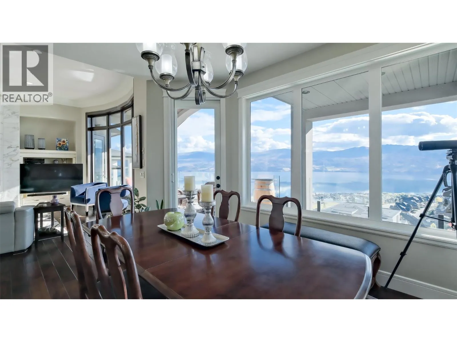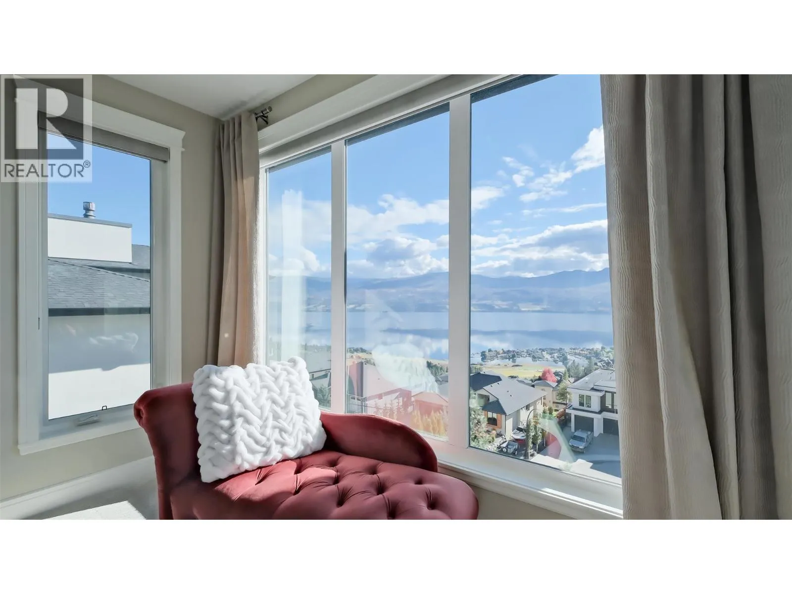 Exceptional 5 bed, 4 bath executive home is nestled in the prestigious Vineyard Estates with panoramic views of Okanagan Lake, mountains, and vineyards. Open-concept main level combines comfort and elegance, featuring 11' ceilings, maple hardwood, and custom curved windows that flood the space with natural light. The main level primary bedroom, complete with a spa-like ensuite, heated floors, motion-sensor lighting is conveniently located alongside a spacious office (or second bedroom). Well appointed kitchen showcases custom cabinetry, a Bertazzoni gas stove, Miele double steam oven, and dishwasher. A butlerâs pantry with a second dishwasher and fridge, a designated laundry room, and a stamped concrete covered deck enhance the homeâs thoughtful design. The bright, walkout lower level offers full lake views, 3 generously sized bedrooms, 2 full baths (including one with a separate entrance to the pool deck), a wet bar with a third dishwasher and fridge, a second washer/dryer, a large family room and a media room. Additionally, there is a heated workshop with its own entrance, perfect for hobbyists. Enjoy your own private oasis with an inground pool, hot tub, and an expansive pool deck with ample storage. The property features cherry trees, grapevines, and sits adjacent to a greenbelt for added privacy. The triple pull-through gas-heated garage and flat driveway ensure easy parking. Full lake views from every level of this stunning home! (id:27476)