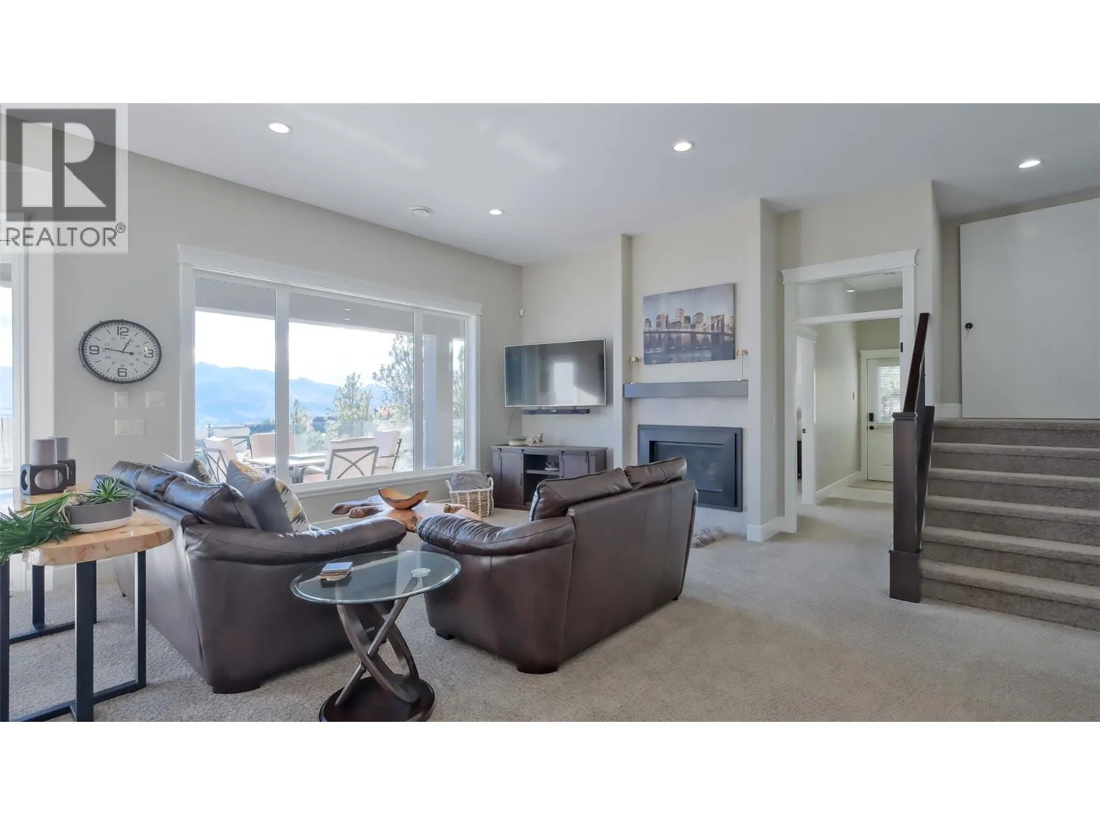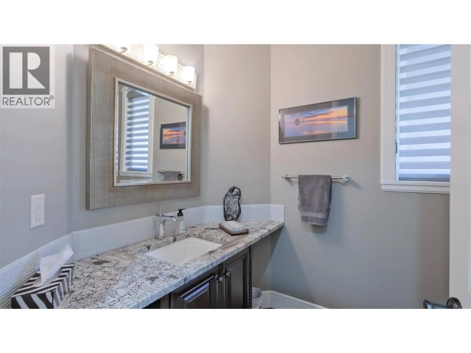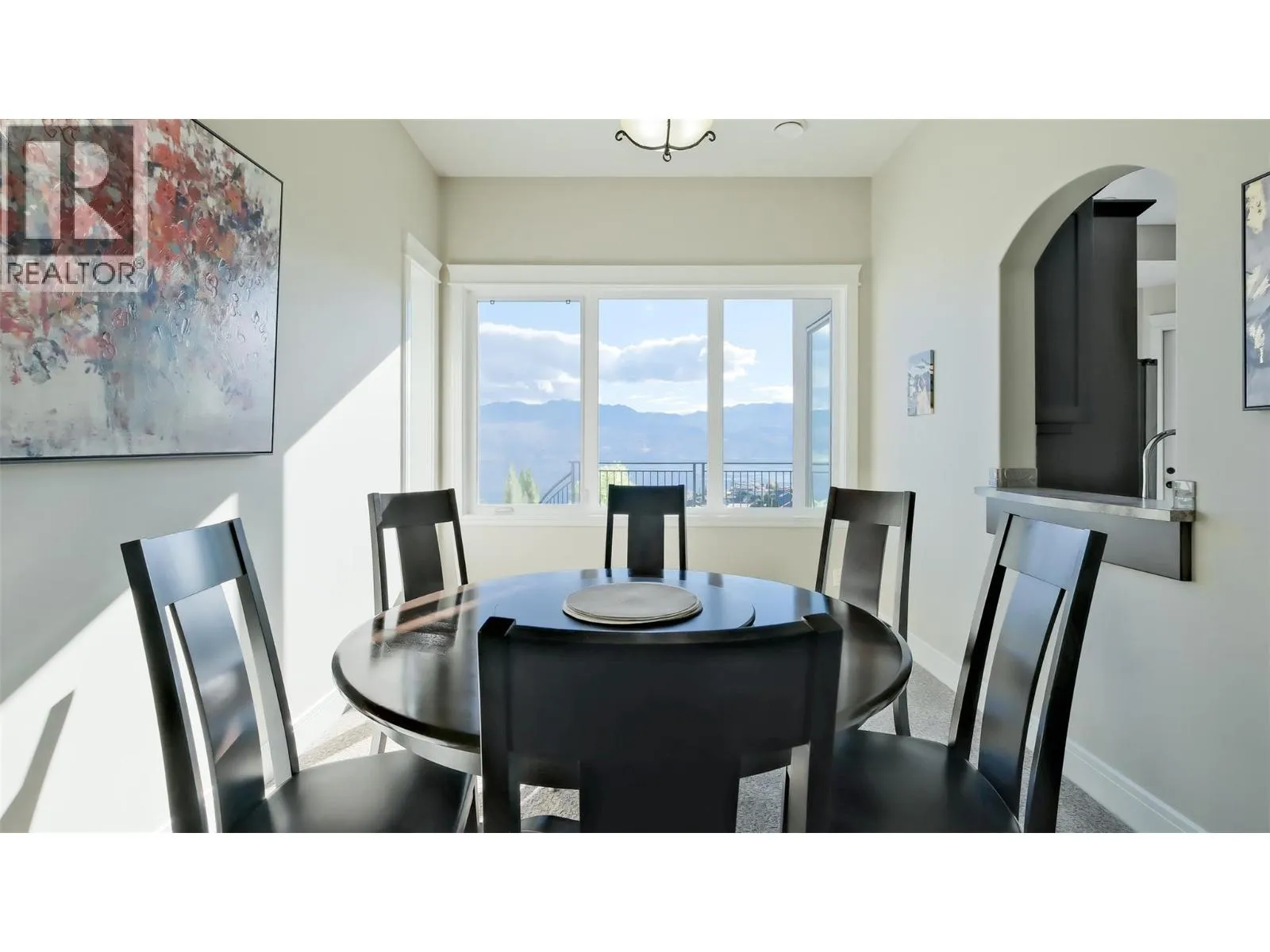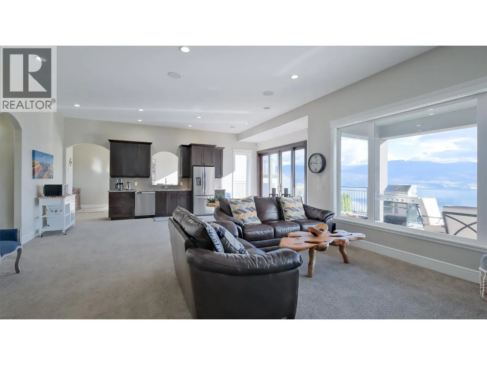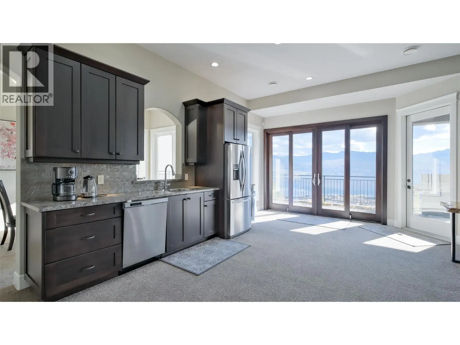 Exceptional 5 bed, 4 bath executive home is nestled in the prestigious Vineyard Estates with panoramic views of Okanagan Lake, mountains, and vineyards. Open-concept main level combines comfort and elegance, featuring 11' ceilings, maple hardwood, and custom curved windows that flood the space with natural light. The main level primary bedroom, complete with a spa-like ensuite, heated floors, motion-sensor lighting is conveniently located alongside a spacious office (or second bedroom). Well appointed kitchen showcases custom cabinetry, a Bertazzoni gas stove, Miele double steam oven, and dishwasher. A butlerâs pantry with a second dishwasher and fridge, a designated laundry room, and a stamped concrete covered deck enhance the homeâs thoughtful design. The bright, walkout lower level offers full lake views, 3 generously sized bedrooms, 2 full baths (including one with a separate entrance to the pool deck), a wet bar with a third dishwasher and fridge, a second washer/dryer, a large family room and a media room. Additionally, there is a heated workshop with its own entrance, perfect for hobbyists. Enjoy your own private oasis with an inground pool, hot tub, and an expansive pool deck with ample storage. The property features cherry trees, grapevines, and sits adjacent to a greenbelt for added privacy. The triple pull-through gas-heated garage and flat driveway ensure easy parking. Full lake views from every level of this stunning home! (id:27476)