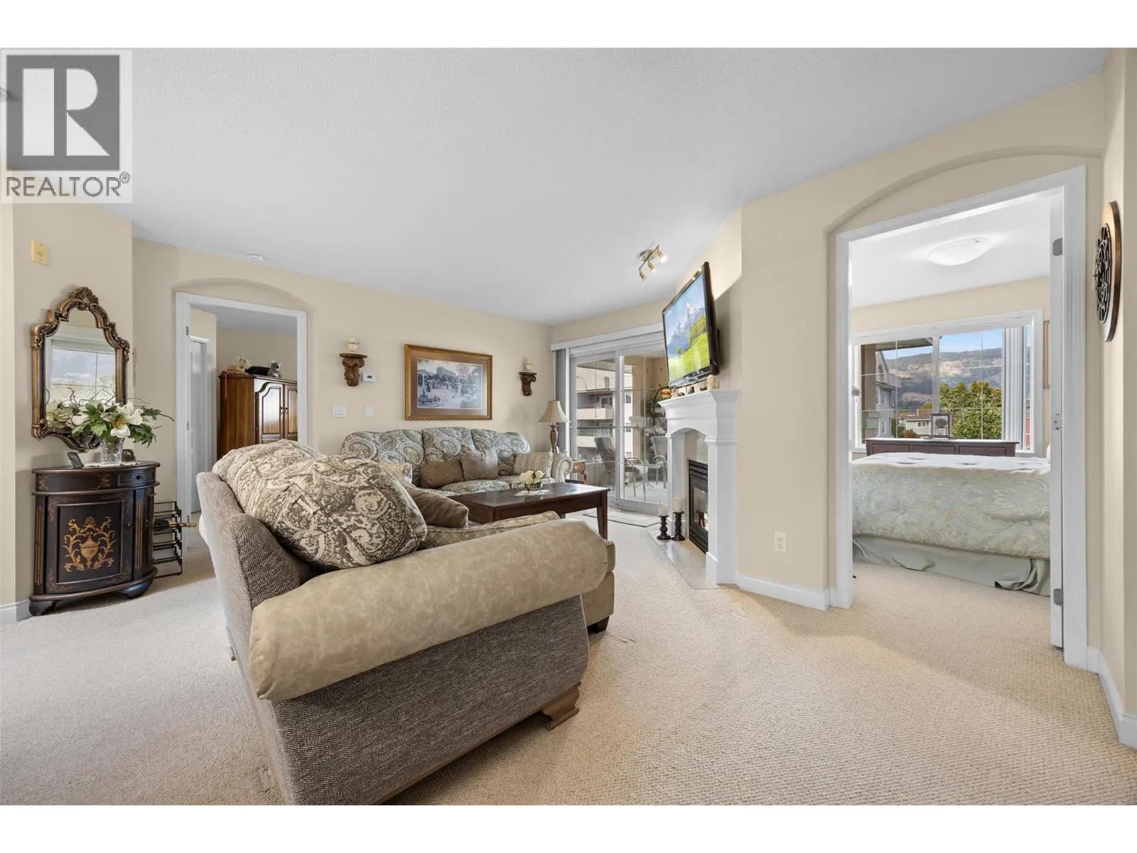 Welcome to Monticello, a highly sought-after 55+ community offering comfort, convenience, and community. This bright and beautifully maintained 2-bedroom, 1-bathroom condominium features 855 sq ft of open-concept living and a 133 sq ft covered balcony where you can relax and enjoy peaceful mountain views along with a charming peek-a-boo glimpse of the lake. The inviting living room is warmed by a cozy fireplace, perfect for those cool Okanagan evenings, while the well-appointed kitchen provides plenty of counter space and stainless steel appliancesâideal for both everyday living and entertaining. The spacious primary bedroom easily accommodates a full bedroom suite and offers a walk-in closet with direct access to the oversized main bathroom. Additional perks include in-suite laundry, a separate storage room, and secure underground parking. Pet lovers will appreciate that one small cat or dog is welcome, and with low strata fees, this home delivers exceptional value. One of Monticelloâs greatest features is its fantastic clubhouse, where residents regularly gather for card games, potlucks, celebrations, and all kinds of fun social events. Itâs a truly welcoming community where neighbours quickly become friends. Located within easy walking distance to shopping, banks, coffee shops, and even local wineries, this is relaxed Okanagan living at its finest. Donât miss your opportunity to make Monticello your next home! (id:27476)
