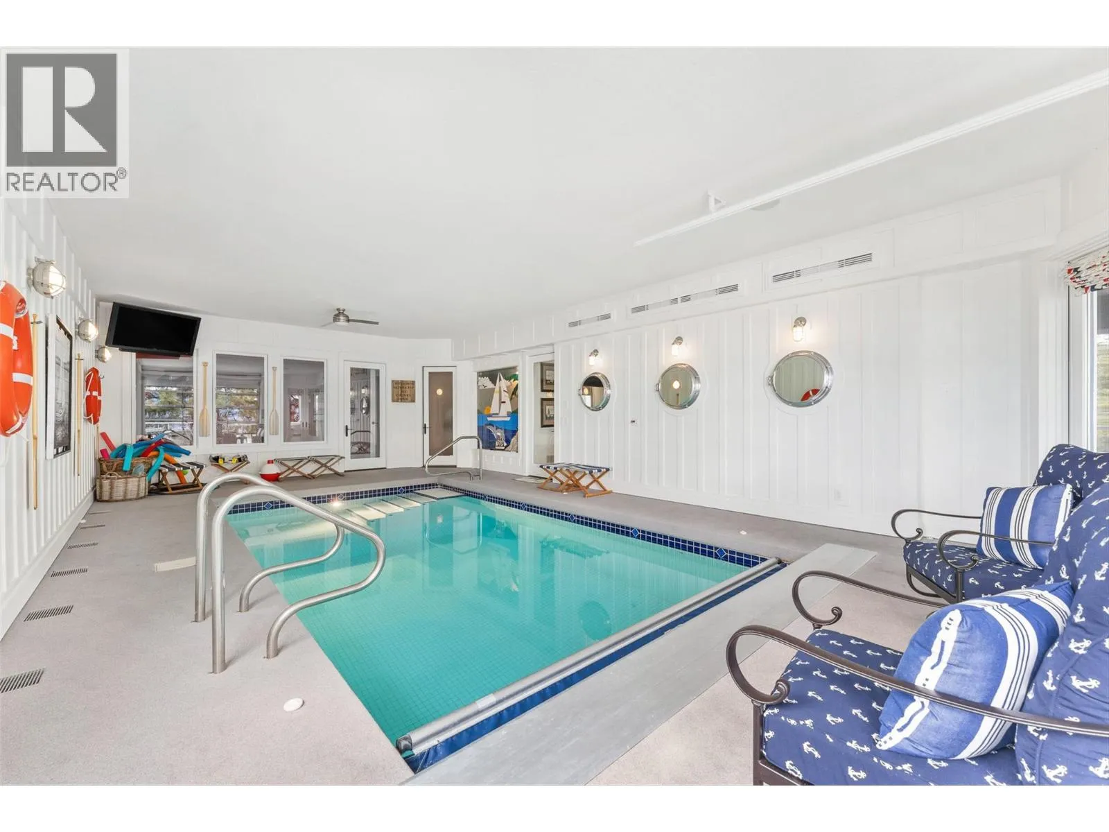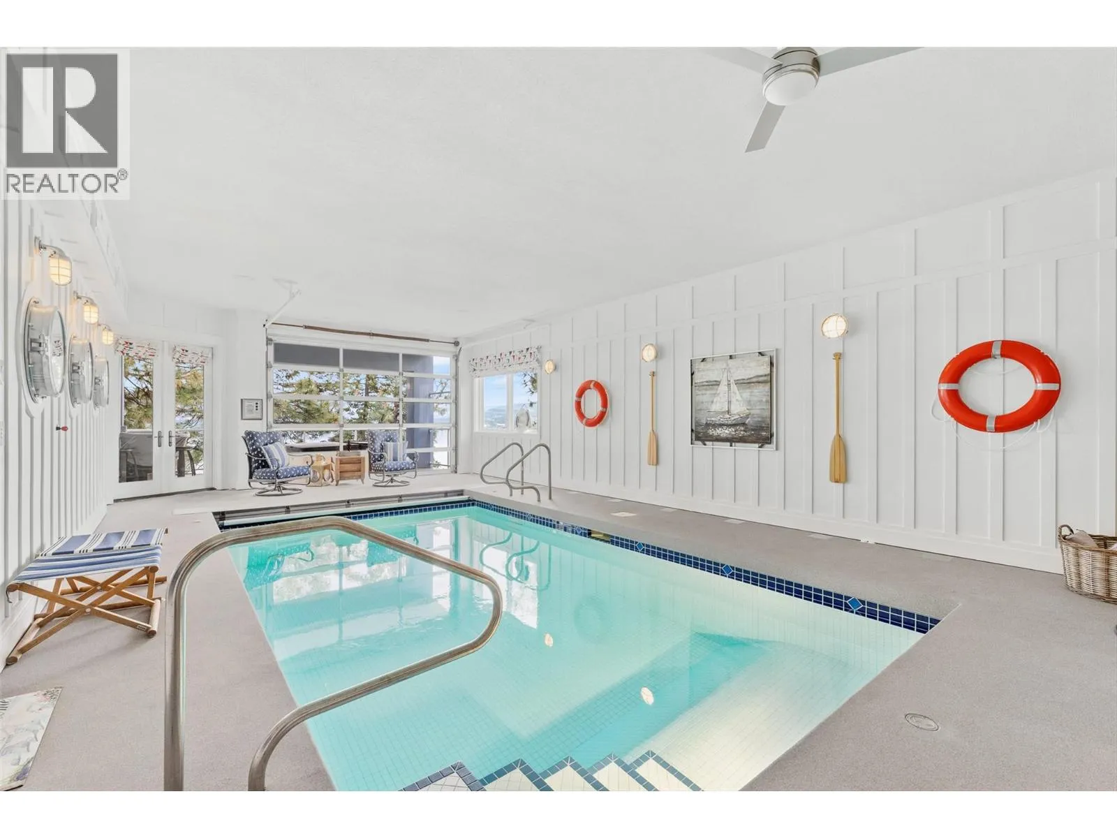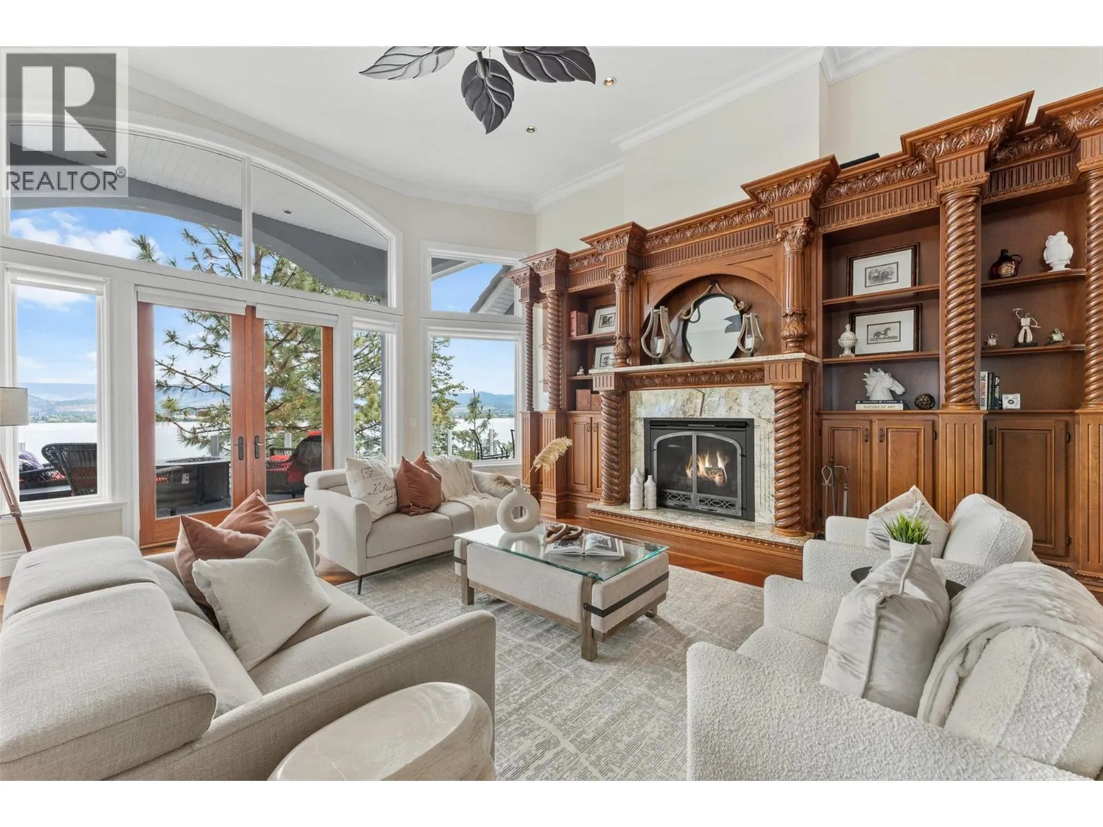 Enjoy sweeping lake and city views from this beautiful home offering over 7000 sq. ft. of living space in the sought-after neighborhood of Lakeview Heights. The home offers 4 bedrooms and expansive areas for entertaining, with 3 levels of lakeview decks. Throughout the home, youâll find superior craftsmanship, including hand-crafted cabinets, custom wood detailing, wainscoting, coffered ceilings, and molding. On the main level, enjoy open-concept living with high ceilings, a gas fireplace, and stunning lake views as the backdrop. The generous-sized kitchen is ideal for hosting and gathering, finished with custom wood cabinetry, granite countertops, and stainless-steel appliances, including a gas range. Step through the sliding doors to a large deck offering the perfect setting for al fresco dining and outdoor living. The expansive main floor lakeview primary bedroom features built-ins, a walk-through closet, and a large 5-piece en suite with a soaking tub and a glass shower. The lower level is an entertainerâs delight with a rec room, indoor pool, gym, home theater, 2 beds, and 3 baths, and a hot tub on the deck. The in-law suite on the basement level offers 1 bedroom, 1 bathroom, a kitchen, a living room, and another spacious covered patio. The home also includes a two-car garage with an oversized driveway and low-maintenance landscaping. This is an excellent neighborhood just minutes from downtown Kelowna, Okanagan Lake, and West Kelowna amenities. (id:27476)