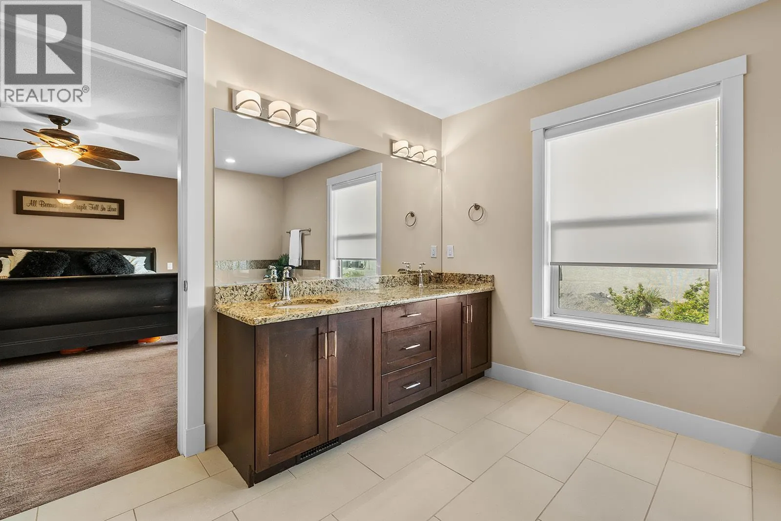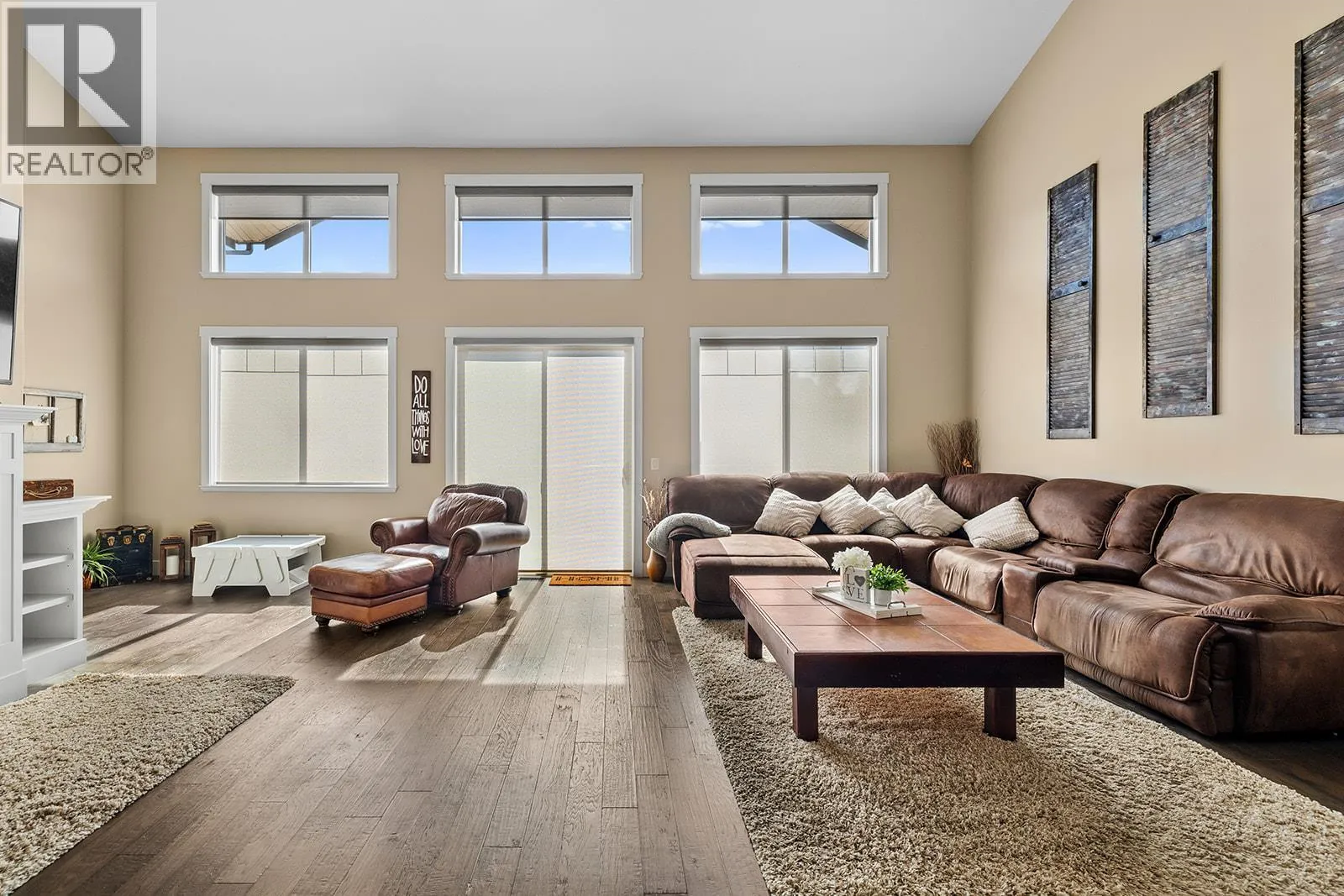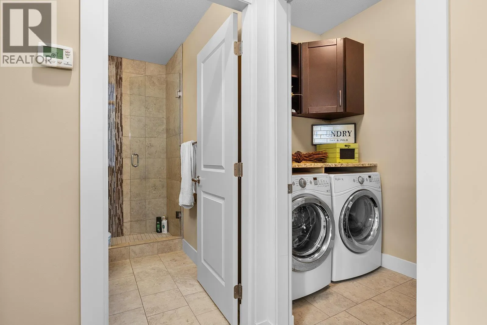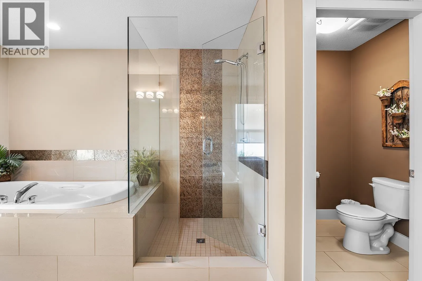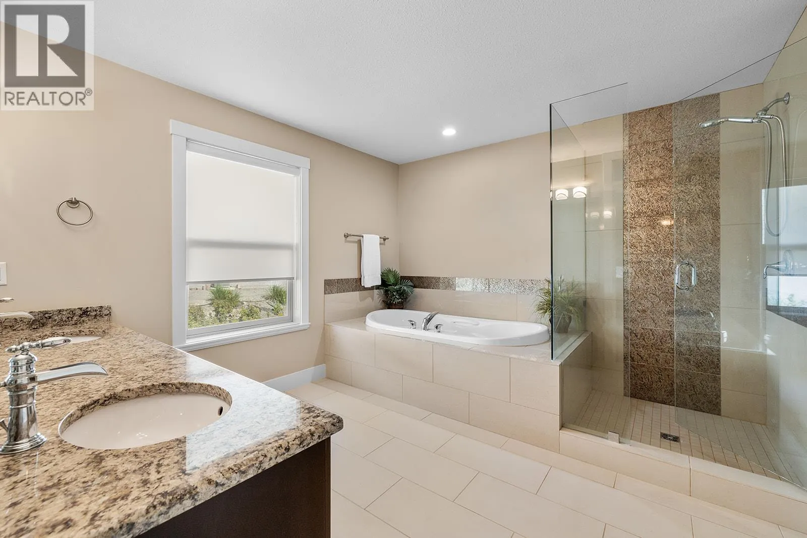 Welcome to one of the largest units in Tesoro Arca. This former show home is highlighted by its immense, heated RV garage, nearly 50 feet long with 14-foot ceilings. This space for all your toys features epoxy flooring, a 30-amp RV plug-in, a sani-dump (a rare find!), RV water hookup, a dedicated workshop, a full bathroom, and a mezzanine perfect for a home office or man cave. Inside, youâll find an elevator providing convenient access to all three levels. The main living area is defined with high vaulted ceilings, engineered hardwood flooring, and a cozy gas fireplace. The expansive deck, complete with water, gas, and hot tub wiring, extends your total living space. The kitchen, wider than most in the complex, boasts a large island with bar seating, soft-close cabinetry, granite countertops, stainless steel appliances, and a walk-in pantry. The main floor also includes a bedroom, full bathroom, and a dedicated laundry room. Ascend to the private and spacious primary suite, where you'll find a walk-in closet and an elegant ensuite featuring granite countertops, dual sinks, a water closet, heated floors, and a tiled walk-in shower. With ample storage throughout, a prepaid lease, and no Property Transfer Tax, this wider unit is a rare opportunity to own one of Tesoro Arca's most spacious homes, perfect for parking your 45-foot RV or boat. Enjoy the convenience of being just minutes from shopping, Two Eagles Golf Course, and the shores of Okanagan Lake. (id:27476)