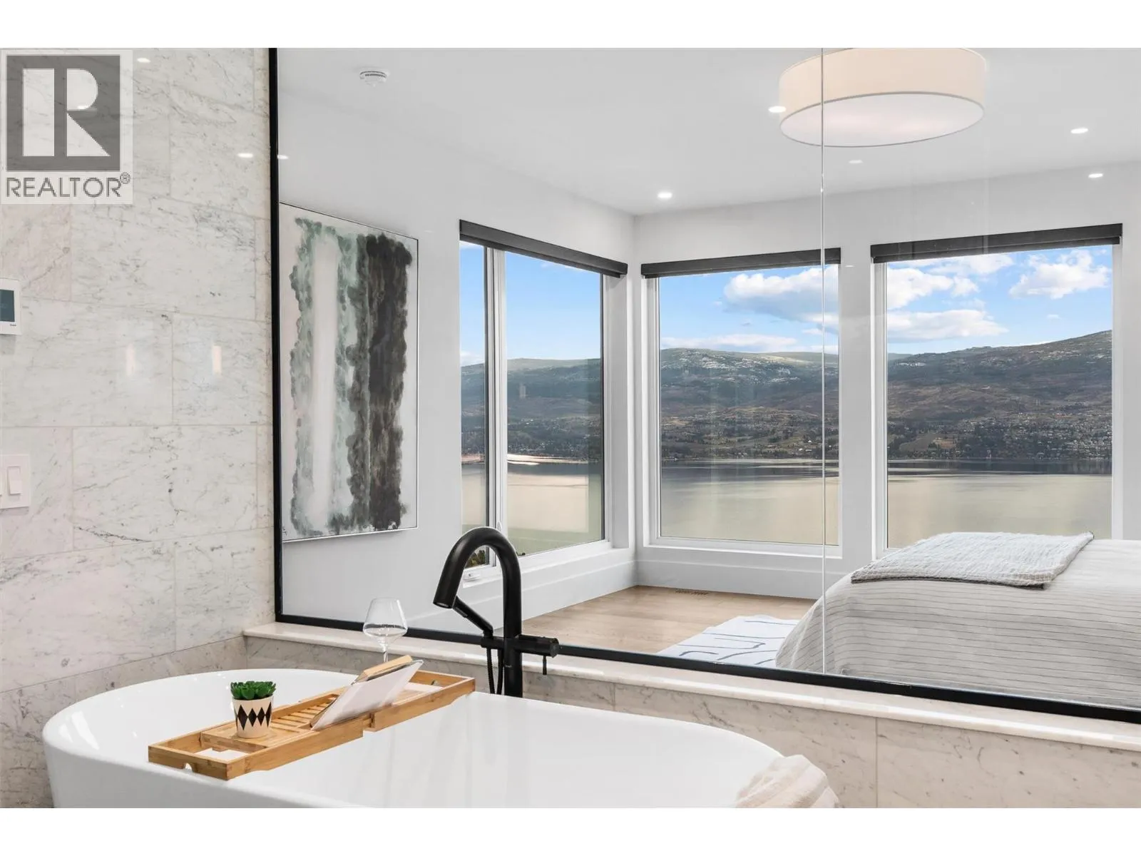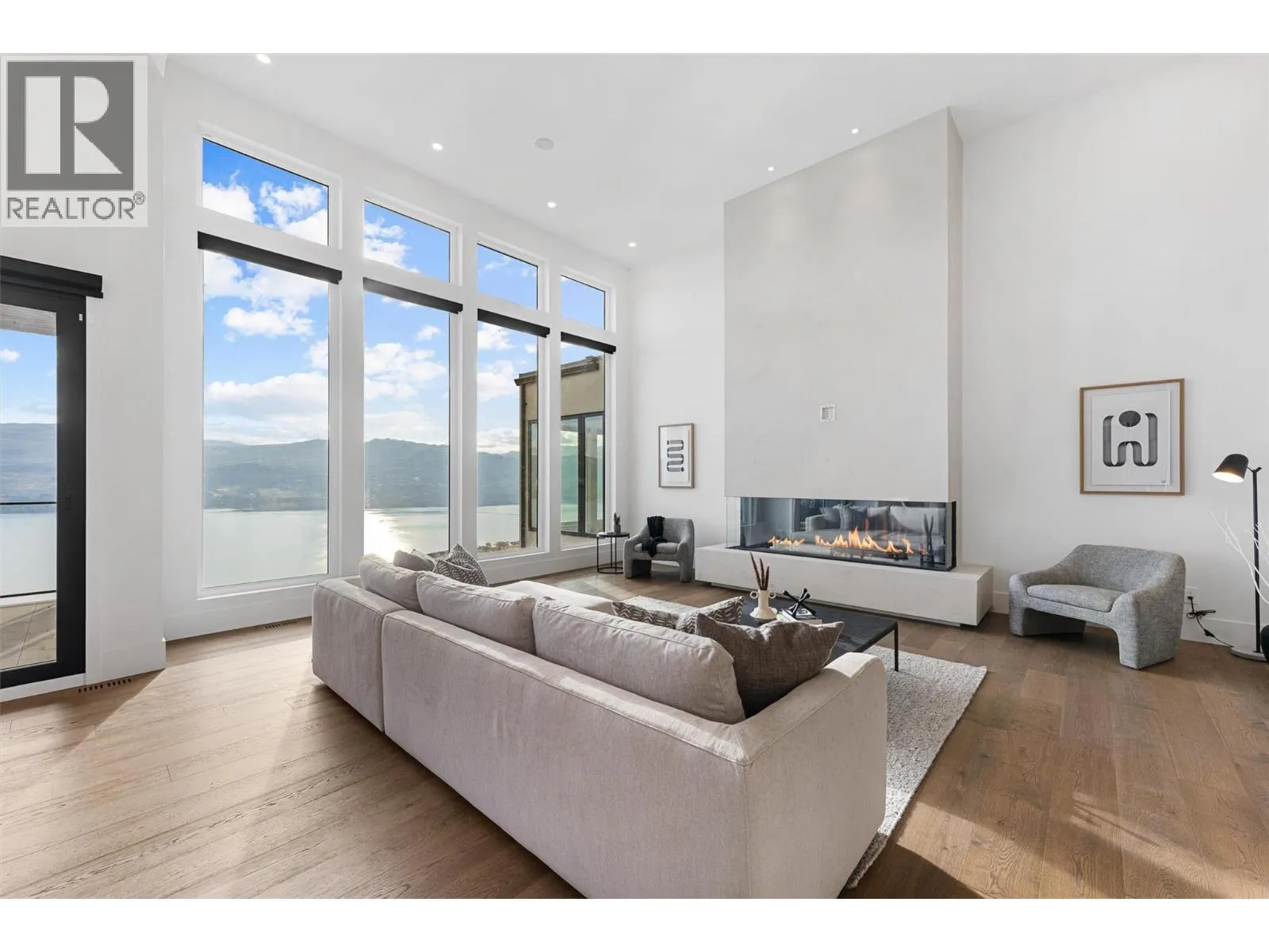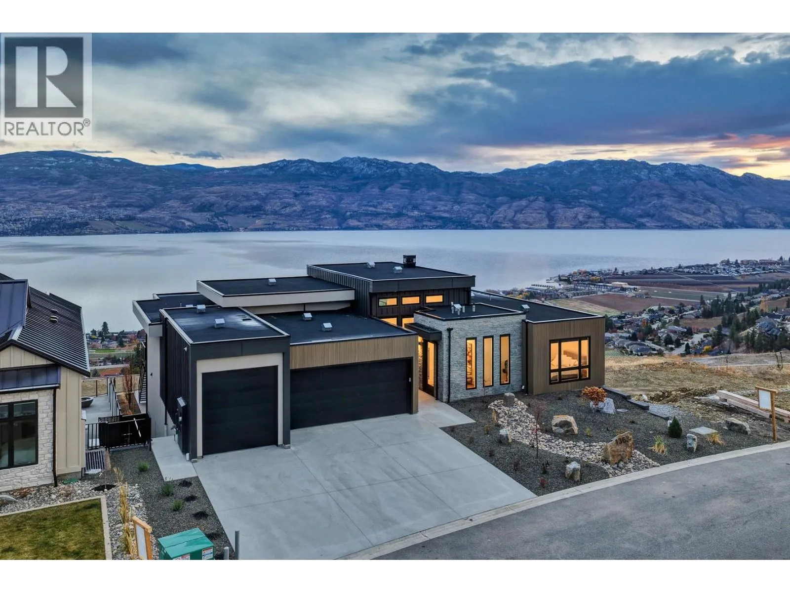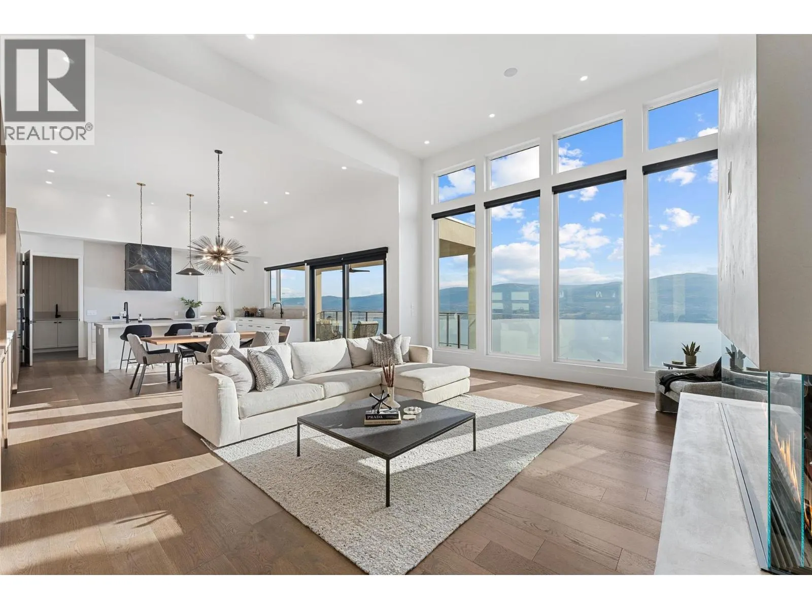 Perched in Vineyard Estates with sweeping views of Lake Okanagan and scenic Mission Hill Estate Winery, this modern home blends contemporary design with exceptional craftsmanship. Minutes to beaches, world-class wineries, parks, and the hiking and biking trails of Mount Boucherie, it offers an ideal Okanagan lifestyle. The main level features soaring ceilings, wide-plank hardwood, and floor-to-ceiling windows framing panoramic vistas. A floor-to-ceiling feature fireplace anchors the living area alongside custom built-ins and power blinds. The chefâs kitchen impresses with Caesarstone surfaces, a dramatic backsplash, Wolf + JennAir appliances, a large island, and a fully equipped butlerâs pantry. Walkout access to a covered view deck with speakers, wood ceiling inlay, and BBQ hookup. The lakeview primary is a serene retreat with a walk-in closet and a stunning 5-piece ensuite with heated floors, floor-to-ceiling tile, and a dramatic glass wall. A second bedroom with ensuite and an office complete the main level. The lower level is designed for connection with two additional bedrooms (1 has ensuite), a luxe 4-piece bath and a spacious recr room with custom wet bar, wine display, and nano doors opening to a pool deck. Outside, enjoy a sunken hot tub, concrete 14x28 saltwater pool (power-cover ready), and unobstructed glass-railed views. With upgraded lighting, 8-ft doors, abundant storage, and a 3-car garage, this residence delivers refined Okanagan living. (id:27476)