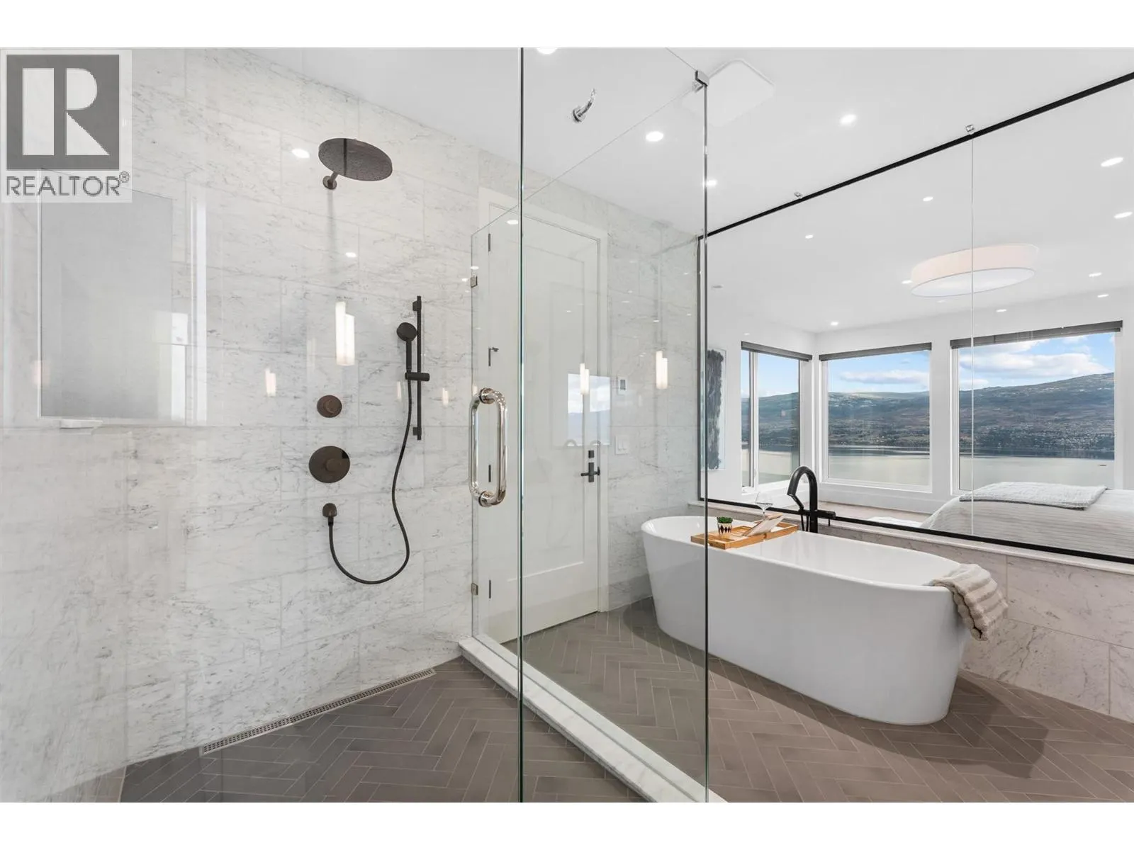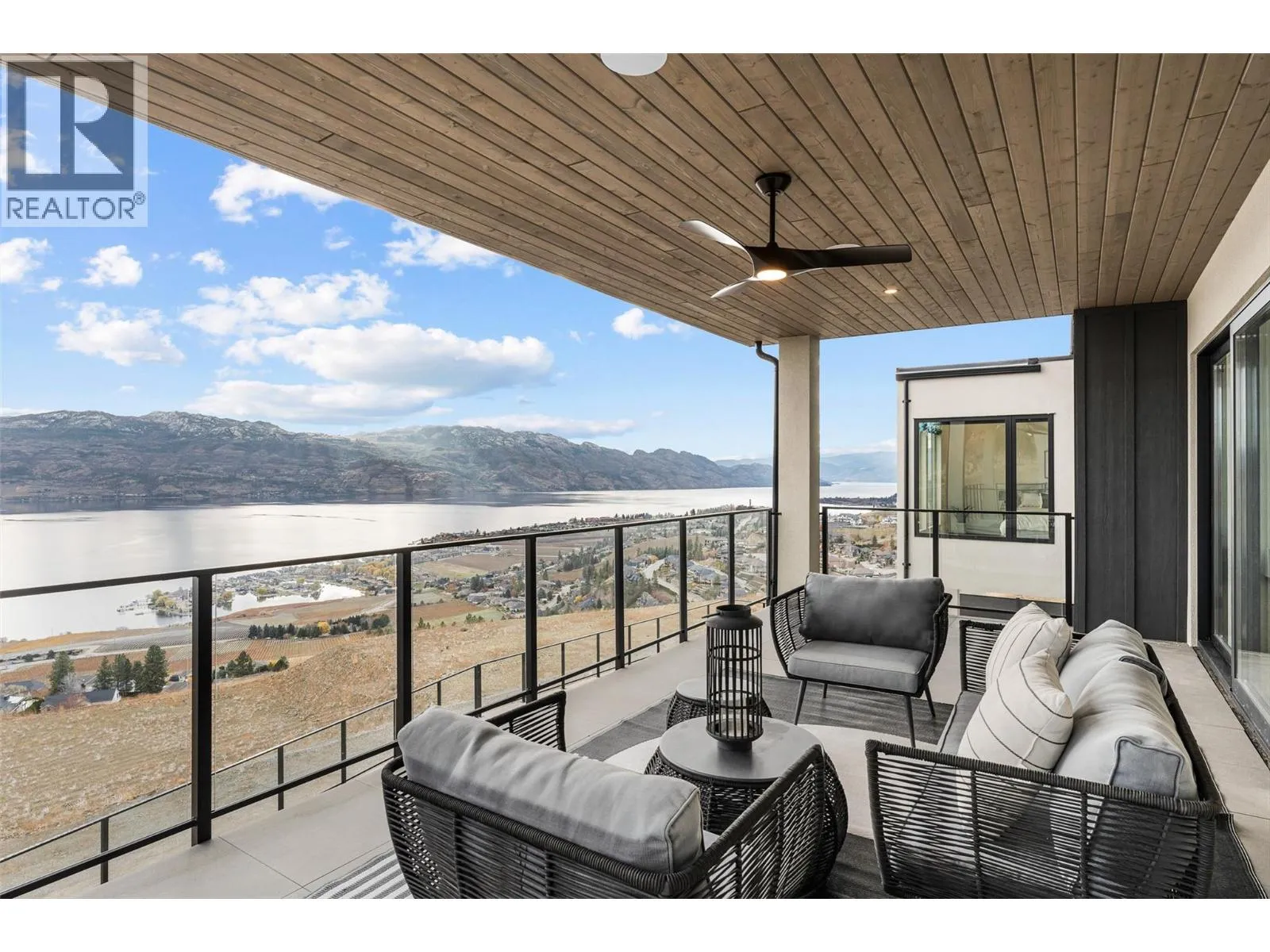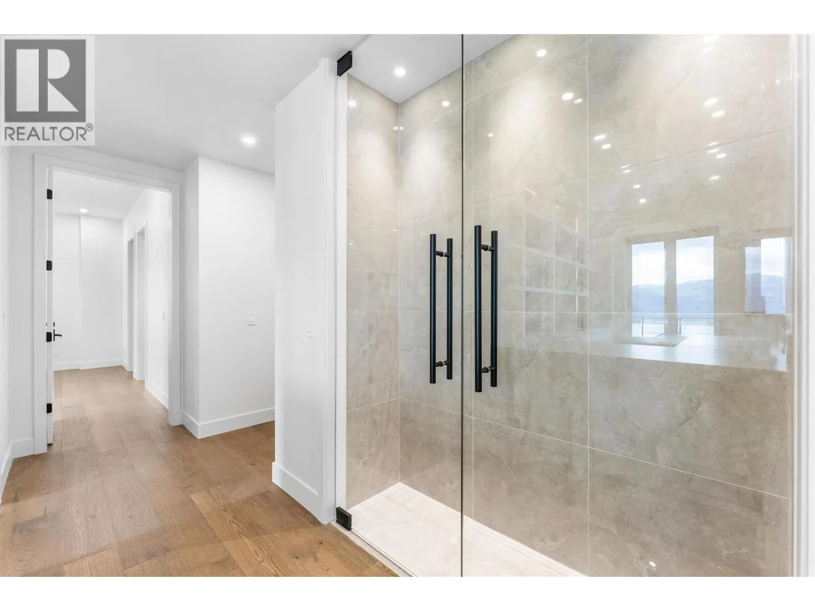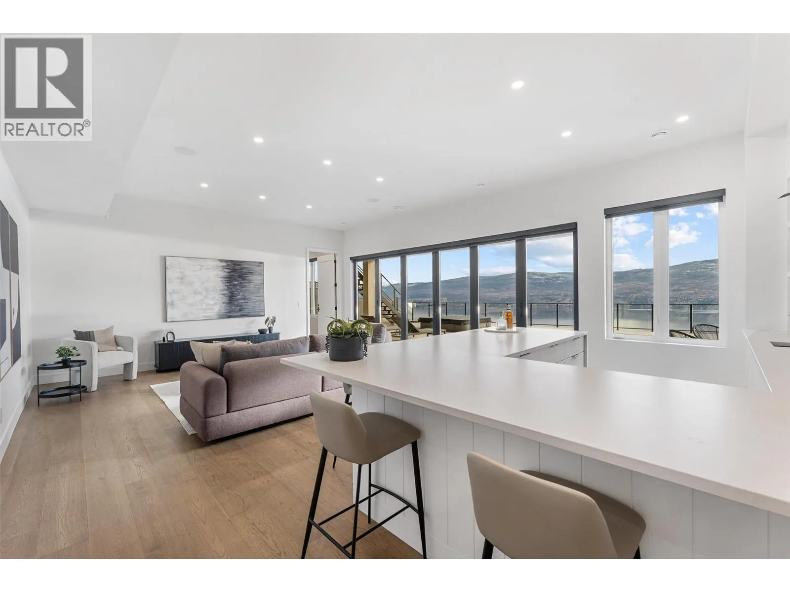 Perched in Vineyard Estates with sweeping views of Lake Okanagan and scenic Mission Hill Estate Winery, this modern home blends contemporary design with exceptional craftsmanship. Minutes to beaches, world-class wineries, parks, and the hiking and biking trails of Mount Boucherie, it offers an ideal Okanagan lifestyle. The main level features soaring ceilings, wide-plank hardwood, and floor-to-ceiling windows framing panoramic vistas. A floor-to-ceiling feature fireplace anchors the living area alongside custom built-ins and power blinds. The chefâs kitchen impresses with Caesarstone surfaces, a dramatic backsplash, Wolf + JennAir appliances, a large island, and a fully equipped butlerâs pantry. Walkout access to a covered view deck with speakers, wood ceiling inlay, and BBQ hookup. The lakeview primary is a serene retreat with a walk-in closet and a stunning 5-piece ensuite with heated floors, floor-to-ceiling tile, and a dramatic glass wall. A second bedroom with ensuite and an office complete the main level. The lower level is designed for connection with two additional bedrooms (1 has ensuite), a luxe 4-piece bath and a spacious recr room with custom wet bar, wine display, and nano doors opening to a pool deck. Outside, enjoy a sunken hot tub, concrete 14x28 saltwater pool (power-cover ready), and unobstructed glass-railed views. With upgraded lighting, 8-ft doors, abundant storage, and a 3-car garage, this residence delivers refined Okanagan living. (id:27476)