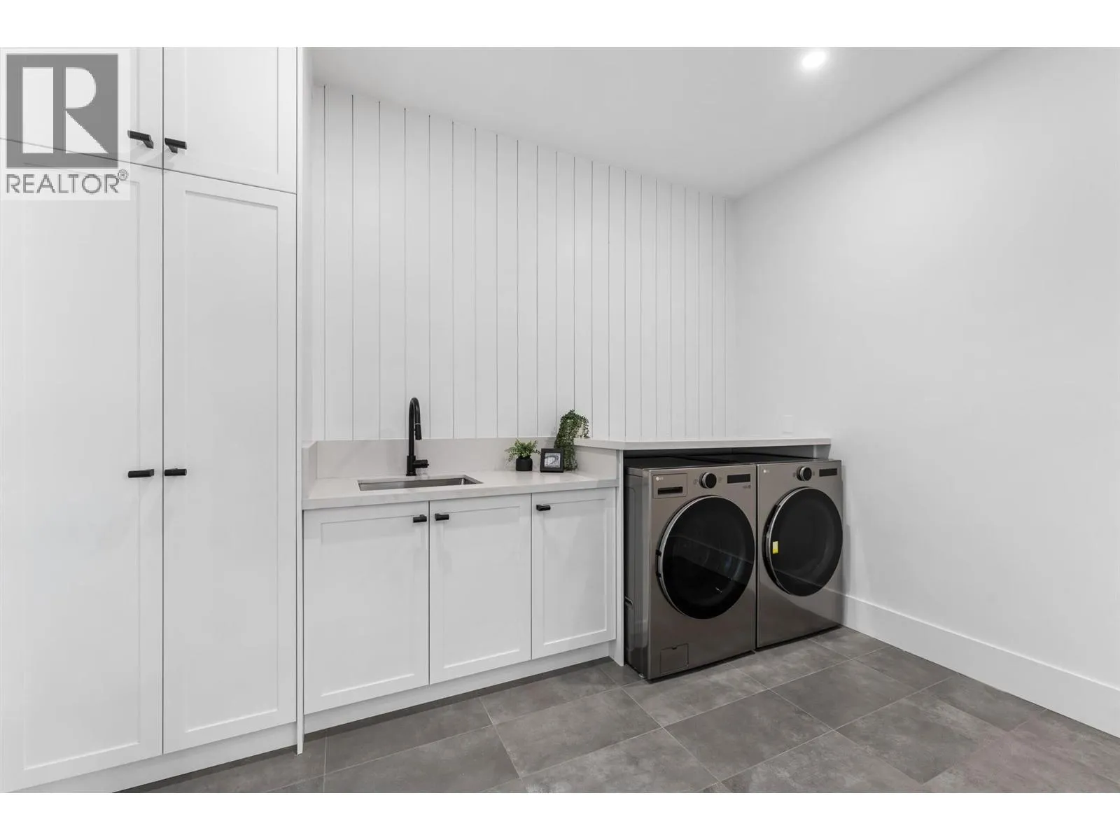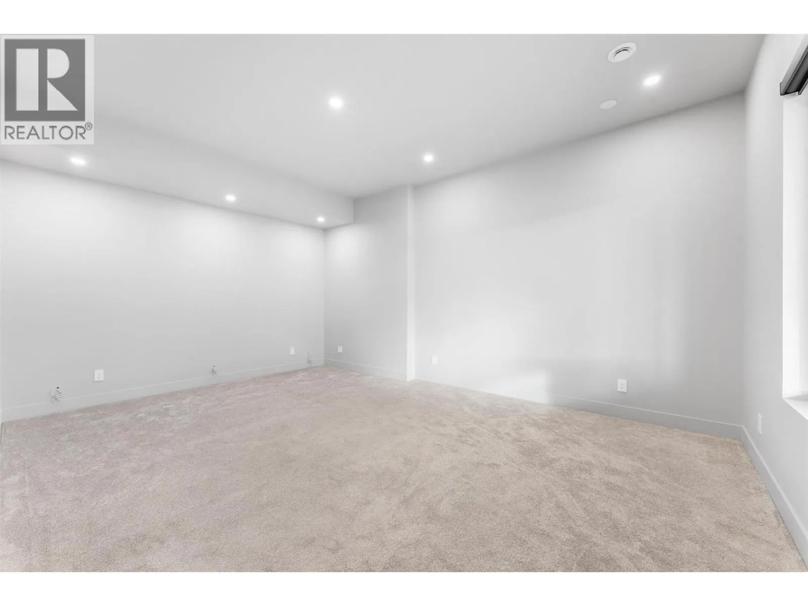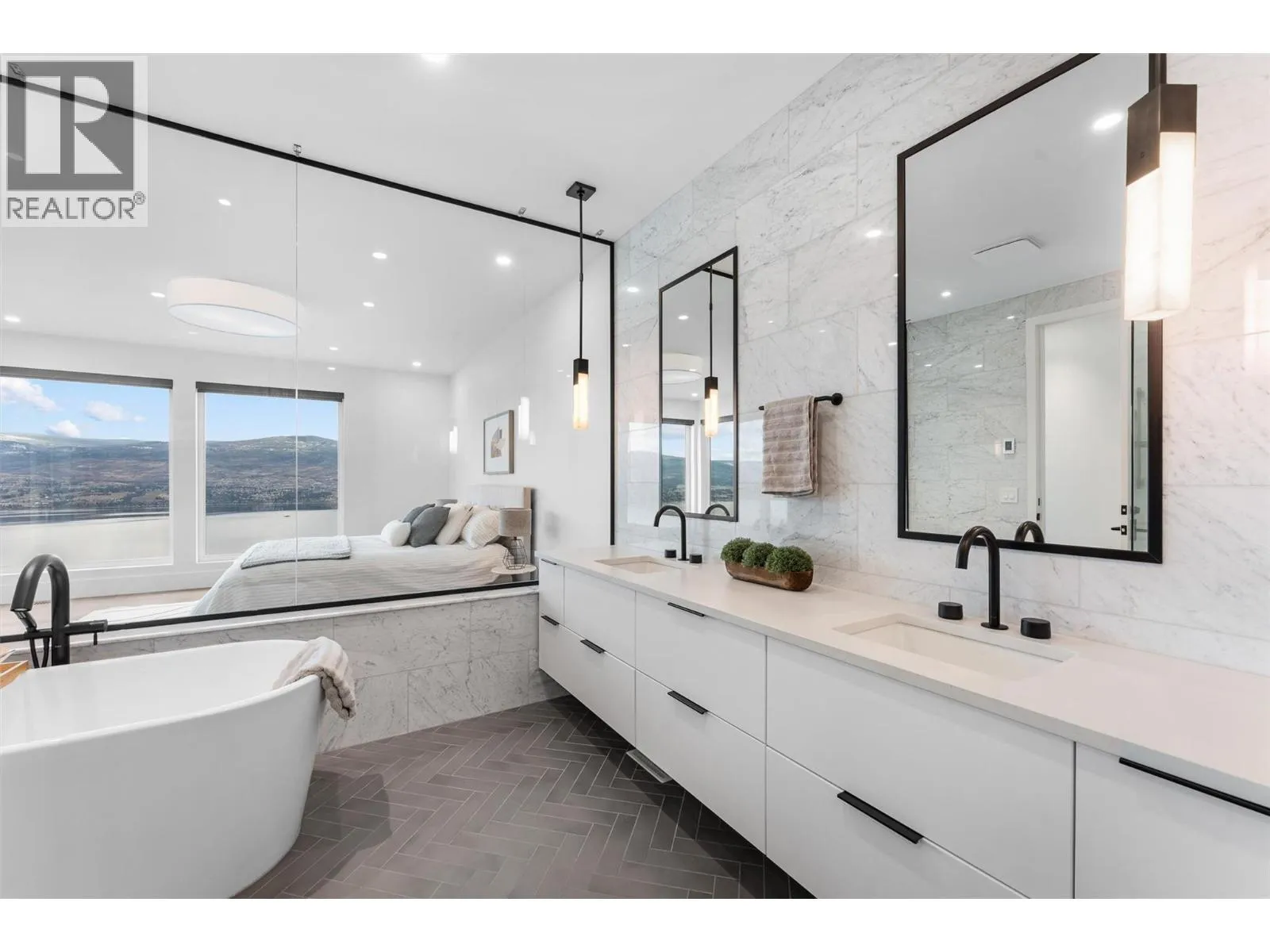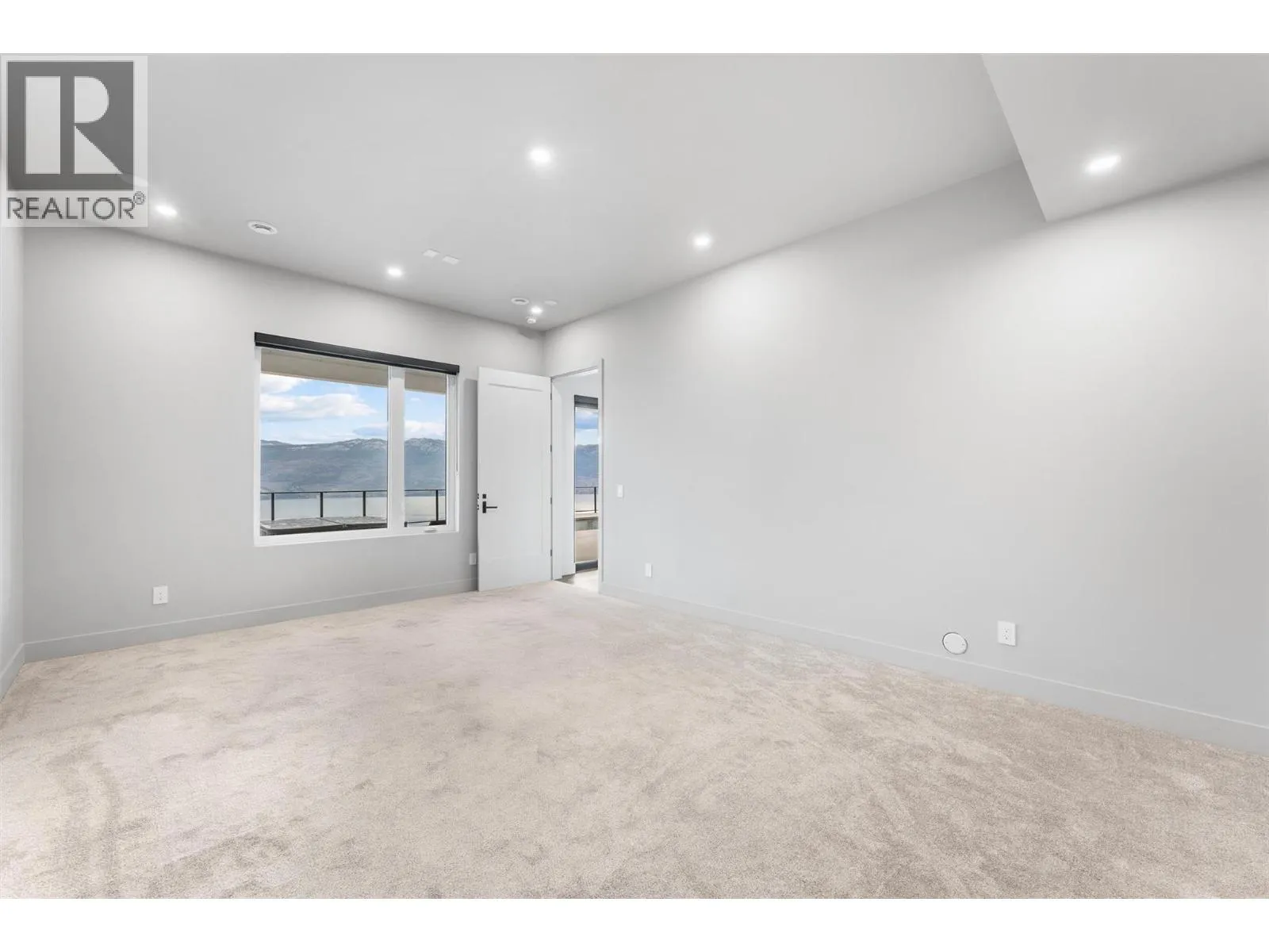 Perched in Vineyard Estates with sweeping views of Lake Okanagan and scenic Mission Hill Estate Winery, this modern home blends contemporary design with exceptional craftsmanship. Minutes to beaches, world-class wineries, parks, and the hiking and biking trails of Mount Boucherie, it offers an ideal Okanagan lifestyle. The main level features soaring ceilings, wide-plank hardwood, and floor-to-ceiling windows framing panoramic vistas. A floor-to-ceiling feature fireplace anchors the living area alongside custom built-ins and power blinds. The chefâs kitchen impresses with Caesarstone surfaces, a dramatic backsplash, Wolf + JennAir appliances, a large island, and a fully equipped butlerâs pantry. Walkout access to a covered view deck with speakers, wood ceiling inlay, and BBQ hookup. The lakeview primary is a serene retreat with a walk-in closet and a stunning 5-piece ensuite with heated floors, floor-to-ceiling tile, and a dramatic glass wall. A second bedroom with ensuite and an office complete the main level. The lower level is designed for connection with two additional bedrooms (1 has ensuite), a luxe 4-piece bath and a spacious recr room with custom wet bar, wine display, and nano doors opening to a pool deck. Outside, enjoy a sunken hot tub, concrete 14x28 saltwater pool (power-cover ready), and unobstructed glass-railed views. With upgraded lighting, 8-ft doors, abundant storage, and a 3-car garage, this residence delivers refined Okanagan living. (id:27476)
