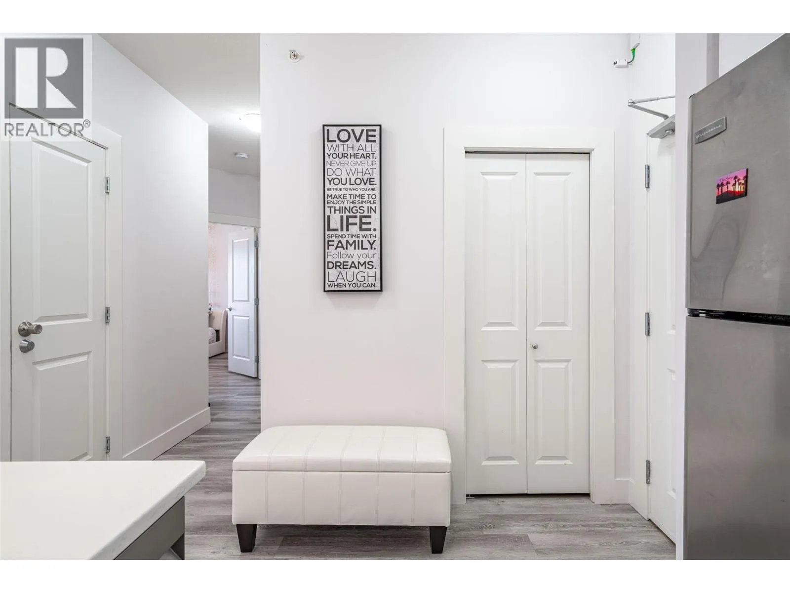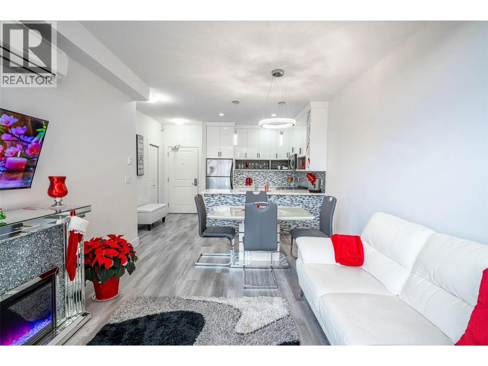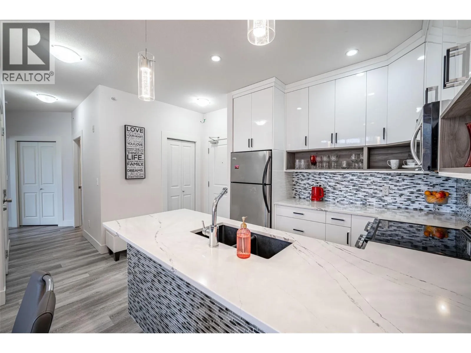 Fully Renovated Luxury unit at Coper Sky! Experience resort-style living in this fully and luxuriously renovated upper-floor residence at the renowned Coper Sky. Showcasing soaring vaulted ceilings and an expansive, massive balcony, this exceptional home offers breathtaking, unobstructed views of Mission Hill, the surrounding hillside town, and Okanagan Lake. The residence features a stunning new white glossy kitchen with high-top cabinetry, elegant granite countertops, and a modern, open design ideal for both entertaining and everyday living. Engineered laminate flooring flows seamlessly throughout the home, enhancing its contemporary and cohesive aesthetic. Both bathrooms have been completely updated with sleek, glossy tile finishes, and a new washer and dryer adds everyday convenience. The hallway leads to two spacious bedrooms, including a luxurious primary suite with a private ensuite and walk-in closet. Modern, stylish furniture could be included in the purchase price, offering a true turnkey opportunity. The property is perfectly suited for Airbnb or short-term rental use, with strong potential for high revenue. Pets allowed with some restrictions. Bathed in natural light, residents enjoy access to an impressive living in one of the areaâs most desirable resort-style communities, the amenity building offers, swimming pool, hot tubs, tennis court, gym, pool table, conference room, and a barbecue area, steam room, and resort-style living. (id:27476)