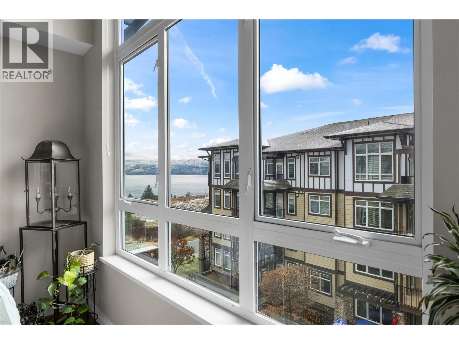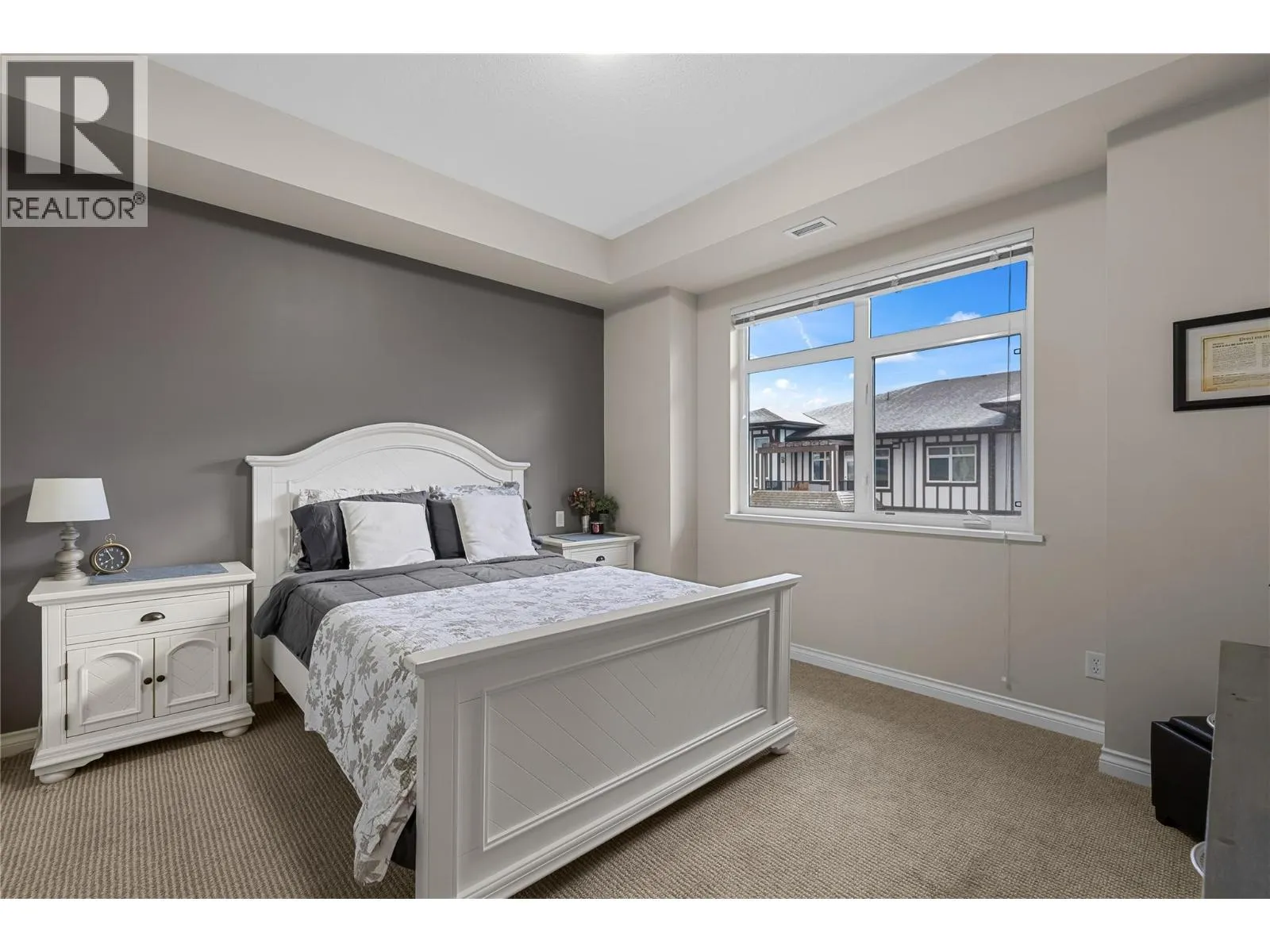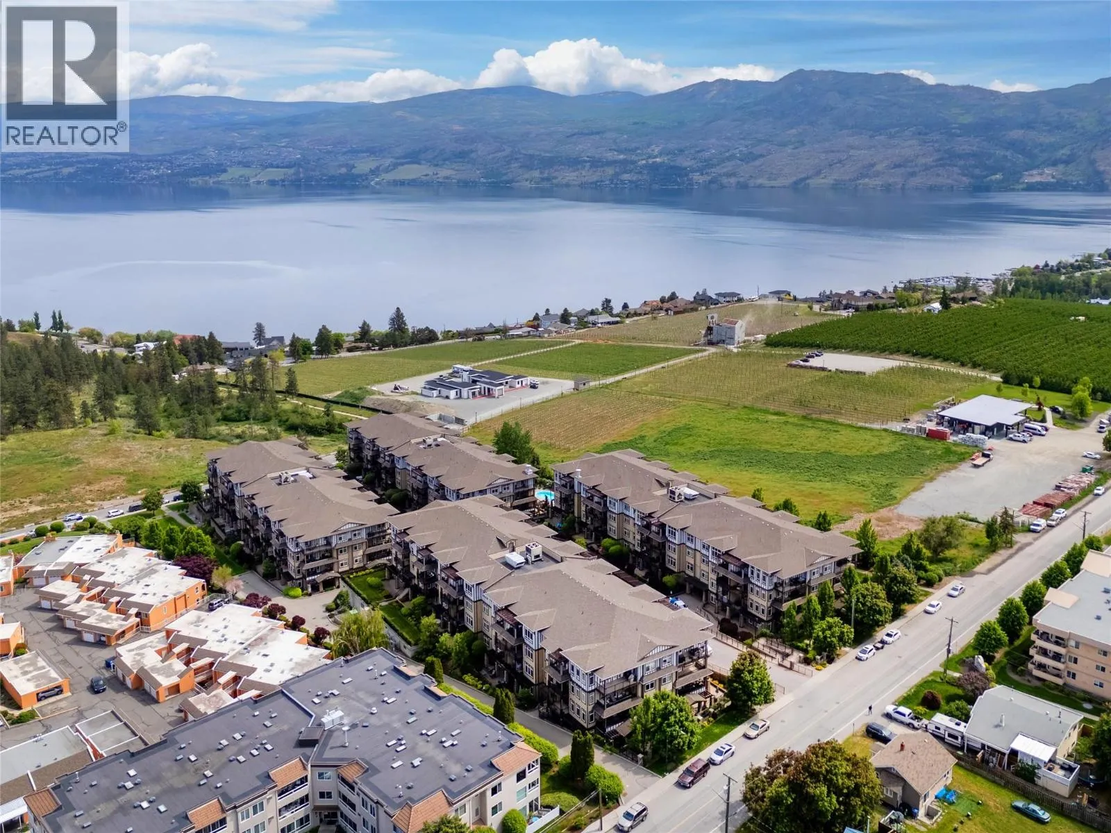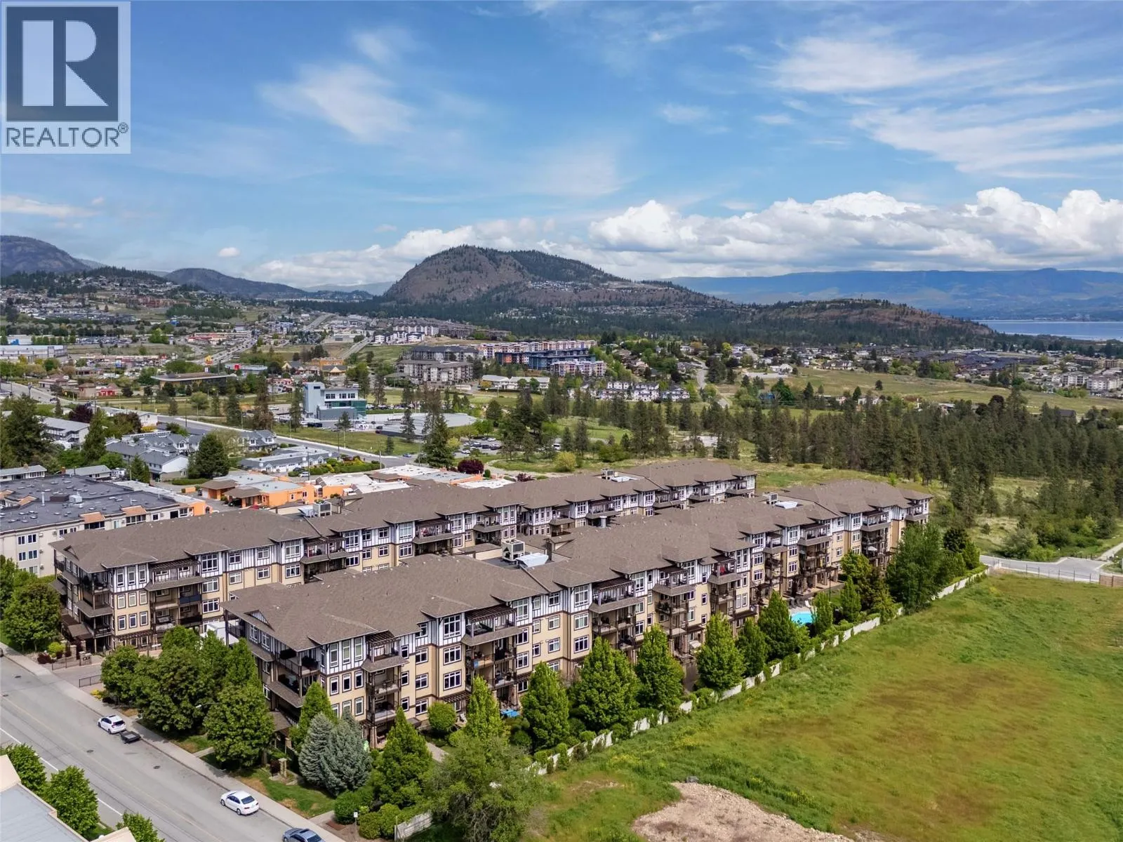 Welcome to this LAKE VIEW PENTHOUSE with 2 PARKING STALLS at Miravista, where comfort meets resort-style living in a desirable community. This home offers a spacious layout ideal for living and entertaining. The open-concept living and dining area is filled with natural light from vaulted ceilings and windows, creating a welcoming atmosphere. The kitchen features solid wood cabinetry, granite countertops with a sit-up bar, and flows seamlessly into the main living area. Enjoy summer BBQs and beautiful lake views from the SE-facing deck. The well-proportioned bedrooms include a spacious primary with room for a king bed, walk-in closet, and ensuite. An additional bedroom and den offer flexibility for guests or a home office. Fresh paint and a new stacking washer/dryer make this home move-in ready! Miravista enhances your lifestyle with amenities like an outdoor pool, hot tub, games room, and lounge. Features include 2 side-by-side secure underground parking stalls, a storage locker, and strata fees covering hot water, heat, and air conditioning. Ideally located close to Save-on-Foods, restaurants, wineries, transit, and amenities like the Johnson Bentley Memorial Aquatic Centre, City Hall, and trails. This well-managed community is an exceptional opportunity for homeowners and investors. Monthly rentals are allowed, with one pet (dog/cat up to 18"" at the shoulder). (id:27476)
