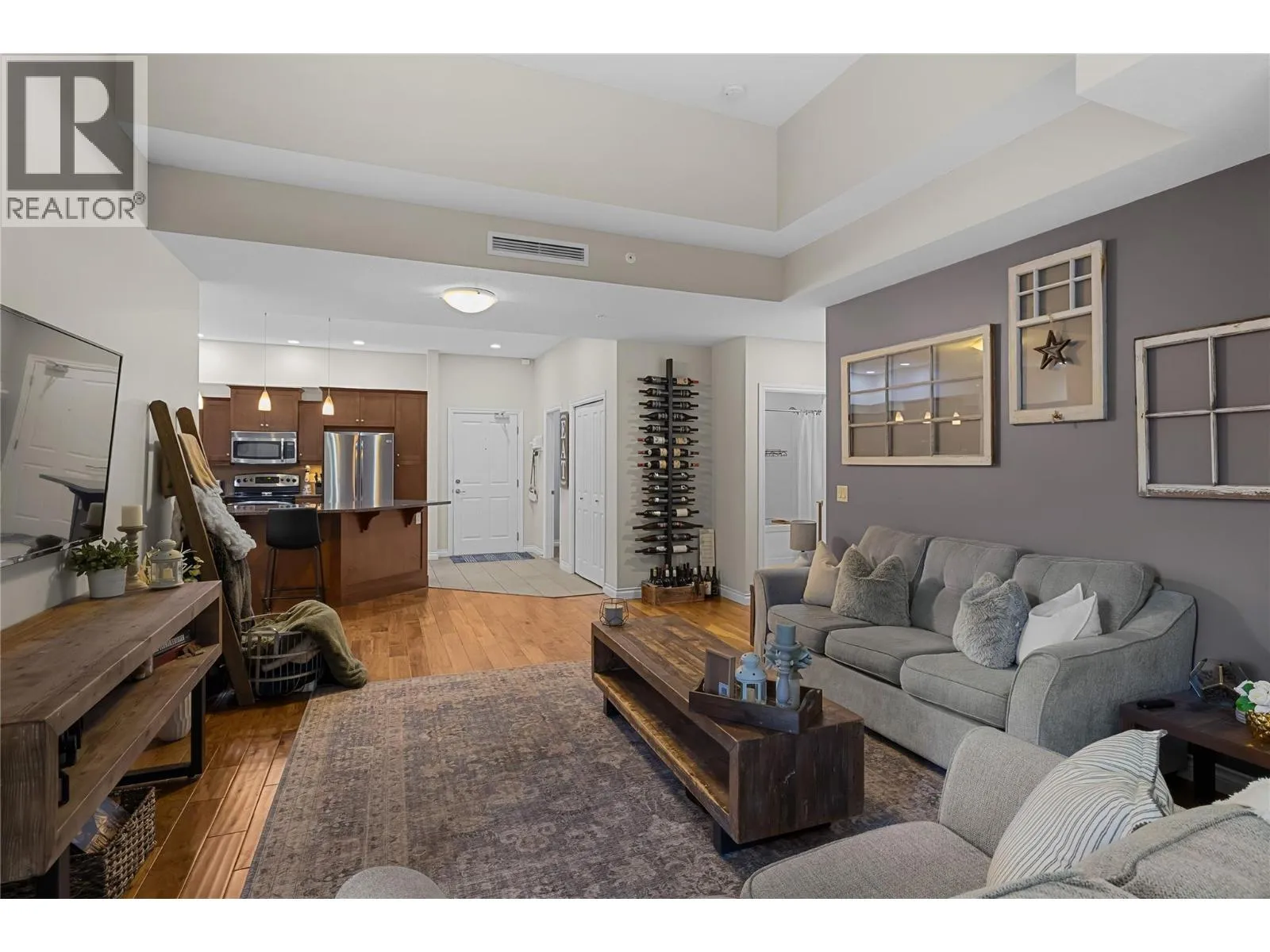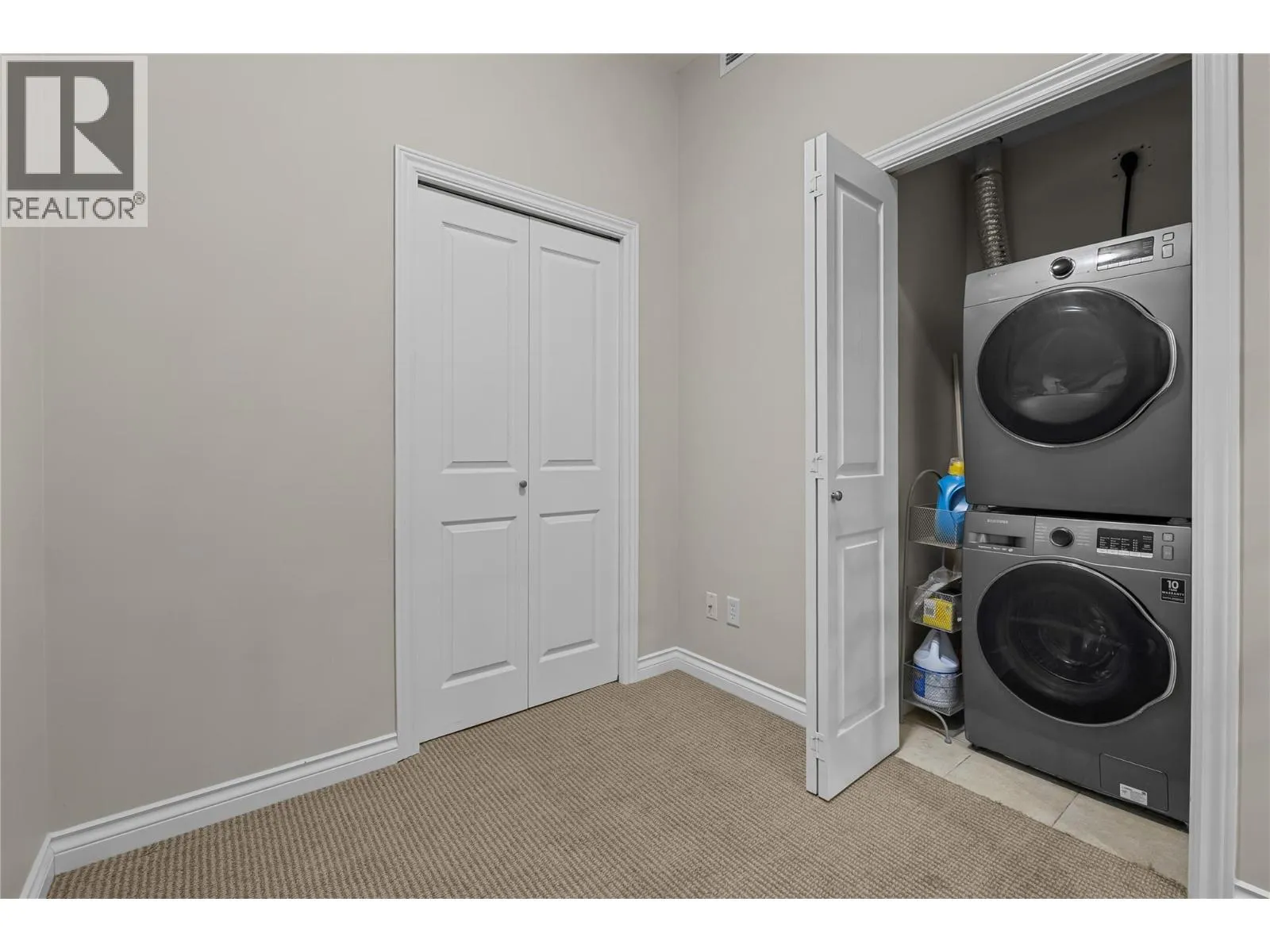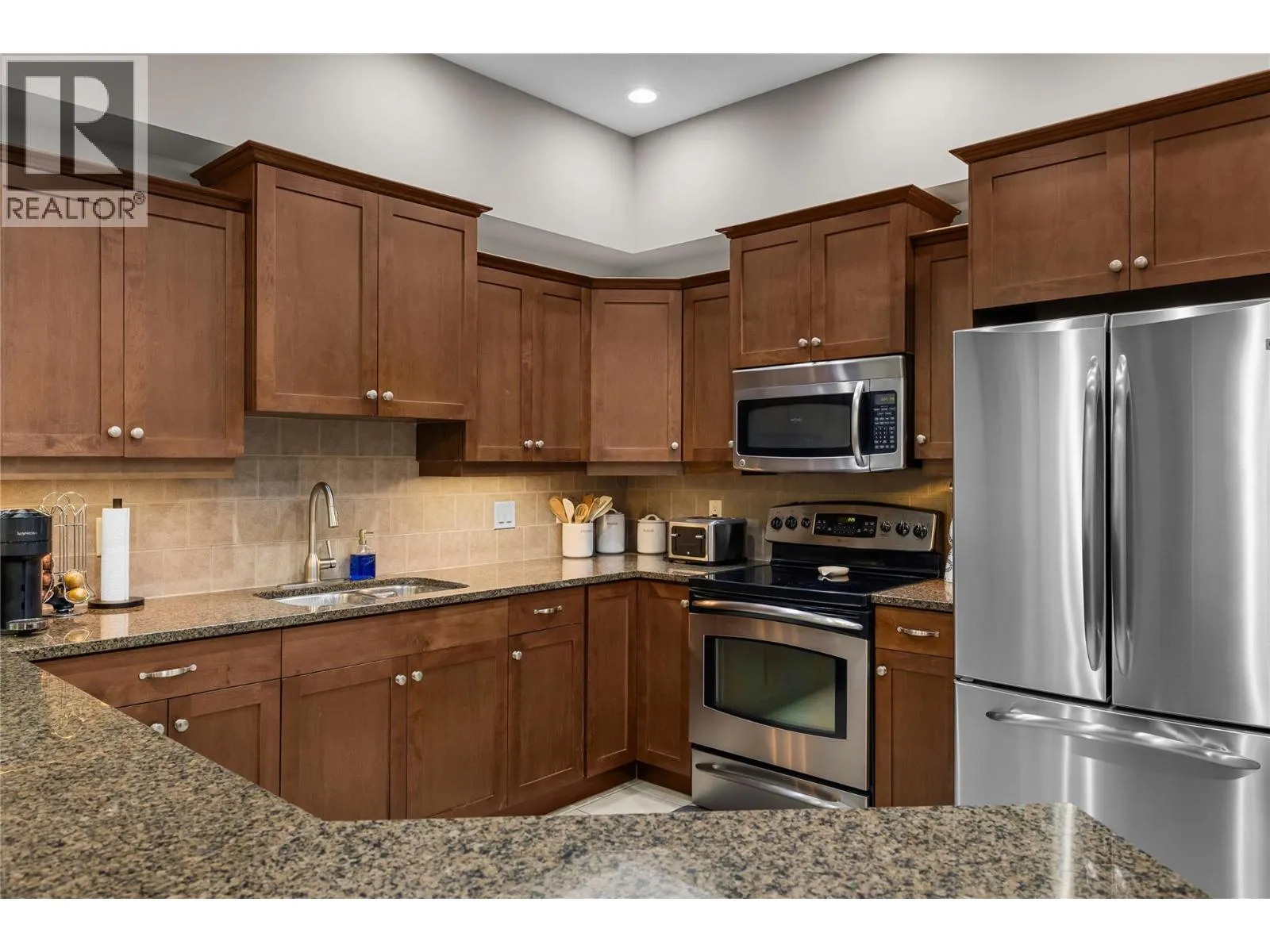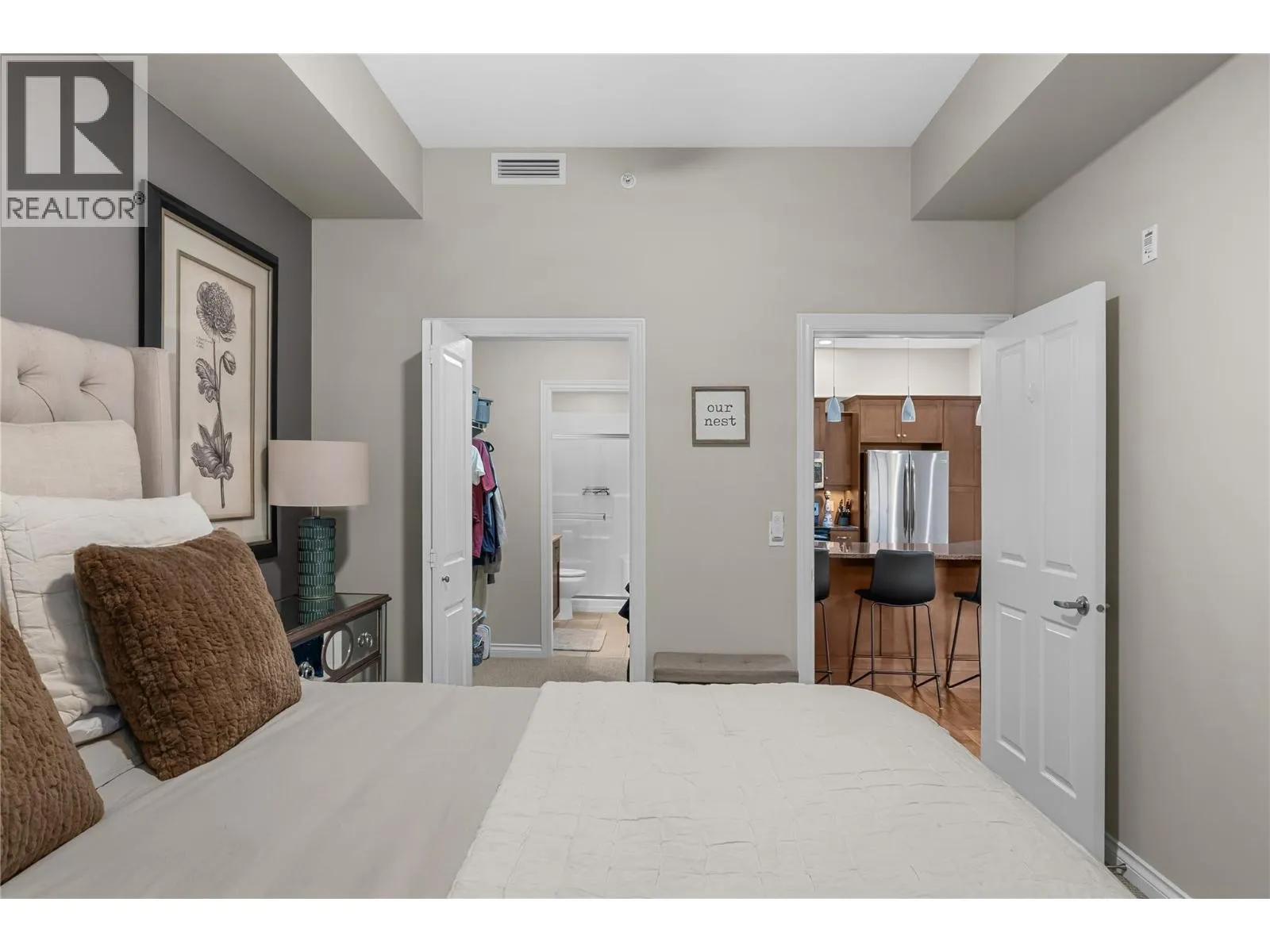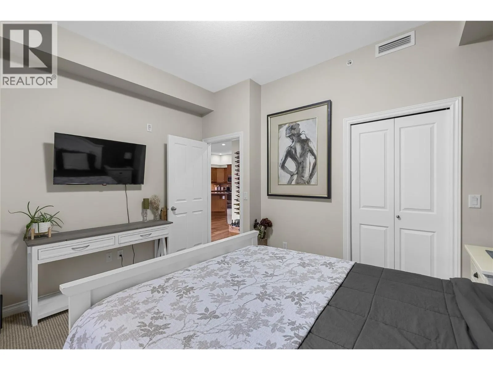 Welcome to this LAKE VIEW PENTHOUSE with 2 PARKING STALLS at Miravista, where comfort meets resort-style living in a desirable community. This home offers a spacious layout ideal for living and entertaining. The open-concept living and dining area is filled with natural light from vaulted ceilings and windows, creating a welcoming atmosphere. The kitchen features solid wood cabinetry, granite countertops with a sit-up bar, and flows seamlessly into the main living area. Enjoy summer BBQs and beautiful lake views from the SE-facing deck. The well-proportioned bedrooms include a spacious primary with room for a king bed, walk-in closet, and ensuite. An additional bedroom and den offer flexibility for guests or a home office. Fresh paint and a new stacking washer/dryer make this home move-in ready! Miravista enhances your lifestyle with amenities like an outdoor pool, hot tub, games room, and lounge. Features include 2 side-by-side secure underground parking stalls, a storage locker, and strata fees covering hot water, heat, and air conditioning. Ideally located close to Save-on-Foods, restaurants, wineries, transit, and amenities like the Johnson Bentley Memorial Aquatic Centre, City Hall, and trails. This well-managed community is an exceptional opportunity for homeowners and investors. Monthly rentals are allowed, with one pet (dog/cat up to 18"" at the shoulder). (id:27476)