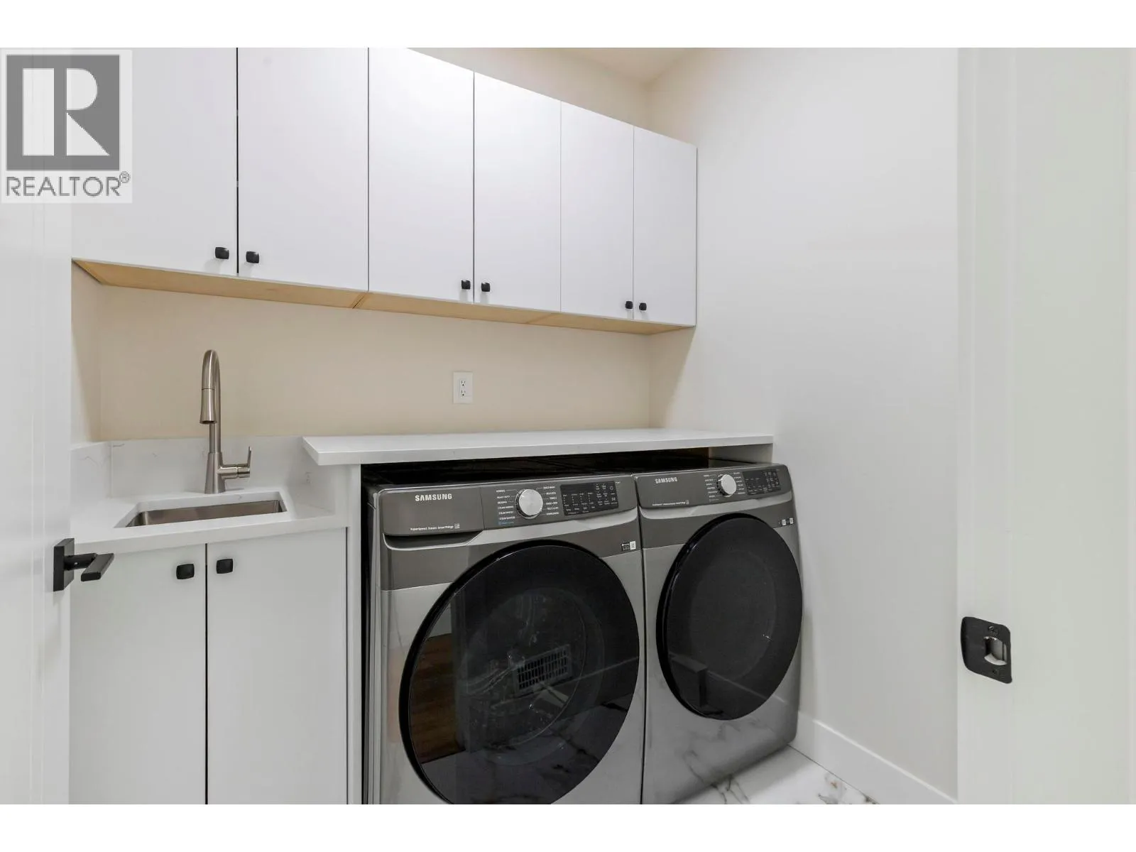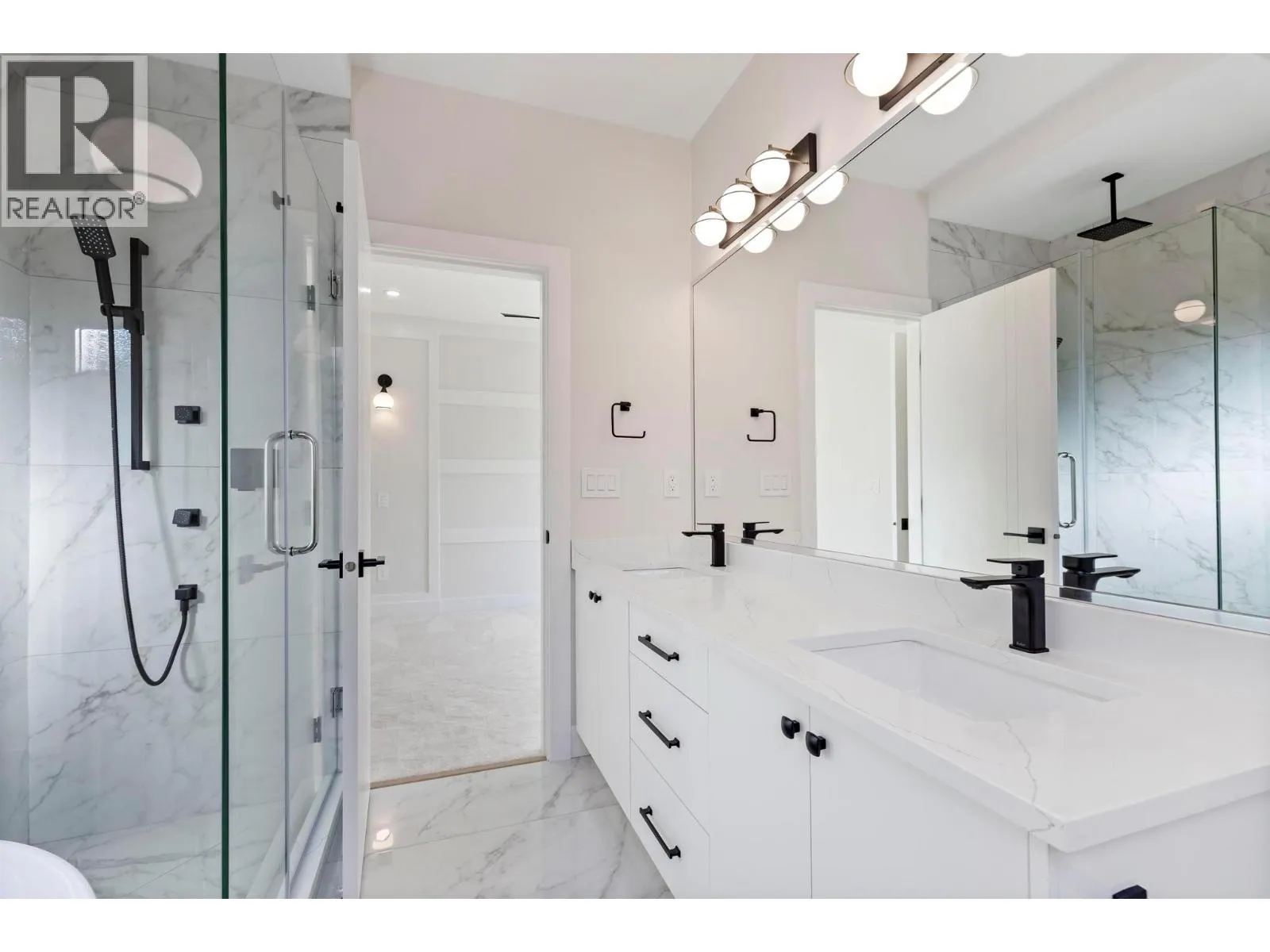 Welcome to The Trails, a stunning new build in one of West Kelownaâs most desirable communities. This 3,248 sq ft, five bedroom, four bathroom contemporary home stands out with its two bedroom legal suite and rooftop patio, offering both lifestyle and long term value. The main floor features an open concept layout with wide plank hardwood floors, quartz countertops, and a feature accent wall that adds warmth and modern character. The kitchen includes stainless steel appliances along with bold black hardware and fixtures. A large mudroom connects to the double garage, providing everyday convenience, while a powder room completes the level. Upstairs, the primary suite delivers a luxurious retreat with deck access, a custom feature wall, walk in closet, and spa inspired ensuite with dual sinks, glass shower, and freestanding tub. Two additional bedrooms, a full bath, and a laundry room with sink complete the upper floor. The bright legal two bedroom suite below offers its own laundry, full kitchen, and private entrance, ideal for extended family or rental income. Enjoy three outdoor decks, including a rooftop patio with gorgeous mountain and valley views, perfect for entertaining or relaxing. The synthetic turf backyard provides low maintenance living that is also great for kids and pets. Additional highlights include Step Code 3 energy efficiency, ample parking and storage, hot water on demand, alarm system, EV ready double garage, and a full blinds package. GST applicable. (id:27476)